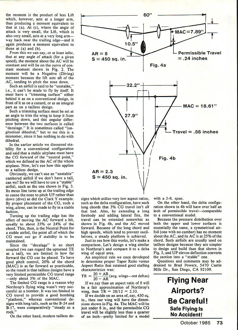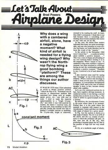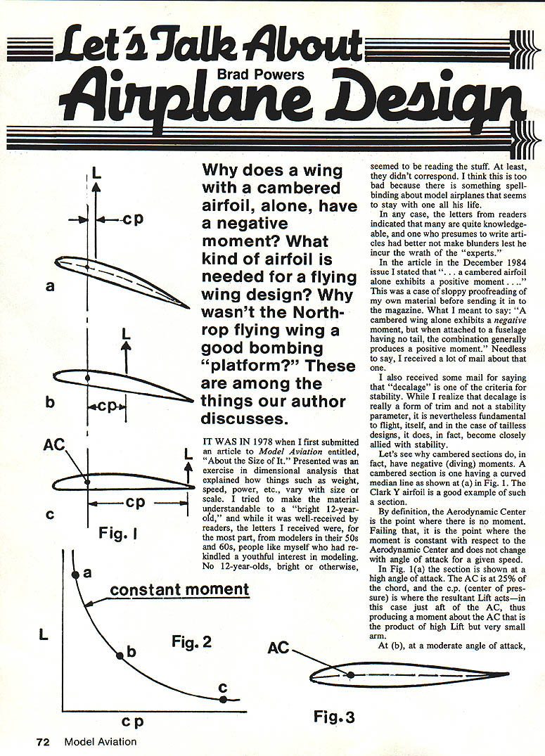 a________ 47oIk qbout Brad Powers does wing cambered airfoil alone have negative moment What kind airfoil needed flying wing design wasnt North rop flying wing good bombing platform IT WAS IN 1978 first submitted article Model Aviation entitled About Size Presented exercise dimensional analysis explained things such weight speed power etc vary size scale tried make material understandable bright 12-yearofd well-received readers letters received part modelers SOs 60s people like myself re kindled youthful interest modeling No 1 2-year-olds bright otherwise AC mmiii seemed reading stuff least didnt correspond think too bad because something spell binding about model airplanes seems stay life case letters readers indicated quite knowledge able presumes write arti cles better make blunders lest incur wrath experts article December 1984 issue stated mbered airfoil alone exhibits positive moment.. case sloppy proofreading own material before sending magazine What meant say cambered wing alone exhibits negative moment attached fuselage having no tail combination generally produces positive moment Needless say received lot mail about also received some mail saying decalage criteria stability realize decalage really form trim stability parameter nevertheless fundamental flight itself case tailless designs does fact become closely allied stability Lets see cambered sections fact have negative diving moments cambered section having curved median line shown Fig 1 Clark Y airfoil good example such section definition Aerodynamic Center point no moment Failing point moment constant respect Aerodynamic Center does change angle attack given speed Fig 1a section shown high angle attack AC 25% chord cp center pres sure resultant Lift actsin case just aft AC thus producing moment about AC product high Lift very small arm b moderate angle attack Fig3 72 Model Aviation Ij 4-CP La are among things author discusses b C L L H Fig constant moment cp moment product less Lift however acts longer arm thus producing moment equivalent c angle attack very small Lift also very small acts very long arm way back near trailing edgeand again produces moment equivalent b can say least infer angle attack given speed moment about AC will constant will lie curve con stant moment shown Fig 2 moment will Negative Diving moment because lift acts aft AC tending pitch nose down Such airfoil said unstable ie cant made fly itself must have trimming surface either behind conventional design front canard integral part tailless design Such trimming surface must set angle trim wing keep pitching down angular differ ence between two surfaces called decalage sometimes called lon gitudinal dihedral misnomer since has nothing dihedral earlier article discussed sta bility conventional configuration said stable airplane must have CG forward neutral point defined AC whole airplane Now lets see applies tailless design Obviously cant use unstable cambered airfoil dont have tail can So will have use stable airfoil such shown Fig 3 Its mean line turns up trailing edge cause nose pitch UP rather down dive did Clark Y example proper placement GO such wing alone can made fly stable fashion Turning up trailing edge has effect moving AC forward bit usually about 23% 24% chord Neutral Point stable airfoil point aft CG must go stability maintained Since decalage short coupled can regard upturned TE tail limited far forward CO can placed have good pitch control 20% chord MAC far forward practicable result tailless designs have very limited permissible CG travel range about 3% MAC limited CG range reason Northrops flying wing wasnt very suc cessful bomber too limited CO travel provide good bombing platform whereas conventional de signs long tails such B-24 B-17 comparatively steady rock other hand modern tailless de [ AR8 S sq V 322 27 60 KL MAV 78 9 Permissible Travel 24 inches Fig 4a 1 1861 56 inches AR sq signs utilize very low aspect ratios such delta configuration have such long chords 3% CG travel isnt bad Also extending long forebody adding lateral fins travel can extended somewhat shown Fig 4b AC moved forward Because long chord high speeds tend prevent oscil lations steady platform achieved Just see works lets make comparison Lets design wing similar Northrops compare delta wing equal area An empirical rule once developed determine proper Taper Ratio versus Aspect Ratio retained good stalling characteristics 20 AR TRavg wingsnot deltas 20 AR say aspect ratio 8 will fair approximation Northrops wing TR 2 decide area say 450 sq wing will have dimen sions shown Fig 4a MAC will just under 8 permissible CG travel will slightly less quarter inchpretty limited model 5-ft span other hand delta configu ration shown 4b will have over half inch permissible travelcomparable conventional model Because pressure distribution over both upper lower surfaces essentially same symmetrical air foil no camber has no moment about AC its AC 25% chord Such airfoils usually used tailless designs because simpler design build shown Fig 3 UP elevon deflection converts section stable Questions comments may ad dressed Brad Powers 5470 Castle Hills Dr San Diego CA 92109 Flying Near Al rports Careful Safe Flying No Accident October 1985 73 IiMAC 9 Travel Fig4b I