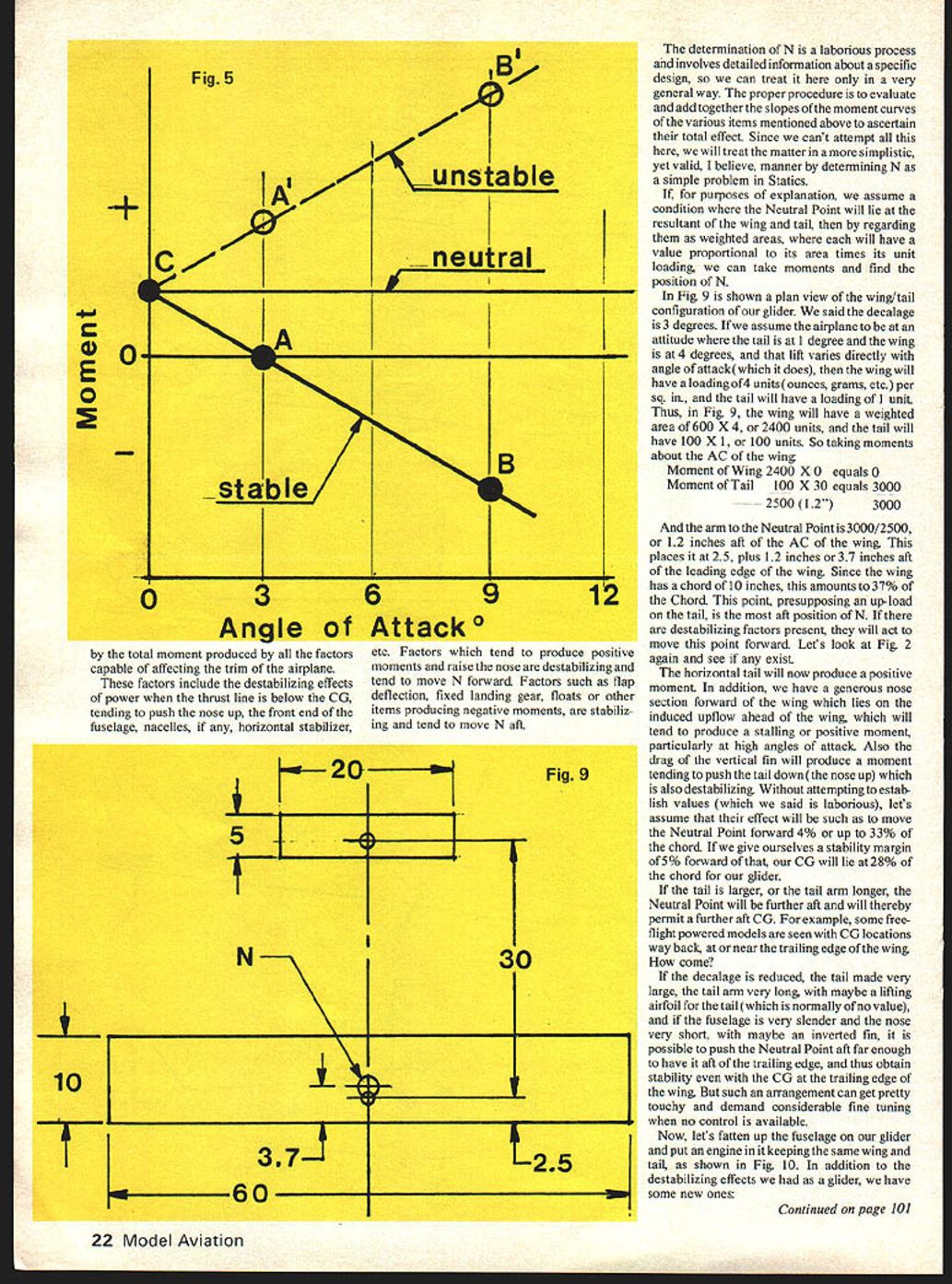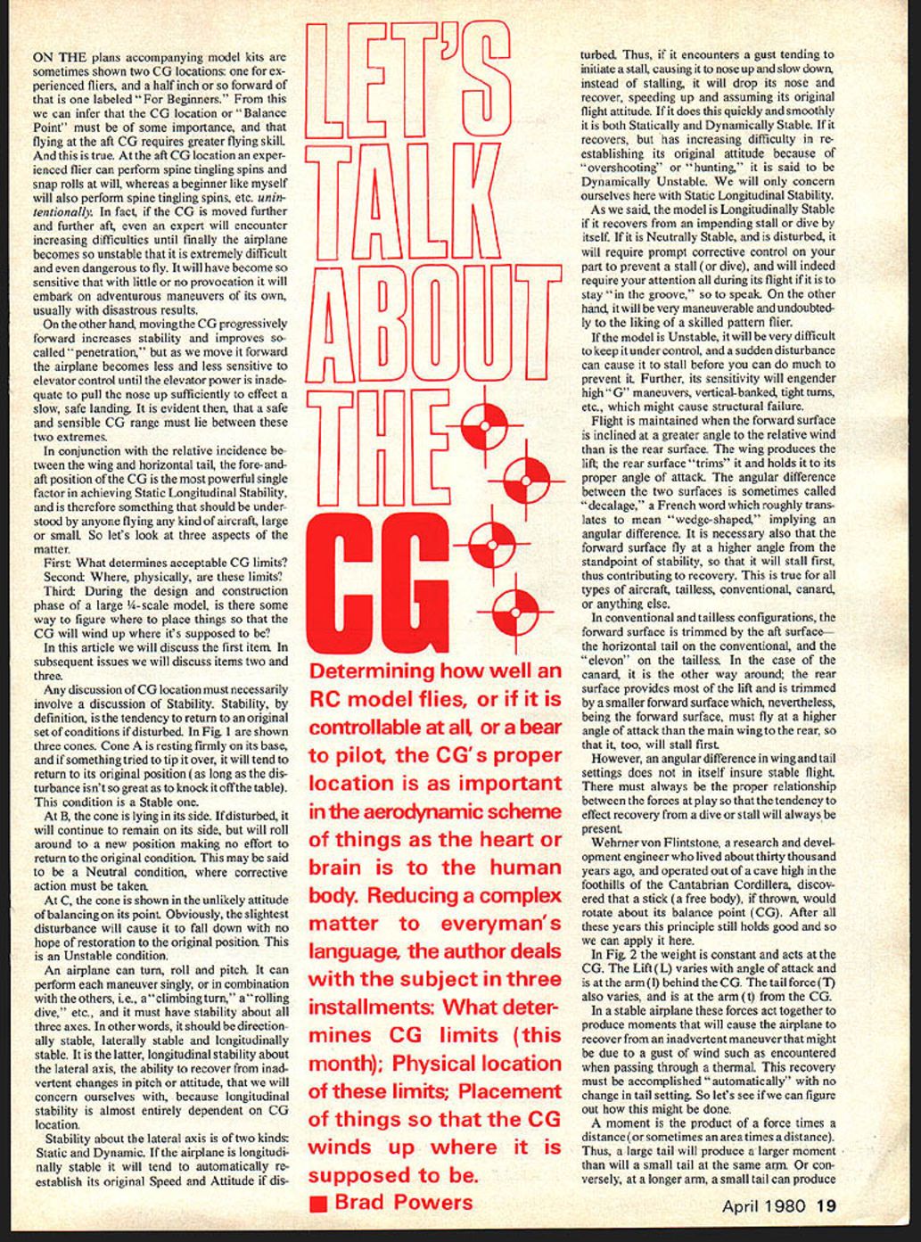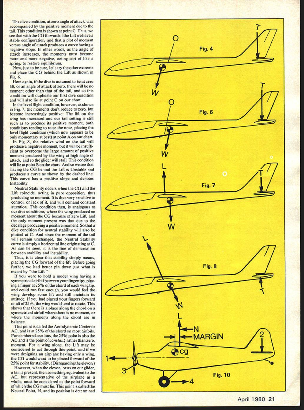 ON THE plans accompanying model kits sometimes shown two CG locations ex perienced fliers half inch forward labeled Beginners can infer CG location Balance Point must some importance flying aft CG requires greater flying skilL true aft CG location exper ienced flier can perform spine tingling spins snap rolls will whereas beginner like myself will also perform spine tingling spins etc unin tentionally fact CG moved further further aft expert will encounter increasing difficulties until finally airplane becomes unstable extremely difficult dangerous fly will have become sensitive little no provocation will embark adventurous maneuvers its own usually disastrous results other hand moving CG progressively forward increases stability improves socalled penetration move forward airplane becomes less less sensitive elevator control until elevator power inade quate pull nose up sufficiently effect slow safe landing evident safe sensible CG range must lie between two extremes conjunction relative incidence tween wing horizontal tail fore andaft position CG powerful single factor achieving Static Longitudinal Stability therefore something should under stood anyone flying kind aircraft large small So lets look three aspects matter First What determines acceptable CG limits Second physically limits Third During design construction phase large -scale model some way figure place things CG will wind up its supposed article will discuss first item subsequent issues will discuss items two three Any discussion CG location must necessarily involve discussion Stability Stability definition tendency return original set conditions disturbed Fig 1 shown three cones Cone resting firmly its base something tried tip over will tend return its original position long dis turbance isnt great knock offthe table condition Stable B cone lying its side disturbed will continue remain its side will roll around new position making no effort return original condition maybe said Neutral condition corrective action must taken C cone shown unlikely attitude balancing its point Obviously slightest disturbance will cause fall down no hope restoration original position Unstable condition An airplane can turn roll pitch can perform maneuver singly combination others ie climbing turn rolling dive etc must have stability about three axes other words should direction ally stable laterally stable longitudinally stable latter longitudinal stability about lateral axis ability recover inad vertent changes pitch attitude will concern ourselves because longitudinal stability almost entirely dependent CG location Stability about lateral axis two kinds Static Dynamic airplane longitudi nally stable will tend automatically re establish its original Speed Attitude dis EUJI] ULIL 4 4 Determining well RC model flies controllable alL bear pilot CGs proper location important aerodynamic scheme things heart brain human body Reducing complex matter everyman 5 language author deals subject three installments What deter mines CG limits month Physical location limits Placement things CG winds up supposed turbed Thus encounters gust tending initiate stall causing nose up slow down instead stalling will drop its nose recover speeding up assuming its original flight attitude does quickly smoothly both Statically Dynamically Stable recovers has increasing difficulty re establishing its original attitude because overshooting hunting said Dynamically Unstable will concern ourselves Static Longitudinal Stability As said model Longitudinally Stable recovers impending stall dive itself Neutrally Stable disturbed will require prompt corrective control part prevent stall dive will indeed require attention during its flight stay groove speak other hand will very maneuverable undoubted ly liking skilled pattern flier model Unstable will very difficult keep under control sudden disturbance can cause stall before can much prevent Further its sensitivity will engender highG maneuvers vertical-banked tight turns etc might cause structural failure Flight maintained forward surface inclined greater angle relative wind rear surface wing produces lift rear surface trims holds its proper angie attack angular difference between two surfaces sometimes called decalage French word roughly trans lates mean wedgeshaped implying angular difference necessary also forward surface fly higher angle standpoint stability will stall first thus contributing recovery true types aircraft tailless conventional canard anything else conventional tailless configurations forward surface trimmed aft surface horizontal tail conventional elevon tailless case canard other way around rear surface provides lift trimmed smaller forward surface nevertheless being forward surface must fly higher angie attack main wing rear too will stall first However angular difference wing tail settings does itself insure stable flight must always proper relationship between forces play tendency effect recovery dive stall will always present Webruer von Flintstone research devel opment engineer lived aboutthirty thousand years ago operated out cave high foothills Cantabrian Cordillera discov ered stick free body thrown would rotate about its balance point CG After years principle still holds good can apply Fig 2 weight constant acts CG Lift ries angle attack arm behind CG tail force T also varies arm t CG stable airplane forces act together produce moments will cause airplane recover inadvertent maneuver might due gust wind such encountered passing through thermal recovery must accomplished automatically no change tail setting So lets see can figure out might done moment product force times distance sometimes area times distance Thus large tail will produce larger moment will small tail same arm con versely longer arm small tail can produce Brad PowersApril 1980 19 Fig 1 / / C N V NEUTRALUNSTABLE moment equal large tail shorter arm etc Lets call stalling nose-up moments posi tive anddiving nose-down moments negative tak