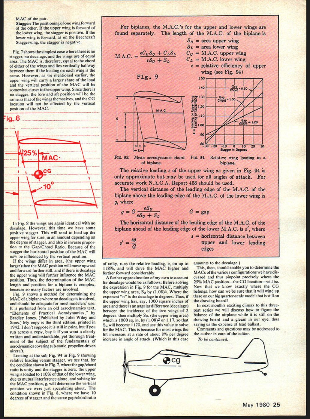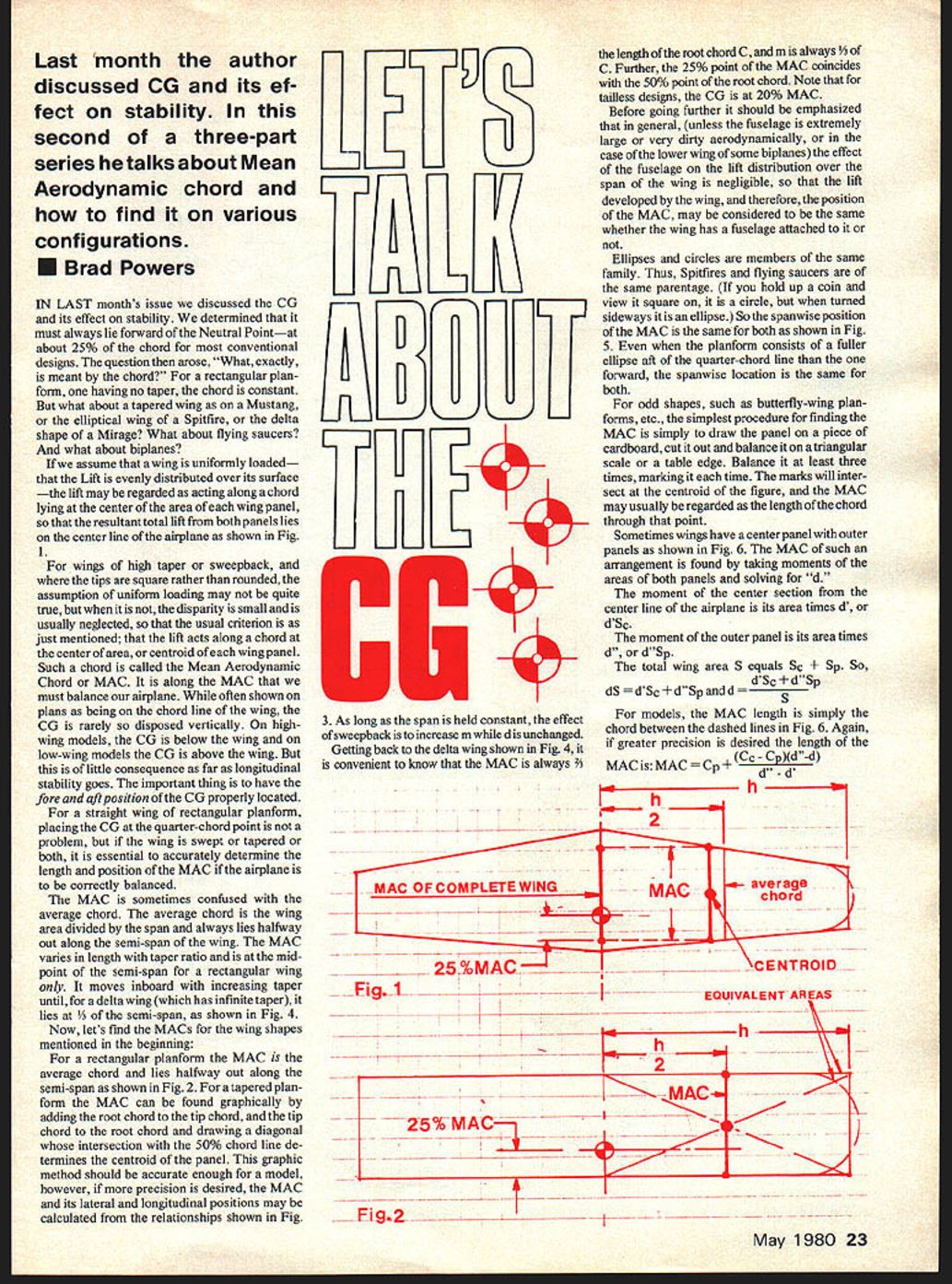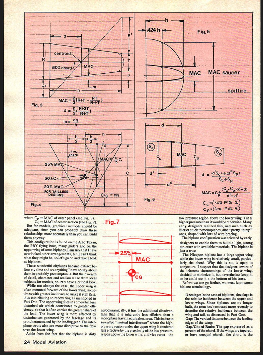 Last month author discussed CO its ef fect stability second three-part series talks about Mean Aerodynamic chord find various configurations Brad Powers IN LAST months issue discussed CG its effect stability determined must always lie forward Neutral Pointat about 25% chord conventional designs question arose What exactly meant chord rectangular planform having no taper chord constant what about tapered wing Mustang elliptical wing Spitfire delta shape Mirage What about flying saucers what about biplanes assume wing uniformly loaded Lift evenly distributed over its surface lift may regarded acting along chord lying center area wing panel resultant total lift both panels lies center line airplane shown Fig 1 wings high taper sweepback tips square rather rounded assumption uniform loading may quite true disparity small usually neglected usual criterion just mentioned lift acts along chord center area centroid wing panel Such chord called Mean Aerodynamic Chord MAC along MAC must balance airplane often shown plans being chord line wing CG rarely disposed vertically highwing models CG below wing low-wing models CG above wing little consequence far longitudinal stability goes important thing have fore aft position CG properly located straight wing rectangular planform placing CG quarter-chord point problem wing swept tapered both essential accurately determine length position MAC airplane correctly balanced MAC sometimes confused average chord average chord wing area divided span always lies halfway out along semi-span wing MAC varies length taper ratio mid point semi-span rectangular wing moves inboard increasing taper until delta wing has infinite taper lies -span shown Fig 4 Now lets find MACs wing shapes mentioned beginning rectangular planform MAC average chord lies halfway out along semi-span shown Fig 2 tapered planform MAC can found graphically adding root chord tip chord tip chord root chord drawing diagonal intersection 50% chord line de termines centroid panel graphic method should accurate enough model however precision desired MAC its lateral longitudinal positions may calculated relationships shown Fig ULiLL L3LULTET 4 3 As long span held constant effect sweepback increase m whiled unchanged Getting back delta wing shown Fig 4 convenient know MAC always th rootchordC andmis always rther 25% point MAC coincides 50% point root chord Note tailless designs CG 20% MAC Before going further should emphasized general unless fuselage extremely large very dirty aerodynamically case lower wing some biplanes effect fuselage lift distribution over span wing negligible lift developed wing therefore position MAC may considered same whether wing has fuselage attached Ellipses circles members same family Thus Spitfires flying saucers same parentage hold up coin view square circle turned sideways itis ellipse Sothe spanwise position MAC same both shown Fig 5 planform consists fuller ellipse aft quarter-chord line forward spanwise location same both odd shapes such butterfly-wing planforms etc simplest procedure finding MAC simply draw panel piece cardboard cut out balance triangular scale table edge Balance least three times marking time marks will inter sect centroid figure MAC may usually regarded length chord through point Sometimes wings have acenterpanel outer panels shown Fig 6 MAC such arrangement found taking moments areas both panels solving d moment center section center line airplane its area times d dSc moment outer panel its area times d dSp total wing area S equals Sc o dSc dSdScdSpandd ls MAC length simply chord between dashed lines Fig 6 Again greater precision desired length MAC MAC Cp CpXd-d 2 1 MACaverage - CENTROID 25%MACFig IIEOUIVALENT AREAS h -h ________________________2 MAC 7---25%MAcII Fig.2I 1980 23 AF _-- 6 MAC11- Lir_- rITt hR2T mi—-- -II c7_ 7 - -- I 7 IqKi F V - __ C 5G9C-2- _____ 2OMAC -OSS~ ---1 \lII NV* Cp outer panel see Fig 3 Cc center section see Fig 2 models graphical methods should adequate since can probably draw relationships accurately can build anyway configuration found AT6 Texan PBY flying boat gliders upper wing some biplanes am sure have overlooked other arrangements cant think what might lets go take look biplanes wonderful airplanes became extinct fore time anything have say about probably presumptuous wealth detail character realism make ideal subjects models lets have critical look always case upper wing often mounted forward lower wing some times greater incidence make stall first thus contributing recovering mentioned Part upper wing flies somewhat less disturbed air contributes greater effi ciency often carries greater share load lower wing affected disturbances generated fuselage its protuberances landing gear interplane struts also disruptive flow over lower wing Aside fact biplane dirty 424h- Fig5 MAC MAC saucer spitfire d E3 C ci dSp scsp cCcCD{dd MAC Fig,7 25%. MAC aerodynamically has additional disadvan tage inherently less efficient monoplane having equivalent area due so-called mutual interference highpressure region under upper wing rendered less effective proximity low pressureregion above lower wing vice versathe low pressure region above lower wing higher pressure would otherwise early designers realized men such Blenot stuck monoplanes albeit pretty dirty ones draped lots wire bracing biplane configuration selected early designers enable build light strong structure available materials biplane just truss Nieuport biplane has large upper wing lower wing relatively small particu larly chord open conjecture suspect designer aware inherent shortcomings lower wing decided minimize nevertheless keep could use bottom truss Before can go further must learn some biplane tenninology Decalage case biplanes decalage relative incidence between upper lower wings Since biplanes no longer built term has used recently describe relative incidence between wing tail discussed Part Gap vertical distance between leading edges wings Gap/Chord Ratio gap