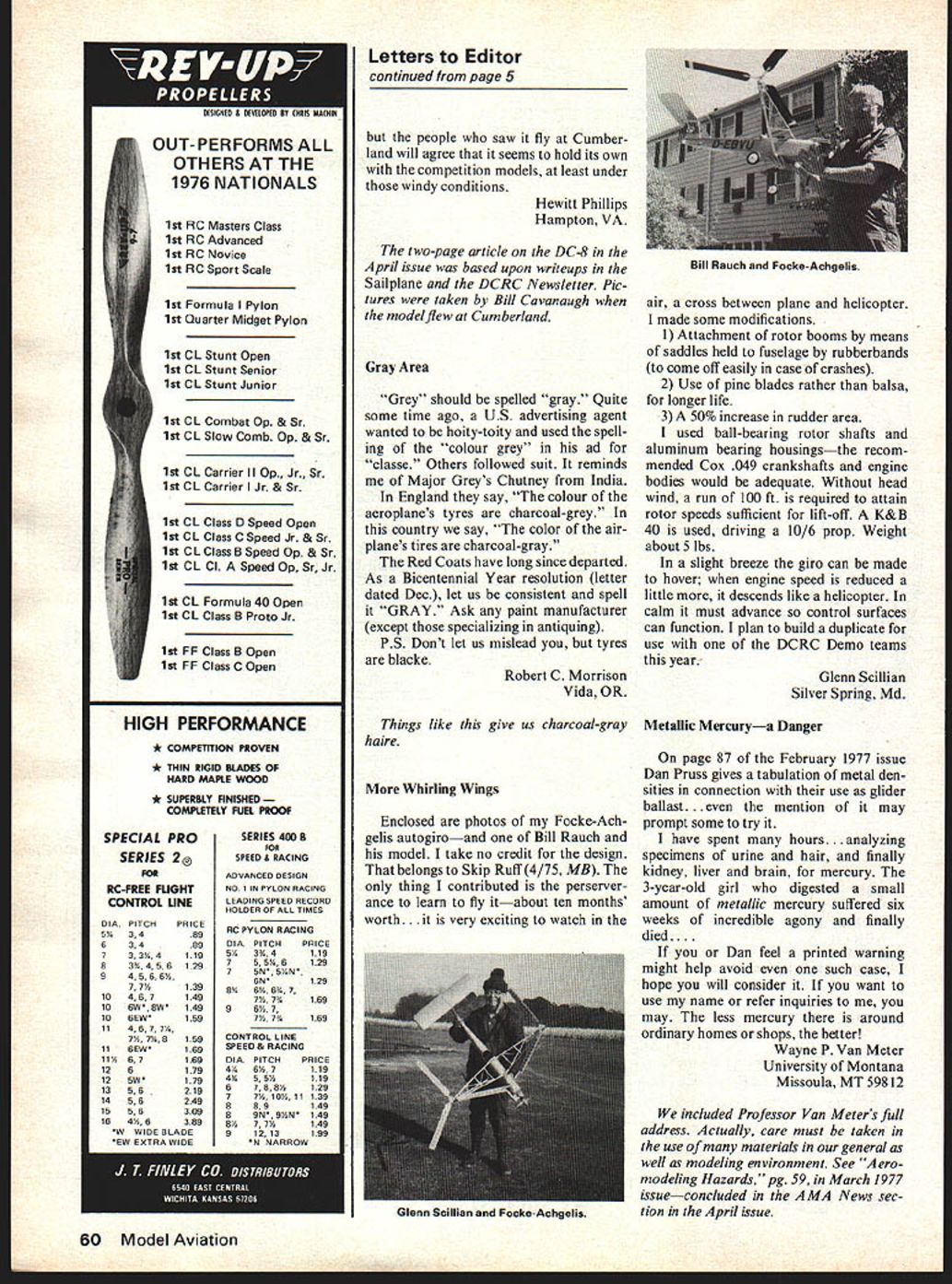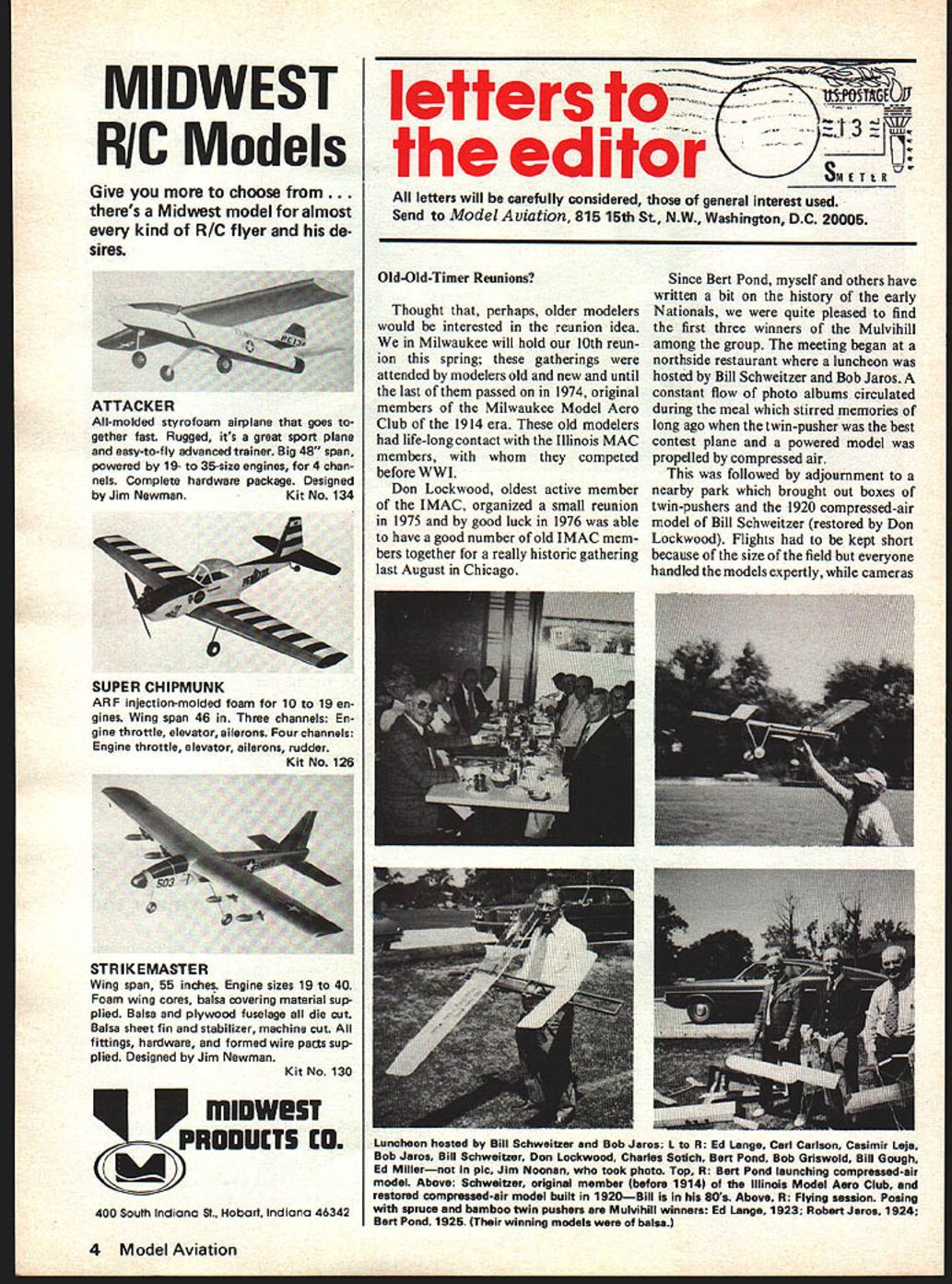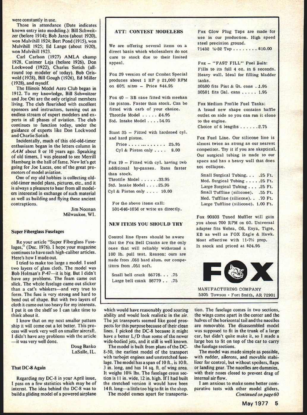 MIDWEST FIIC Models Give choose . theres Midwest model almost kind R/C flyer de sires ATTACKER All-molded styrofoam airplane goes gether fast Rugged its great sport plane easy-to-fly advanced trainer Big 48 span powered 19- 35-size engines 4 chan nels Complete hardware package Designed Jim NewmanKit No 134 SUPER CHIPMUNK ARF injection-molded foam 10 19 en gines Wing span 46 Three channels En gine throttle elevator ailerons Four channels Engine throttle elevator ailerons rudder Kit No 126 STR IKEMASTER Wing span 55 inches Engine sizes 19 40 Foam wing cores balsa covering material sup plied Balsa plywood fuselage die cut Balsa sheet fin stabilizer machine cut fittings hardware formed wire parts sup plied Designed Jim Newman Kit No 130 mrnW5T hi 400 South Indiana St Hobart IndIana 46342 --1ThPTGEb0 letters to~ editor SM letters will carefully considered general interest used Send Model Aviation 815 15th St N W Washington DC 20005 Old-Old-Timer Reunions Thought perhaps older modelers would interested reunion idea Milwaukee will hold 10th reun ion spring gatherings attended modelers old new until last passed 1974 original members Milwaukee Model Aero Club 1914 era old modelers life-long contact Illinois MAC members competed before WWI Don Lockwood oldest active member IMAC organized small reunion 1975 good luck 1976 able have good number old IMAC mem bers together really historic gathering last August Chicago Since Bert Pond myself others have written bit history early Nationals quite pleased find first three winners Mulvihill among group meeting began northside restaurant luncheon hosted Bill Schweitzer Bob Jaros constant flow photo albums circulated during meal stirred memories long ago twin-pusher best contest plane powered model propelled compressed air followed adjournment nearby park brought out boxes twin-pushers 1920 compressed-air model Bill Schweitzer restored Don Lockwood Flights kept short because size field everyone handled models expertly cameras Luncheon hosted Bill Schweitzer Bob Jaros L R Ed Lange Carl Carlson Casimir Leja Bob Jaros Bill Schweitzer Don Lockwood Charles Sotich Bert Pond Bob Griswold Bill Gough Ed Millernot pie Jim Noonan took photo Top Bert Pond launching compressed-air model Above Schweitzer original member before 1914 Illinois Model Aero Club restored compressed-air model built 1920Bill BOs Above Plying session Posing spruce bamboo twin pushers Mulvihill winners Ed Lange 1923 Robert Jaros 1924 Bert Pond 1925 winning models balsa 4 Model Aviation constantly use attendance Date indicates known entry modeling Bill Schweit zer before 1914 Bob Jaros about 1920 won Mulvihill 1924 Bert Pond1915 won Mulvihill 1925 Ed Lange about 1920 won Mulvihill 1923 Carl Carlson 1927 AMLA champ 1928 Casimer Leja before 1926 Don Lockwood 1922 Charles Sotich round top modeler today Bob Gris wold 1928 Bill Gough 1926 Ed Miller 1928 myself Illinois Model Aero Club began 1912 knowledge Bill Schweitzer Joe Ott original members living club flourished excellent sponsors instructors turning out endless stream expert modelers ex perts phases aviation club continues function today under guidance experts like Don Lockwood Charlie Sotich Incidentally much old-old-timer enthusiasm began letters column AAM about 8 10 years ago Speaking old timers pleased see Merrill Hamburg hall fame Now lets get going Joe Lucas great promotors model aviation old hobbies collecting oldold-timer model plans pictures etc always pleasure hear model ers interested exchange such material well building flying ancient contraptions Jim Noonan Milwaukee WI Super Fiberglass Fuselages Re article Super Fiberglass Fuse lages Dec 1976 hope magazine continues have such high-caliber articles Heres howl made out tried make too large model used two layers glass cloth model Bob Holmans P-47-it big didnt have problems foam came out slick whole fuselage came out slicker cats whiskersand very true form fuse very strong hard bend out shape two layers cloth came out too heavy interests put shelf can take time think about know next smaller pattern ship will come out lot better pro cess will work very well smaller aircraft didnt have problems article very well done DC-S Again ATT CONTEST MODELERS offering several items direct basis wholesalers care stock due limited appeal Fox 29 version Combat Special produces about 1 HP @ 21000 RPM 60% nitro e $4495 Fox 40 ase fitted meehan ite piston Faster stock Can fitted carb choice Throttle ModelB495 Std Intake Model 495 Stunt 35 ed hardened cyl hard piston Price2595 Cyl & Piston 00 Fox 19 ed cyl having twb additional by-passes Runs faster stock Throttle Model3395 Std Intake Model 595 Cyl & Piston 00 above items call 501-646-1656 or write us directly NEW ITEMS YOU SHOULD TRY Control line flyers should aware Fox Bell Cranks ones will reliably withstand 100 lb pull test Reason made 063 hard alum compe titors 051 soft Small bell crank 86778 Large bell crank 86779 would have reasonably good soaring ability would look realistic air jet transports seemed like good pros pects purpose because clean lines picked DC-8 because might have better L/D some newer wide-bodied jets still well known Doug Banko model built plans DC LaSalle IL 8-50 earliest model transport turbojet engines unstretched fuse lage model has span 10 ft lOft 3 long has 14 sq ft wing area weighs 10 lbs fuselage cross sec tion 11 wide 12 high built stretched version would have 14 ft longa little too big fit shop model comes apart transporta Regarding DC-8 April issue pass few statistics may interest idea behind DC-8 build gliding model powered airplane Fox Glow Plug Taps made use production High speed steel precision ground 71432 1A-32 Tap $1000 Fox FILL Fuel Bulb Fills its full 4 oz 8 seconds Heavy wall Ideal filling bladder tanks 30500 fits Pint & Qt cans .195 30501 fits Gal cans 195 Fox Medium Profile Fuel Tanks brand new shape contains baffle outlet side can run close engine Choice 6 lengths 275 Fox Fuel Line silicone line almost twice
