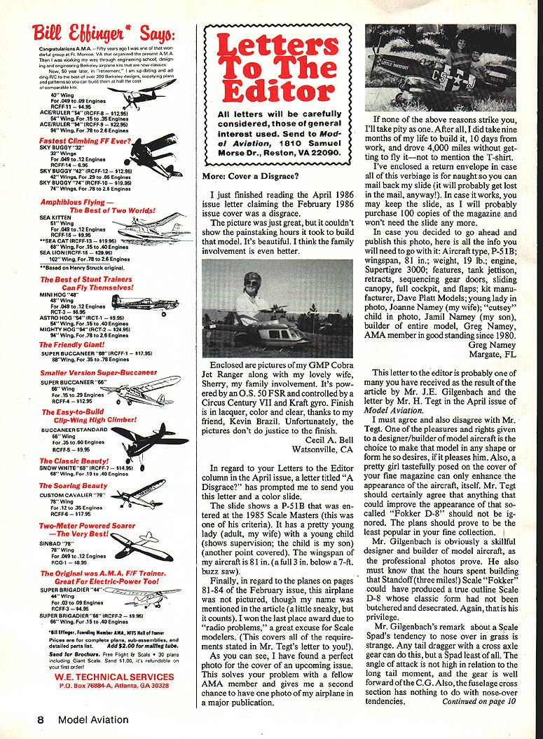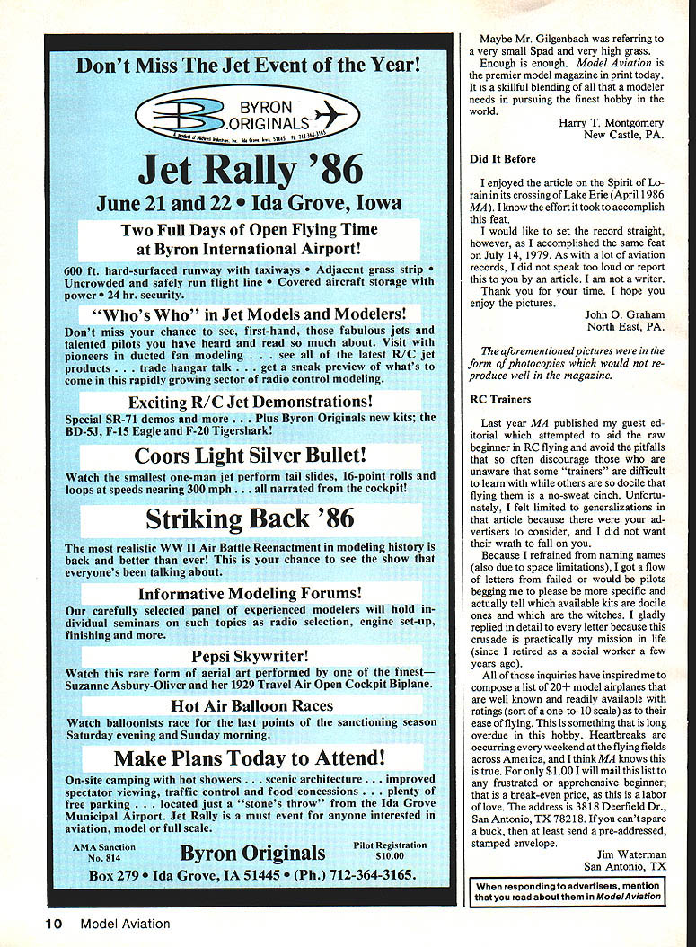 BiER C66iMq& Saq Congratulations AMA y years ago won derful troop Fr Monroe VA organized present AMA Wurkieg way through esginenring school design jog engineering Berkeley airplane kits ate now classics Now P0 year later retirement am up-dating ad ding PlC best atoner 200 Pmkeley designs supplying plans patterns can build half cast comparabln kits 40 Wing 049 toGS Engines RCFF-11 ACEJRULER 54 RCFF-S 5 54 Wing 15 36 EngInes ACE/RULER 94 RCFF-9 5 94 Wing 79 25 Enginas Fastest Climbing FF Ever SKY BUGGY 32 32 WIngs 049 12 Engines RCFF-14 695 SKY BUGGY 42 RCFF-12 5 42 WIngs 29 66 Engines SKY BUGGY 74 RCFF-10 $1995 74 WIngs 79 26 Enginas Amphibious Flying Best Two Worids SEA KITTEN 51 Wing 048 12 Engines RCFF16 0SEACATIRCFF13$1995 68 WIng 16 40 Engines SEA LION RCFF-15 5 102 WIng 78 26 Engines Based Henry Struck original Best Stunt Trainers Can Fly Themselves MINI HOG 48 049 12 Engines RCT-3 ASTRO HOG 54 lRCT1 54 Wing 15 40 Engines MIGHTY HOG K RCT-2 $2495 54 WIng 78 26 Engines Friendly Giant SUPER BUCCANEER 88 RCFF-1 5 98Wing 35 79 Engines Smaller Version Super-Buccaneer SUPER BUCCANEER 66 66 Wing 15 29 Engines -4 $1295 Easy-to-Build Clip-Wing High Climber BUCCANEER STANDARD 66 Wing 35 60 Engines RCFF-5 Classic Beauty SNOW WHITE66 RCFF-7 $1495 66 Wing 19 40 Engines Soaring Beauty 79 WIng CUSTOM CAVALIER 79 12 35 Engines RCFF6 5 Two-Meter Powered Soarer -The Very Best SINBAD 79 78 Wing 049 12 Engines RCG-1 The Original AMA F/F Trainer Great Electric-Power Too SUPER BRIGADIER 4444 Wing 03 09 Engines RCFF-3 SUPER BRIGADIER 66 RCFF-2 $995 66 Wing Fur 15 40 Engines BlIl Effingar Founding Mesbor AMA NFFS Hell 1 Fester Prices era complete plans sub-asssmbies end detailed pens listAdd 8200 mailing tube Seed Brochure Free Flight & Scale n 30 plans including Giant Scale Send $100 its refuadabln pour first order WE TECHNICAL SERVICES PO BDX 76884A Atlanta GA 30328 More Cover Disgrace just finished reading April 1986 issue letter claiming February 1986 issue cover disgrace picture just great couldnt show painstaking hours took build model Its beautiful think family involvement better Enclosed pictures iMP Cobra Jet Ranger along lovely wife Sherry family involvement Its pow ered OS 50 FSR controlled Circus Century VII Kraft gyro Finish lacquer color clear thanks friend Kevin Brazil Unfortunately pictures dont justice finish Cecil Bell Watsonville CA regard Letters Editor column April issue letter titled Disgrace has prompted send letter color slide slide shows P-51B en tered 1985 Scale Masters criteria has pretty young lady adult wife young child shows supervision child son another point covered wingspan aircraft 81 full 3 below 7-ft buzz saw Finally regard planes pages 81-84 February issue airplane pictured though name mentioned article little sneaky counts won last place award due radio problems great excuse Scale modelers covers require ments stated Mr Tegts letter As can see have found perfect photo cover upcoming issue solves problem fellow AMA member gives second chance have photo airplane major publication above reasons strike Ill take pity After did take nine months life build 10 days work drove 4000 miles get ting fly itnot mention T-shirt Ive enclosed return envelope case verbiage naught can mail back slide will probably get lost mail anyway case works may keep slide will probably purchase 100 copies magazine wont need slide case decided go ahead publish photo info will need go Aircrafttype P-5 iB wingspan 81 weight 19 lb engine Supertigre 3000 features tank jettison retracts sequencing gear doors sliding canopy full cockpit flaps kit manu facturer Dave Platt Models young lady photo Joanne Namey wife cutsey child photo Jamil Namey son builder entire model Greg Namey AMA member good standing since 1980 Greg Namey Margate FL letter editor probably have received result article Mr JE Gilgenbach letter Mr H Tegt April issue Model Aviation must agree also disagree Mr Tegt pleasures rights given designer/builder model aircraft choice make model shape form desires pleases him Also pretty girl tastefully posed cover fine magazine can enhance appearance aircraft itself Mr Tegt should certainly agree anything could improve appearance socalled Fokker D-8 should ig nored plans should prove least popular fine collection Mr Gilgenbach obviously skillful designer builder model aircraft professional photos prove also must know hours spent building Standoff three miles Scale Foer could have produced true outline Scale D-8 classic form butchered desecrated Again privilege Mr Gilgenbachs remark about Scale Spads tendency nose over grass strange Any tail dragger cross axle gear can Spad least angle attack high relation long tail moment gear well forward CG Also fuselage cross section has nothing nose-over tendenciesContinued page 10 8 Model Aviation Letters Editor letters will carefully considered general interest used Send Mod 1 Aviafion 1810 Samuel Morse Dr Reston VA 220g0 Dont Miss Jet Event Year BYRON LS Wa 6,, Wa 5445 PW iI 36636W Jet Rally 86 June 21 22 Grove Iowa Two Full Days Open Flying Time Byron International Airport 600 ft hard-surfaced runway taxiways cent grass strip e Uncrowded safely run flight line red aircraft storage 24 hr security Whos Jet Models Modelers Iont miss chance see first-hand fabulous jets talented pilots have heard read much about Visit pioneers ducted fan modeling e latest R/C jet products ade hangar talk t sneak preview whats come rapidly growing sector radio control modeling Exciting R/C Jet Demonstrations Special SR-71 demos more. Plus Byron Originals new kits BD-5J F-15 Eagle F-20 Tigershark Coors Light Silver Bullet Watch smallest one-man jet perform tail slides 16-point rolls loops speeds nearing 300 mph. narrated cockpit Striking Back 86 realistic WW II Air Battle Reenactment modeling history back better ever chance see show everyones talking about Informative Modeling Forums carefully selected panel experienced modelers will hold dividual seminars such topics radio selection