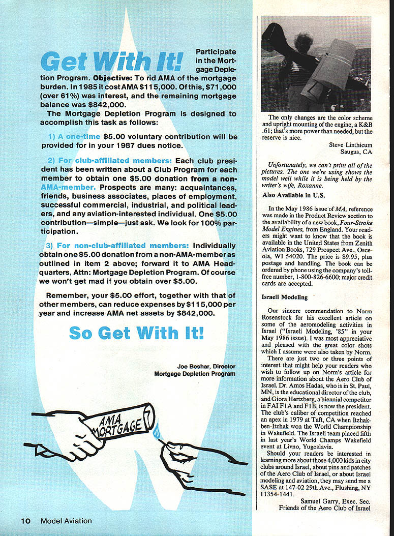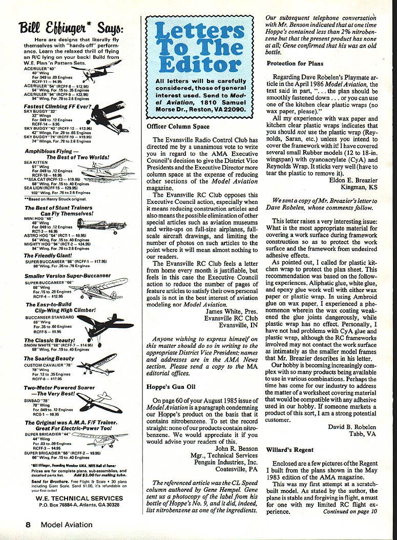Bit 66iug0It Sap designs literally fly themselves hands-off perform ance Learn relaxed thrill flying RIC lying backl Build WE Plan n Pattern Sets ACE/RULER 40 40 Wing 049 09 Engines RCFF-11 ACE/RULER 54 RCFF-6 5 54 Wing 15 35 Engines ACE/RULER 94 RCFF9 5 94 Wing 78 26 Engines Fastest Climbing FF Ever SKY BUGGY 32 32 Wings 049 12 Engines RCFF-14 SKY BUGGY 42 RCFF12 5 42 Wings 29 65 Engines SKY BUGGY 74 RCFF-10 5 74 WIngs 78 26 Engines Amphibious Flying Best Two Worlds SEA KITTEN For049tol2Engines RCFF-16 SEACATRCFF-13 $1995 no 65 WIng 15 40 Engines SEA LION RCFF-15 5 102 Wing 78 26 Engines Based Henry Struck original Best Stunt Trainers Can Fly Themselves MINI HOG 49 049 12 Engines RCT-3 ASTRO HOG 54 RCT-1 54 Wing 15 40 Engines MIGHTY HOG 94 RCT-2 $2495 94 Wing 78 26 Engines Friendly Giant SUPER BUCCANEER 68 RCFF-1 $1795 68Wng 35 78 Engines Smaller Version Super-Buccaneer SUPER BUCCANEER 66 66 Wing RCFF-4 5 Easy-to-Build Clip-Wing High Climber BUCCANEER STANDARD 66 Wing 6819 40 25 60 Engines RCFF-5 Classic Beauty SNOW WHITE 66 IRCFF-7 $1495 Wing ForEngines Soaring Beauty CUSTOM CAVALIER 78 78 Wing 12 35 Engines RCFF-6 5 Two-Meter Powered Soarer -The Very Best SINBAD 78 78 Wing 049 12 Engines RCG1 Original AMA F/F Trainer Great ElectrIc-Power Too SUPER BRIGADIER 44 ing 03 09 EngInes RCFF-3 SUPER BRIGADIER 66 RCFF-2 $995 66 WIng 15 40 Engines BIll IN lager FaaslIng Masiber AMA IPIS Hell af faer Prices ere complete plane sub-assemblies detailed parts list Add $200 mailing tube Send Stechure Free Flight & Scale lans including Giact Scale Send $100 its refundable nn first order WE TECHNICAL SERVICES PO Box 76884-A Atlanta GA 30328 Officer Column Space Evansville Radio Control Club has directed unanimous vote write regard AMA Executive Councils decision give District Vice Presidents Executive Director column space expense reducing other sections Model Aviation magazine Evansville RC Club opposes Executive Council action especially means reducing construction articles also means possible elimination other special articles such aviation museums write-ups full-size airplanes fullscale aircraft drawings limiting number photos such articles point will mean almost nothing readers Evansville RC Club feels letter home month justifiable feels case Executive Council action reduce number pages feature articles satisfy own personal goals best interest aviation modeling nor Model Aviation James White Pres Evansville RC Club Evansville IN Anyone wishing express himself matter should writing appropriate District Vice President names addresses AMA News section Please send copy MA editorial offices Hoppes Gun Oil page 60 August 1985 issue ModelAviation paragraph condemning Hoppes product basis contains nitrobenzene set record straight products contain nitro beazene would appreciate would advise readers John R Benson Mgr Technical Services Penguin Industries Inc Coatesville PA referenced article CL Speed column authored Gene Hempel Gene sent us photocopy label bottle Hoppes No 9 did indeed list nitrobenzene ingredients subsequent telephone conversation Mr Benson indicated time Hoppes contained less 2% nitroben zene present product has Gene confirmed old bottle Protection Plans Regarding Dave Robelens Playmate ar ticle April 1986 ModelAviation text said part . should smoothly fastened down use kitchen clear plastic wraps no wax paper please experience wax paper kitchen clear plastic wraps indicates should use plastic wrap Rey nolds Saran etc unless intend cover framework have covered several small Rubber models 12 18-in wingspan cyanoacrylate CyA Reynolds Wrap sticks very well have tear plastic remove Eldon E Breazier Kingman KS sent copy ofMr Breaziers letter Dave Robelen comments follow letter raises very interesting issue What appropriate material covering work surface during framework construction protect work surface framework undesired adhesive effects As pointed out called plastic kit chen wrap protect plan sheet recommendation based follow ing experiences Aliphatic glue white glue epoxy glue work well either wax paper plastic wrap using Ambroid glue wax paper experienced phe nomenon wherein wax coating weak ened glue joints dangerously plastic wrap has no effect Personally have problems CyA glue plastic wrap although RC frameworks involved may contact work surface intimately smaller model frames Mr Breazier describes letter hobby becoming increasingly com plex products being available use various combinations Perhaps time has come industry address matter worksheet covering material would compatible adhesive used hobby someone markets product sort am strong potential customer David B Robelen Tabb VA Willards Regent Enclosed few pictures Regent built plans shown May 1983 edition AMA magazine first attempt scratchbuilt model As stated author plane stable forgiving flight must limited RC flight ex perienceContinued page 10 8 Model Aviation Editor letters will carefully considered general interest used Send Mod el AvIation 1810 Samuel Morse Dr Reston VA 22090 Participate ItI ntheMort IIgage Deple tion Program Objective rid AMA mortgage burden 1985 cost AMA $115000 $71000 over 61% interest remaining mortgage balance $842000 Mortgage Depletion Program designed accomplish task follows ~ $500 voluntary contribution will provided 1987 dues notice rn presi dent has written about Club Program member obtain $500 donation Prospects acquaintances friends business associates places employment successful commercial industrial political lead ers aviation-interested individual $500 contributionsimplejust ask look 100% partic ipation member Individually obtain $500 donation non-AMA-memberas outlined item 2 above forward AMA Head quarters Attn Mortgage Depletion Program course wont get mad obtain over $500 Remember $500 effort together other members can reduce expenses $115000 per year increase AMA net assets $842000 Get Jit t Joe Beshar Director Mortgage Depletion Program [he changes color scheme upright mounting engine K&B 