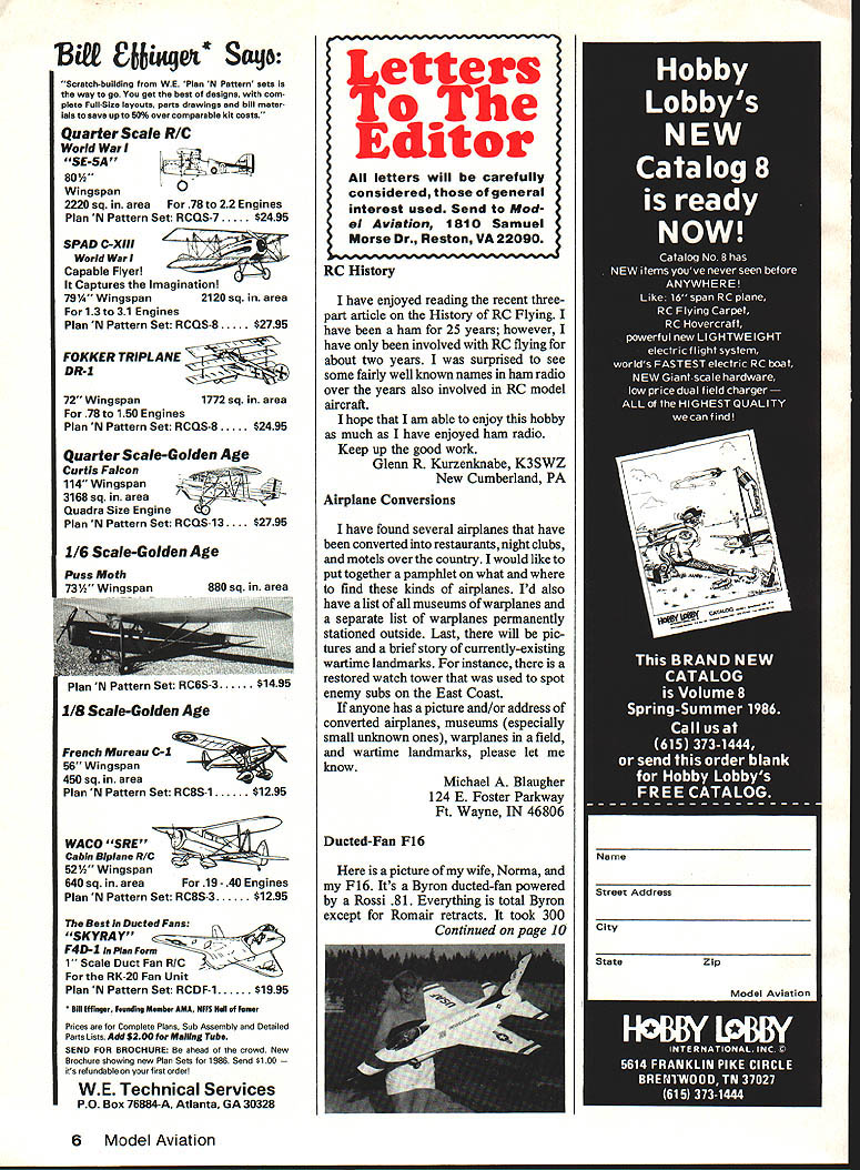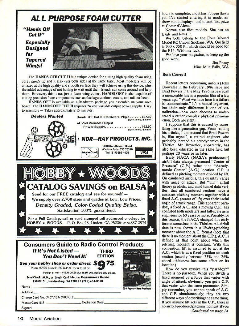 BiR 6ig& Sap Scratch-building WE Plan N Pattern sets way go get best designs com plete Full-Size layouts parts drawings end bill mater ials save up 50% ovar comparable kit costs Quarter Scale R/C World Wail SE-5A 80A Wingspan0 2220 sq area 78 22 Engines Plan N Pattern Set RCQS-7.. $2495 SPAD C-Xlll World War Capable Flyer Captures Imagination 7914 Wingspan 2120 sq area 13 31 Engines Plan N Pattern Set RCQS-8.. $2795 FOKKER TRIPLANE DR-I 72Wingspan 1772sqinarea 78 150 Engines Plan N Pattern Set RCQS-8.. $2495 Quarter Scale-Golden Age Curtis Falcon 114 Wingspan 3168 sq area Quadra Size Engine Plan N Pattern Set RCQS 13$27 95 1/6 Scale-Golden Age 1/8 Scale-Golden Age French Mureau C-I 56 Wingspan 450 sq area Plan N Pattern Set RC8S-1 ... $1295 WACO SRE CabIn BIplane R/C 521/s Wingspan 640 sq areaFor 19 40 Engines Plan N Pattern Set RC8S-3... $1295 Best Ducted Fans SKYRAY F4Di Plan Form 1 Scale Duct Fan RIC Forthe RK-20 Fan Unit Plan N Pattern Set RCDF-1... $1995 Bill Effleger Favedleg Member AMA NFFS Hall af Fame Prices Complete Plens Sub Assembly Detailed Parts Lists Add $200 i Mailing Tube SEND FOR BROCHURE ahead crowd New Brochure showing new Plan Sets 1986 Send $100 its refundable first order WE Technical Services PO Box 76884-A Atlanta GA 30328 RC History have enjoyed reading recent threepart article History RC Flying have ham 25 years however have involved RC flying about two years surprised see some fairly well known names ham radio over years also involved RC model aircraft hope am able enjoy hobby much have enjoyed ham radio Keep up good work Glenn P. Kurzenknabe K3SWZ New Cumberland PA Airplane Conversions have found several airplanes have converted restaurants night clubs motels over country would like put together pamphlet what find kinds airplanes Id also have list museums warplanes separate list warplanes permanently stationed outside Last will pic tures brief story currently-existing wartime landmarks instance restored watch tower used spot enemy subs East Coast anyone has picture and/or address converted airplanes museums especially small unknown ones warplanes field wartime landmarks please let know Michael Blaugher 124 E Foster Parkway Ft Wayne IN 46806 Ducted-Fan F16 picture wife Norma F16 Its Byron ducted-fan powered Rossi 81 Everything total Byron except Romair retracts took 300 Continued page 10 6 Model Aviation Letters Editor letters will carefully considered general 4 interest used Send Mod 1 Aviation 1810 Samuel 4 Morse Dr Reston VA 22090 Puss Moth 73/a Wingspan 880 en rn Plan N Pattern Set RC6S-3... Name Street Address City State Zip Model Avietion See hobby shop order dfrect $075 Price $795 plus $180 UPS total ign air mail $1345 $795 plus $5 501 u S dollars please Send Check M0 Credit Cord info Consumers Guide 150 Ott St Herrisonbure VA 22801 4340350 Name Address Charge Card No MC VISA CHOICE MasterCard lB # ______________________ Expiration Date hours complete hasnt flown yet Ive started entering model air show static displays took first prize Coeur dAlene Norma also flies models has Eagle loves both belong Four Mound Model RC Club Spokane WA field 700 x 350 ft should good F16 Wish luck love magazine keep up good work Jim Posey Nine Mile Falls WA Both Correctl Recent letters concerning airfoils John Brownlee February 1986 issue Brad Powers May 1986 issue recall memorable line popular film few years ago What have failure communicate Its heated argument difference vis ualizationhow chooses under stand rather complex physical phenom enon Both right suppose caused some thing like generation gap reading articles understand Brad Powers like myself retired engineer probably learned aerodynamics Thirties Mr Brownlee apparently has also educated same field perhaps 20 years later Early NACA NASAs predecessor airfoil data always presented Center Pressure CP rather Aerody namic Center AC location CP defined pitching moment divided lift cambered airfoils quantity varies angle attack thin airfoil theory predicts wind tunnel data veri fies cambered sections have constant pitching moment together fixed AC center lift over useful angle attack range apparent para dox fixed AC moving CP has confused both modelers full-scale aero engineers 60 years Possibly reason NACA changed early format sometime Thirties airfoil data now shown lift-drag-pitching moment about AC format note no moment about CP AC defined point about pitching moment constant convention lift assumed act AC fixed position section usually between 23% 26% chordthickness has some effect its location resolve paradox no paradox divide fixed moment force varies angle attack obviously get CP varies same parameter Sim ply remember cannot speak AC CP simultaneously two different ways describing same thing assume lift acts CP no airfoil-produced pitching moment Continued page 14 10 Model Aviation ALL PURPOSE FOAM CU1TER Hands Off Cut II Especially Designed Tapered Wings HANDS OFF CUT II unique device cutting high quality foam wing cores hands off also cuts both sides same time Most modelers will amazed high quality smooth surface will achieve using device plus added advantage having wait until friends can come around help However just foam wing cutter HANDS OFF also capable cutting precision foam components such fuselage sections cowls tail surfaces HANDS OFF available hardware package assemble own board HANDS OFF Cll requires 24 volt variable output power supply Easy assemble s approximately 15 minutes Dealers WantedHands Off Cut II Hardware Pkgl$8750 plus $3 ship & hand 24 Volt Variable Output Power Supply$5250 plus $3 ship ft hand 5008 Sandbeach Road Wichita Falls TX 76310 MasterCardTel 817692-4475VISA QL NORRAY PRODUCTS INC w Consumers Guide Radio Control Its Listed THIRD Dont Need EDITION Products u regina rruaacss place AC constant almost pitching moment due airfoil camber its immaterial conven don chosen both concepts correct Clark Y wing discussion similar Both right own context Powers right short-nosed fuselage attache
