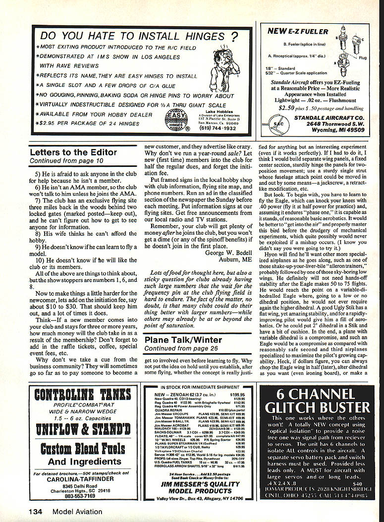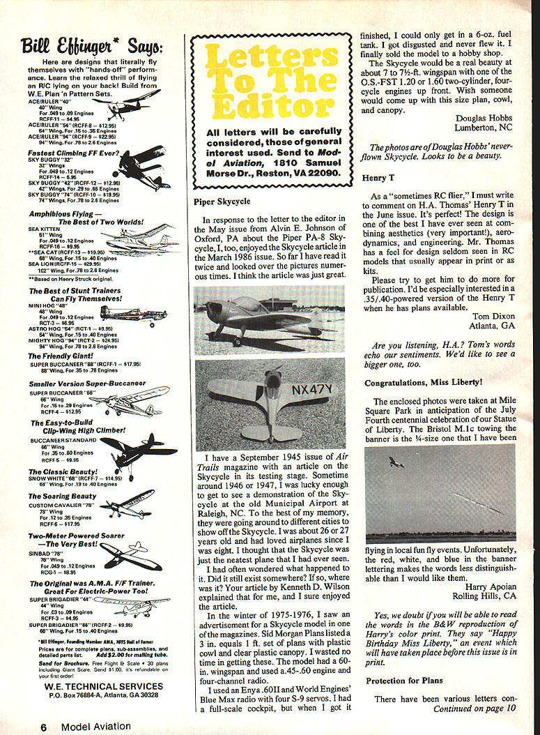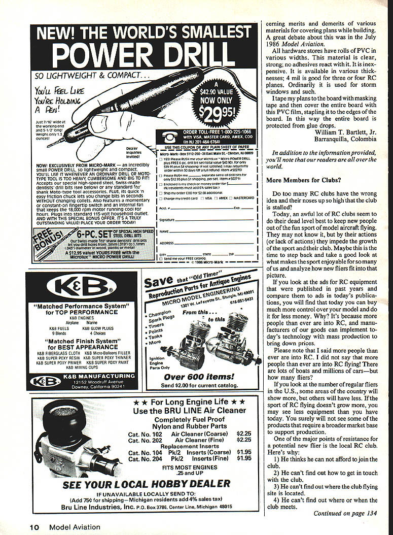 Bi C6iKg0I Sa*J6 designs literally fly themselves hands-off perform ance Learn relaxed thrill flying RC lying back Build WE Plan n Pattern Sets ACE/RULER 40 40 Wine 048 09 Engine RCFF-11 ACE/RULER 54 IRcFF-s 51 64 WIng 15 35 Engines ACE/RULER 94 IRcFF-5 51 94 WIng 78 26 Engines Fastest Climbing FF Ever SKY BUGGY 32 32 Wings 049 12 Engines RcFF-14 SKY BUGGY 42 IRCFF-12 6 42 WIngs 29 65 Engines SKY BUGGY 74 IRCFF-10 5 74 Wings 78 26 Engines Amphibious Flying Best Two Worlds 51 Wing 049 12 Engines \ -16 SEAcATlRcFF-13$1996 69 Wing 15 40 Engines SEA LION IRCFF-15 5 102 Wing 78 26 Engines Bssed Henry Struck original Best Stunt Trainers Can Fly Themselves MINI HOG 49 949 12 Engines RCT-3 ASTRO HOG 94 IRcT-1 94 Wing 15 40 Engines MIGHTY HOG 94 IRcT-2 $2495 94 Wing 78 26 Engines Friendly Giant SUPER BUCCANEER 95 IRCFF-1 $1795 68Wing 35 78 Engines Smaller Version Super-Buccaneer SUPER BUCCANEER 65- 66 Wing For15to29Engine5~/ RCFF-4 $1295 Easy-to-Build Clip-Wing High Climber BUCCANEER STANDARD 66 Wing 35 60 Engines RCFF-5 Classic Beauty SNOW WHITE 68 IRCFF-7 $1495 65 Wing 19 40 Engines Soaring Beauty CUSTOM CAVALIER 78 78 Wing 12 35 Engines RCFF-6 5 Two-Meter Powered Soarer -The Very Best SINBAD 78 78 Wing 049 12 Engines RCG-1 Original AMA F/F Trainer Great Electric-Power Too SUPER BRIGADIER 44 44 Wing 03 09 Engines RCFF-3 SUPER BRIGADIER 65 IRCFF-2 65 WIng Fur 15 40 Engines MlI Effinger feendlag Member AMA NEFf HeN Fame Prices complete plans sub-assemblies end detailed parts listAdd $200 maUling Nub. Seed Brochure Free Fliglit& Scale lans including Giant Scale Send $100 its refundable firut order WE TECHNICAL SERVICES PO Box 76884-A Atlanta GA 30328 Piper Skycycle response letter editor May issue Alvin E Johnson Oxford PA about Piper PA-8 Sky cycle too enjoyed Skycycle article March 1986 issue So far have read twice looked over pictures numer ous times think article just great have September 1945 issue Air Trails magazine article Skycycle its testing stage Sometime around 1946 1947 lucky enough get see demonstration Skycycle old Municipal Airport Raleigh NC best memory going around different cities show off Skycycle about 26 27 years old loved airplanes since eight thought Skycycle just neatest plane ever seen often wondered what happened Did still exist somewhere article Kenneth D Wilson explained sure enjoyed article winter 1975-1976 saw advertisement Skycycle model magazines Sid Morgan Plans listed 3 equals 1 ft set plans plastic cowl clear plastic canopy wasted no time getting these. model 60in wingspan used a45-60 engine four-channel radio used Enya 6011 World Engines Blue Max radio four S-9 servos full-scale cockpit got finished could get 6-oz fuel tank got disgusted never flew finally sold model hobby shop Skycycle would real beauty about 7 7-ft wingspan OS-FST 120 160 two-cylinder fourcycle engines up front Wish someone would come up size plan cowl canopy Dougias Hobbs Lumberton NC photos ofDouglas Hobbsnever flown Skycycle Looks beauty Henry T As sometimes RC flier must write comment HA Thomas Henry T June issue Its perfect design best have ever seen com bining aesthetics very important aero dynamics engineering Mr Thomas has feel design seldom seen RC models usually appear print kits Please try get him publication Id especially interested 35/40-powered version Henry T has plans available Tom Dixon Atlanta GA Are listening HA Toms words echo sentiments Wed like see bigger too Congratulations Miss Liberty enclosed photos taken Mile Square Park anticipation July Fourth centennial celebration Statue Liberty Bristol M ic towing banner -size ATtP have hying local runny events Unfortunately red white blue banner lettering makes words less distinguish able would like Harry Apoian Rolling Hills CA Yes doubt will able read words B& W reproduction Hariys color print say Happy Birthday Miss Liberty event will have taken place before issue print Protection Plans have various letters conContinued page 10 6 Model Aviation letters will carefully considered general interest used Send Mod el Aviation 1810 Samuel Morse Dr Reston VA 22090 Matched Performance System TOP PERFORMANCE K&B ENGINES AirplaneMarine K&B FUELSK&B GLOW PLUGS 9 Bleeds4 Choices Matched FInish System BEST APPEARANCE K&B FIBERGLASS CLOTH K&B Micro-Balloons FILLER K&B SUPER POXY RESIN K&B SUPER POXY THINNER K&B SUPER POXY PRIMER K&B SUPER POXY PAINT K&B MIXING CUPS ____________________ CITY ___________________ SlATE _________ ZIP U Send FREE 00100I 1986 MIcro MarIE aVO cOld Tililer 5IMEjew tJRo6 Ignit Eng ne Parts Only Over 600 items Send $200 current catalog * * Long Engine Life * * Use BRU LINE Air Cleaner Completely Fuel Proof Nylon Rubber Parts Cat No 102 Air Cleaner Coarse Cat No 202 Air Cleaner Fine Replacement Inserts Cat No 104 PkI2 Inserts Coarse Cat No 204 Pkl2 Inserts Fine $225 $225 $195 $195 FITS MOST ENGINES 25 UP addition information provided youll note readers over world Members Clubs ceming merits demerits various materials covering plans building great debate about July 1986 Model Aviation hardware Stores have rolls PVC various widths material clear strong no adhesives react inex pensive available various thick nesses 4 mil good three four RC planes Ordinarily used storm windows such tape plans board masking tape cover entire board PVC film stapling edges board way entire board protected glue drops William T Bartlett Jr Barranquilla Colombia too RC clubs have wrong idea noses up high club stalled Today awful lot RC clubs seem dead level best keep new people out fun sport model aircraft flying may know actions lack actions impede growth sport club Maybe time step back take good look what makes sport enjoyable us analyze new fliers fit picture look ads RC equipment published past years compare ads todays publica tions will find today can buy much control over model less money Its because people ever RC manu facturers goods can implement days technology mass production bring down prices Please note said people ever RC did sa