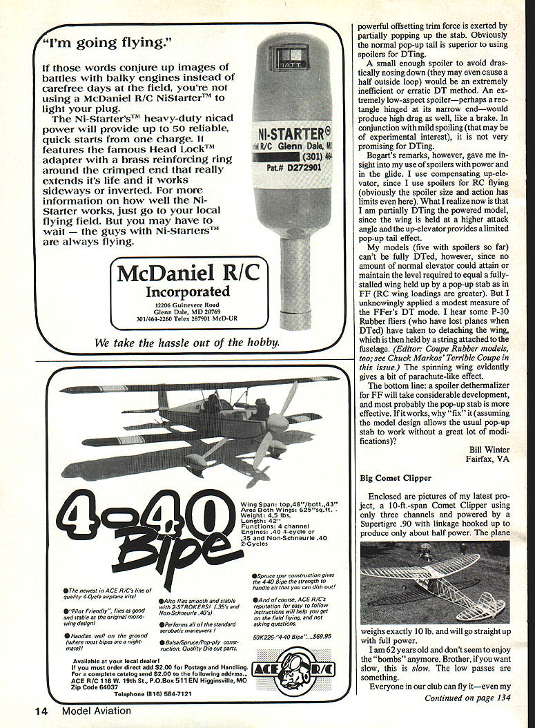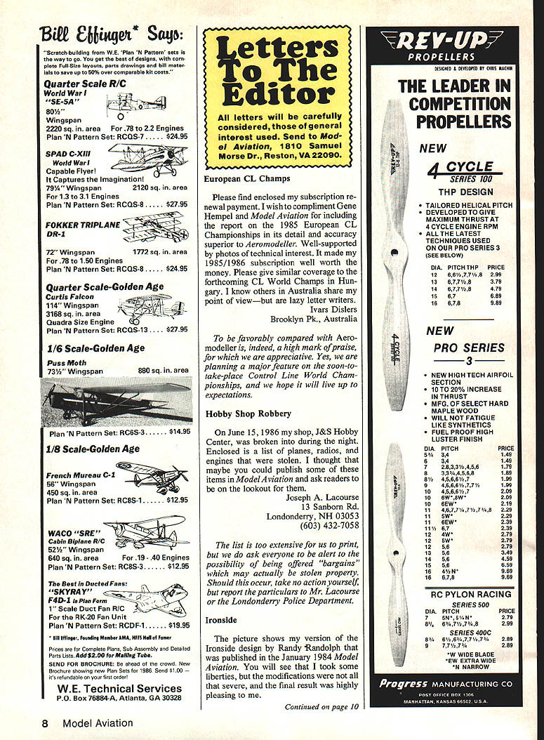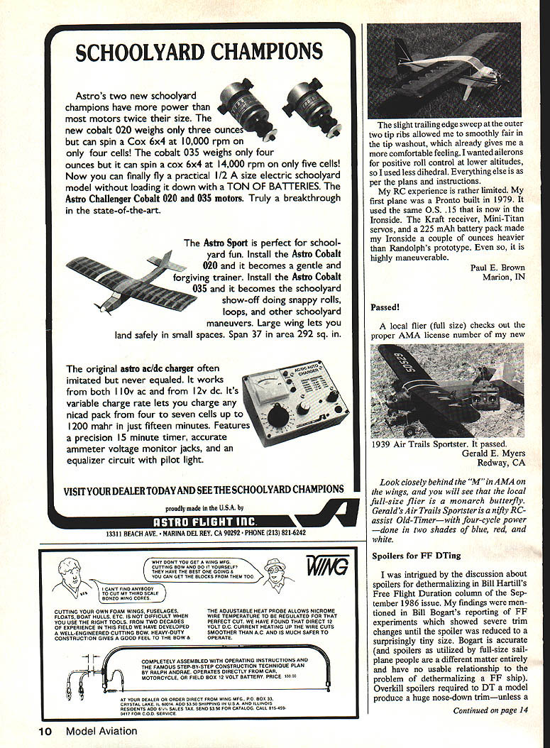 BiI3 isg& Sctp Scratch-building WE Plan N Pattern sets wey go get best designs com plete Full-Site layouts parts drawings end bill meter isis save up 50% over comparable kit costs Quarter Scale R/C World Wan SE-5A 80W Wingspan0 2220 sq area 78 22 Engines Plan N Pattern Set RCQS-7.. $2495 SPAD C-XIII World Wan Capable Flyer Captures Imaginationl 791/e Wingspan 2120 sq area 13 31 Engines Plan N Pattern Set RCQS-8.. $2795 FOKKER TRIPLANE DR-I 72 Wingspan 1772 sq area 78 150 Engines Plan N Pattern Set RCQS-8.. $2495 Quarter Scale-Golden Age Curtis Falcon 114 Wingspan ~AA--r 3168 sq area Quadra Size Engine Plan N Pattern Set RCQS-13 . $2795 1/6 Scale-Golden Age French Mureau C-I 56 Wingspan 450 sq area Plan N Pattern Set RC8S-1 ... $1295 WACO SRE Cabin Biplane R/C 52% Wingspan 640 sq area 19 40 Engines Plan N Pattern Set RC8S-3 1295 Beat Ducted Fans SKYRAY_ F4D1 Plan Fomn ale Duct Fan R/C RK-20 Fan Unit Plan N Pattern Set RCDF-1... $1995 Sill Effinger Fevedleg Member AMA WFFS Hell af Foe, Prices Complete Plans Sub Assembly Detailed Parts Lists Add $200 Mailing Tube SEND FOR BROCHURE ahead crowd New Brochure showing new Plan Sets 1986 Send $100 its refundable first orderl WE Technical Services PO Box 76884-A Atlanta GA 30328 European CL Champs Please find enclosed subscription re newal payment wish compliment Gene Hempel Model Aviation including report 1985 European CL Championships its detail accuracy superior Aeromodeller Well-supported photos technical interest made 1985/1986 subscription well worth money Please give similar coverage forthcoming CL World Champs Hun gary know others Australia share point viewbut lazy letter writers Ivars Dislers Brooklyn Pk Australia favorably compared Aero modeller indeed high mark ofpraise appreciative Yes planning major feature soon-totake-place Control Line World Cham pionships hope will live up expectations Hobby Shop Robbery June 15 1986 shop J&S Hobby Center broken during night Enclosed list planes radios engines stolen thought maybe could publish some items ModelAviation ask readers lookout Joseph Lacourse 13 Sanbom Rd Londonderry NH 03053 603 432-7058 list too extensive us print ask everyone alert possibility being offered bargains may actually stolen property Should occur take no action yourself report particulars Mr Lacourse Londonderry Police Department Ironside picture shows version Ironside design Randy Randolph published January 1984 Model Aviation will see took some liberties modifications severe final result highly pleasing Continued page 10 THE LEADER IN COM PETITION PROPELLERS TAILORED HELICAL PITCH DEVELOPEDTO GIVE MAXIMUM THRUST AT 4 CYCLE ENGINE RPM ALLTHE LATEST TECHNIQUES USED ON OUR PRO SERIES 3 SEE BELOW ftu 4 7 1 5 p p / SERIES 3 a NEW HIGH TECH AIRFOIL SECTION 10T020% INCREASE IN THRUST a MFG OF SELECT HARD MAPLE WOOD a WILL NOT FATIGUE LIKE SYNTHETICS a FUEL PROOF HIGH LUSTER FINISH DIAPITCHPRICE 534149 634149 72833/u456179 833 44568189 8/4566/u7199 9456677A199 1045667209 106W8W209 10BEW219 114677/.77/a8229 115W229 116EW239 1167239 124W279 125W*279 1256279 1358349 1456459 1556659 164/N969 16678969 RC PYLON RACING SERIES 500 DIAPITCHPRICE 7SN5/N279 8I 677/.8 299 SERIES 400C 866/77V7I289 977½l/a289 W WIDE BLADE EW EXTRA WIDE N NARROW 8 Model Aviation Editor letters will carefully considered general interest used Send Mod ci Aviation 1810 Samuel Morse Dr Reston VA 22090 NEW NEW THP DESIGN DIA PITCH THP 126677/8 14677/t8 1567 16678 Puss Moth 731/2 Wingspan880 sc PRICE 299 379 479 689 989 Plan N Pattern Set RC6S-3 14b 1/8 Scale-Golden Age SCHOOLYARD CHAMPIONS Astros two new schoolyard champions have power motors twice size new cobalt 020 weighs three can spin Cox 6x4 10000 rpm four cells cobalt 035 weighs four ounces can spin cox 6x4 14000 rpm five cells Now can finally fly practical 1/2 size electric schoolyard model loading down TON OF BATTERIES Astro Challenger Cobalt 020 035 motors Truly breakthrough state-of-the-art The Astro Sport perfect school yard fun Install Astro Cobalt 020 becomes gentle trainer Install Astro Cobalt iving 035 becomes schoolyard show-off doing snappy rolls loops other schoolyard maneuvers Large wing lets land safely small spaces Span 37 area 292 sq original astro ac/dc charger often imitated never equaled works F h IOv ac 12v dc Its variable charge rate lets charge nicad pack four seven cells up 1200 mahr just fifteen minutes Features precision IS minute timer accurate ammeter voltage monitor jacks equalizer circuit pilot light VISIT YOUR DEALER TODAY AND SEE THE SCHOOLYARD CHAMPIONS proudly made USA w U 13311 BEACH AVE NA DEL REV CA 90292 PHONE 213 8216242 WHY DONi YOU GET WING MFG CUTTING BOW AND DO IT YOURSELF YOU CAN GET THE BLOCKS FROM THEM K THEYHAVETHEBESTONEGOINGSTOOJ N CANT FIND ANYBODY sINTO CUT MY THIRD SCALE BONZO WING CORES CUTTING YOUR OWN FOAM WINGS FUSELAGES FLOATS BOAT HULLS ETC IS NOT DIFFICULT WHEN YOU USE THE RIGHT TOOLS FROM TWO DECADES OF EXPERIENCE IN THIS FIELD WE HAVE DEVELOPED WELL-ENGINEERED CUTTING BOW HEAVY-DUTY CONSTRUCTION GIVES GOOD FEEL TO THE BOW -1 THE ADJUSTABLE HEAT PROBE ALLOWS NICROME WIRE TEMPERATURE TO BE REGULATED FOR THAT PERFECT CUT WE HAVE FOUND THAT DIRECT 12 VOLT DC CURRENT HEATING UP THE WIRE CUTS SMOOTHER THAN AC AND IS MUCH SAFER TO OPERATE COMPLETELY ASSEMBLED WITH OPERATING INSTRUCTIONS AND THE FAMOUS STEP-BY-STEP CONSTRUCTION TECHNIGUE PLAN BY RALPH ANDRAE OPERATES DIRECTLY FROM CAR MOTORCYCLE OR FIELD BOX 12 VOLT BATTERY PRICE 13000 trailing edge sweep attfle outer two up rios allowed smoothly fair tip washout already gives comfortable feeling wanted ailerons positive roll control lower altitudes sol used less dihedral Everything else per plans instructions RC experience rather limited first plane Pronto built 1979 used same OS 15 now Ironside Kraft receiver Mini-Titan servos 225 mAh battery pack made Ironside couple ounces heavier Randolphs prototype highly maneuverable Paul E Brown Marion IN Passed local flier full size checks out prover AMA license n