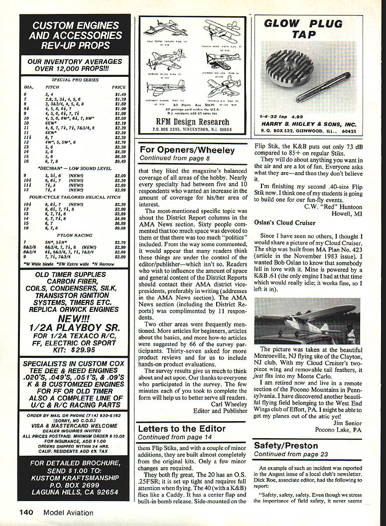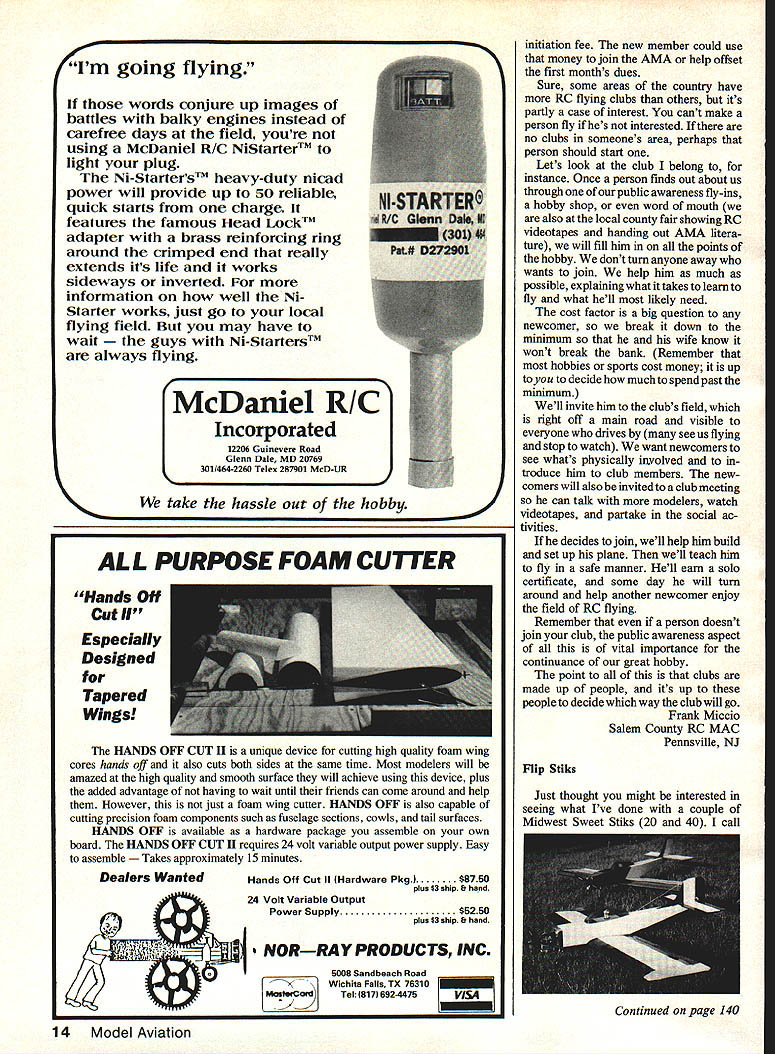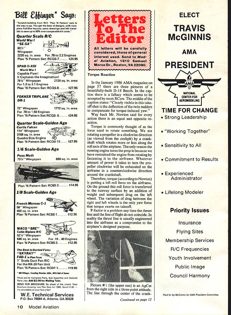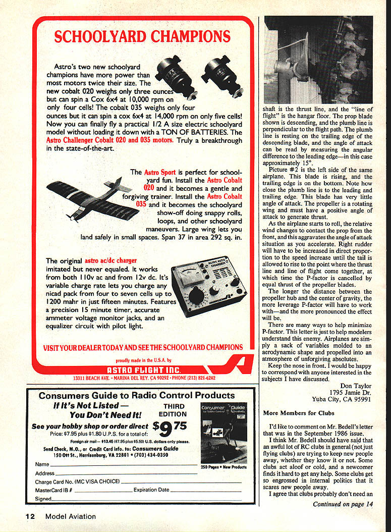 Bi1I Cisg& Sa4p Scratch-building WE Plan N Pattern sets way go get best designs com plete Full-Size layouts parts drawings bill mater ials save up 50% over comparable kit costs Quarter Scale R/C World Wan SE-SA 80 Wingspan 0 2220 sq area 78 22 Engines Plan N Pattern Set RCQS-7.. $2495 SPAD C-XIII- World Wan Capable Flyer Captures Imagination 79/ Wingspan2120 sq area 13 31 Engines Plan N Pattern Set RCQS-8.. $2795 FOKKER TRIPLANE DR-I 72 Wingspan1772 sq area 78 150 Engines Plan N Pattern Set RCQS- 6.. $2495 Quarter Scale-Golden Age Curtis Falcon 114 Wingspan Quadra Size Engine 3168 sq area Plan N Pattern Set RCQS-13 . $2795 1/6 Scale-Golden Age French Mureau C-I56 Wingspan 450 sq area Plan N Pattern Set RC8S1$1295 WACO SRE Cabin Biplane R/C 52% Wingspan 640 sq areaFor 19 40 Engines Plan N Pattern Set RC8S-3$1295 Best Ducted Fans SKYRAY F4D-1 Plan Form - 1 Scale Duct Fan RIC RK-20 Fan Unit Plan N Pattern Set RCDF-1 1995 Sill Effinger Feundlag Member AMA PIFFS Hell lamer Prices Complete Plans Sub Assembly Detailed Parts Lists Add $200 Mailing Tube SEND FOR BROcHURE ahead crowd New Brochure showing new Plan Sets 1986 Send $100 its refundable first order WE Technical Services PO Box 76884-A Atlanta GA 30328 Torque Reaction January 1986 AMA magazine page 57 three pictures beautifully-built D- 18 Beech cap tion fallacy seems accepted RCers middle caption states Clearly visible take off shot deflection twin rudders compensate torque-induced yaw Way back Mr Newton said action equal opposite re action Torque commonly thought force used rotate something rotating propeller clockwise direction viewed cockpit crank shaft rotates less along roll axis airplane reason running engine turns prop because have restrained engine rotating fastening airframe Whatever amount power takes turn pro peller clockwise will exhausted airframe counterclockwise direction around crankshaft Therefore torque according Newton putting left roll force airframe ground roll force transferred runway surface addition weight subsequent drag left wheel variation drag between right left wheels yaw force torque exerts takeoff P-factor problem time thrust line line flight coincide reality thrust line usually engineered airframe compromise airplanes designed purpose ELECT TRAVIS McGINNIS AMA PRESIDENT AMA NATiONAL CENTER FOR AEROMODEUNG TIME FOR CHANGE Strong Leadership Working Together Sensitivity Commitment Results Experienced Administrator Lifelong Modeler Priority Issues Insurance Flying Sites Membership Services RIG Frequencies Youth Involvement Public Image Council Harmony Pard McGinnis AMA President Commtffee 10 Model Aviation Letters Editor letters will carefully considered general interest used Send Mod 1 Aviation 1810 Samuel Morse Dr Reston VA 22090 Puss Moth 73% Winosoan880 sq area Plan N vauern Set RC6S-3 95 1/8 Scale-Golden Age kocture upper AgCat right side three-point attitude line through center crankContinued page 12 SCHOOLYARD CHAMPIONS Astros two new schoolyard champions have power motors twice size new cobalt 020 weighs three ounce can spin Cox 6x4 10000 rpm four cells cobalt 035 weighs four ounces can spin cox 6x4 14000 rpm five cells Now can finally fly practical 1/2 size electric schoolyard model loading down TON OF BATTERIES Astro Challenger Cobalt 020 035 motors Truly breakthrough state-of-the-art The Astro Sport perfect school yard fun Install Astro Cobalt 020 becomes gentle Torgiving trainer Install Astro Cobalt 035 becomes schoolyard - show-off doing snappy rolls loops other schoolyard maneuvers Large wing lets land safely small spaces Span 37 area 292 sq original astro ac/dc charger imitated never equaled works both I Ov ac 2v dc Its variable charge rate lets charge nicad pack four seven cells up 1200 mahr just fifteen minutes precision 15 minute timer accurate ammeter voltage monitor jacks equalizer circuit pilot light VISIT YOUR DEALER TODAY AND SEE THE SCHOOLYARD CHAMPIONS proudly made USA Consumers Guide Radio Control Its ListedTHIRD Dont Need ItEDITION See hobby shop order direct $075 Price $795 plus $180 UPS total Foreign air mail $1348 $795 plus $5 50 U S dollars please Send Check MO Credit Curd Info Consumers Guide 150 Ott St Hurnsonhurg VA 22601 703 4340350 Nlcamc Address Charge Card No MC VISA CHOICE MasterCard lB # _____________________ Products Expiration flta Sianed shaft thrust line line fligjn hangar floor prop blade shown descending plumb line perpendicular flight path plumb line resting trailing edge descending blade angle attack can read measuring angular difference leading edgein case approximately 1 5O Picture #2 left side same airplane blade rising trailing edge bottom Note close plumb line leading trailing edge blade has very little angle attack propeller rotating wing must have positive angle attack generate thrust As airplane starts roll relative wind changes contact prop front aggravates angle attack situation accelerate Right rudder will have increased direct propor tion speed increase until tail allowed rise point thrust line line flight come together time P-factor cancelled equal thrust propeller blades longer distance between propeller hub center gravity leverage P-factor will have work withand pronounced effect will ways help minimize P-factor letter just help modelers understand enemy Airplanes sim ply sack variables molded aerodynamic shape propelled atmosphere unforgiving absolutes Keep nose front would happy correspond anyone interested subjects have discussed Don Taylor 1795 Jamie Dr Yuba City CA 95991 Members Clubs Id like comment Mr Bedells letter September 1986 issue think Mr Bedell should have said awful lot RC clubs general just flying clubs trying keep new people away whether know Some clubs act aloof cold newcomer finds hard get help Some clubs get engrossed internal politics scares new people away agree clubs probably dont need Continued page 14 12 Model Aviation r 13311 BEACH AVE NA DEL REY CA 90292 PHONE 213 8216242 Im going flying words conjure up images battles 