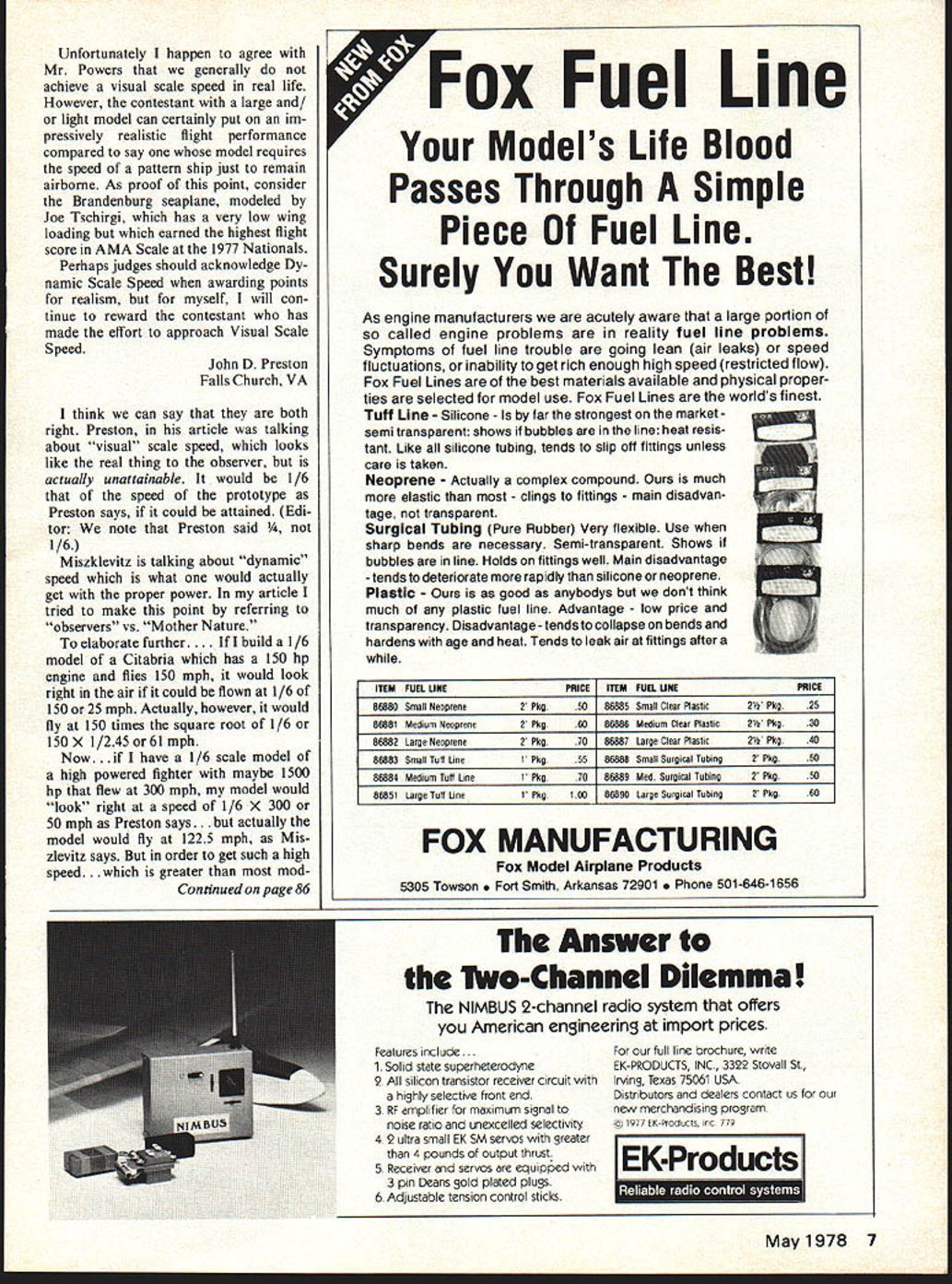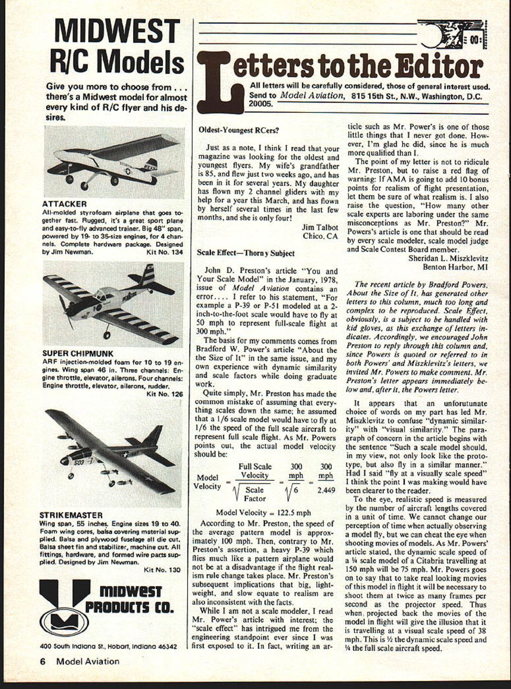 MIDWEST RIC Models Give choose . thems Midwest model almost kind R/C flyer de sires P minweu PRODUCTS CD hi 400 South Indiana St Hobart IndIana 46342 Uil Letters Editor letters will carefully considered general interest used Send Model Aviation 815 15th St NW Washington DC 20005 Oldest-Youngest RCers Just note think read magazine looking oldest youngest flyers wifes grandfather 85 flew just two weeks ago has several years daughter has flown 2 channel gliders help year March has flown herself several times last few months four Scale EffectThorny Subject John D Prestons article Scale Model January 1978 issue Model Aviation contains error fer statement example P-39 P-s 1 modeled 2inch-to-the-foot scale would have fly 50 mph represent full-scale flight 300mph basis comments comes Bradford W Powers article About the Size same issue own experience dynamic similarity scale factors doing graduate work Quite simply Mr Preston has made common mistake assuming thing scales down same assumed 1/6 scale model would have fly 1/6 speed full scale aircraft represent full scale flight As Mr Powers points out actual model velocity should Full Scale Model _Velocity Velocity Scale Factor 300 mph 6 300 mph 2449 Model Velocity mph According Mr Preston speed average pattern model approx imately 100 mph contrary Mr Prestons assertion heavy P-39 flies much like pattern airplane would disadvantage flight real ism rule change takes place Mr Prestons subsequent implications big light weight slow equate realism also inconsistent facts am scale modeler read Mr Powers article interest scale effect has intrigued engineering standpoint ever since first exposed fact writing ar tide such Mr Powers little things never got done ever Im glad did since much qualified point letter ridicule Mr Preston raise red flag warning AMA going add 10 bonus points realism flight presentation let sure what realism also raise question other scale experts laboring under same misconceptions Mr Preston Mr Jim Talbot Powerss article should read Chico CA scale modeler scale model judge Scale Contest Board member Sheridan L Miszklevitz Benton Harbor MI recent article Bradford Powers About Size has generated other letters column much too long complex reproduced Scale Effect obviously subject handled kid gloves exchange letters dicates Accordingly encouraged John Preston reply through column since Powers quoted referred both Powers Miszklevitzs letters invited Mr Powers make comment Mr Prestons letter appears immediately low after Powers letter appears unforutunate choice words part has led Mr Miszklevitz confuse dynamic similar ity visual similarity para graph concern article begins sentence Such scale model should view look like proto type also fly similar manner said fly visually scale speed think point making would have clearer reader eye realistic speed measured number aircraft lengths covered unit time cannot change perception time actually observing model fly can cheat eye shooting movies models As Mr Powers article stated dynamic scale speed e model Citabria travelling 150 mph will 75 mph Mr Powers goes say take real looking movies model flight will necessary shoot twice frames per second projector speed Thus projected back movies model flight will give illusion travelling visual scale speed 38 mph /2 dynamic scale speed Y4 full scale aircraft speed 6 Model Aviation ATTACKER All-molded styrofoam airplane goes gether fast Rugged its great sport plane easy-to-fly advanced trainer Big 48 span powered 19- 36-size engines 4 chan nels Complete hardware package Designed Jim NewmanKit No 134 SUPER CHIPMUNK ARF injection-molded foam 10 19 en gines Wing span 46 Three channels En gine throttle elevator ailerons Four channels Engine throttle elevator ailerons rudder Kit No 126 STRIKEMASTER Wing span 55 inches Engine sizes 19 40 Foam wing cores balsa coveriiig material sup plied Balsa plywood fuselage die cut Balsa sheet fin stabilizer machine cut fittings hardware formed wire paris sup plied Designed Jim Newman Kit No 130 Unfortunately happen agree Mr Powers generally achieve visual scale speed real life However contestant large and/ light model can certainly put im pressively realistic flight performance compared say model requires speed pattern ship just remain airborne As proof point consider Brandenburg seaplane modeled Joe Tschirgi has very low wing loading earned highest flight score AMA Scale 1977 Nationals Perhaps judges should acknowledge Dy namic Scale Speed awarding points realism myself will con tinue reward contestant has made effort approach Visual Scale Speed John D Preston Falls Church VA think can say both right Preston article talking about visual scale speed looks like real thing observer actually unattainable would 1/6 speed prototype Preston says could attained Edi tor note Preston said Miszklevitz talking about dynamic speed what would actually get proper power article tried make point referring observers vs Mother Nature elaborate further.. build 1/6 model Citabria has 150 hp engine flies 150 mph would look right air could flown 1/6 150 25 mph Actually however would fly 150 times square root 1/6 iSOX 1/245 or6l mph Now. have 1/6 scale model high powered fighter maybe 1500 hp flew 300 mph model would look right speed 1/6 X 300 50 mph Preston says. ally model would fly 1225 mph Mis zlevitz says order get such high speed. ter modContinued page 86 Fuel Line Models Life Blood Passes Through Simple Piece Fuel Line Surely Want Best As engine manufacturers acutely aware large portion called engine problems reality fuel line problems Symptoms fuel line trouble going lean air leaks speed fluctuations inability get rich enough high speed restricted flow Fox Fuel Lines best materials available physical proper ties selected model use Fox Fuel Lines worlds finest Tuft Line Silicone far strongest market semitransparent shows bubbles line heat resis tant Like silicone tubing tends slip off fittings unless care taken Neoprene Actually complex comp