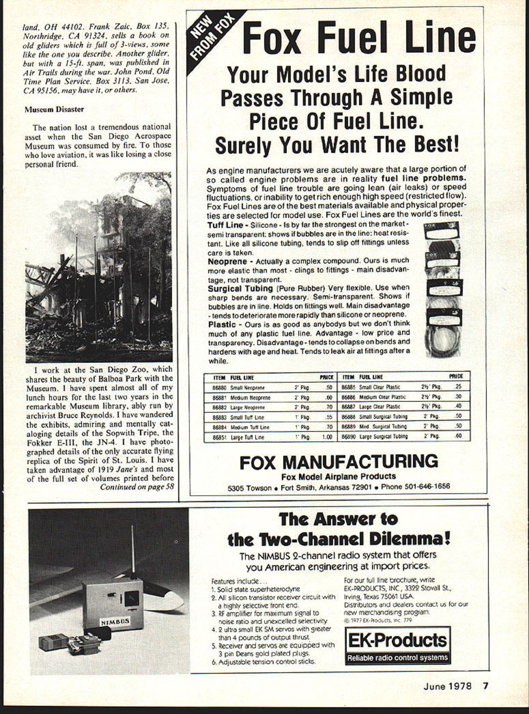 MIDWEST CL Models Great beginning controlline flier fun sport new series Goodyear Rac ers styled after full-size Formula aircraft also eligible AMA Scale Racer Class competi tion Kits complete including decals supply en gine paint minwn PRODUCTS CO hi 400 South Indiana St Hobart IndIana 46342 Letters Editor letters will carefully considered general interest used Send ModelAviation 815 15th St NW Washington DC 20005 Mrs Watson Tower Having wife avid modeler 35 years am naturally utterly unin terested anything airplanes larger ones Strangely though other day picked up latest issue Model viation found article really interested Ron Van Puttes article aerodynamics answered letter reader reversed himself previous article attempted make something simple out something very complicated Mr Van Puttes arguments ex planations very scholarly quite convincing uninitiated would ven ture say average lay person never knew much yaw world must point out Mr Van Putte ever failed cover fields fascinating possibilities Permit mention just few add com ments enlightening discussion Mr Van Puttes references adverse yaw moment yaw later proverse yaw omitted another very im portant factor problem inverse yaw created course glid ing motion planes undercarriage upper slipstream plane being flown inverted factors verse yaw can directly related speed engine wind knots aloft number coats dope other covering fuselage other el ments minor nature Conversely sequentially cannot create inverse yaw producing its counterpart outverse yaw doesnt take imagination figure interesting effect natural result outside outbound loops flown part sophisticated pattern flying careful calculation should made pilot considers span circle distance nearest ground zero likelihood severe vertigo tracks plane appropriate neck motions number loops plans attempt Stated algebraically equation would something like OY D L 2 loops attempted course greater outverse yaw course proper number should serted parenthesis equation Spins Immelmans stall turns top hats like require own factoring both inverse outverse yaw conditions would impose upon editors good nature longer although would like address remark what might might have typo graphical error Mr Van Putte mentioned pint reminded old folk song about drunken sailor lines goes like Hey-Ho Up Rises dear friends know about aerodynamics Mrs Frank E Watson Albany GA Tower Mrs Watson Never thought yaw could interesting subject due respect having read VanPuttes column diligently cant help wondering about whatever held spellbound letter led quickly polishing off pint found fine type course did write letter impress editor aerodynamic eruditionwhich say least im pressive So propose use missive Letters Editor already puzzled readers may glimpse light end tunnel Mrs Watson Tower Occasionally something world modeling hits worthy astute comments Such VanPuttes column Yaw can can other things given right treatment amazingly interesting am happy want use expositional material Letters Editor Model Aviation next hits stands very pints may consumed good fun course Wants Old Glider Plans About middle 40s plans gull wing glider never built would like know plans something old still available believe about 100-in wingnice lines Can help John Heere Redwood City CA model describe might have old Cleveland Models kit called Condor think might have gull wing Try Cleveland Model & Supply Co 103 7AA Detroit Cleve 6 Model Aviation Plumb CrazyKit No 254 Miss San BernardinoKit No 255 Lii QuickieKit No 257 land OH 44102 Frank Zaic Box 135 Northridge CA 91324 sells book old gliders full 3-views some like describe Another glider 15-ft span published Air Trails during war John Pond Old Time Plan Service Box 3113 San Jose CA 95156 may have others Museum Disaster nation lost tremendous national asset San Diego Aerospace Museum consumed fire love aviation like losing close personal friend work San Diego Zoo shares beauty Balboa Park Museum have spent almost lunch hours last two years remarkable Museum library ably run archivist Bruce Reynolds have wandered exhibits admiring mentally cat aloging details Sopwith Tripe Fokker E-III JN-4 have photo graphed details accurate flying replica Spirit St Louis have taken advantage 1919 Janes full set volumes printed before Continued page 58 Fox Fuel Line Models Life Blood Passes Through Simple Piece Fuel Line Surely Want Best As engine manufacturers acutely aware large portion called engine problems reality fuel line problems Symptoms fuel line trouble going lean air leaks speed fluctuations inability get rich enough high speed restricted flow Fox Fuel Lines best materials available physical proper ties selected model use Fox Fuel Lines worlds finest Tuff Line Silicone far strongest market semitransparent shows bubbles line heat resis tant Like silicone tubing tends slip off fittings unless care taken Neoprene Actually complex compound much elastic clings fittings main disadvan tage transparent Surgical Tubing Pure Rubber Very flexible Use sharp bends necessary Semi-transparent Shows bubbles line Holds fittings well Main disadvantage tends deteriorate rapidly silicone neoprene Plastic good anybodys dont think much plastic fuel line Advantage low price transparency Disadvantage tends collapse bends hardens age heat Tends leak air fittings after ITEM FUEL LINEPRICEITEM FUEL LINEPRICE 86880 Small Neoprene2 Pkg 5086885 Small Clear Plastic2 P11g 25 86881Medium Neoprene2Pkg6086886Medium Clear Plastic21/2P11g30 86882 Large Neoprene2 Pkg7086887 Large Clear Plastic2 P11g.40 86883 Small Taft Line1 Pkg. 5586888 Small Surgical Tubing2 P11g.50 86884 Medium Taft Line1 Pkg 7086889 Med Surgical Tubing2 P11g.50 86851 Large Taft Line1 Pkg10086890 Large Surgical Tubing2 Pkg.60 FOX MANUFACTURING Fox Model Airplane Products 5305 Towson SmIti Arkansas 72901 e 501-646-1656 Answer iWo-Channel Dilemma NIMBUS 2-channel radio system offers American engineering import prices Features include. 1 Solid state superheterodyne 2 All sil
