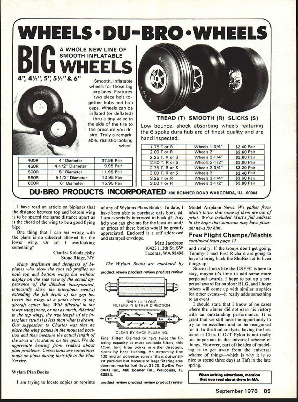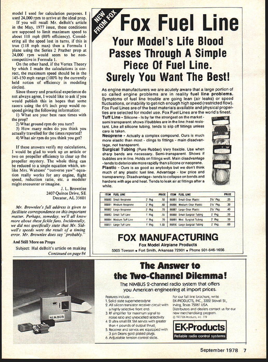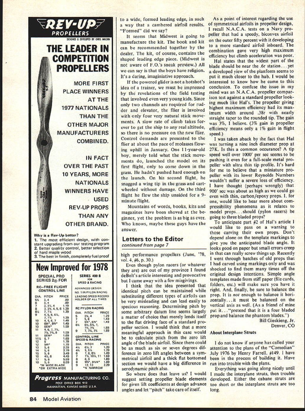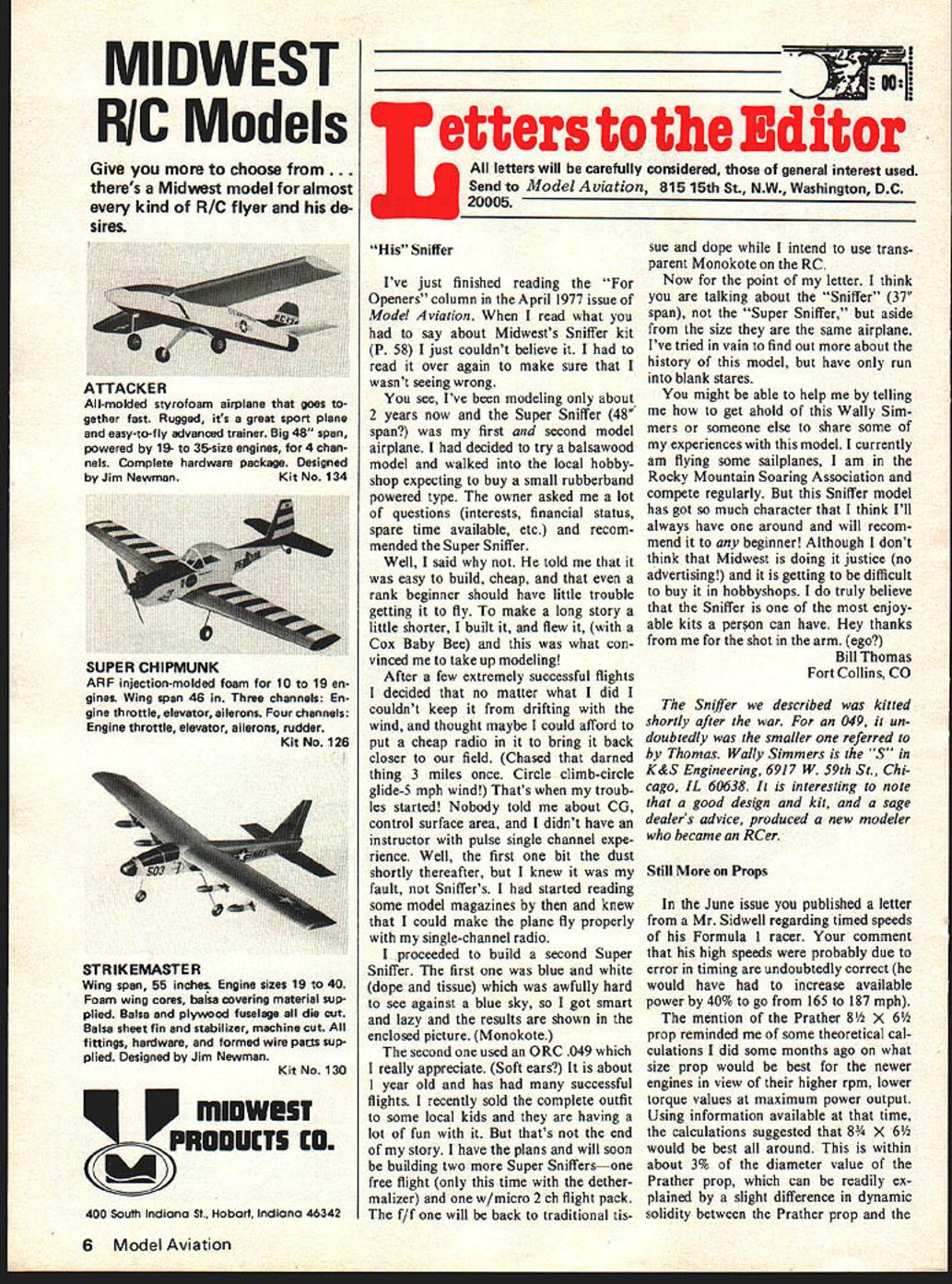MIDWEST RIC Models Give choose . theres Midwest model almost kind R/C flyer de sires q5 400 South Indiana St Hobart IndIana 46342 Letters Editor letters will carefully considered general interest used Send Model Aviation 815 15th St NW Washington DC 20005 Sniffer Ive just finished reading Openers column April 1977 issue Mode Aviation read what say about Midwests Sniffer kit P 58 just couldnt believe read over again make sure wasnt seeing wrong see Ive modeling about 2 years now Super Sniffer 48 span first second model airplane decided try balsawood model walked local hobbyshop expecting buy small rubberband powered type owner asked lot questions interests financial status spare time available etc recom mended Super Sniffer Well said told easy build cheap rank beginner should have little trouble getting fly make long story little shorter built flew Cox Baby Bee what con vinced take up modeling After few extremely successful flights decided no matter what did couldnt keep drifting wind thought maybe could afford put cheap radio bring back closer field Chased darned thing 3 miles once Circle climb-circle glide-S mph wind Thats troub les started Nobody told about CG control surface area didnt have instructor pulse single channel expe rience Well first bit dust shortly thereafter knew fault Sniffers started reading some model magazines knew could make plane fly properly single-channel radio proceeded build second Super Sniffer first blue white dope tissue awfully hard see against blue sky got smart lazy results shown enclosed picture Monokote second used ORC 049 really appreciate Soft ears about 1 year old has successful flights recently sold complete outfit some local kids having lot fun thats end story have plans will soon building two Super Sniffersone free flight time dether malizer w/micro 2 ch flight pack f/f will back traditional tis sue dope intend use trans parent Monokote RC Now point letter think talking about Sniffer 37 span Super Sniffer aside size same airplane Ive tried vain find out about history model have run blank stares might able help telling get ahold Wally Sim mers someone else share some experiences model currently am flying some sailplanes am Rocky Mountain Soaring Association compete regularly Sniffer model has got much character think Ill always have around will recom mend beginner Although dont think Midwest doing justice no advertising getting difficult buy hobbyshops truly believe Sniffer enjoy able kits person can have Hey thanks shot arm ego Bill Thomas Fort Collins CO Sniffer described kitted shortly after war 049 un doubtedly smaller referred Thomas Wally Simmers S K&S Engineering 6917 W S9th St Chi cago IL 60638 interesting note good design kit sage dealers advice produced new modeler became RCer Still Props June issue published letter Mr Sidwell regarding timed speeds Formula 1 racer comment high speeds probably due error timing undoubtedly correct would have increase available power 40% go 165 187 mph mention Prather 8 X 6 prop reminded some theoretical cal culations did some months ago what size prop would best newer engines view higher rpm lower torque values maximum power output Using information available time calculations suggested 8 X 6 would best around within about 3% diameter value Prather prop can readily ex plained slight difference dynamic solidity between Prather prop 6 Model Aviation ATTACKER All-molded styrofoam airplane goes gether fast Rugged its great sport plane easy-to-fly advanced trainer Big 48 span powered 19- 35-size engines 4 chan nels Complete hardware package Designed Jim NewmanKit No 134 SUPER CHIPMUNK ARF injection-molded foam 10 19 en gines Wing span 46 Three channels En gine throttle elevator ailerons Four channels Engine throttle elevator ailerons rudder Kit No 126 STR 1K EMASTE R Wing span 55 inches Engine sizes 19 40 Foam wing cores balsa oevering material sup plied Balsa plywood fuselage die cut Balsa sheet fin stabilizer machine cut fittings hardware formed wire parts sup plied Designed Jim Newman Kit No 130 model used calculation purposes used 24000 rpm arrive ideal prop will recall Mr deBolts article May 1977 issue conditions supposed limit maximum speed about 118 mph 80% efficiency Consid ering speed lost turns true 118 mph max Formula 1 plane using Series 2 Prather prop 24000 rpm would seem noncompetitive Formula 1 other hand Vortex Theory made calculations cor rect maximum speed should 145-150 mph range 100% currently held notion efficiency modeling circles Since theory practical experience always agree would like ask would publish hopes some racers using 6 inch prop would re spond giving following information I What best race times prop 2 What ground rpm turn 3 How miles think actually travelled times reported 4 What air rpm think get answers verify calculations would glad work up article two propeller efficiency clear up propeller mystery whole thing can reduced single equation un like Mrs Watsons outverse yaw- equa tion really works engine flight speed reduction ratio etc modeler might encounter imagine J L Brownlec 2407 Quince Drive SE Decatur AL 35601 Mr Brownlees full address given facilitate correspondence important matter Perhaps someday well know about fickle fans Incidentally did spec fically state Mr Sid wells speeds result timing error Mr Brownlee does say probably Still Props Subject Hal deBolts article making Continued page 84 Fox Fuel Line Models Life Blood Passes Through Simple Piece Fuel Line Surely Want Best As engine manufacturers acutely aware large portion called engine problems reality fuel line problems Symptoms fuel line trouble going lean air leaks speed fluctuations inability get rich enough high speed restricted flow Fox Fuel Lines best materials available physical proper ties selected model use Fox Fuel Lines worlds finest Tuff Line Silicone far strongest market semi transparent shows bubbles line heat resis tant Like silicone tubing tends slip off fittings unless care taken Neoprene Actu