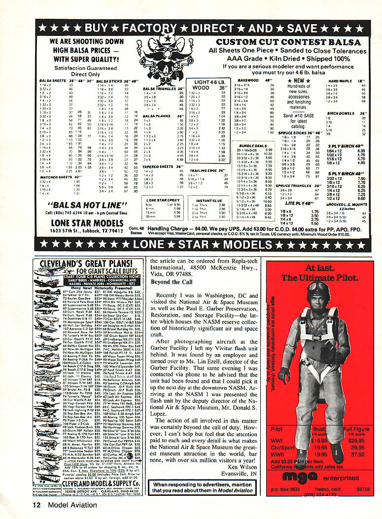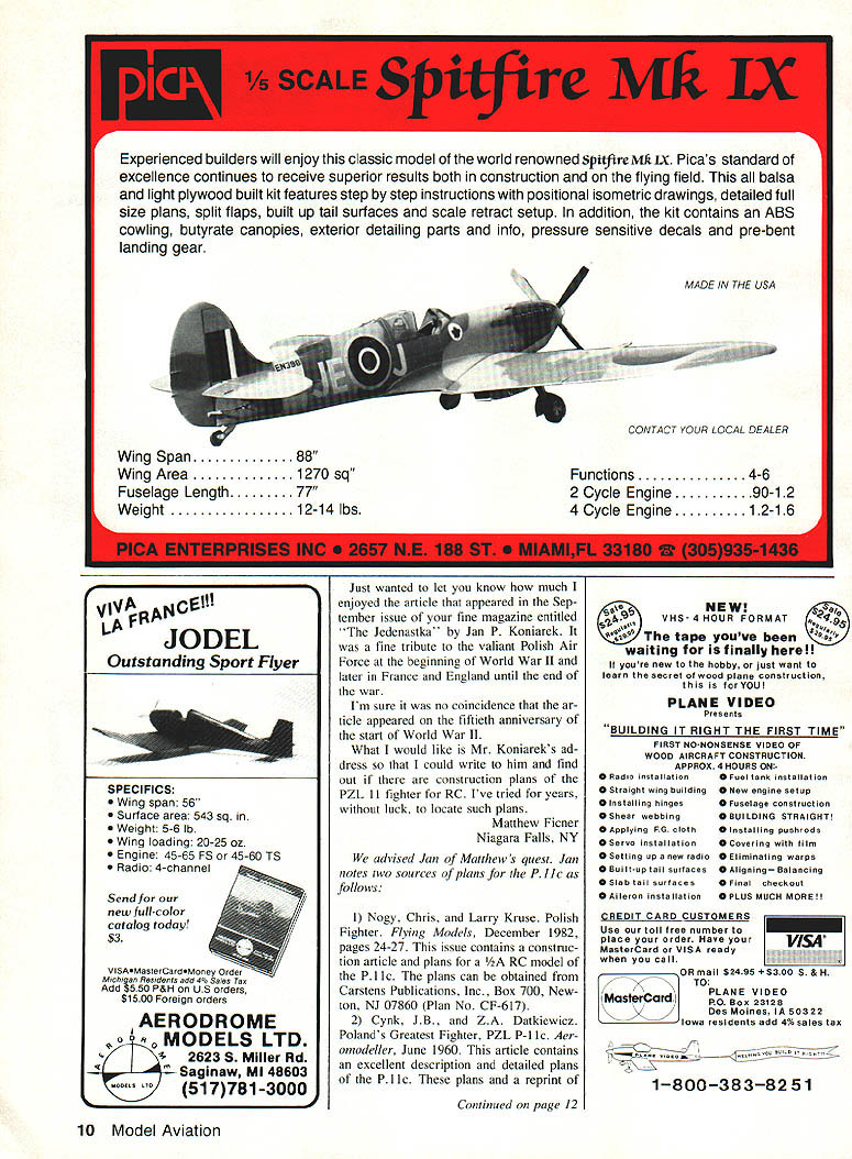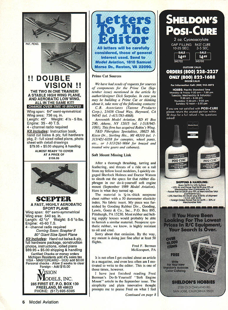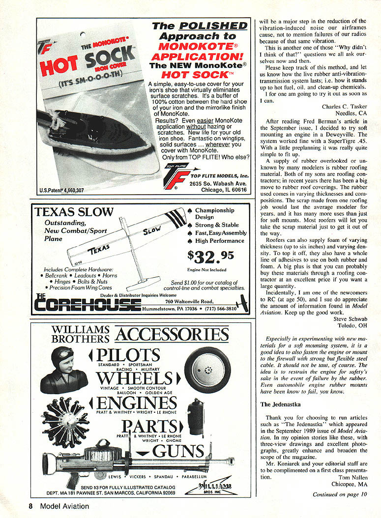 Wing span 64 semi-symmetrical Wing area 736 sq Length 45 Weight 41/2 5 lbs Engine 35 40 TS 4 channel radio required Kit includes Instruction book hand cut balsa & ply full hardware pkg 2 full sized rolled plans photo sheet detail drawings $7995 shipping & handling ALMOST READY TO COVER AT PRICE OF $15995 SCEPTER FAST HIGHLY AEROBATIC SPORT PLANE Wing span 60 semi-symmetrical Wing area 540 sq Length 42 /2 Weight 5-5 /2 lbs Engine 45-60 TS 4 channel radio required Coming Soon Scepter II 80 Giant Size Sport Plane Kit Includes Hand cut balsa & ply full hardware package construction photos instructions rolled plans $8995 shipping & handling Certified Checks money orders Michigan Residents add 4% sales tax VISA MASTERCARD COD add $300 Personal checks Allow 2 weeks clear Foreign Add $1500 MODELS INC 285 FIRST ST PO BOX 130 FREELAND MI 48623 PHONE 517 695-5385 Prime Cut Sources have scads requests sources components Prime Cut Sep tember issue mentioned article author/designer Dick Sarpolus case may building Prime Cut thinking about take note following contacts C B Associates Tatone Products Corp 21658 Cloud Way Hayward CA 94545 tel 1-415/783-4868 Aerosmith Model Aviation RD #1 Box 290 Athens NY 12015 tel 1-518/9451091 firm has acquired Robin s Wing T&D Fiberglass Specialties 38625 Mt Kisco Dr Sterling Hts MI 48310 tel 1313/421-6358 canopies wheel pants etc 1-313/261-9064 brazed treated wire gears cabanes Soft Mount Missing Link After thorough thrashing tarring feathering threats ride rail fellow local modelers quickly en gaged Sherlock Holmes Doctor Watson sleuth out specs rubber dia phragm do-it-yourself soft engine mount September 1989 Model Aviation what turned up material /-in-thick neoprene sheet rubber 50 durometer elasticity index No fabric insert piece fur nished Gooding Rubber Div Gooding Lewis Goetz & Co Inc PO Box 895 Pittsburgh PA 15230 Most rubber belt ing supply houses would probably able furnish similar material Neoprene syn thetic rubber know highly resistant oil crud Sorry about omission way mount doing just fine after least 50 flights Fred F Berman McKeesport PA often get excited about article magazine less often am mo tivated write editor times however have just finished reading Fred Bermans Do-It-Yourself Soft Engine Mount article September issue simplicity plain innovative thought prompts praise Fred what feel 6 Model Aviation DOUBLE VISION! THE TWO IN ONE TRAINER STABLE HIGH WING PLANE AND AEROBATIC LOW WING ALL IN THE SAME KIT e e ditor letters will carefully considered general Interest used Send Model Aviation 1810 Samuel Morse Dr Reston VA 22090 Continued page 8 New Combat/Sport Outstanding Plane Includes Complete Hard ware Bellcrank outs s Hinges s & Nuts Precision Foam Wing Cores POLISHED Approach MONOKO TE APPLICA TION NEW MonoKote HOT SOCKTM simple easy use cover irons shoe virtually eliminates surface scratches Its buffer 100% cotton between hard shoe iron mirrorlike finish MonoKote Results air MonoKote application hazing scratches New life old iron shoe Fantastic wingtips solid surfaces . wherever cover Monokote Only TOP ELITE else r TOP FLITE MODELS Inc f2635 So Wabash Ave Chicago IL 60616 Championship Design Strong & Stable Fast Easy Assembly High Performance Engine Included Send $100 catalog control-line combat specialties Dealer & Distributor Inquiries Welcome- LEE 760 Waltonville Road OE3EiiiEUbIIEIIPiiiIEi Hummelatown PA 17036 566-3810 WILHAMS ACCESSORIES will major step reduction vibration-induced noise airframes cause mention failures radios because same vibration another didnt think questions ask selves now Please keep track method let us know live rubber anti-vibrationtransmission system lasts ie stands up hot fuel oil clean-up chemicals am going try out soon can Charles C Tasker Needles CA After reading Fred Bermans article September issue decided try soft mounting engine Deweyville system worked fine SuperTigre 45 little preplanning really quite simple fit up supply rubber overlooked un known modelers rubber roofing material Both sons roofing con tractors recent years has big move rubber roof coverings rubber used comes varying thicknesses com positions scrap made roofing job would last average modeler years has uses just soft mounts Most roofers will let take scrap material just get out way Roofers can also supply foam varying thickness up six inches varying den sity top off also have whole line adhesives use both rubber foam big plus can probably buy materials through roofing con tractor excellent price want large quantity Incidentally am newcomers RC age 50 sue appreciate amount information found Model Aviation Keep up good work Steve Schwab Toledo OH Especially experimenting new ma terials soft mounting system good idea also fasten engine mount firewall strong flexible steel cable should taut course idea restrain engine safety s sake event failure rubber automobile engine rubber mounts have know fail know Jedenastka Thank choosing run articles such Jedenastka appeared September 1989 issue Model via tion opinion stories like three-view drawings excellent photo graphs greatly enhance broaden scope magazine Mr Koniarek editorial staff complimented first class presenta tionTom Nallen Chicopee MA Continued page 10 8 Model Aviation TEXAS SLOW 4 PILOTS STANDARD TSMAN RACING TARY 0 WHEELS AGE TH CONTOUR BALLOON E 4 ENGINES PRATT & WHITNEY HT HONE SEND $3 FOR FULLY ILLUSTRATED CATALOG PAWNEE ST SAN MARCOS CALIFORNIA 92069 LEWISVICKERS OAU BELLUM ALUL Just wanted let know much enjoyed article appeared Sep tember issue fine magazine entitled Jedenastka Jan P Koniarek fine tribute valiant Polish Air Force beginning World War II later France England until end war Im sure no coincidence ar ticle appeared fiftieth anniversary start World War II What would like Mr Koniareks ad dress could write him find out construction plans PZL 11 fighter RC Ive tried years luck locate such plans Matthew Ficner Niagara Falls NY advised Jan Matthew s quest Jan notes two sources pl