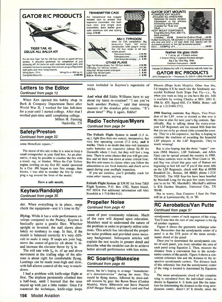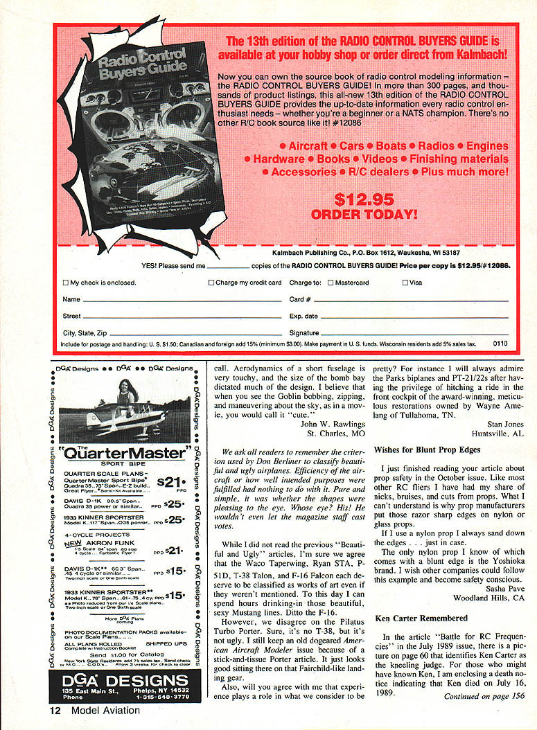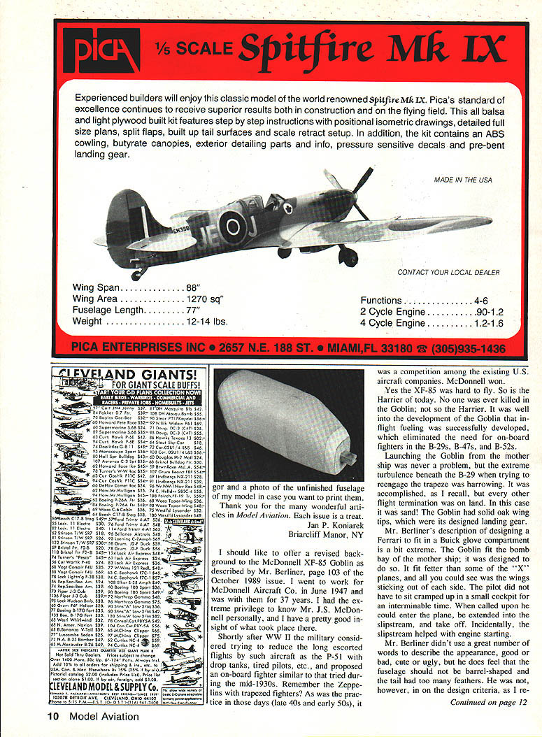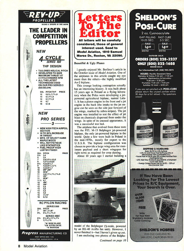 4 CYCLE SERIES 100 THP DESIGN TAILORED HELICAL PITCH DEVELOPED TO GIVE MAXIMUM THRUST AT 4 CYCLE ENGINE RPM ALLTHE LATEST TECHNIQUES USED ON OUR PRO SERIES 3 SEE BELOW DIA PITCH THP PRICE 1266778 136778 148778 1567 16678 NEW PRO SERIES 3 NEW HIGH TECH AIRFOIL SECTION 10T020%INCREASE IN THRUST MFG OF SELECT HARD MAPLE WOOD WILL NOT FATIGUE LIKE SYNTHETICS FUEL PROOF HIGH LUSTER FINISH DIAPITCH PRICE 534 634 72633456 6334568 84566/z7 945B6A/277 1045B6A7 106W8W 106EW 114677778 11SW II6EW 1167 124W 125W 1256 1356 1456 1556 164/2N 16678 RC PYLON RACING SERIES 500 DIA PITCHPRICE 7 5N 5N 8I 6778 SERIES 400C 866777 9777 W WIDE BLADE EW EXTRA WIDE N NARROW e rs tPne 0 ditor Beautiful & Ugly Planes greatly enjoyed Mr Berliners article October issue Model Aviation airplanes article caught eye othersthe highly modified An-2 biplane strange looking contraption actually has interesting history built about 15 years ago Poland flying labora tory Poles developing jetpowered agricultural biplane named Lala 1 has piston engine front jet engine back intake jet en gine can seen side just forward wings marked zebra stripes jet engine installed test effect jet blast chemicals dispersed under wings spite its unusual appearance successful test bed airplane evolved tests PZL M- 15 Belphegor jet-powered biplane jet-powered biplane world Quite few built Poland mid-1970s mostly export USSR The biplane configuration chosen provide large wing area max imum payload short wingspan tight turns required crop dusting About 10 years ago started building model Belphegor A-scale powered RK-40 Axiflo fan unit However never finished itbut havent given up yet am enclosing two photos Belphe 8 Model Aviation THE LEADER IN COM PETITION PROPELLERS tl NEW letters will carefully considered general Interest used Send Model Aviation 1810 Samuel Morse Dr Reston VA 22090 J ntinued page 10 17 Cc, iN4 Jeeny $37 $lON Mocqcio $6 $42 FeIcke 07 FIc $39- 10$ OH MocqeBeneb $55 70 $eyIe Gee-Bee $32 90 Oceec POl7Keydel $566$ Heoed Pele Bee $32- 99 NBIk Widoen P61 $69 60 Sepe~eeiee 56$ $24 71 Occo 00-3 047 $35 $9 Sepe necine S6B $35 95 Qeeg 003 047 $55 63CcHeek P-HE $42 $6 Keceke Teecee 13 $22 96Cc Heenk P60 054 64 Sled Sky-Ce01$ -74 Doolielee GB 11 $4$ 72 Cer02U 14 LOS$46 95 Menecoepe Spe, $26 10$ Ce 02014 LOS 056 *-0$ Hell Sp BcIldeg $42 60 Docqlec 14-2 Veil $24 107 Aeonee C-S SpI $25- 6$ Bkel Oclidog Fl $30 62 PIeeee4 Reec Ike $45 59 BeeeRoee MeLA $54 700ceee W-W Rec $35 107 Gece BeeccI FOP $047 E 63Cc Goehk 9110 $42 69 Liedherge NO211 $2$ 1 H4Cc Ceehk P110 $54-91 Lirdkeqe NO211 $39 46 DeHee Ceee Bee $24 96 WNWINee Bee 04$ Mclliqer $35 740 HelIde 50204 $55 Mclliqer $45 10$ PeiehPT19 17 $59. P-26A 9$ $26 60 Wece Tepee-Wine $36 P36A Fl $40- 90 Wece Tepe-Wieg $40 $2 Leek11Blcelre$4016Cebin$2675Wee6dLysondee$32 $30$49 4-AT $36 62 Sliecee 71W $B7 $1 B96 Bellenee Aiecie$40 1 S6,en 71W 5B7 02693 Leenieg C-2Aeph$69.i. 122 Sliecee 9/W 007 $3$5$ Gce J2-P Deek$39 59 Brielel Fl P2-B $207$ Gce J2-P Ocek$56 11$ $reeI Fl P2B $45 134 Leek Al Pepecee$40- 740eees Peee $451 63 leek Al Eepeeee 56 Ce Wehk P40 $24$3 Leek Ale Leprees$36 60 Veg Ce,eir P40 $3577 WWeee 121 BeAk54$ OOVegCeeejP4U $60630 Seelee EP7C1$45 7$ Leek LjghMg P-3$ 03$940 Seekeeek P70 1$57 56 BepSee-Bee Ann $2410$ S S 30 Aeph$49 74 BepSee-Bee $3960 Bee eq 00 Spe$36 70 Pipe J-3 Ceb $3990 Bee eq 100 Spe$49 106 Pipe J-3 Oem $39775 Neelhep Gen,ee$409$ Leek Hcdeen Beeb 03$96 Nelhep Gennene$75 30cc, P69 Helleet $2890 SlincA Ieee 31A$$5677 Beeleg B-17G Pe $3560 SlincA Leee 3/14$42103 Bee $17G Pe$ $551200 neA Leee 314003 68 Wed WkieIeeied $3270 Ceecel Ce OBYSA$42 6$ N Aene Neelen $39104 Con Ce PBY SA$564 6$ BBenenee V-Tell $3965 M Oh Ce C epe$65 77 Lceenbe Ondee $2597140k Ce C Poe$75 72 NA B25 Beeber $4962 Cc ee NC 4059 65 MMeecde B-3d $4994 Cc ee 40 4$69 creep iei lueledees BIJOReEC CCI C ANT RANH Ne Seld Thc DeeleePiceeecb1ec eebee$e cc 400 Mece SOc Op 6134 Peec Aleceyceel Add 0% eel1 ecdee chipp no & en ete 0$A Cee & Mee Bleenchere 15% 125% lObyel Pie$eiel eeteleg $2$0 leeledee P6cc LiePcee lie ceeHee elene $100 el Becelee edd $100 - 1B3$7B BETBOIT AVE CLEVELAND OHIO 4402 ee.neeecceeelenloe heee e 515 P14BOO 100051-12161 961-3600 e.PCOOceeen gor photo unfinished fuselage model case want print Thank wonderful arti cles Model Aviation issue treat Jan P Koniarek Briarcliff Manor NY should like offer revised back ground McDonnell XF-85 Goblin described Mr Berliner page 103 October 1989 issue went work McDonnell Aircraft Co June 1947 37 years ex treme privilege know Mr JS McDon nell personally have pretty good sight what took place Shortly after WW lithe military consid ered trying reduce long escorted flights such aircraft P-51 drop tanks tired pilots etc proposed on-board fighter similar tried dur ing mid-1930s Remember Zeppe lins trapezed fighters As prac tice days late 40s early 50s competition among existing US aircraft companies McDonnell won Yes XF-85 hard fly So Harrier today No ever killed Goblin Harrier well development Goblin inflight fueling successfully developed eliminated need on-board fighters B-29s B-47s B-52s Launching Goblin mother ship never problem extreme turbulence beneath B-29 trying reengage trapeze harrowing accomplished recall other flight termination land case sand Goblin solid oak wing tips its designed landing gear Mr Berliners description designing Ferrari fit Buick glove compartment bit extreme Goblin fit bomb bay mother ship designed fit fetter some X planes could see wings sticking out side pilot did have sit cramped up small cockpit interminable time called upon could enter plane extended slipstream take off Incidentally slipstream helped engine starting Mr Berliner didnt use great number words describe appearance good bad cute ugly does feel fuselage should barrel-shaped tail too feathers however design criteria re Continued page 12 10 Model Aviation ND GIANTS FOR GIANT SCALE BUFFS D check enclosed D Charge credit card Charge II Mastercard Name DVisa Card # Street Exp date C