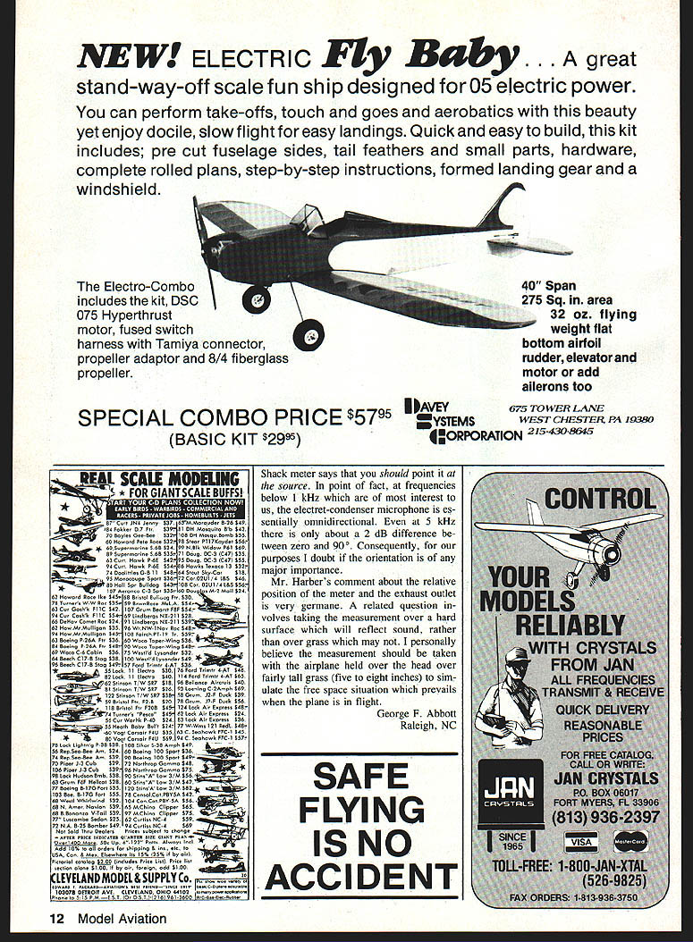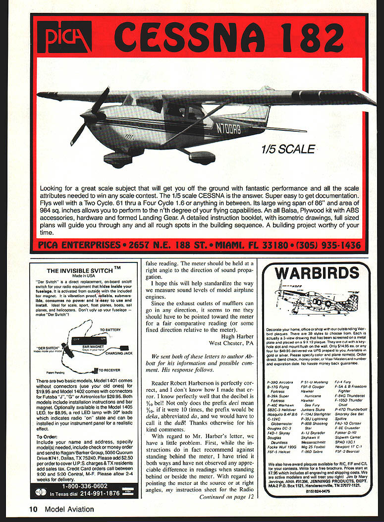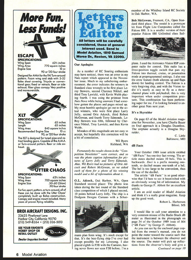 Mere Fun SPECIFICATIONS Wing Span Wing Area Engine Size 62Y2 inches 770 square inches 10cc 90 orl2O four stroke Designed AMA FAI Turn-around pattern Foam wing stab 3-32 Balsa sheet covering Tricycle conven tional gear fixed retracts Rear side exhaust fiber glass canopy Very positive maneuverable XLT SPEC IFICAl Wing Span65 inches Length65 inches Wing Area845 square inches Recommended Engine Size 10 cc 90 120 four stroke XLT designed tuned pipe re tract landing gears Capable AMA Turn-around pattern Rear side ex haust TER CHAOS SPECIFICATIONS Wing Span63Y4 inches Wing Area700 square inches Engine Size50-60 Glow 90 four stroke fun sport pattern turn-around can done Utter Chaos completely built up Balsa construction Canopy engine mount included years proven flying reliablity BRIDI AIRCRAFT DESIGNS INC 23625 Pineforest Lane Harbor City California 90710 213 549-8264 326-5013 SEE YOUR FAVORITE HOBBY SHOP OR RETAIL OUTLETW Dealer Inquries Invited Apologies As number RC Soaring enthusiasts may have noticed error Nats report appeared Novem ber issue Much unbelieving embar rassment error indicates winners Standard class wrongly first place Le roy Stowers second Clarence Nikkel third Troy Lawicki Kevin Webb plac ing fourth using printout Nats News being unaware some gotten places pages mixed up humble apologies go out ac tual winners first place Larry Jolly second Adcock third Robert McGowan fourth Terry Edmonds Le Roy Stowers fifth followed Clar ence Nikkel Troy Lawicki Kevin Webb Mistakes magnitude easy accept hopefully correction will bit consolation Wil Byers Richiand WA Fortunately results shown Com petition Newsletter correct photo caption infornwtion pic tures Larry Jolly Terry Edmonds Alas Wil Bvers no pictures Adcock Robert McGowan asked photo winning model bit information about OL Adcock Oak Harbor WA Open Standard second place photo taken during last round Standard class competition placed second 10 points behind Larry Jolly ship Dodgson Designs Camano Schue member Whidbey Island RC Society Oak Harbor WA Bob McGowan Fremont CA Open Stan dard third place model prototype kit Flight Lite Composites called Falcon 800 smaller version popular Falcon 880 Unlimited class Sailplane used Airtronics Vision 85P com puter radio control radio has three-position toggle switch puts Falcon thermal cruise penetration mode preprogrammed settings also use crow feature both ailerons up flaps down landing control Falcon very forgiving ship Vision ra dio its nearly easy fly threechannel plane polyhedral very important under competition pres sure combination has perform ing super Im looking forward other great Nats next year Its Skyraider page 63 Model Aviation maga zine November have Charlie Bauer final approach Douglas Dauntless airplane actually Douglas Skyraider C Little Baltimore MD dB Facts October 1989 issue article entitled dB Facts has tiny fact wrong ar ticle states decibel means 10 bels backwards Deci prefix meaning onetenth decibel means one-tenth bel bel too large convenient thus use decibel article dB Facts good other wise Id hate see besmirched obviously wrong bit information thanks George F Abbott excellent article am avid reader Model Aviation think its really great magazine Keep up good work Robert L Harberson Biloxi MS would like call attention very common misuse Radio Shack dB meter illustrated photograph page 34 October 1989 issue MA dB Facts George F Abbott As can see enclosed page cop ied owners manual point meter toward source such instrument between observer source meter will pick up reflec tions observers body give Continued page 10 6 Model Aviation e t4s 0 dator ltt will carefully consIdered general Interest used Send Model AvIation 1810 Samuel Morse Dr Reston VA 22090 mann plan torm wing tts stock except tor Its best-flying ship Ive ever except possibly Lovesong also placed eighth F3B Camano hav ing never flown nor seen F3B before Im THE INVISIBLE SVITCHTM Made USA Der Svitch direct replacement on-board on/off switch radio equipment hides inside fuselage activated outside included bar magnet vibration proof r/pllabie submers ible consumes no power end easy use install Ideal scale sport float planes boats sail planes helicopters Dont ugly up fuselage make Der Svitchl x/ KTO BATTERY OERSVITCH 5ARMAGNET... NO JACK Pawn JTo RECK VER two basic models Model 1401 comes connectors use old ones br Si 995 Model 1402 comes connectors br Futaba J G orAirtronics $2995 Both models inciude installation instructions bar magnet Optionally available Model 1405 LED br $895 red LED lamp 20 leads indicates radio state can installed instrument panel realistic effect Order Include name address specity models needed include check money order send Ragan/Barker Group 5050 Quorum Drive #741 Dallas TX 75240 Please add $250 per order cover UPS charges & TX residents add sales tax Credit Card orders call between 900 500 Central M-F Please allow 2-4 weeks tor delivery ss Ie false reading meter should held right angle direction sound propa gation hope will help standardize way measure sound levels model airplane engines Since exhaust outlets mufflers can go direction seems should have pointed toward meter fair comparative reading some fixed direction relative meter Hugh Harber West Chester PA sent both letters author Ab bott information possible com ment response follows Reader Robert Harberson perfectly cor rect dont know made er ror know perfectly well decibel /~ bel does prefix deci mean /tO 10 times prefix would deka abbreviated da would have call daB Thanks otherwise kind comments regard Mr Harbers letter have little problem First structions fact recommend against standing behind meter have tried both ways have observed appre ciable difference readings standing behind beside meter regard pointing meter source right angles instruction sheet Radio Continued page 12 WARBIRDS Decorate home office shop outstanding Warbird plaques 39 styles choose actually 3-sew drawing has screened usa metal plate placed nsa 9 X 12 