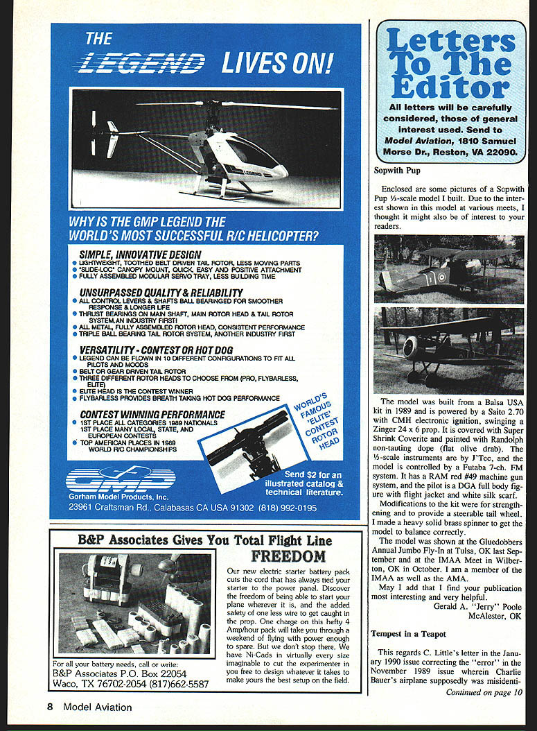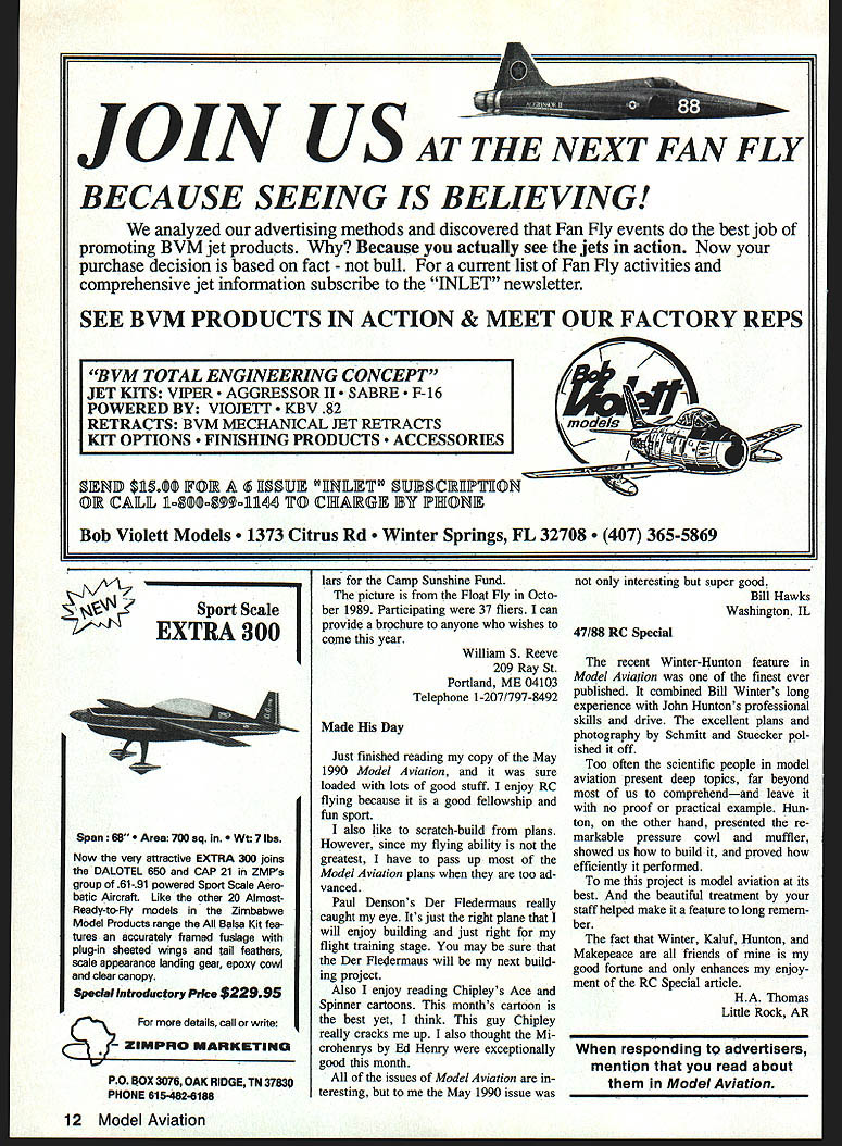 For battery needs call write B&P Associates PO Box 22054 Waco TX 76702-2054 817662-5587 new electric starter battery pack cuts cord has always tied starter power panel Discover freedom being able start plane wherever added safety less wire get caught prop charge hefty 4 Amp/hour pack will take through weekend flying power enough spare dont stop have Ni-Cads virtually size imaginable cut experimenter free design whatever takes make yours best setup field letters will carefully considered general interest used Send Model Aviation 1810 Samuel Morse Dr Reston VA 22090 Sopwith Pup Enclosed some pictures Sopwith Pup A-scale model built Due inter est shown model various meets thought might also interest readers model built Balsa USA kit 1989 powered Saito 270 CMH electronic ignition swinging Zinger 24 x 6 prop covered Super Shrink Coverite painted Randolph non-tauting dope flat olive drab A-scale instruments JTec model controlled Futaba 7-ch FM system has RAM red #49 machine gun system pilot DGA full body fig ure flight jacket white silk scarf Modifications kit strength ening provide steerable tail wheel made heavy solid brass spinner get model balance correctly model shown Gluedobbers Annual Jumbo Fly-In Tulsa OK last Sep tember IMAA Meet Wilber ton OK October am member IMAA well AMA May add find publication interesting very helpful Gerald Jerry Poole McAlester OK Tempest Teapot regards C Littles letter Janu ary 1990 issue correcting error November 1989 issue wherein Charlie Bauers airplane supposedly misidenti Continued page 10 8 Model Aviation B&P Associates Gives Total Flight Line FREEDOM WHAT WILL YOU DO FOR 1991 Take chances can still use present radio systems RCDsPIATINUM GRADEAM FM FCC/AMA listed 1991 receivers fit ri ght R/C systems Fly safely bullet-proof receivers NOW ONLY$7996 OR II RCD 100* D RCD 150* D RCD 200* D RCD 300* D RCD 400* NO Futaba GAM Futaba JAM Futaba J FM Airironks AM Airtronics FM Must specify channel#witl order___________________ ORDER BY PHONE CA 800 822-1688 US 800 228 -32372131 Old Oakland Rd San Jose CA 951314578 fiedas Douglas Dauntless II correc EASYBUILT wm~ tionjsiiorrect stir up tempest teaRADIO CONTROLJAPANESEpotfor some reason thisme SPORT SCALETHEZERObutirked Sn 53photo caption accurate certainly Mr Bauers ship represents calling aircraft Skyraider prototype Douglas XBT2D-l Dauntless II original designation under 29 45ngn aircraft first ordered 3 o4hnn dIflI.OnddNavy May 5 1945 name did change Skyraider until February 1946 OIlId C*nopy 3/IS EM BI designation remained BT2Dl until April year became AD-i John Kelinske Jr Houston TX THE EASY-BUILT ZERO IS GOOD SUBJECT FOR THE NOVICE FLYER MAKING THE TRANSrnON FROM SPORT TRAINERS TO SCALE MODELS BALANCED COMBINATION OF STABILITY AND CONTROL RESPONSE GIVES YOU FEELING OF CONFI- Memories DENCE RIGHT FROM THE FIRST FLIGHT THE CONSTRUCTION IS RUGGED AND EASY TO BUILD FEATURING SHEETED FOAM WINGS BALSA SHEETED FUSELAGE BALSA SHEET TAIL AND THERMOFORMED COWL AND CANOPY COMES IN SHORT KIT FORM TO SAVE YOU MONEY KIT INCLUDES FOAM WING CORES COWL CANOPY ENGINE MOUNT LANDING GEAR BLOCKS WITH STRAPS SCREWS HINGES PLYWOOD FIREWALL PLANS WITH TEMPLATES AND BILL OF MATERIALS NO BALSA INCLUDED ORDERIMJ SEND CK OR MONEY ORDER FOR $3750 PLUS $475 POSTAGE CANADIANS ADD $750 TO WING Mfg. 306 SimmoriB GIeburg IL 61401 IL RES ADD 7% SALES TAX ALL ORDERS UNDS SEND $400 FOR PRODUCT CATALOG DESCRIBING OUR COMPLETE LINE OF FOAM CORE REPLACEMENT WINGS ACCESSORIES KITS TOOLS AND MUCH MORE 3O342-3009 asked models builder Charlie Bauer referee says 1989 Na tional Contest entry modeled after second prototypes Dauntless II designation correct picture shown pit area Bomber Field First Annual B-17 Gathering under District VIII report February 1990 issue brought back memories B-17 second front pic ture carries tail insignia 99th Bom bardment Group H 348th Squadron served squadron flight engi neer during winter spring 194445 last combat base 99th Tortorella Italy just few miles east Foggia tower code name Sandfly am pleased see Diamond Y 99th still flies somewhere other over Washingtons Crossing State Park NJ RC planes fly tail insignia John E Weber Lambertville NJ Worthy Cause may interested know Monte Carlo Float Fly Weekends Point Sebago Casco ME have sponsored Propsnappers RC Club past several years benefit Camp Sunshine Fund Via Float Fly events year May 18-20 October 19-21 help Camp Sunshine provide vacation experi ence children suffer lifethreatening disease During summer children families treated expense-free week resort Float Fly contests have generated great deal interest Northeast has resulted raising thousands dol Continued page 12 10 Model Aviation Trash current radio system et RCDs New 199 1-Ready receiver BECAUSE SEEING IS BELIEVING analyzed advertising methods discovered Fan Fly events best job promoting BVM jet products Because actually see jets action Now purchase decision based fact bull current list Fan Fly activities comprehensive jet information subscribe INLET newsletter SEE BYM PRODUCTS IN ACTION & MEET OUR FACTORY REPS IEN1U $R~ FI IINLET U1CI1PIP1IN OIR CALL 1@O4il1 IFO CIHEA1G1 IY 1HWNE Bob Violett Models Citrus Rd er Springs FL 32708 365-5869 Sport Scale EXTRA 300 Span 66 700 sq lbs Now very attractive EXTRA 300 joins DALOTL 650 CAP 21 ZMPs group 61-91 powered Sport Scale Aero batic Aircraft Like other 20 AlmostReady-ta-Fly models Zimbabwe Model Products range Balsa Kit fea tures accurately framed fuslage plug-in sheeted wings tail feathers scale appearance landing gear epaxy cowl clear canopy Special Introductery Price $22995 ils call write ZIMPRO MARKETINO lars Camp Sunshine Fund picture FloM Fly Octo ber 1989 Participating 37 fliers can provide brochure anyone wishes come year William S Reeve 209 Ray St Portland ME 04103 Telephone 1-207/797-8492 Made Day Just finished reading copy May 1990 Model Aviation sure loaded lots good stuff enjoy RC flying because good fellowship fun sport also like scratch-build plans H
