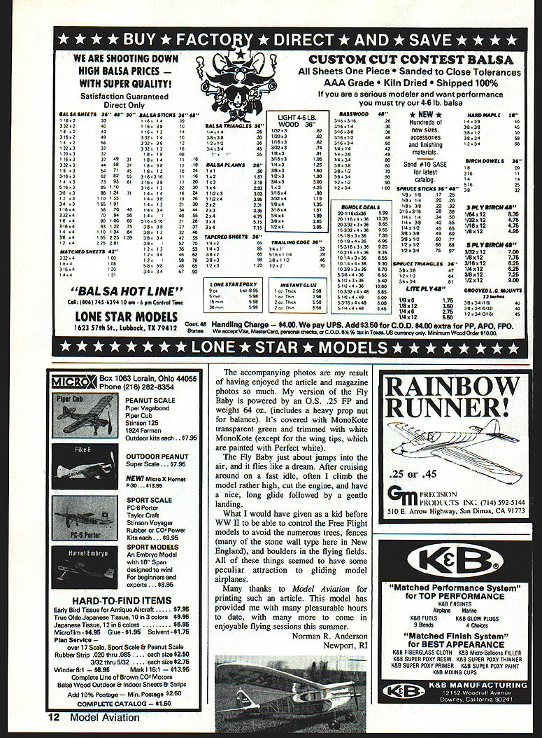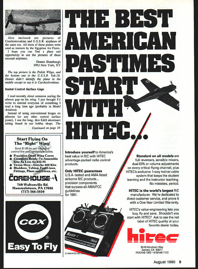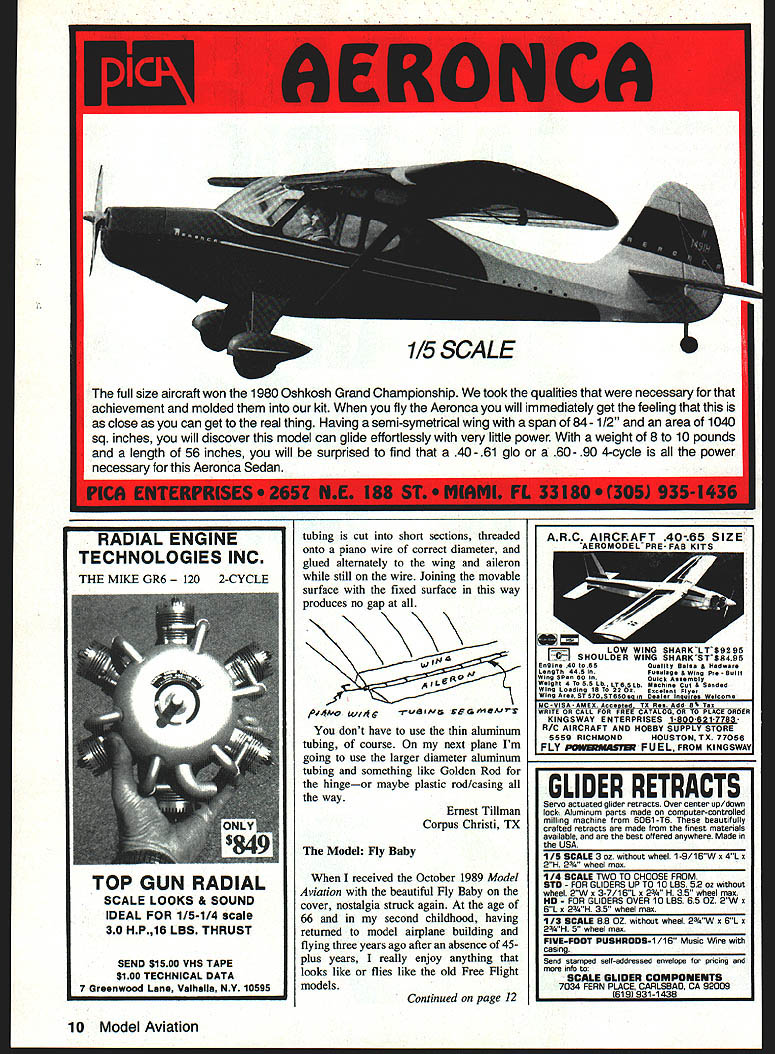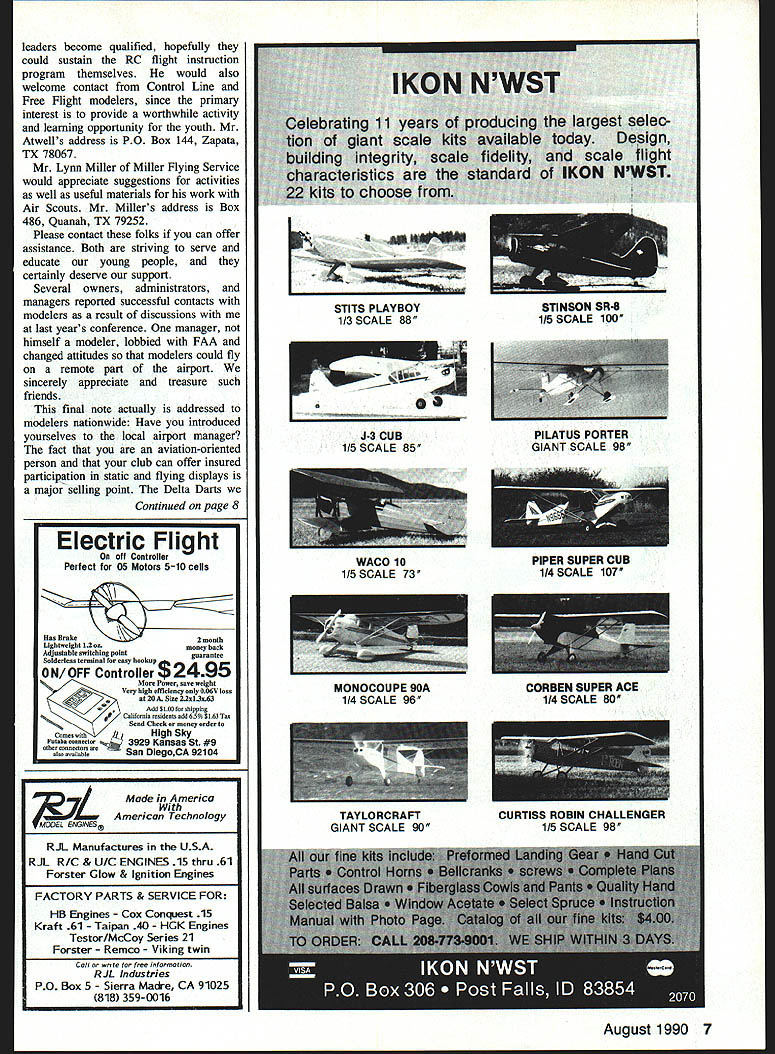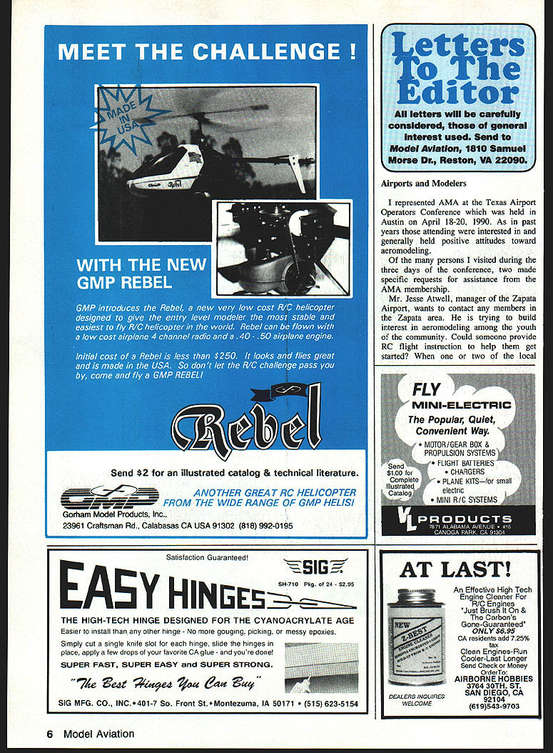 Airports Modelers represented AMA Texas Airport Operators Conference held Austin April 18-20 1990 As past years attending interested generally held positive attitudes toward aeromodeling persons visited during three days conference two made specific requests assistance AMA membership Mr Jesse Atwell manager Zapata Airport wants contact members Zapata area trying build interest aeromodeling among youth community Could someone provide RC flight instruction help get started two local ANOTHER GREA T RC HELICOPTER FROM THE WIDE RANGE OF GMP HELlS Gorham Model Products Inc 23961 Craftsman Rd Calabasas CA USA 91302 818 992-0195 AT LAST An Effective High Tech Engine Cleaner RIO Engines Just Brush & Carbons Gone-Guaranteed ONLY $695 CA residents add 725% tax Clean Engines-Run Cooler-Last Longer Send Check Money OrderTo AIRBORNE HOBBIES 3764 30TH ST SAN DIEGO CA 92104 619543-9703 6 Model Aviation Send $2 illustrated catalog & technical literature et e ditor Itt will carefully considered general Interest used Send Model AviatIon 1810 Samuel Morse DEL Reston VA 22O Satisfaction Guaranteedi ~0 2Av HINEL 5H-710 Pkg 24-52 95 THE HIGH-TECH HINGE DESIGNED FOR THE CYANOACRYLATE AGE Easier install other hinge No gouging picking messy epoxies Simply cut single knife slot hinge slide hinges e apply few drops favorite CA glue youre done SUPER FAST SUPER EASY SUPER STRONG 74e eate4 /oa %c SIG MFG CO INC.401-7 So Front St.Montezuma IA 50171 623-5154 DEALERS INQUIRES WELCOME leaders become qualified hopefully could sustain RC flight instruction program themselves would also welcome contact Control Line Free Flight modelers since primary interest provide worthwhile activity learning opportunity youth Mr Atwells address PO Box 144 Zapata TX 78067 Mr Lynn Miller Miller Flying Service would appreciate suggestions activities well useful materials work Air Scouts Mr Millers address Box 486 Quanah TX 79252 Please contact folks can offer assistance Both striving serve educate young people certainly deserve support Several owners administrators managers reported successful contacts modelers result discussions last years conference manager himself modeler lobbied FAA changed attitudes modelers could fly remote part airport sincerely appreciate treasure such friends final note actually addressed modelers nationwide Have introduced yourselves local airport manager fact aviation-oriented person club can offer insured participation static flying displays major selling point Delta Darts Continued page 8 A7aqw/ Made America I-JJ American Technology E5JGJNES1 STITS PLAYBOY 1/3 SCALE 88 August 1990 7 STINSON SR6 1/5 SCALE 100 J3 CUBPILATUS PORTER 1/5 SCALE 85GIANT SCALE 98 Electric Flight f Controller Perfect 05 Motors 510 cells month Lightweight 12 onusoney back Adjustable switching point Solderless terminal easy hookupglsarantee ON/OFF Controller $2495 Power save weight v high efiicency O06V loss 20 Size 22sl2x63 Add Slot shippiog Califooia residooto add 65% 5163 Too Send Check money order N mooithHigh Sky Fotahamnneotor 3929 Kansas St #9 osh zoseSan DlegoCA 92104 WACO 10PIPER SUPER CUB 115 SCALE 731/4 SCALE 107 MONOCOUPE 90ACORBEN SUPER ACE 1/4 SCALE 961/4 SCALE 80 TAYLORCRAFTCURTISS ROBIN CHALLENGER GIANT SCALE 901/5 SCALE 98 RJL Manufactures USA RJL RIG & U/C ENGINES 15 thru 61 Forster Glow & Ignition Engines FACTORY PARTS & SERVICE FOR HB Engines Cox Conquest 15 Kraft 61 Taipan 40 HGK Engines Testor/McCoy Series 21 Forster Remco Viking twin Cafi orte free informotioo RJL industries PO Box 5 Sierra Ma&e CA 91025 815 359-0016 SPORT/PATTERN FLYING FOR ENGINE OR MOTOR SIMPLE TO BUILD TO FLY DESIGNS Featuring extensive pre fabrication including pre cut fuse lage sides tail feathers accurately die machine cut parts HAMMER 20 Pocket size pattern ship 20-30 engines 25 size electric motors Wing span 50 400 sq area 3-4 lbs flying weight Symmet rical airfoil tapered wing generous side area superb perf mance Has unique simplicity design quick accurate con struction S 28 KITS TO CHOOSE FROM IIAVEY675 TOWER LANE YSTEMSWEST CHESTER PA 19380 ORPORATION gave away last year again year also interest group An offer assist Delta Dart building sessions school groups visiting airport likely receive positive acceptance Airport folks need good public relations much modelers makes good sense us cooperate possible way Robert Spivey Austin TX Another Wilga Beautiful Ugly Airplanes article October 1989 issue Mr Berliner included picture Polish Wilga airplane am enclosing picture another Wilga display Military Museum Citadel Cairo Egypt least two things world 8 Model Aviation HAMMER 40 Big brother Hammer 20 attributes- plus larger size wing span 60 620 sq area 451/y lbs flying weight 35-45 two-cycle 40-60 four-cycle engines 40 size motors Does pattern manuevers can still fly like docile trainer CESSNA 150 real pretty sport scale copy famous trainer 20-30 twocycle 30-40 four-cycle engines 25 size electric motors Wing span 50 410 sq area 3l/y4 lbs flying weight semi-symmetrical airfoil optional flaps wide speed range realistic performance Oil Ml Vfl CaUtS fliStS 0m afhNed Ral & f Haab 5AndesO, Only certified checfs money orders accepfed Minimum order 81200 fhrne packages 4 Powerpoles 18350 per package $150 shipams handling CT residents add 75% sales tax Prices sabiect chesge notice DEALER 6NOUIRES SNWTID further inforrsalion dealer paces send SASE Business Card SERMO RIC SNAP CONNECTORS Inc Cedar Corners Station Box 16787 Stamford CT 06905 203 322-6294 RONS MODEL BUILDING call Write 435 San Vicente Blvd J Santa Monica CA 90402 Radio Controlled Airplanes Other Aircraft floats 2134514484 Build fly Veil THE BEST Also enclosed pictures Czechoslovakian USSR airplanes same era three planes used trainers Egyptian Air Force hope can find place opportunity use pictures unusual airplanes Dennis Shambaugh FPO New York NY top picture Polish Wilga bottom USSR Yak-i 8 Dennis didnt identify plane middle except say Czechoslovakian Sealed Control Surface Gaps read recentl