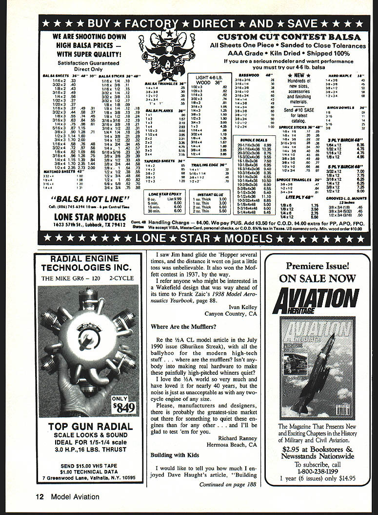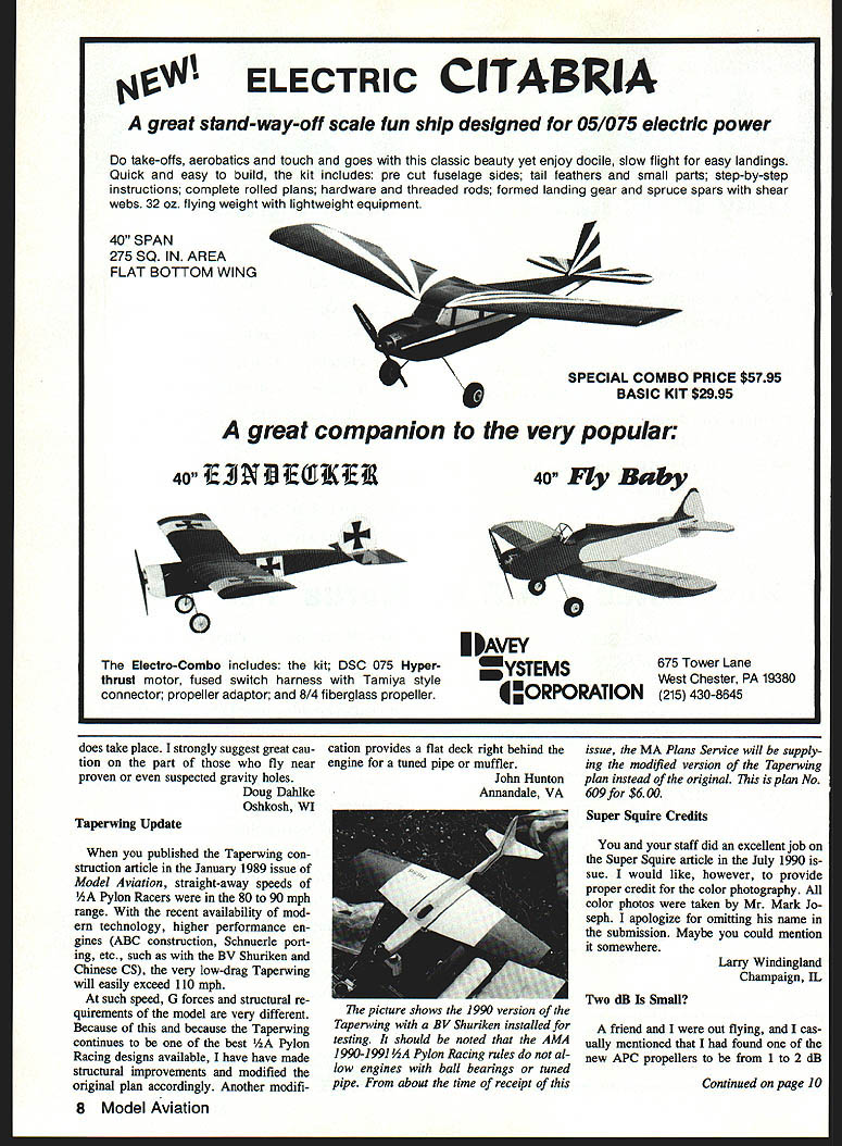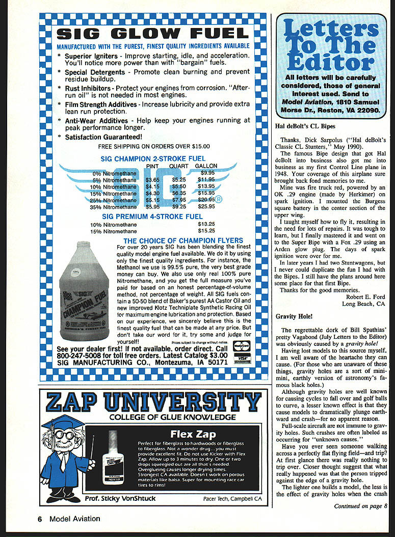 510 GLOW FUEL MANUFACTURED WITH THE PUREST FINEST QUALITY INGREDIENTS AVAILABLE * Superior Igniters Improve starting idle acceleration Youll notice power bargain fuels * Special Detergents Promote clean burning prevent residue buildup * Rust Inhibitors Protect engines corrosion After run oil needed engines * Film Strength Additives Increase lubricity provide extra lean run protection * Anti-Wear Additives Help keep engines running peak performance longer * Satisfaction Guaranteed FREE SHIPPING ON ORDERS OVER $1500 SIG CHAMPION 2-STROKE FUEL PINTQUART GALLON 0% Nitrofll#than $995 5% Nitromethafle $365$525$1195 100/0 Nitronietht#* $416$560$1395 150/0 Nitromethane $430$835$1595 25% Nitrornethatte 1515$195$2095 350/0 Nitrometllane$595$925$2595 SIG PREMIUM 4-STROKE FUEL 100/0 Nitromethane $1325 150/0 Nitromethane $1525 THE CHOICE OF CHAMPION FLYERS over 20 years SIG has blending finest quality model engine fuel available using finest quality ingredients instance Methanol use 995% pure very best grade money can buy also use real 100% pure Nitromethane get full measure youve paid based honest percentage-of-volume method percentage weight SIG fuels con tain 50-50 blend Bakers purest AA Castor Oil new improved Klotz Techniplate Synthetic Racing Oil maximum engine lubrication protection Based experience sincerely believe finest quality fuel can made price dont take word try some judge yourselfPrices sobiect change withOut notice See dealer first available order direct Call 800-247-5008 toll free orders Latest Catalog $300 Ii SIG MANUFACTURING CO Montezuma IA 50171 mmUNUEEEEEEU U U U U EEU U al deBolts CL Bipes Thanks Dick Sarpolus Hal deBolts Classic CL Stunters May 1990 famous Bipe design got Hal deBolt business also got business first Control Line plane 1948 coverage airplane sure brought back fond memories Mine fire truck red powered OK 29 engine made Herkimer spark ignition mounted Burgess square battery center section upper wing taught myself fly resulting need lots repairs tough learn finally mastered went Super Ripe Fox 29 using Arden glow plug days spark ignition over later years two Stuntwagons never could duplicate fun Bipes still have plans around some place first Ripe Thanks good memories Robert E Ford Long Beach CA Gravity Hole regrettable dork Bill Spathias pretty Vagabond July Letters Editor obviously caused gravity hole Having lost models source myself am well aware heartache can cause unaware things gravity holes sort minimini earthly version astronomys fa mous black holes Although gravity holes well known causing cycles fall over golf balls curve lesser known effect cause models dramatically plunge earth ward crashfor no apparent reason Full-scale aircraft immune grav ity holes Such crashes often labeled occurring unknown causes Have ever seen someone walking across perfectly flat flying fieldand trip first glance really nothing trip over Closer thought suggest what really happened person tripped against edge gravity hole lighter builds model less effect gravity holes crash Continued page 8 6 Model Aviation et s o 4le ditor letters will ocrefully consIdered general Interest used Send Model AviatIon 1810 Samuel Morse Dii Reston VA 22090 ZAP UNIVERSITY COLLEGE OF GLUE KNOWLEDGE 4lt4 ELECTRIC CITABRIA great stand-way-ott scale fun ship designed 05/0 75 electric power take-offs aerobatics touch goes classic beauty yet enjoy docile slow flight easy landings Quick easy build kit includes pre cut fuselage sides tail feathers small parts step-by-step instructions complete rolled plans hardware threaded rods formed landing gear spruce spars shear webs 32 oz flying weight lightweight equipment 40 SPAN 275 SQ IN AREA FLAT BOTTOM WING 40 SPECIAL COMBO PRICE $5795 BASIC KIT $2995 Electro-Combo includes kit DSC 075 Hyper thrust motor fused switch harness Tamiya style connector propeller adaptor 8/4 fiberglass propeller YSTEMS ORPoRATION 675 Tower Lane West Chester PA 19380 215 430-8645 does take place strongly suggest great cau tion part fly near proven suspected gravity holes Doug Dahlke Oshkosh WI Taperwing Update published Taperwing con struction article January 1989 issue Model Aviation straight-away speeds AA Pylon Racers 80 90 mph range recent availability mod ern technology higher performance en gines ABC construction Schnuerle port ing etc such BY Shuriken Chinese CS very low-drag Taperwing will easily exceed 110 mph such speed G forces structural re quirements model yery different Because because Taperwing continues best /2A Pylon Racing designs available have have made structural improvements modified original plan accordingly Another modifi cation provides flat deck right behind engine tuned pipe muffler John Hunton Annandale VA issue MA Plans Service will supply ing modified version Taperwing plan instead original plan No 609 $600 Super Squire Credits stuff did excellent job Super Squire article July 1990 sue would like however provide proper credit color photography color photos taken Mr Mark Jo seph apologize omitting name submission Maybe could mention somewhere Larry Windingland Champaign IL Two dB Small friend out flying cas ually mentioned found new APC propellers 1 2 dB Continued page 10 8 Model Aviation N great companion very popular 40 Fly Baby 0 picture shows 1990 version Taperwing BV Shuriken installed testing should noted AMA 1990-1991 Pylon Racing rules al low engines ball bearings tuned pipe about time receipt WACO YMF /5 SCALEl/fl SCALE Wing Span72Wng Span60 Wing Area1530 sqWing Area960 sq Weight12l3IbsWeight8Ibs Engine75-90 2CEngine61 2c 90 4c Receive FREE cockpit kit PICA standoff scale model purchased between September 1 1990 November 30 1990 sending proof-of-purchase PICA postmarked no later December 31 1990 Proof-of-purchase end label kit box original bill sale will no exceptions dates offer bill sale must clearly show dealers name address No copies bill sale will accepted Void prohibited law coupon must accompany request NAME ___________________________________