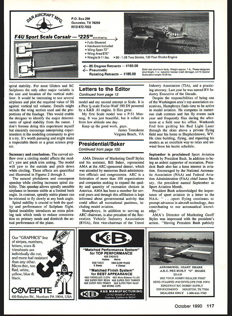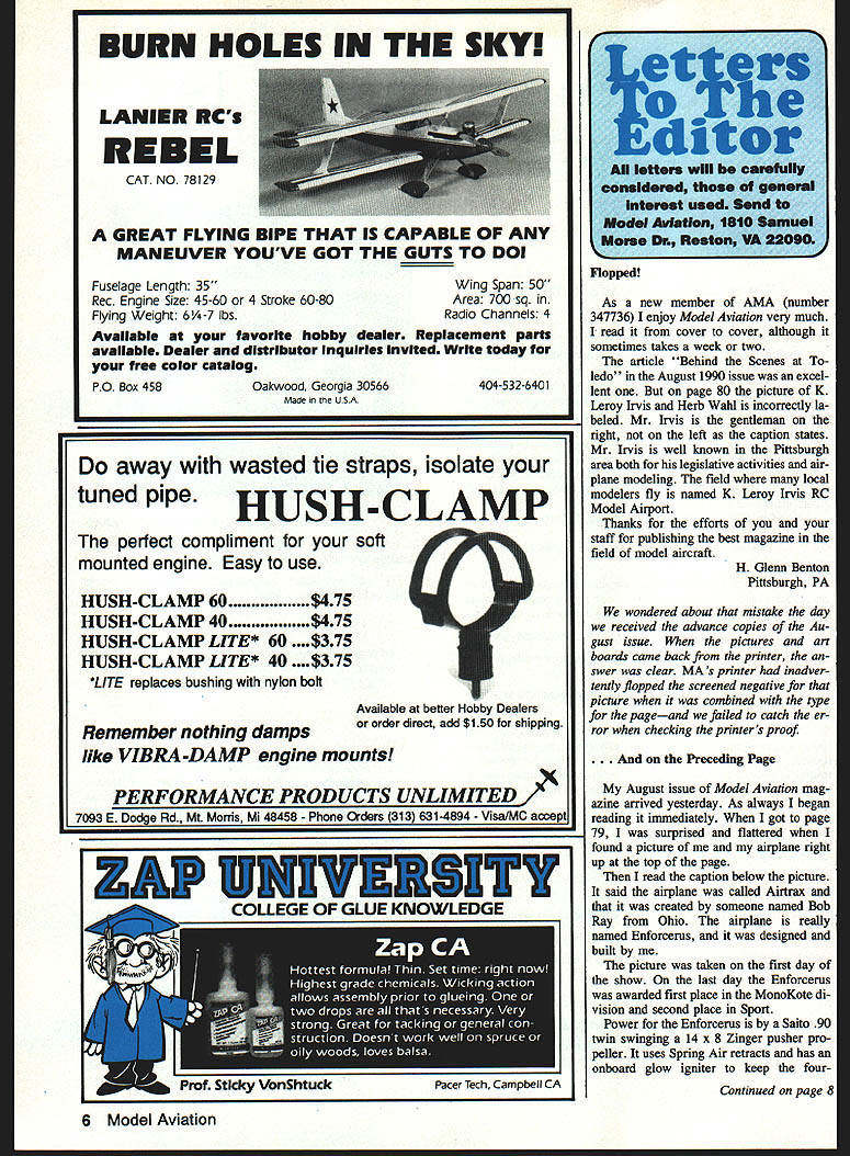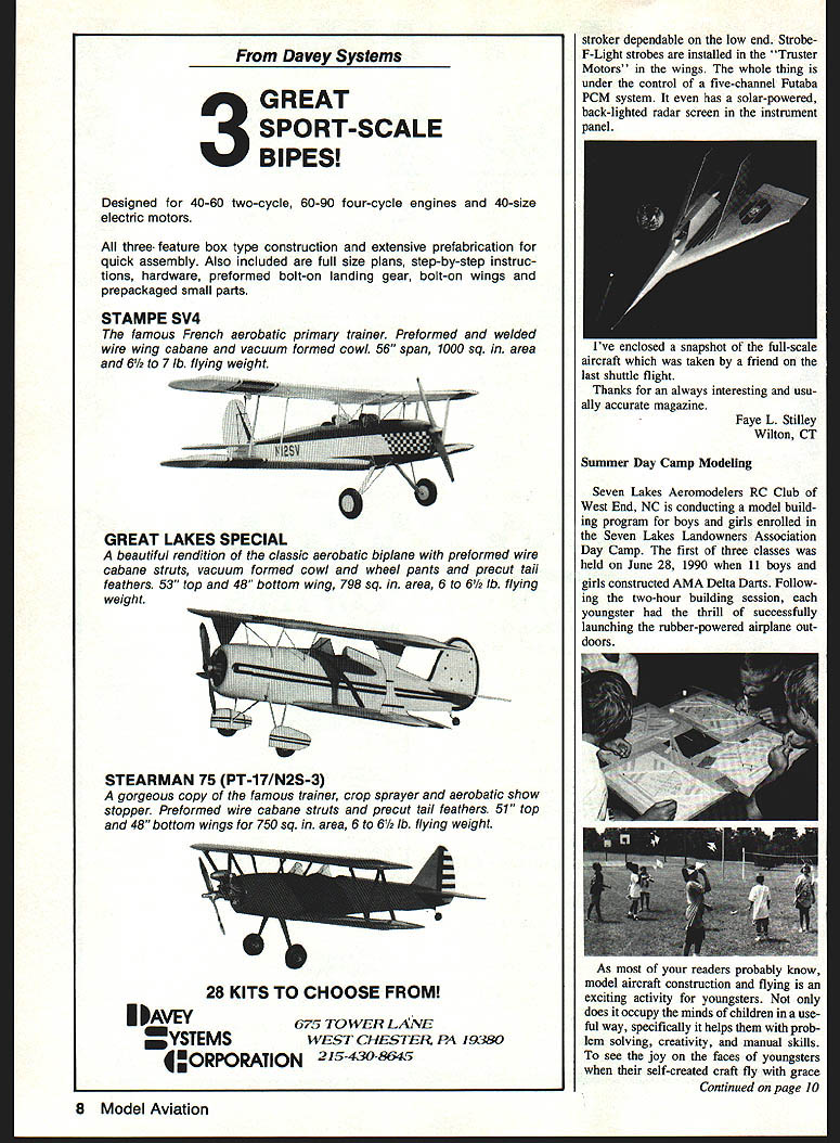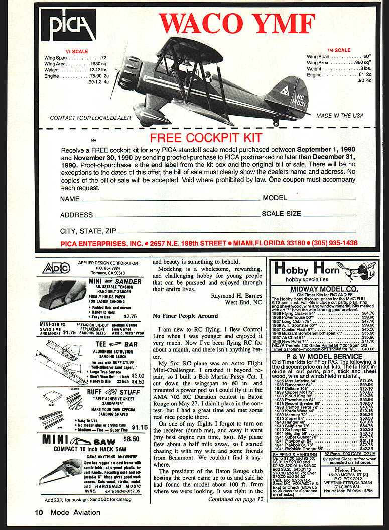 Do away wasted tie straps isolate tuned pipe HUSH-CLAMP perfect compliment soft mounted engine Easy use HUSH-CLAMP 60$475 HUSH-CLAMP 40$475 HUSH-CLAMP LITE* 60 ..$375 HUSH-CLAMP LITE* 40 ..$375 *LITE replaces bushing nylon bolt Remember nothing damps like VIBRA-DAMP engine mounts Available better Hobby Dealers order direct add $150 shipping PERFORMANCE PRODUCTS UNLIMITED 7093 E Dodge Rd Mt Moms Mi 48458 Phone Orders 313 631-4894 Visa/MC accept As new member AMA number 347736 enjoy Model Aviation very much read cover cover although sometimes takes week two article Behind Scenes ledo August 1990 issue excel lent page 80 picture K Leroy Irvis Herb Wahi incorrectly la beled Mr Irvis gentleman right left caption states Mr Irvis well known Pittsburgh area both legislative activities air plane modeling field local modelers fly named K Leroy Irvis RC Model Airport Thanks efforts staff publishing best magazine field model aircraft H Glenn Benton Pittsburgh PA wondered about mistake day received advance copies Au gust issue pictures art boards came back printer swer clear MAs printer inadver tently flopped screened negative picture combined type pageand failed catch er ror checking printers proof . And en Preceding Page August issue Model Aviation mag azine arrived yesterday As always began reading immediately got page 79 surprised flattered found picture airplane right up top page read caption below picture said airplane called Airtrax created someone named Bob Ray Ohio airplane really named Enforcerus designed built picture taken first day show last day Enforcerus awarded first place MonoKote di vision second place Sport Power Enforcerus Saito 90 twin swinging 14 x 8 Zinger pusher pro peller uses Spring Air retracts has onboard glow igniter keep fourContinued page 8 6 Model Aviation BURN HOLES IN THE SKY LANIER RCu REBEL CAT NO 78129 GREAT FLYING RIPE THAT IS CAPABLE OF ANY MANEUVER YOUVE GOT THE GUTS TO DOI Fuselage Length 35Wing Span 50 Rec Engine Size 45-60 4 Stroke 60-80Area 700 sq Flying Weight 6V-7 lbsRadio Channels 4 Available favorite hobby dealerRepiacement parts avaliabie Deaier distributor inquiries Invited Write today free color catalog PO Box 458Oakwood Georgia 30566404-532-6401 Made USA ZAP UNIVERSITY COLLEGE OF GLUE KNOWLEDGE Davey Systems 3 REAT SPORT-SCALE IPES Designed 40-60 two-cycle 60-90 four-cycle engines 40-size electric motors three feature box type construction extensive prefabrication quick assembly Also included full size plans step-by-step instruc tions hardware preformed bolt-on landing gear bolt-on wings prepackaged small parts STAMPE 5V4 famous French aeroba tic primary trainer Preformed welded wire wing cabane vacuum formed cowl 56 span 1000 sq area 6 7 lb flying weight GREAT LAKES SPECIAL beautiful rendition classic aerobatic biplane preformed wire cabane struts vacuum formed cowl wheel pants precut tail feathers 53 top 48 bottom wing 798 sq area 6 6 lb flying weight STEARMAN 75 PT-17/N2S-3 gorgeous copy famous trainer crop sprayer aerobatic show stopper Preformed wire cabane struts precut tail feathers 51 top 48 bottom wings 750 sq area 6 61/2 lb flying weight IAVEY675 TOWER LANE YSTEMSWESTCHESTER PA 19380 oRPORATIoN 215-430-8645 stroker dependable low end StrobeF-Light strobes installed Truster Motors wings whole thing under control five-channel Futaba PCM system has solar-powered back-lighted radar screen instrument panel Faye L Stilley Wilton CT Summer Day Camp Medeling Seven Lakes Aeromodelers RC Club West End NC conducting model build ing program boys girls enrolled Seven Lakes Landowners Association Day Camp first three classes held June 28 1990 11 boys girls constructed AMA Delta Darts Follow ing two-hour building session youngster thrill successfully launching rubber-powered airplane out doors As readers probably know model aircraft construction flying exciting activity youngsters does occupy minds children use ful way specifically helps prob lem solving creativity manual skills see joy faces youngsters self-created craft fly grace Continued page 10 8 Model Aviation Ive enclosed snapshot full-scale aircraft taken friend last shuttle flight Thanks always interesting usu ally accurate magazine 28 KITS TO CHOOSE FROM F 1/5 SCALE Wing Span72 Wing Area 1530 sq Weight12-l3Ibs Engine75-90 2c 90-12 4c / CONTACT YOUR LOCAL DEALER MA WACO YMF 1/6 SCALE Wing Span60 Wing Area960 sq WeightBibs Engine61 2c 90 4c MADE IN THE USA Receive FREE cockpit kit PICA standoff scale model purchased between September 1 1990 November 301990 sending proof-of-purchase PICA postmarked no later December31 1990 Proof-of-purchase end label kit box original bill sale will no exceptions dates offer bill sale must clearly show dealers name address No copies bill sale will accepted Void prohibited law coupon must accompany request MODEL 5CALE SIZE ____________ CITY STATE ZIP PICA ENTERPRISES INC NE 188th STREET MIAMIFLORIDA 33180 305 935-1436 APPLIED DESIGN CORPORATION PO Box 3384 Torrance CA 90510 MINI ER ADJUSTABLE TENSION HAND BELT SANDER FIRMLY HOLDS PAPER FOR EASIER SANDING Padded flats calve Handy Held Easyl Use $275 MINI-STRIPSPRECISION DIECUT Medium Garnet SAVES TIMEREPLACEMENTFine Garnet AND EFFORT $1 75SANDING BELTSAseld Water Preet TEE i ALUMINUM EXTRUSION SANDING BLOCK ler ene wh RUFF-STUFF Selt-edheelee sand paper Large Tnae Settee Wee tWearOat 11 ecu $300 Handyte Use flinch $450 RUFF 6 STUFF SELF ADHESIVE SHEET SANDPAPER MAKE YOUR OWN SPECIAL SANDING SHAPES Easy Ia Use Ne messy glee er dryIng tune $115 Medium Flee r Flee MINbsAw $850 COMPACT 10 insh HACK SAW SAWS ANYTHING ANYWHERE Saw han rugged diecast train wIth eantntabte chlp-preet plastIc 541 hendle RecedIng see ad pastable 6 blade glue gad werk access Cats weed plastIc metal HARDENED MUSIC WIREextra blsdes-31S205 beauty something behold Modeling wholesome rewarding challenging hobby young people can pursued enjoyed through entire lives Raymond H Barnes West End NC No Finer People Around am new RC flying flew Control Line