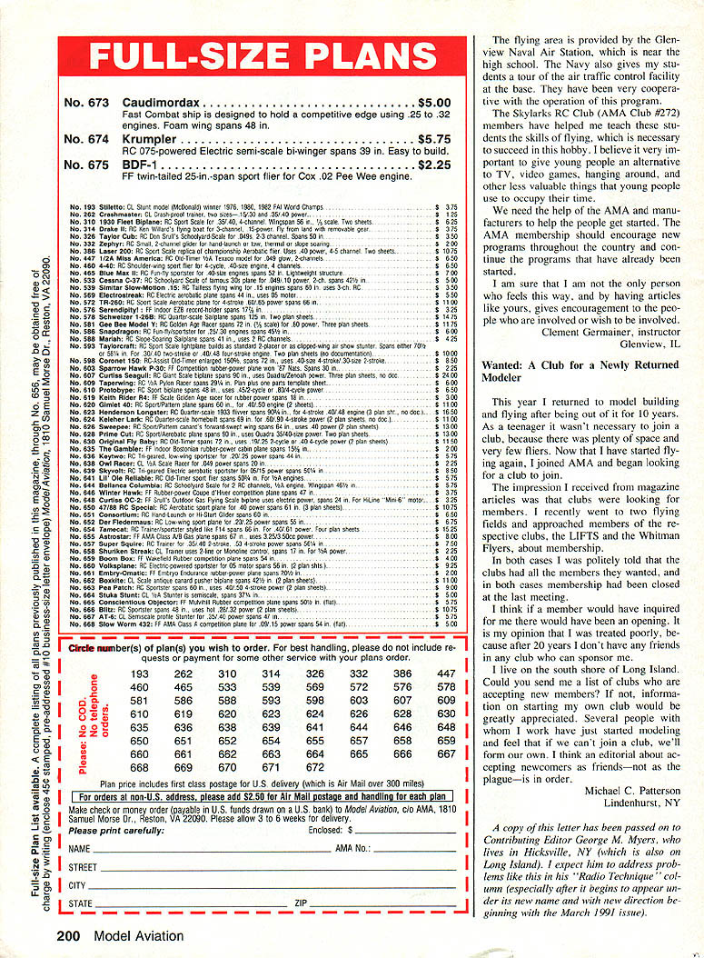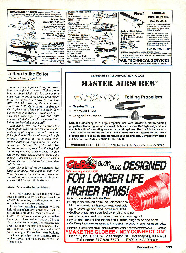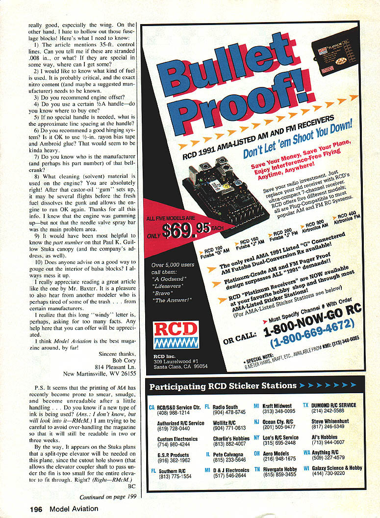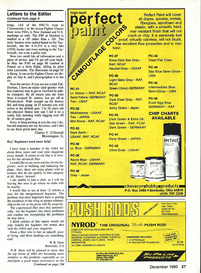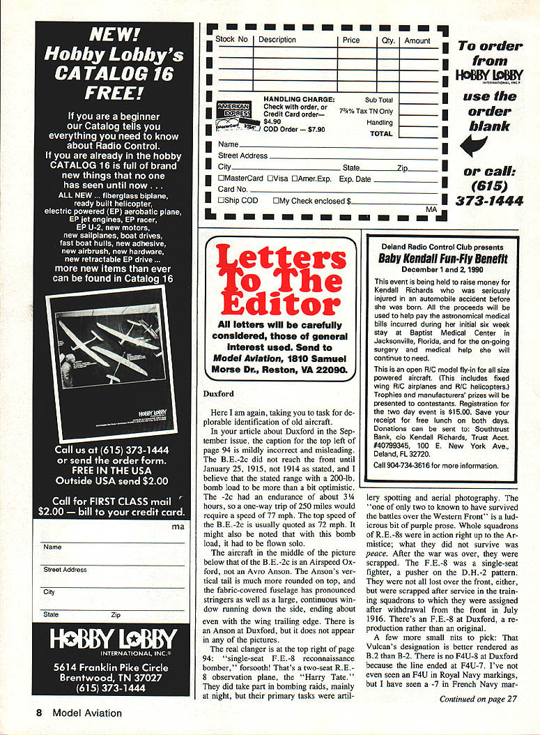 \deflang1033\pard\plain\f0\fs17 MA m J Duxford am again taking task de plorable identification old aircraft article about Duxford Sep tember issue caption top left page 94 mildly incorrect misleading BE-2c did reach front until January 25 1915 1914 stated believe stated range 200-lb bomb load bit optimistic -2c endurance about 3 hours one-way trip 250 miles would require speed 77 mph top speed BE-2c usually quoted 72 mph might also noted bomb load flown solo aircraft middle picture below BE-2c Airspeed Ox ford Avro Anson Ansons ver tical tail much rounded top fabric-covered fuselage has pronounced stringers well large continuous win dow running down side ending about wing trailing edge Anson Duxford does appear pictures real danger top right page 94 single-seat FE-8 reconnaissance bomber forsooth Thats two-seat RE 8 observation plane Harry Tate did take part bombing raids mainly night primary tasks artil lery spotting aerial photography two known have survived battles over Western Front lud icrous bit purple prose Whole squadrons RE-8s action right up Ar mistice what did survive peace After war over scrapped FE-8 single-seat fighter pusher DH-2 pattern lost over front either scrapped after service train ing squadrons assigned after withdrawal front July 1916 Theres FE-8 Duxford re production rather original few small nits pick Vulcans designation better rendered B2 B-2 no F4U-8 Duxford because line ended F4U-7 Ive seen F4U Royal Navy markings have seen -7 French Navy marContinued page 27 8 Model Aviation etlers dito o letters will carefully considered general Interest used Send Model AvIation 1810 Samuel Morse Dr Reston VA 22090 Deland Radio Control Club precenta Baby Kendall FunFly Benefit December 1 2 1990 event being held raise money Kendall Richards seriously injured automobile accident before born proceeds will used help pay astronomical medical bills incurred during initial six week stay Baptist Medical Center Jacksonville Florida on-going surgery medical help will continue need open R/G model fly-in size powered aircraft includes fixed wing R/G airplanes RIC helicopters Trophies manufacturers prizes will presented contestants Registration two day event $1500 Save receipt free lunch both days Donations can sent Southtrust Bank Kendall Richards Trust Acct #40799345 100 E New York Ave Deland FL 32720 Call 904-734-3616 information ma Name Street Address City State Zip Letters Editor Continued page 8 kings F4U-7s went lAeronavale recent Fighter Classic F4Us New Zealand US markings well F8F Duxford marked -2P rather -2N early Austers indeed based Tay loreraft AOP-9 very late 1955 Auster owes nothing Tay loreraft polite nod Now two small bits information piece advice Ill get off back May P-63 page 96 crashed France ferry flight killing its pilot John Larcombe Hurricane page 95 flying Fighter Classic air dis play July 8 photographed Now advice total Cal ifornian have easier quicker less expense way get Duxford pub lic transport means take train Liverpool St station get off Whittlesford Walk straight up Station Rd keep going 25 minutes will arrive airfield gate Im 58 years old no physical fitness nut did sunny July morning lugging over 20 lb camera gear Sorry keep picking way old airplanes favorites like see given due Charles V ODonnell Bloomington IL Hey Beginners need help have member AMA about three years read magazine month seems writ ten advanced flier would like see articles ginner such building balancing plane Also planes sold trainers qualify category Buyer beware am unable join club will leaving area go no clubs will nearby would like see least 12 articles year inexperienced beginner problem beginners have getting incidence wing proper relation ship tail plane will fly properly experienced flier does automati cally beginner has problems crashes recognizing problems may have think articles nature would benefit beginner would also help AMA magazine flier fair takeoff poor flying landings something else WB Hem Riverside CA W B Hem will pleased know top levels AMA becoming sensitive problemespecially anticipate great newcomers Continued page 194 PC-31 Lt Stone RCAF Sand Yellow-GERMANY Tan USAF PC-32 Middleston USAAF Tan JAPAN Mid Stone RAF RCAF PC-33 Dark Earth USAAF RAF RCAF PC-34 Lt Blue GERMANY PC-35 Azure Blue USAAF RAF RCAF GERMANY PC-36 Grey Japan Perfect Paint will cover dopes epoxies metals fiberglass styrofoam plastic smooth hard mar resistant finish will crackorchipltisextremelyfuel proof virtually odorless will blush has excellent flow properties non PC43 Dead Flat Clear PC-44 Sea Blue Semi-Gloss USN PC-45 pc-al Extra Dark Sea Grey RAP RCAF Neutral Gray USAAF pc-as Light Slate Grey RAP RCAF Green Grey-GERMANY PC49 Dark Slate Grey RAF RCAF Army Green Japan PC-40 Dark Green & Extra Dk Sea Green RAF FCAF Dark Green GERMANY PC-41 Navy Green JAPAN PC-42 Olive Drab USAAF perfect p&tectJ f 4 Intermediate 8lue Semi-Gloss LION PC- Duck Egg Blue GERMANY RAP CHIP CHARTS AVAILABLE ox 2480 ky OhIo 44870 419 797-2208 December 1990 27 AY YOU 0hEM NYROD@ THE ORIGINAL lQttbQt PUSH RQ0 COMPLEfE WITH ALL REQUIRED vtEtAL_____________________________ rITTINGS IDEALLY SUITED FOR ANY PUSfI ROD ACTION RUDDERS ELEWORS AILERONS THROTTLEHARDWARE INCLuDED CONTROL BOATS SEA PLANES. YOUR1-4 NYROOter GINATION1 8 Rod 2-56 Threaded end 34 LONG ASSEMBLED LENGTH at NYROD VJotldS best setlifl9 Spark lgflhttOfl system chosen Byron 0rigids T&G Mfg mid kM Aircraft Saqiply its outstanuhig reldijity Complete single cylinder system includ ng throttlecoupled spark advance kit spark fin J3iIDI plug battery pack charger 900 sh elded ____ Spark plug lead 0 Much linger mipie Hf Easy bud starts-no kickback \tab 1JN1012INIO RPM rehidile 0% power faa strokers oni kastiation available Lower priced fuels no eltro needed 0\tab Shielded qiark piqued mid 9V pug cover Forniuyenpusfl&np2&4slrolte skigleuidtwhicyhders zollwouhictsavailalzle 0 Sgud coils spelt pkip shielded plug lied ft thi*ig kits aviable Sooner later youll see ne