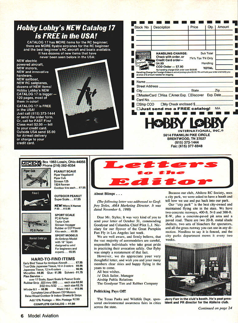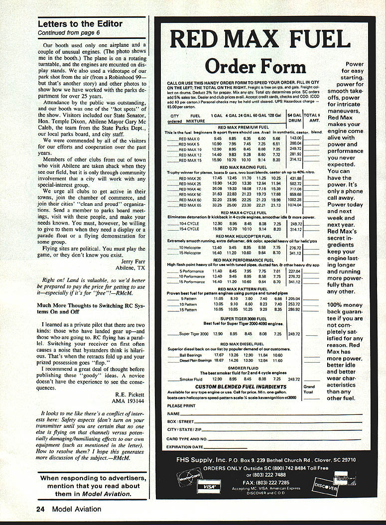 r m Stock No DescriptionAmount I HANDLING CHARGESub Total Check order Only t79~Credit Card orde ~l$490Handling COD Order No handling charge/USA order acer ssooggTOTAL Hand og Chergefo Foreign Orders actual postage plan $5110 Wewii hold yoar order nohfyyoo once $ amoco needed shipping Name Street Address CityState...Zip U MasterCard ElVisa ElAmerExp ElDiscover Exp Date______ Card No EJShip COD EJMy Check enclosed $ 1EJust send FREE catalog MA U HOWW Bg INTERNATIONAL INC 5614 FRANKLIN PIKE CIRCLE BRENTWOOD TN 37027 615 373-1444 Fax 615 377-6948 Rnx 1063 Lorain Ohio 44055 216 282-8354 PEANUT SCALE Piper Vagabond Piper Cub Stinson 125 1924 Farman Outdoor kits . $795 OUTDOOR PEANUT Super Sle. $795 NEW Micro X Hornet P30$1395 SPORT SCALE PC6 Porter Taylor Craft Stinson Voyager Rubber CO Power Kits . $995 SPORT MODELS An Embryo Model 18 Span designed winl beginners experts. $895 HARD-TO-FIND ITEMS Eariy Bird Tissue Antique Aircraft$795 True Olde Japanese Tissue 10 3 coiors$995 Japanese Tissue 12 6 colors$695 Microfilm Glue $195 Solvent $175 Plan Service over 17 Scale Sport Scale & Peanut Scale Rubber Strip 020 thru 085 .. size $250 3132 thru 5/32 .. size $275 Winder 61 $695Mark 161 $1395 Complete Line Brown CO Motors Baiss Wood Outdoor & indoor Sheets & Strips Add 10% Postage ostage $250 COMPLETE CATALOG * 1 a ut Blimps following letter addressed Geof frey Styles AMA Marketing Director dated November 6 1990 Dear Mr Styles very kind send letter October 31 commending Goodyear Columbia Chief Pilot LJ Nic olary flyover Great Pumpkin Fun Fly Los Angeles last week well aware firmly believe vast majority aeromodelers careful responsible individuals take great pride practicing avocation safely flyby simply restatement fact However appreciate very thoughtful letter wish members clear skies happy flying years come best wishes /s/ Dick Sailer Manager Airship Public Relations Goodyear Tire Rubber Company Politicking Pays Offi Texas Parks Wildlife Dept spon sored environmental awareness fairs cities across state Because club Abilene RC Society uses city park asked have booth tell use put back park city park best city-owned maintained flying site state have two concrete runways 400-ft N-S 300-ft E-W plus concrete-paved pit area paved road two 20-ft metal shade shelters two sets bleachers spectators grass runway can use di rection Needless say fenced city parks department mows two weeks 6 Model Aviation jerry rerr clubs booth Hes past pres ident PR director Abilene club Continued page 24 Letters Editor Continued page 6 booth used airplane couple unusual engines photo shows booth plane rotating turntable engines mounted dis play stands also used videotape park shot air Robinhood 99 thats another story other photos show have worked parks de partment over 25 years Attendance public outstanding booth hot spots show Visitors included State Senator Hon Temple Dixon Abilene Mayor Gary Mc Caleb team State Parks Dept local parks board city staff commended visitors efforts cooperation over past years Members other clubs out town visit Abilene taken aback see field through community involvement city will work special-interest group urge clubs get active towns join chamber commerce join cities clean proud organiza tions Send member parks board meet ings visit people make needs known must however willing give tu need display parade float flying demonstration some group Flying sites political must play game dont know exist Jerry Farr Abilene TX Right Land valuable wed better prepared pay price getting use itespecially its free RMcM Much Thoughts Switching RC Sys tems Off learned private pilot two kinds have landed gear upand going RC flying has paral lel Switching receiver first often causes noise bystanders think hilari ous Thats retracts fold up prized possession goes flop recommend great deal thought before publishing goody ideas novice doesnt have experience see conse quences RE Pickett AMA 1931 looks like theres conflict inter ests Safety aspects don t turn transmitter until certain no else flying channel versus poten tially damaging/humiliating effects own equipment such mentioned letter resolve hope generates discussion subject RMcM RED MAX FUEL Order Form CALL OR USE THIS HANDY ORDER FORM TO SPEED YOUR ORDER FILL IN OTY ON THE LEFT THE TOTAL ON THE RIGHT Freight free rita gals Preight col lect drums Deduct 3% prepay Mis qty Total qty determines price sc orders add 5% eales tas Dealer club prices avail Accept credit cards checks COD ICOD add $3 per carlonl Personal checks may held until cleared UPS Hazardous charge $500 per canon OTYFUEL1 GAL 4 GAL 24 GAL 60 GAL 128 Gal 54 GAL TOTAL S ordered UREI DRUM AMT RED MAX PREMIUM FUELI fuel beginners ft sport flyers should use Avail synthetic castor blend RED MAX 094568563560056614390 RED MAX 5109079574572565120004 _______ RED MAX 10129089584580872524972 _______ RED MAX 12144098392886077228192 _______ RED MAX 1515901070101091482031412 _______ RED MAX RACING FUEL Trophy winner planes boats ft cars two boat blends castor ok up 40% nitro REDMAX2O1745124511701125102543186 REDMAX2S1990142013301284119450272 REDMAX402608193318081716153971708 REDMAXS0316322832123197317688S966 RED MAX 6032202395222521231998100228 RED MAX 6533252500233022212113107404 RED MAX4-CYCLEFUEL Eliminates detonation ft kickback 4-cycle engines smoother idle ft power 104 CYCLE129089584580872524972 15-4CYCLE1S90 1070 101091482031412 RED MAX HELICOPTER FUEL Extremely smooth running extra defoamer drk color spaclal heavy oil heiicptis .10 Helicopter134094589585877527672 16401120106098487034112 RED MAX PERFORMANCE FUELI High flash point heavy oil use tuned pipes ducted fan ft other heavy dty app 5 Performance114084579577570122704 ________ 10 Performance134094589585877527672 _______ 15 Performance16401120106098487034112 _______ BOXI Power easy starting power smooth take offs power intricate maneuvers Red Max makes engine come alive power performance never expected can have power Its phone call away Power today next