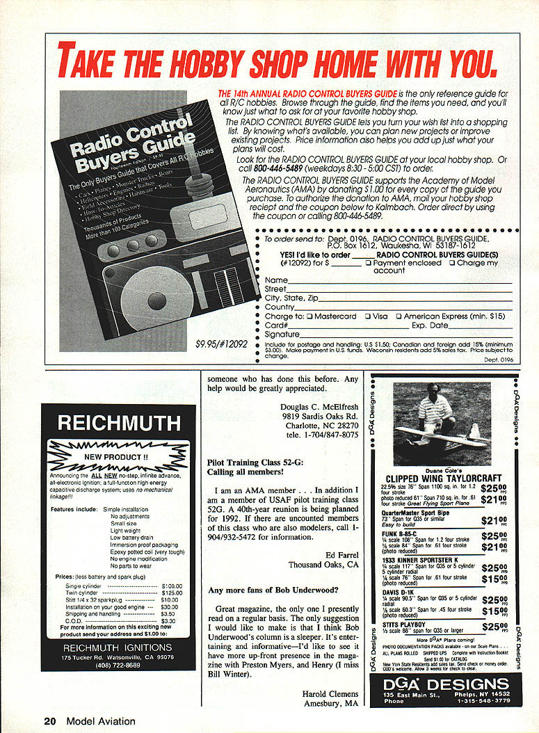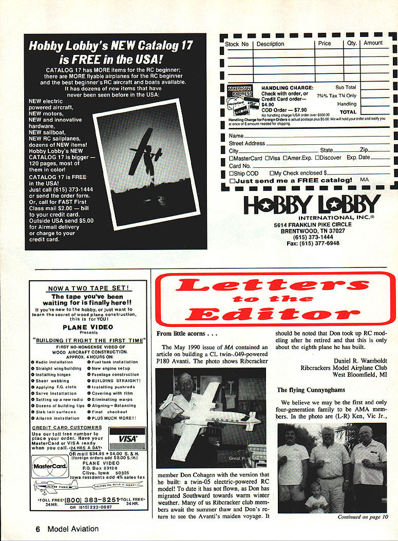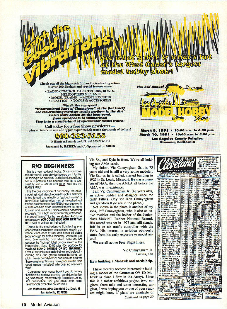 Stock No DescriptionPriceQty Amount F II $490Handling IERICAJJHANDLING CHARGE Check order it Card order Handing cha gefo Foreign Orders actual postage plus $500 will COD Order No hanclliog charge/USA order over 550000TOTAL hold porrorder notify o ceo Samoa needed shipping Sub Total 73/% Tax TN Only El NameI Street Address _________________________________________ CityState.ZipI MasterCard i2Visa EIAmerExp ElDiscover Exp Date Card No riShIp CODLIMy Check enclosed $I ElJust send FREE catalog MA hmmmmmm HOWW Bg INTERNATIONAL INC 5614 FRANKLIN PIKE CIRCLE BRENTWOOD TN 37027 615 373-1444 Fax 615 377-6948 JEp aN N little ace.should noted Don took up RC mod eling after retired May 1990 issue MA contained anabout eighth plane has built article building CL twin-049-powered P180 Avanti photo shows RibcrackerDaniel R Wamboldt Ribcrackers Model Airplane Club West Bloomfield MI flying Cunnynghams believe may first four-generation family AMA mem bers photo L-R Ken Vic Jr member Don Cohagen version built twin-05 electric-powered RC model date has flown Don has migrated Southward towards warm winter weather us Ribcracker club mem bers await summer thaw Dons re turn see Avantis maiden voyage 6 Model Aviation NOWATWO TAPE SET ta youve boon waiting isfinallyherell youre new hobby juat want earn aecret of wood plane conatruction thin forYOU PLANE VIDEO Free enfe BUILDING IT RIGHT THE FIRST TIME FIRST NO-NONSENSE VIDEO OF WOOD AIRCRAFT CONSTRUCTION APPROX 4 HOURS ON o Radio insfalfaf ion 0 Fuef tank insfaifaf ion o Straight wing buliding 0 New engine setup o installing hinges 0 Fuselage consfructlon OShear webbing OBUiLDiNG STRAIGHT @Appiyiflg FG cioth 0 instaifing pushrods o Servo insfallat ion 0 Conering film o Sefting up new radio 0 Efiminating warps Dozens building fips 0 Afigning Bafanoing o Siab fail surfaces 0 Final checkout OAf leron instailat ion OPLUS MUCH MORE' CREDIT CARD CUSTOMERS Uae toll free number piace order Have MasterCard VISA ready calI.24HR5 DAY OR mati $3495 S & H foreign orders add $800 S/HI PLANE VIDEO MasterCardPo Box 23128 Clive Iowa 50325 Iowa residents add 4% gales tax vs hIEI-PI5'0 IT 505511 TOLL FREEI800I 38382 51TOLL FREE 24HR24 HR OR 15151223-0897 Continued page Check out high-tech fun hot-wheeling action over 200 dIsplays special feature areas RADIO CONTROL CARS TRUCKS BOAIS HELICOPThRS & PLANES MODEL TRAINS e MODEL ROCKETS PLASTICS S & ACCESSORIES Watch 31w tep Intarna31wet Race ef Cbanapewa etUw jlat 3IWcIII See cwcnshtwaq umm8Sa UwcRfjI31hWm its 31w dittI CScb uv ec11enbeat pend pedbate tiP sbuwIvws1 Step fiatiP uwnderEmwsd ef epactacwlar medal tiwits Call today free Show newsletter plus chance wrn five super models worth thousands dollars Illinois outside US cBll 708299-3131 Sponsored RCHTA Co-Spussored MEJA Vic Sr Kyle front hold ing AMA cards father Vic Cunnyngham Sr 73 years old still very active modeler Vic Sr called started building 1927 St Louis Missouri mem ber NAA AMLA before AMA existence am Vic Cunnyngham Jr 48 years old active builder designer since early Fifties son Ken Cunnyngham grandson Kyle photo shown photo another sons Jeff Cunnyngham also ac tive modeler holder Juniorclass Mulvihill Rubber National Record record set 1977 still stands Jeff air traffic controller FAA interest aviation obviously came early exposure model air craft active Free Flight fliers Vic Cunnyngham Jr Covina CA Hes building Mohawk needs help have recently become interested build ing model Grumman OV-lD Mo hawk plane flew Army Since rather ambitious project two en gines three tails some interesting gles hoping read ers might know plans available Continued page 20 OCALE OF PLANS B. 50 ASEEEVIATEI2 56145 31 foRay COIOOC taco 10 Vooght CorO F4U 15 Coo JN4D Jenny 27 LinAborgo 621211 29 Waco Top0o-6IioR 36 Wootlrd Lyoacder 35 SooN 046A 060 29 Booing 100 Sport 33 Oilo Tolmntor 39 LOck 39 Cor P36A Fighto 25 Vgi Corn 0201/4 38 Coo Cat1,a P8050 19 Conies NC4 17 Fokkoc 07 Fir 31 Baylco GeeBoo 13 SoporrioO 266 36 GroIn GoifhaEk 33 Lock Electra li 43 0000 AVenger TBP 42 Boo 6176 FlyPort 38 NA Mitchell 625 34 BMcciCaoiolEC72 37 Con Navy SO3C-l 25 CEacOO 631-1 42 34 Doog Tranop DC3 33 Coot NOE6 P6E 32 Doolittlo 6B4111 31 Boo P46344 P126 32 Sprild BoilDog 32 Honord 1688160 34 Turner 1618 Racer 35 480w 880 86Iligar 33 Boo P26A 35 SEloooo T 42D8l8oaqoito6006 37 StInern, PTi 43 B 616 Widow F65 30 TA3IS Rake Ton13 42CNoildivr16218 26 Ford ToiooEr bAT 31BaIIaocO Air Boo 33Goon J2F Dock 27CSehawk P711 26816 Raphlb 838 16NP go 0400 BOab 31LirlEy LSlrioo 31Howard BacPote 31 C Sparhok P912 33 Aerorca 13 Opt 38 Goroorn Poeco Sp 03 ljrioht Filer O cIA ori o-c-o 30 GP 3 l/24ST l/l6SZ 1/8 ST 1/6 3Z 116S2 2232032433266r344 1 i32438 203203032660 345W" 213183232465 338 864352 153i434$2469334 9l348~ 153142232045$3460348445362 253183732475 233243403326O3A6R~- 1531632432445336t6033Sj9o3 9 303304533890362120375. 2731939 32678 5451 1843152832056 334~I12356 18 520273285444r72o 083 52 348 78 360104 74w 62436694389 04 49 14 3122 l316c33O 11431217431435$32 4 344 70 56 15310223134413326 60 38 89 52 14431221431843338 SCALE FLAB 273256133235338 Lock Eloc 34 3032840 338803 2 Ford 3M 4426 513407735I Boo 6176 36 36433755 352I 825 362 1S431523 3228b4$3Sj 1. N 326 62 1931828432457336 StIr Tn 42 l1315164 20 3 HodlyPo o 6 4734071$50oo 6 1543152343224Th344 1243171843223733549 467458 15 316234320444332594 448958 1343162032040 $32 5 8 10431215431531 326 62 45 1331219431639328 5 340 78352 16 31523420473326434494354 1431521 32042332 63345 84358 20431631432562345 82353 23 066 37432441 33581 35008365 1631824432249 338w9P3 1441321 1843336~ 860327 33004049S099375~ 25 253 374 $60 38 33857 $4814 372* 32 32248 33096 352 19 28293401583551 78368 154318234324I47r3380850I965 3633454 34210 963 5034575356" 21316314322$3o33 10 3121531530330 "4{60342 1243151932238333 i551348i76358 1831027 314534326 107348 124316 8432037 336 i49r343l7443s6 9040O904094cOiflO BEFOEE ORDEEIN6 88151114138406016315 00PLANS AVAILABLE AT ONE DOLLAR UNDER 1424 SIZE 81 LOBE TO A