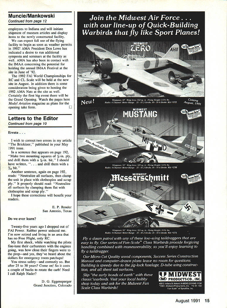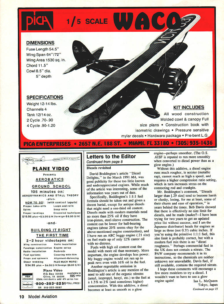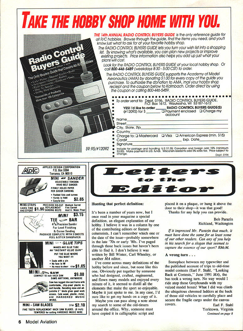 W APPLIED DESIGN CORPORATION PO Box 3384 Torrance CA oio MINI m SANDER ADJUSTABLE TENSION HAND BELT SANDER FIRMLY HOLDS PAPER FOB EASIER SANDING Padded lIeu curve Handy Held Eanyla Use $28g MINI-STRIPS PRECISION DIE-CUT Medium Garnet Fine Garnet SAVES TIME AssId Water Prnnt MINI $315 TEE 4MPrecision Sander Level Finishing & Corner Sanding PACKAGE COMPLETE WITH 3 SHEETS PEEL & STICK SANDPAPER MINI TIPS MAKES ANY GLUE TUBE INSTANT GLUE GUN PUT THE GLUE WHERE YOU WANT IT Sails pin Na Inns Ml • Na mesa le clean 4 lerSi 05 $900 COMPACT 10 inch HACK SAW SAWS ANYTHING ANYWHERE Saw has ragged dle-canl Irame camlarlable chip-preal plastic Sert handle Receding anne ad instable B blade given Reed mark access Cats waod plastic metal HARDENED MUSIC WIRE ~ 1 U ing perfect definition Its number years now once read magazine special definition elegant explanation hobby believe column contributing editors feature columnists cant remember date issueprobably somewhere late 70s early 80s Ive paged through back issues havent able find dont believe written Bill Winter Carl Wheeley another MA editor Ive come across definitions hobby before since like Obviously put together someone designed crafted engineered flown models enjoyed minute it seemed distill elements make sport enjoyable Maybe just spoke case Id sure like get hands copy Maybe can pass along note about search some old-timers around office someone must have copied calligraphic script placed plaque hung above door shopit good Thanks help can provide Bob Parazin Richland Washington impressed Mr Parazin much must have done same least some other readers Can help search slogan seemed capture essence sport RMcM wrong turn. Someplace between typewriter published account trips old-time model contests Earl F Stahl Looking Back Contests June 1991 MA bus took wrong turn No way would ride atop Greyhounds valued model boxes What did climb ubiquitous chromed ladders back old vehicles carefully place secure fragile cargo under canvas coversEarl F Stahl Yorktown Virginia Continued page 8 6 Model Aviation TAKE THE HOBBY SHOP HOME WITH YOUM THE 14th ANNUAL RADIO CONTROL BUYERS GUIDE reference guide oil R/C hobbies Browse through guide find items need ond youll know]ust whot osk fovorite hobby shop RADIO CONTROL BUYERS GUIDE lets turn wish list o shopping list knowing whots ovoiloble con plon new projects improve existing projects Price informotion olso helps odd up just whot plons will cost Look RADIO CONTROL BUYERS GUIDE locol hobby shop coIl 800-446-5489 weekdoys 830 500 CST order RADIO CONTROL BUYERS GUIDE supports Acodemy Model Aeronoutics AMA donoting $100 copy guide purchose outhorize donotion AMA moil hobby shop reciept ond coupon below Koimboch Order direct using coupon coiling 800-446-5489 .eeOOO .egeeeeO .OO@OOOOOOSSSSOe order send Dept 0196 RADIO CONTROL BUYERS GUIDE PO Box 1612 WaukeshaWI 53187-1612 YES Id like order _____ RADIO CONTROL BUYERS GUIDES #12092 $ ______ ent enclosed ge account Name_______________________________________________ Street______________________________________________________[v33][b22681205152910410]] City State Zip Country Charge ercard ican Express mm $15 Card#________________________ EXP Date_____________ Signature Include postage handling US $150 Canadian foreign add 15% mInimum $3Xfl Make payment US funds Wisconsin residents add 5% sales tax Price subject ta changeDept 0196 MINI SAW BLADES 3lar $210 FINE TOOTH REPLACEMENT HACK SAW BLADES 6 inch TEMPERED lar calling HARDENED MUSIC WIRE Letters Editor Continued page 6 way really w. find myself puzzled letter Joshua Teague column May issue dont know what subject letter refers might have first thought stating Corsair entered service British 1944 goes write that date months before planes put active duty US Navy dont know what Mr Teague might have seen seen can tell him Corsair entered service Marinesspecifically VMF-124 squadronon February 12 1943 Guadalcanal As Operations NCOIC VMF-221 responsible pilot aircraft engines propeller logs received Corsairs Espiritu Santo May 19 1943 Unless Mr Teague feels Marines should considered part US Navy clearly incorrect can truthfully state Espiritu VMF-124 squadron VMF-22 1 got Corsairs served both squadrons Guadalcanal Russells 1943 Corsairs flown information can verified page 134 Robert Sherrods History Marine Corps Aviation World War II James Yocum Rancho Cordova California Just completed winter project Its Pica Enterprises kit A-scale Cessna powered 0S 120 four-stroke radio Airtronics six-channel FM Im hoping lot flights belong Delaware RC Club has over 100 active members anxious spring season young lady picture daughter Janice Bob Cooper Newark Delaware Custom Graphics corate model stars circles triangles club logos scale manufacturers insignia K name itl Peel stick ramove masking its K doneAMPGtaphlca prespaced alignment assured costs littlel Try us K AMA number combination 10 letters K and numbers computer cut 2 high Iblack whitel ppd introductory price $295 K printed information send *100 p&h K dont delay inquire now have information need hi Call write today -K KAMP Inc Graphics Dept MA PO Box 793K DeerParkNY11729 516363-5205 NYS Residents add sales tenK Corsairs Joshua Teagues letter May issue has puzzled apparently thinks said letter editor December issue Royal Navy no Corsairs didnt careful reading letter will bear out subject entire letter collection old aircraft Duxford subject particular paragraph presence F4Us Duxford should think statement Ive seen F4U Royal Navy markings would interpreted meaning Duxford necessity appending qualifying phrase am quite familiar Royal Navys use Corsair 2000-plus VC gained thereon clipped tips introduced Corsair II Corsair same rounded tips used US Navy USN also its F4Us operational September 1943 before Royal Navys first use fighter VD-17 flew New Georgia beginning month Royal Navy used off carriers before did Are clear now Charles V ODonnell Bloomington Illinois Continued page 10 AT LAST Z-BES