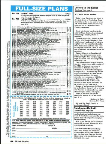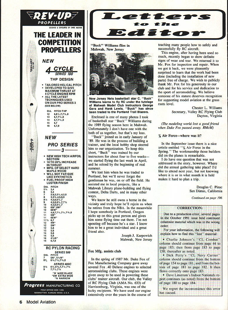 NEW ES 100 THP DESIGN TAILORED HELICAL PITCH DEVELOPEDTOGIVE MAXIMUM THRUST AT 4 CYCLE ENGINE RPM ALLTHELATEST TECHNIQUES USED ON OUR PRO SERIES 3 SEE BELOW DIAPITCH THP 1266/2778 136778 14B778 1561 16618 PRO SERIES 3 NEW HIGH TECH AIRFOIL SECTION 10T020%INCREASE IN THRUST MFG OF SELECT HARD MAPLE WOOD WILL NOT FATIGUE LIKE SYNTHETICS FUEL PROOF HIGH LUSTER FINISH DIAPITCH 53/i34 634 72833456 8334568 845687 94566A77 104566A7 106W8W 106EW 1146774778 ii 5W ii 6EW 11 67 12 4W 12 5W 12 56 13 56 14 56 15 56 16 4N 16 618 RC PYLON RACING SERIES 500 DIA PITCH 1 5N 5%N 8I 6778 SERIES 400C 8 66777/ 9 77A7/ W WIDE BLADE EW EXTRA WIDE M hiAAAAW r x Nm Williams flies Mahwah New Jersey New Jersey Nets basketball star C Buck Williams learns fly RC under tutelage Mahwah Model Club instructors George Gera Hank Lewis Buck has since traded Portland Trail Blazers Enclosed photos took basketball star Buck Williams during 1989 flying season Mahwah Unfortunately dont have both us together thats loss Buck joined us early January 89 process building trainer local hobby shop steered him organization keep short Buck trained instructors about four five weeks started flying last week April soloed beginning real summer lost him traded Portland well never forget gentleman off field assisted local projects like Mahwah Library plane-building flying contest Delta Darts other ways know still owns home vicinity truly hope hell rejoin us retires NBA meanwhile hope somebody Portland Oregon picks up great person gives him some flying time out Im spouting off because hes star know him great individual great friend also Joseph J Karpowich Mahwah New Jersey Fox Mfg assists club spring 1987 Mr Duke Fox Fox Manufacturing Company gave away several Fox 40 Deluxe engines selected aeromodeling clubs engines given away used powering clubs trainer aircraft club Valley RC Flying Club AMA No 633 Harrisonburg Virginia lucky recipients have used engine extensively over years course teaching people safely successfully fly RC aircraft engine after having used much recently began show definite signs wear tear returned Mr Fox inspection repair got back pleasantly surprised learn work done including installation new parts free charge wish publicly thank Mr Fox generosity club service dedication sport aeromodeling believe someone stature deserves recognition supporting model aviation grass roots level Chester L Williams Secretary Valley RC Flying Club Dayton Virginia modeling world lost good friend Duke Fox passed away RMcM Air Forcewhere September issue nice article entitled Force Spring workmanship builders did planes remarkable have question addressed story however did annual gathering take place Id like attend next year knowing what month held makes hard plan trip Douglas C Pizac San Dimas California Continued page 196 CORRECTION production error several pares Due October order information following will explain find lost material Charlie Johnsons CL Combat column should continue page 44 page 183 page 183 page 158 thereafter noted Dick Perrys CL Navy Carrier~ column should continue bottom page 154 page 181 bot tom page 181 page 182 flows correctly onto page 183 Dave Linstrums Indoor Nationals re port continues noted bottom page 180 page 184 regret inconvenience error has caused 6 Model Aviation THE LEADER IN COMPETITION PROPELLERS p p I No 701 Jumpin Geo$725 AC gigh performance Sportster especially designed fun fly events Weighs 3-lb spans 485-in 40-45 power No 702 Heinkel HE 18$200 FF Scale model advanced 1924 German monoplane trainer HiLine Mni-6 geared electric motor powered three 100 mil batteries Weighs 121 grams spans 28-in No 447112A Miss America AC Old-Timer WA Texaco model 009 glow 2-channels$650 No 538Slmitar SlowMotion 15 AC Toilleos tying wing 15 engines spano 60 onex 3-ch AC$350 No 578Schweizer 1-26B AC Goarter-ocale Sailplane spans 125 0 Two plan olleeto$1475 No 581Gee Sea Model Y AC Golden Age Racer opaxo 7215 scole 6t power plan oheens$1175 No 588Mariah AC Slope-Soadog Sailplane opano 4lio ooeo 2 AC channeloS425 No 583TayIorcraft RC Sport Susie ligbtplane boildo standard 2-plocer clipped-wing air show slonter Spoos either 704 58/a 35140 two-otmke 40/48 foor-otinke engine Two plan sheets no docomentation$1000 No 598Coronet 150 AC-Assist Old-Timer enlarged 150% spano 72 uses 40size 4-slroke/30-oize 2-stmke$850 No 603Sparrow Hawk P-30 FF Competition abhor-power plane won t7 Nats Spans 30 in$225 No 619Keith Rider R4 FF Scale Golden Age racer robber powor spans 16 in$300 No 620Gimlet 40 AC Sport/Pattem plane spans Ot 40/50 engine 2 sheets$1100 No 624Keleher Leric AC Qoarter-scale homeboilt spans 00 60/00 4-stroke power 2 plan sheets no doc$1100 No 626Sweepee AC Sport/Pattem canards forward-swept wing spoos 64 uses 40 power 2 plan sheets$1300 No 628Prime Cut AC Sport/Aembatic plane spans 00 uses Quadra 35/40-size power Two plan sheetsS1300 No 630Original Fly Baby AC Old-Timer spans 72 in. ones 19/25 2-cycle 40 4-cycle power 2 plan sheets$1150 No 641LII Ole Reliable AC Old-Timer sport tier spans 50% WA enginesS575 No 644Bellanca columbia AC Schoolyard Scale tar 2 AC channels WA engine Wingspan 46 in$575 No 646winter Itawk FF Robber-power Coupe dHiner competition plane spans 47 in$375 No 65047/88 AC Special AC Aembatic sport plane 40 power spans 61 3 plan sheetsS1075 No 652Der Fledennaus AC Law-wing sport plane 20/25 power spans 55 inS675 No 654Tamacat AC Trainer/spsrtster styled like P14 spans 00 40/61 power Fnor plan sheets$1525 No BBSAetmetar PF AMA Class A/B Gas plane spans 07 uses 325/350cc power$800 No 657Super Squire AC Trainer 35140 2-stroke 53 4-stroke power spans 5614 in$750 No 659Boom Box FF Wakefield Robber compe00on plane spans 54 inS400 No 661Embry-Omatic FF Embryo Endurance robber-pawer plane spans 20 in$200 No 663Pea Patch AC Sportster spans 60 uses 40150 4-stroke power 2 plan sheetsS000 No 684Stuka Stunt CL WA Stunter semiscale spans 37rA inS500 No 665Conacientious Oblactor FF Mulnibill Rubber competition plane spans 