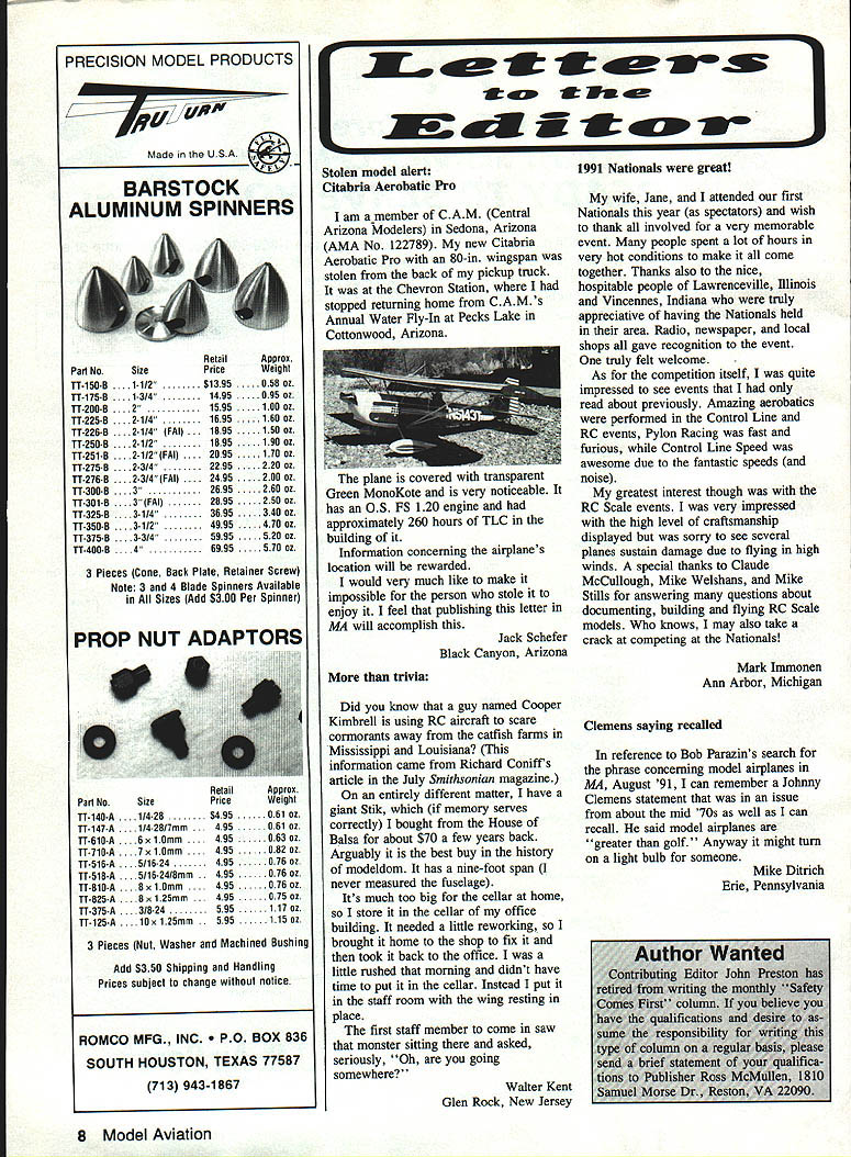 PRECISION MODEL PRODUCTS MadeintheUSA BARSTOCK ALUMINUM SPINNERS Pan NoSize TI-175-B 14 11-200-B TT-225-B /4 TI-226-B . 2114 FAt rT-250-B 21/2 T1-251-B ..2-1/2 FAIl 11275-B . 2-3/4 11-276-B2314 FAt .. TI-300-B 3 11-301-B3 FAt TI-325-B /4 TT-350-B . 31/2 11-375-B /4 TI-400-B 4 RetailApprox PriceWeight 51395058 oz 1495 095 oz 1595 .. 100 oz 1695 .. 160 oz 1895 .. 150 oz 1895 190 oz 2095 .. 170 oz 2295 .. 220 oz 2495200oz 2695260oz 2895250ox 3695340az 4995470oz 5995520oz 6995570ox 3 Pieces Cone Back Plate Retainer Screw Note 3 4 Blade Spinners Available en Sizes Add 53 00 Per Spinner PROP NUT ADAPTORS V Pan NoSize 11-140-A .. 1/4-28 11-147-A .. 1/4-28/7mm . 11-610-A x 10mm 11-710-A .7x 10mm 11-516-A .5/16-24 11-518-A 5/16-24/8mm 11-810-A Bx 10mm TI-825-A . 8 x 125mm 11-375-A 8-24 TT-125-A x 125mm RetailApprox PriceWeight S495061 oz 495061oz 495063ox 495082ox 495076ox 495076oz 495. 076 ox 495.075oz 595. 117 ox 595115 ox 3 Pieces Nut Washer Machined Bushing Add $350 Shipping Handling Prices sublect change notice ROMCO MFG INC OX 836 SOUTH HOUSTON TEXAS 77587 713 943-1867 Na tolen model alert Citabria Aerobatic Pro am member CAM Central Arizona Modelers Sedona Arizona AMA No 122789 new Citabria Aerobatic Pro 80-in wingspan stolen back pickup truck Chevron Station stopped returning home C AM s Annual Water Fly-In Pecks Lake Cottonwood Arizona plane covered transparent Green MonoKote very noticeable has 05 FS 120 engine approximately 260 hours TLC building Information concerning airplanes location will rewarded would very much like make impossible person stole enjoy feel publishing letter MA will accomplish Jack Schefer Black Canyon Arizona trivia Did know guy named Cooper Kimbrell using RC aircraft scare cormorants away catfish farms Mississippi Louisiana information caine Richard Coniffs article July Smithsonian magazine entirely different matter have giant Stik memory serves correctly bought House Balsa about $70 few years back Arguably best buy history modeldom has nine-foot span never measured fuselage Its much too big cellar home store cellar office building needed little reworking brought home shop fix took back office little rushed morning didnt have time put cellar Instead put staff room wing resting place first staff member come saw monster sitting asked seriously Oh going somewhere Walter Kent Glen Rock New Jersey 1991 Nationals great wife Jane attended first Nationals year spectators wish thank involved very memorable event people spent lot hours very hot conditions make come together Thanks also nice hospitable people Lawrenceville Illinois Vincennes Indiana truly appreciative having Nationals held area Radio newspaper local shops gave recognition event truly felt welcome As competition itself quite impressed see events read about previously Amazing aerobatics performed Control Line RC events Pylon Racing fast furious Control Line Speed awesome due fantastic speeds noise greatest interest though RC Scale events very impressed high level craftsmanship displayed sorry see several planes sustain damage due flying high winds special thanks Claude McCullough Mike Weishans Mike Stills answering questions about documenting building flying RC Scale models knows may also take crack competing Nationals Mark Immonen Ann Arbor Michigan Clemens saying recalled reference Bob Parazins search phrase concerning model airplanes MA August 91 can remember Johnny Clemens statement issue about mid 70s well can recall said model airplanes greater golf Anyway might turn light bulb someone Mike Ditrich Erie Pennsylvania 8 Model Aviation
