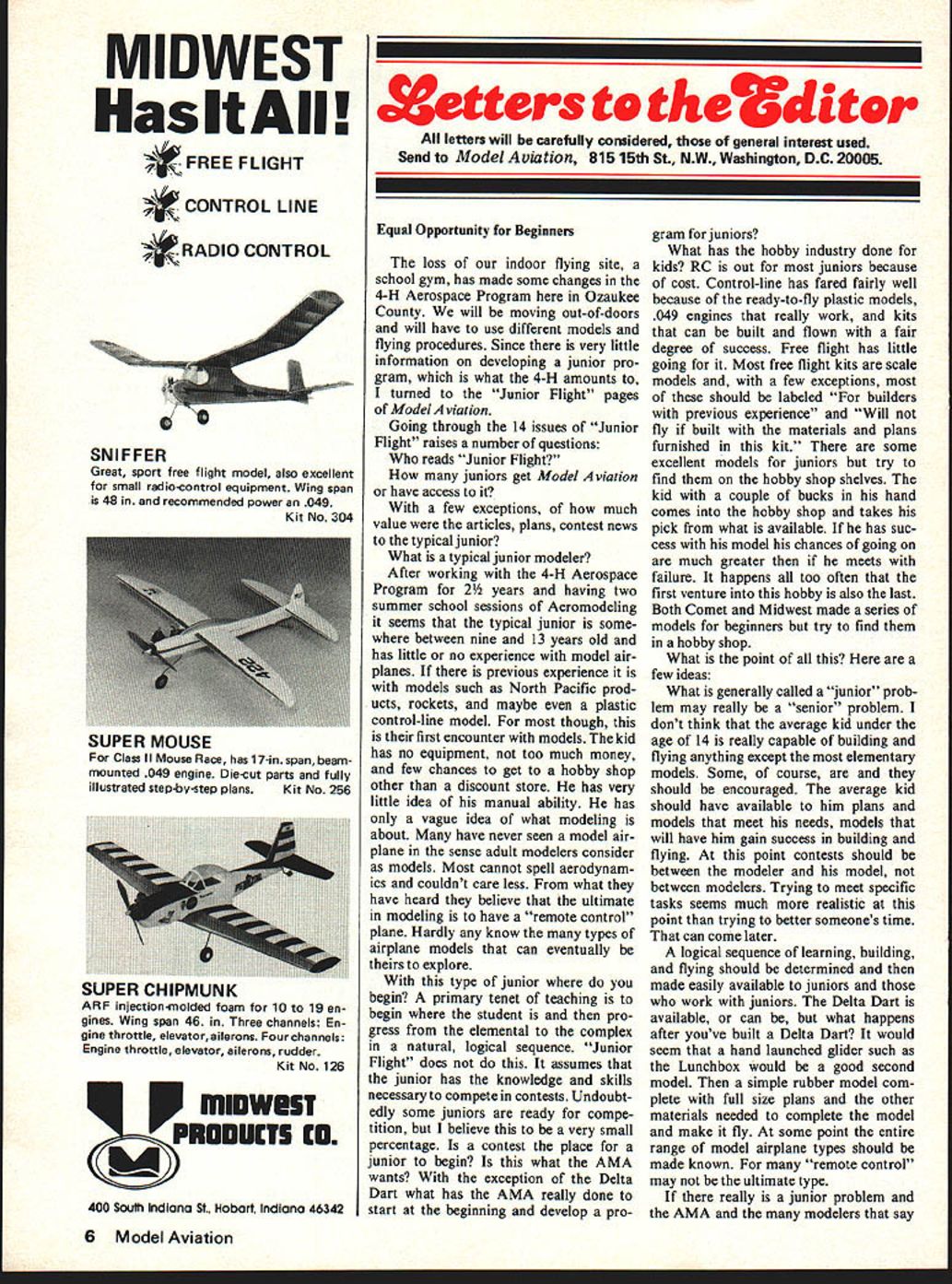 MIDWEST Has ItAll FREE FLIGHT CONTROL LINE RADIO CONTROL SNIFFER Great sport free flight model also excellent small radio-control equipment Wing span 48 recommended power 049 Kit No 304 miowes TI CO 400 Soulti Indiana St Hobart Indiana 46342 Xetters t 5d letters will carefully considered general interest used Send Model Aviation 815 15th St. NW Washington DC 20005 Equal Opportunity Beginners loss indoor flying site school gym has made some changes 4-H Aerospace Program Ozaukee County will moving out-of-doors will have use different models flying procedures Since very little information developing junior pro gram what 4-H amounts turned Junior Flight pages Model vial ion Going through 14 issues Junior Flight raises number questions reads Junior Flight juniors get Model viation have access few exceptions much value articles plans contest news typical junior What typical junior modeler After working 4-H Aerospace Program 2 years having two summer school sessions Aeromodeling seems typical junior some between nine 13 years old has little no experience model air planes previous experience models such North Pacific prod ucts rockets maybe plastic control-line model though first encounter models kid has no equipment too much money few chances get hobby shop other discount store has very little idea manual ability has vague idea what modeling about have never seen model air plane sense adult modelers consider models Most cannot spell aerodynam ics couldnt care less what have heard believe ultimate modeling have remote control plane Hardly know types airplane models can eventually explore type junior begin primary tenet teaching begin student pro gress elemental complex natural logical sequence Junior Flight does assumes junior has knowledge skills necessary compete contests Undoubt edly some juniors ready compe tition believe very small percentage contest place junior begin what AMA wants exception Delta Dart what has AMA really done start beginning develop program juniors What has hobby industry done kids RC out juniors because cost Control-line has fared fairly well because ready-to-fly plastic models 049 engines really work kits can built flown fair degree success Free flight has little going Most free flight kits scale models few exceptions should labeled builders previous experience Will fly built materials plans furnished kit some excellent models juniors try find hobby shop shelves kid couple bucks hand comes hobby shop takes pick what available has suc cess model chances going much greater meets failure happens too often first venture hobby also last Both Comet Midwest made series models beginners try find hobby shop What point few ideas What generally called junior prob lem may really senior problem dont think average kid under age 14 really capable building flying anything except elementary models Some course should encouraged average kid should have available him plans models meet needs models will have him gain success building flying point contests should between modeler model between modelers Trying meet specific tasks seems much realistic point trying better someones time can come later logical sequence learning building flying should determined made easily available juniors work juniors Delta Dart available can what happens after youve built Delta Dart would seem hand launched glider such Lunchbox Would good second model simple rubber model com plete full size plans other materials needed complete model make fly some point entire range model airplane types should made known remote control may ultimate type really junior problem AMA modelers say 6 Model Aviation SUPER MOUSE Class II Mouse Race has 17-in spanbeam mounted 049 engine Die-cut parts fully illustrated step-by-step plans Kit No 256 SUPER CHIPMUNK ARF injection-molded foam 10 19 en gines Wing span 46 Three channels En gine throttle elevator ailerons Four channels Engine throttle elevator ailerons rudder Kit No 126 want something about should something cer tainly enough talent available modelers willing give couple hours 12 15 nights year Try find want put Ed Whitten what doing Junior Flight down doing something feel can done Im sure understand what am talking about because efforts direction editor Junior American Modeler Much what use programs comes pages magazine extremely sorry see become Sport Modeler dropped completely May little push now something can get started Ken Simpson Ken Simpsons comments right can infer quite correctly that--f/after decades activ ity arLswers beginner question remain foggythe beginner problem must monumental Because suitable comment space possible because question important commentary will found months Openers Virtue its Own Reward would very poor workman could acknowledge work others examining current crop illustra tion MA September 1978 felt neces sary praise work Hank Clark have entertained superb cut aways ever since started present style familiar before always wondered until recently picked up magazine 40s think Air Trails saw pictures him Cub same issue MA also carried some excellent construction illustrations Mentor Van Hattum picture worth thousand words tis said case novice such illustrations worth perhaps 2000 Judging initial H drawings also appear ATTENTION Control Line Flyers Fox Cares About Fox Combat Special 1978 Nationals Wins Slow Combat Open 1-Dick Stubblefleld Fox 2-Larry Driscoll Fox 3-Geo Cleveland Fox Fast Combat Jr 1-Tom Fluker Fox 2-Mathis Fox 3-White Fox Fast Combat Sr 2-Bill Maywald Fox 3-Russell Crawford Fox Fast Combat Open 1-Phil Granderson Fox 2-Mike Taliman Fox 3-Bob Mears Fox 4-Karns Fox Congratulations Thanks 8306 TOWEON AVE POAT 806Th ARK 7300 PHONE 60l4UlU6 scramble forthe RC dollar manufacturers have passed control line flyers needs Fox last couple years have upgraded control line motors added new control line products invite inspection tanks control lines bell cranks control handles fuel bulbs fuel line wheels wheel collars other products catalog free aski