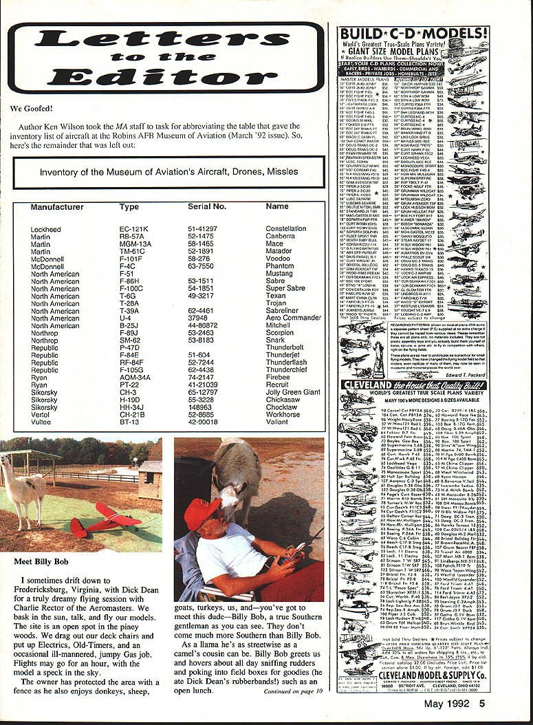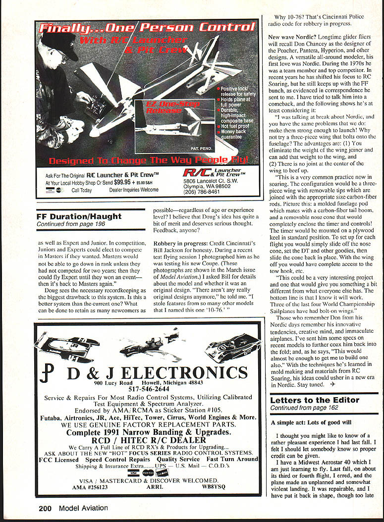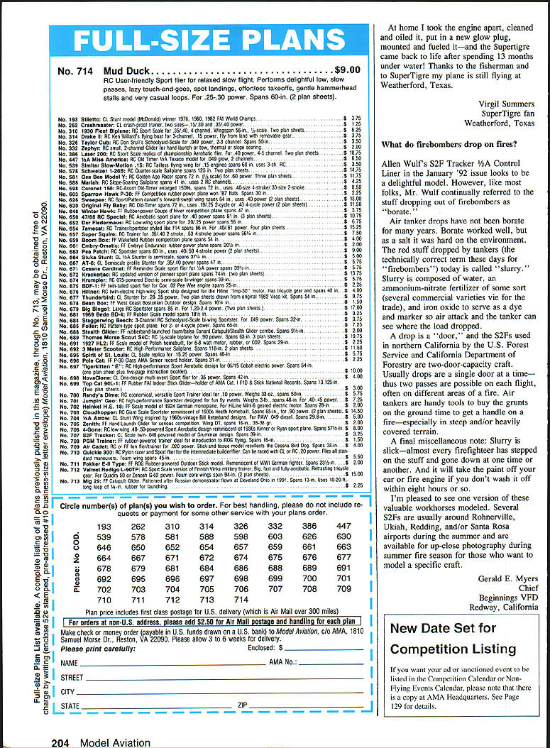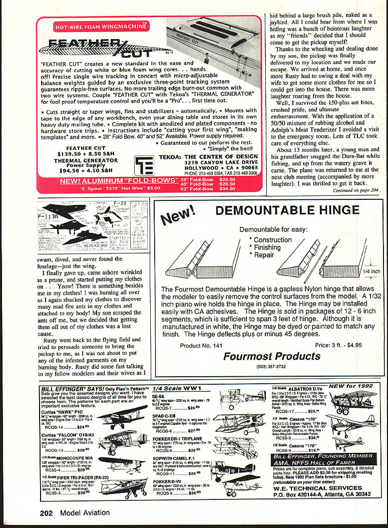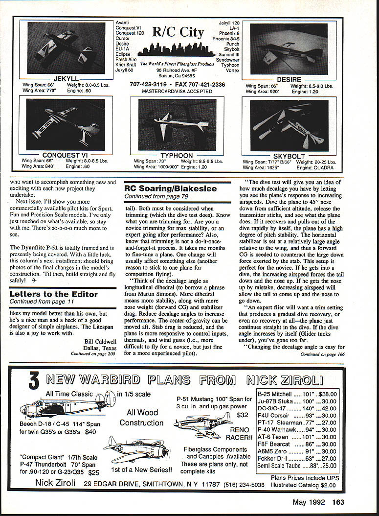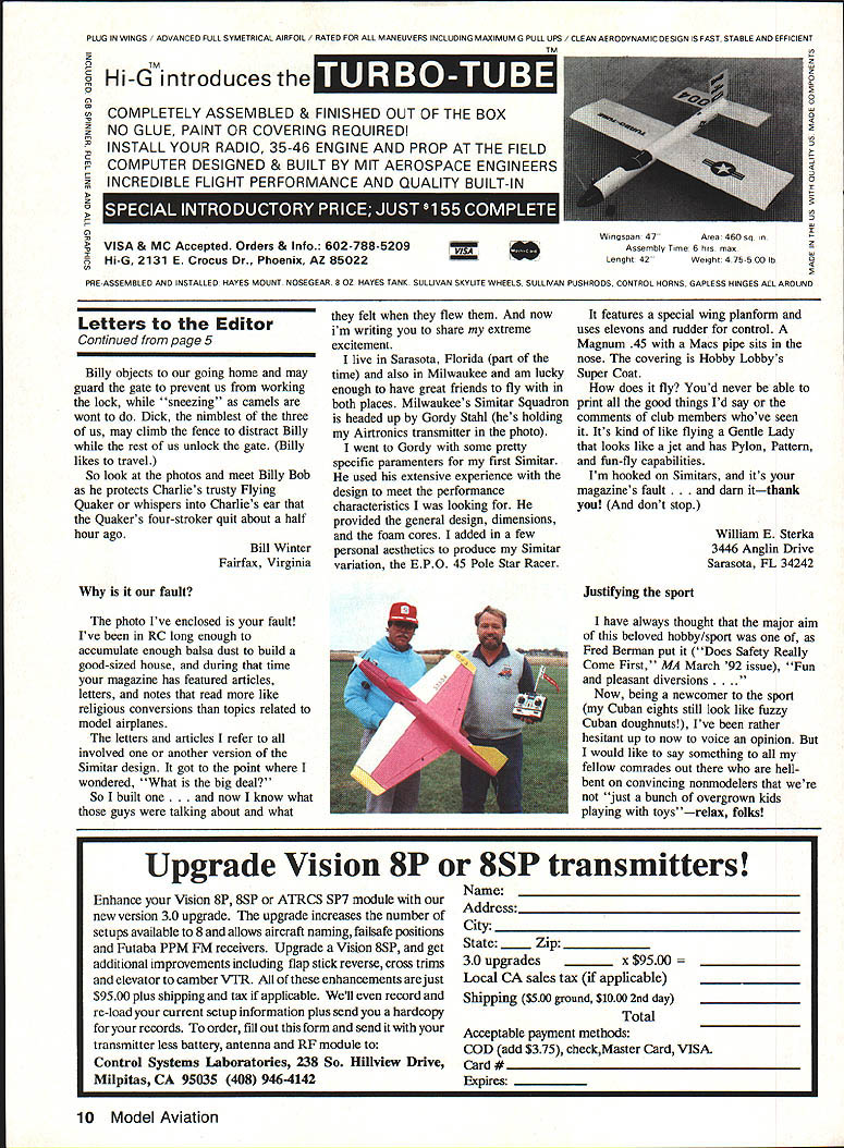 NO OCR TEXT Ct Hi-GintroducestheIhUJIISDhUiI 0 0 COMPLETELY ASSEMBLED & FINISHED OUT OF THE BOX NO GLUE PAINT OR COVERING REQUIRED INSTALL YOUR RADIO 35-46 ENGINE AND PROP AT THE FIELD COMPUTER DESIGNED & BUILT BY MIT AEROSPACE ENGINEERS INCRFflIRI F Fl ICHT PFRFOPMANflF ANfl fli IAI ITV P1111 TJNI z 0 0 VISA & MC Accepted Orders & Info 602-788-5209 Hi-G 2131 E Crocus Dr. Phoenix AZ 85022 PLUG IN WINGS / ADVANCED FULL SYMETRICAL AIRFOIL / RATED FOR ALL MMEUVERS INCLUDING MAXIMUM 0 PULL UPS / CLEAN AERODYNAMIC DESIGN IS FAST STABLE AND EFFICIENT TM0 z z 0 0 0 0 n 0 I Wingspan 47 Aea 460 sq Assembly Time6 hrs mas Lenght 42Weight 475-500 lb PRE-ASSEMELED AND INSTALLED HAYES MOUNT NOSEGEAR 8 OZ HAYES TANK SULUVAN SKYLITE WHEELS SULLIVAN PUSHRODS CONTROL HORNS GAPLESS HINGES ALL AROUND Letters Editor Continued page 5 Billy objects going home may guard gate prevent us working lock sneezing camels wont Dick nimblest three us may climb fence distract Billy rest us unlock gate Billy likes travel So look photos meet Billy Bob protects Charlies trusty Flying Quaker whispers Charlies ear Quakers four-stroker quit about half hour ago Bill Winter Fairfax Virginia felt flew now im writing share extreme excitement live Sarasota Florida part time also Milwaukee am lucky enough have great friends fly both places Milwaukees Simitar Squadron headed up Gordy Stahl hes holding Airtronics transmitter photo went Gordy some pretty specific paramenters first Simitar used extensive experience design meet performance characteristics looking provided general design dimensions foam cores added few personal aesthetics produce Simitar variation EPO 45 Pole Star Racer features special wing planform uses elevons rudder control Magnum 45 Macs pipe sits nose covering Hobby Lobbys Super Coat does fly Youd never able print good things Id say comments club members whove seen Its kind like flying Gentle Lady looks like jet has Pylon Pattern fun-fly capabilities Im hooked Simitars its magazines fault rn itthank dont stop William E Sterka 3446 Anglin Drive Sarasota FL 34242 fault photo Ive enclosed fault Ive RC long enough accumulate enough balsa dust build good-sized house during time magazine has featured articles letters notes read like religious conversions topics related model airplanes letters articles refer involved another version Simitar design got point wondered What big deal So built one. now know what guys talking about what Justifying sport have always thought major aim beloved hobby/sport Fred Berman put Does Safety Really Come First MA March 92 issue Fun pleasant diversions Now being newcomer sport Cuban eights still look like fuzzy Cuban doughnuts Ive rather hesitant up now voice opinion would like say something fellow comrades out hellbent convincing nonmodelers just bunch overgrown kids playing toysrelax folks Upgrade Vision 8P 8SP transmitters Enhance Vision 8P 85P ATRCS SP7 module new version 30 upgrade upgrade increases number setups available 8 allows aircraft naming failsafe positions Futaba PPM FM receivers Upgrade Vision 85P get additional improvements including flap stick reverse cross trims elevator camber VTR enhancements just $9500 plus shipping tax applicable Well record re-load current setup information plus send hardcopy records order fill out form send transmitter less battery antenna RF module Control Systems Laboratories 238 So Hhliview Drive Milpitas CA 95035 408 946-4142 Name City State ____ Zip 30 upgrades ______ x $9500 ________ Local CA sales tax applicable Shipping $500 ground $1000 2nd day Total Acceptable payment methods COD add $375 checkMaster Card VISA Card # Expires 10 Model Aviation Avanti Conquest VI Conquest 120 Cursor Desire EU-iA Eclipse Fresh Aire Krier Kraft Jekyll 60 RIC City EL lull 11116 AJA*Ja Jekyll 120 LA-i Phoenix 8 Phoenix 8/45 Punch ESkybolt Summit Ill Sundowner Worlds Finest Fiberglass Products Typhoon 96 Railroad Ave #FVortex Suisun Ca 94585 707-428-3119 FAX 707-421-2336 MASTERCARDNISA ACCEPTED LAJNUULbI VI Wing Span 66Weigfht 80-85 Lbs Wing Area 840Engine 60 SKYBOLT Wing Span T/77 8/66Weigfht 20-25 Lbs Wing Area 1625Engine QUADRA want accomplish something new exciting new project undertake Next issue Ill show commercially available pilot kits Sport Fun Precision Scale models Ive just touched whats available stay Theres so-o-o-o much see Dynaflite P-51 totally framed presently being covered little luck columns next installment should bring photos final changes models construction Til build straight fly safely Letters Editor Continued page 11 likes model better own hes nice man heck good designer simple airplanes Litespan also joy work Bill Caldwell Dallas Texas Continued page 200 RC SoaringlBlakeslee Continued page 79 tail Both must considered trimming dive test does Know what trimming Are novice trimming max stability expert going after performance Also know trimming do-it-onceand-forget-it process takes months fine-tune plane change will usually affect something else another reason stick plane competition flying Think decalage angle longitudinal dihedral borrow phrase Martin Simons dihedral means stability along nose weight forward CG stabilizer drag Reduce decalage angles increase performance center-of-gravity can moved aft Stab drag reduced plane responsive control inputs thermals wind gusts ie difficult fly novice just fine experienced pilot dive test will give idea much decalage have letting see planes response increasing airspeeds Dive plane 450 nose down sufficient altitude release transmitter sticks see what plane does recovers pulls out dive rapidly itself plane has high degree pitch stability horizontal stabilizer set relatively large angle relative wing thus forward CG needed counteract large down force exerted stab setup perfect novice gets dive increasing airspeed forces tail down nose up gets nose up mistake decreasing airspeed will allow tail come up nose go down An expert flier will want trim setting produces gradual dive recovery no recovery allth