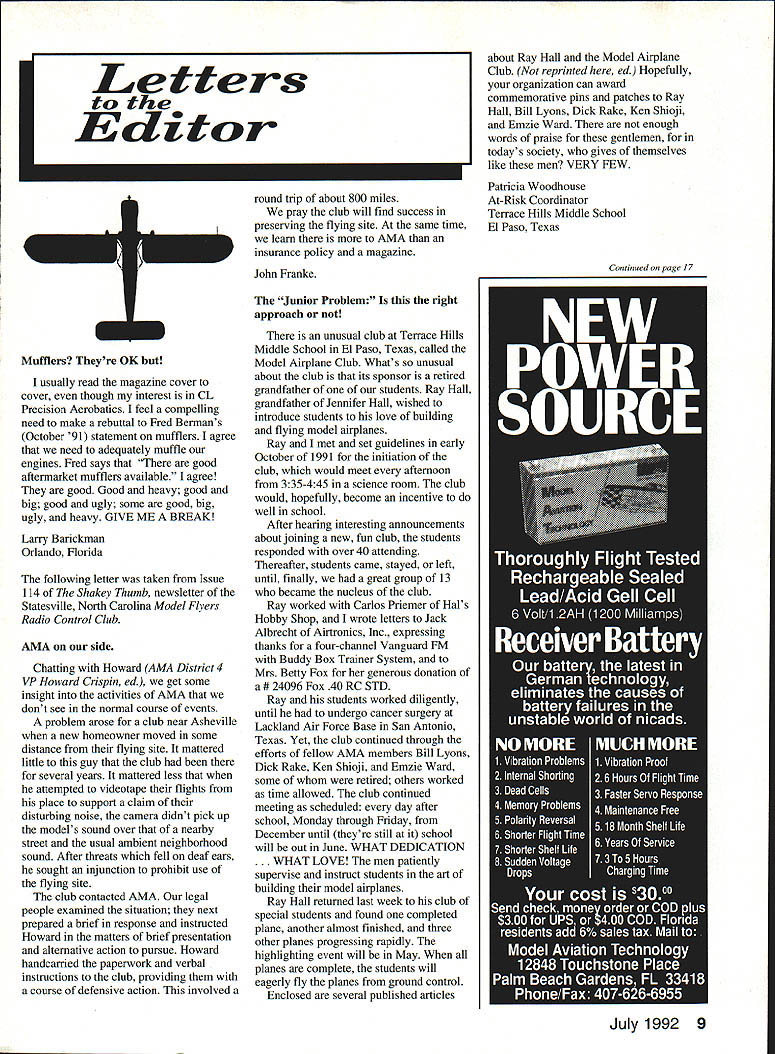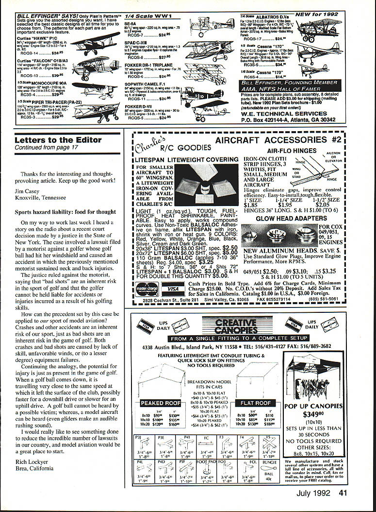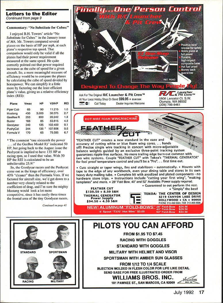 Letters Editor about Ray Hall Model Airplane Club reprinted ed Hopefully organization can award commemorative pins patches Ray Hall Bill Lyons Dick Rake Ken Shioji Emzie Ward enough words praise gentlemen todays society gives themselves like men VERY FEW usually read magazine cover cover though interest CL Precision Aerobatics feel compelling need make rebuttal Fred Bermans October 91 statement mufflers agree need adequately muffle engines Fred says good aftermarket mufflers available agree good Good heavy good big good ugly some good big ugly heavy GIVE ME BREAK Larry Barickman Orlando Florida following letter taken Issue 114 Shakey Thumb newsletter Statesville North Carolina Model Flyers Radio Control Club AMA side Chatting Howard AMA District 4 VP Howard Crispin ed get some insight activities AMA dont see normal course events problem arose club near Asheville new homeowner moved some distance flying site mattered little guy club several years mattered less attempted videotape flights place support claim disturbing noise camera didnt pick up models sound over nearby street usual ambient neighborhood sound After threats fell deaf ears sought injunction prohibit use flying site club contacted AMA legal people examined situation next prepared brief response instructed Howard matters brief presentation alternative action pursue Howard handcarried paperwork verbal instructions club providing course defensive action involved round trip about 800 miles pray club will find success preserving flying site same time learn AMA insurance policy magazine John Franke Junior Problem right approach unusual club Terrace Hills Middle School El Paso Texas called Model Airplane Club Whats unusual about club its sponsor retired grandfather students Ray Hall grandfather Jennifer Hall wished introduce students love building flying model airplanes Ray met set guidelines early October 1991 initiation club would meet afternoon 335-445 science room club would hopefully become incentive well school After hearing interesting announcements about joining new fun club students responded over 40 attending Thereafter students came stayed left until finally great group 13 became nucleus club Ray worked Carlos Priemer Hals Hobby Shop wrote letters Jack Albrecht Airtronics Inc expressing thanks four-channel Vanguard FM Buddy Box Trainer System Mrs Betty Fox generous donation # 24096 Fox 40 RC STD Ray students worked diligently until undergo cancer surgery Lackland Air Force Base San Antonio Texas Yet club continued through efforts fellow AMA members Bill Lyons Dick Rake Ken Shioji Emzie Ward some retired others worked time allowed club continued meeting scheduled day after school Monday through Friday December until theyre still school will out June WHAT DEDICATION WHAT LOVE men patiently supervise instruct students art building model airplanes Ray Hall returned last week club special students found completed plane another almost finished three other planes progressing rapidly highlighting event will May planes complete students will eagerly fly planes ground control Enclosed several published articles July1992 9 Patricia Woodhouse At-Risk Coordinator Terrace Hills Middle School El Paso Texas Mufflers Theyre OK Continued page 17 Letters Editor Continued page 9 Commentary No Substitute Cubes enjoyed BH Towers article No Substitute Cubes January issue MA Mr Towers compared several planes basis HP per mph planes respective top speed comparison would valid planes power requirement measured same speed quite correctly pointed out power required increases cube speed given aircraft So meaningful measure efficiency would compare planes calculating cube speed divided horsepower can simplify little factoring out least efficient planes value giving us relative efficiency index REI PlaneVmaxHPV3/HPREI Piper Cub Mustang GeeBee R Buster Goodyear PushyCat Formula V 65 450 253 166 240 244 170 90 3000 800 85 135 135 65 11215 30375 20242 53815 102400 107606 75585 10 27 18 48 91 96 67 * The comment sixteenth power GeeBee Model R indicated 50 HP going back August issue Pushycat implied have 135 HP racing rpm used value 50 HP REI calculated unbelievable 259 So Goodyear racers Pushycat come out kings efficiency over 40% cleaner Formula Vees factored aircraft size wed get down number very closely related coefficient drag Im sure mighty Mustang would look lot competitive since has easily three times frontal area tiny Goodyear racers Continued page 4] Ask Original R/E Ldunuher & Pit ErewTMIfLi&urlIIq Local Hobby Shop Send $9995 5&H5806 Lancelot Ct SW tCall TodayDealer Inquiries WelcomeOlympia WA 98502 206 786-8461 FEATHER CUT creates new standard ease accuracy cutting white blue foam wing cores ds offl Precise single wire tracking concert micro-adjustable balance weights guided exclusive three-point tracking system guarantees ripple-free surfaces No trailing edge burn-out common two wire systems Couple FEATHER CUT Tekoas THERMAL GENERATOR fool proof temperature control youll Pro t time out Cuts straight taper wings fins stabilizers matically ts tape edge workbench dining table stores its own heavy duty mailing tube lete kit anodized plated components no hardware store trips ructions include cutting first wing making templates dd Bow 40 52 Available Power supply required Guaranteed out perform rest Simply bestl TEKOA THE CENTER OF DESIGN 3219 CANYON LAKE DRIVE HOLLVWflflfl GAOR DUtVII July1992 17 FEATHER CUT $13950 S&H THERMAL GENERATOR Power Supply $9450 S&HI STANDARDSPORTSMAN PILOTS YOU CAN AFFORD FROM $195 TO $745 RACING WITH GOGGLES STANDARD WITH GOGGLES MILITARY WITH HELMET AND VISOR SPORTSMAN WITH AMBER SUN GLASSES FROM 1112 TO 1I4 SCALE INJECTION MOLDED IN FLESH COLOR FOR LIFE LIKE DETAIL SEND SASE FOR FREE ILLUSTRATED ORDER FROM WILLIAMS BROS INC 181 PAWNEE ST SAN MARCOS CA 92069 Letters Editor Continued page 17 Thanks interesting thoughtprovoking article Keep up good work Jim Casey Knoxville Tennessee Sports hazard liability food thought wa