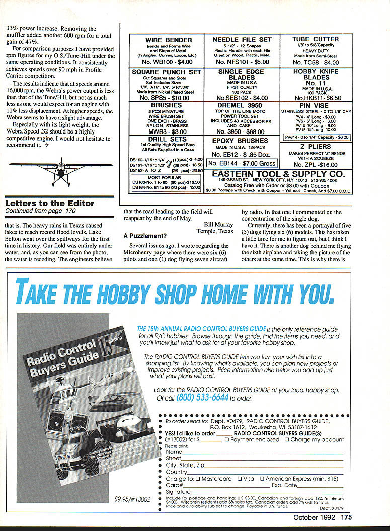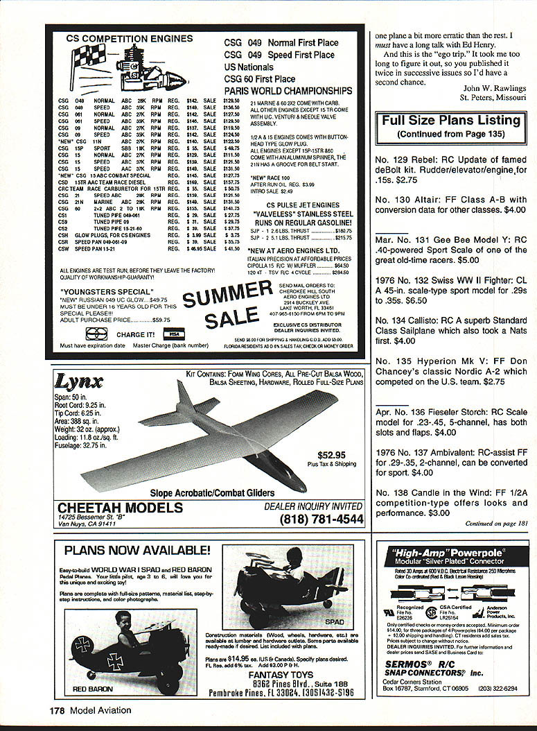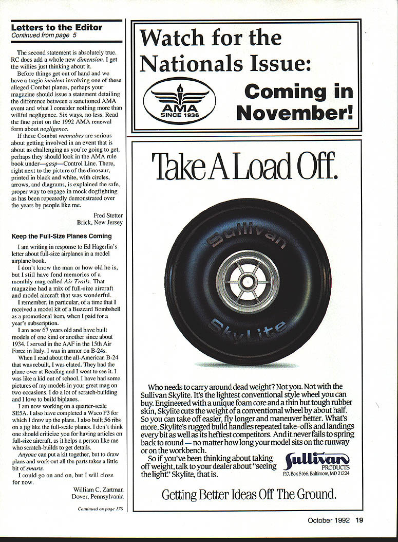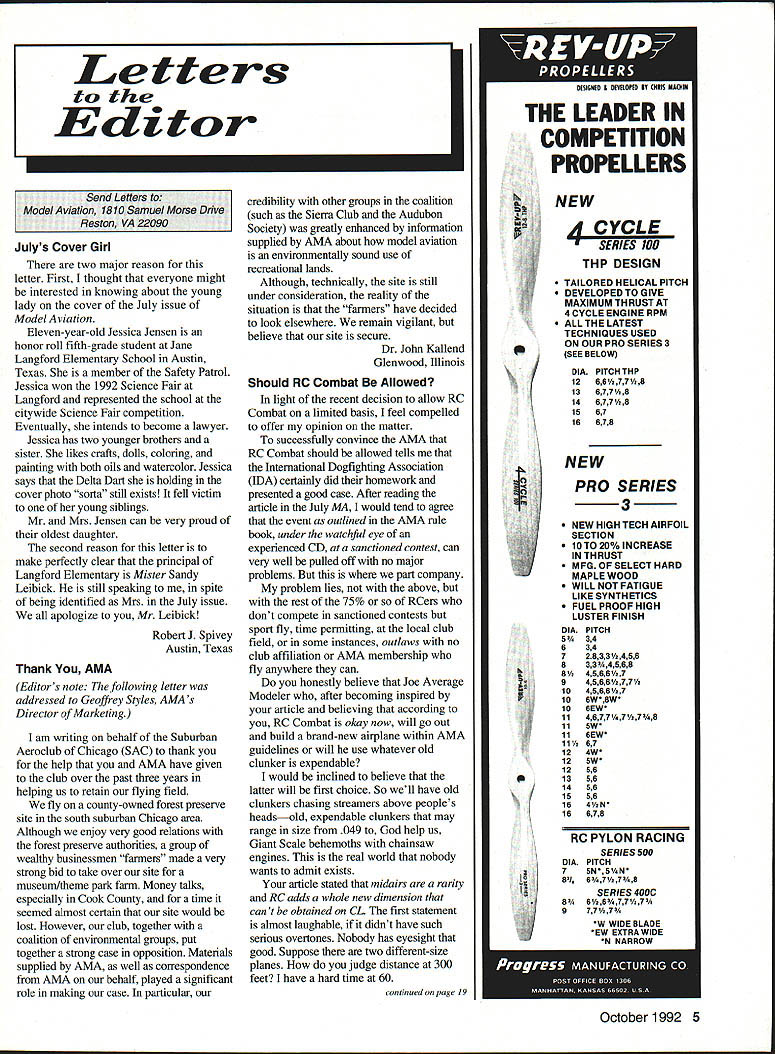 Letters toth Editor Send Letters Model Aviation 1810 Samuel Morse Drive Reston VA 22090 Julys Cover Girl two major reason letter First thought everyone might interested knowing about young lady cover July issue Model Aviation Eleven-year-old Jessica Jensen honor roll fifth-grade student Jane Langford Elementary School Austin Texas member Safety Patrol Jessica won 1992 Science Fair Langford represented school citywide Science Fair competition Eventually intends become lawyer Jessica has two younger brothers sister likes crafts dolls coloring painting both oils watercolor Jessica says Delta Dart holding cover photo sorta still exists fell victim young siblings Mr Mrs Jensen can very proud oldest daughter second reason letter make perfectly clear principal Langford Elementary Mister Sandy Leibick still speaking spite being identified Mrs July issue apologize Mr Leibick Robert J Spivey Austin Texas Thank AMA Editors note following letter addressed Geoffrey Styles AMAs Director Marketing am writing behalf Suburban Aeroclub Chicago SAC thank help AMA have given club over past three years helping us retain flying field fly county-owned forest preserve site south suburban Chicago area Although enjoy very good relations forest preserve authorities group wealthy businessmen farmers made very strong bid take over site museum/theme park farm Money talks especially Cook County time seemed almost certain site would lost However club together coalition environmental groups put together strong case opposition Materials supplied AMA well correspondence AMA behalf played significant role making case particular credibility other groups coalition such Sierra Club Audubon Society greatly enhanced information supplied AMA about model aviation environmentally sound use recreational lands Although technically site still under consideration reality situation farmers have decided look elsewhere remain vigilant believe site secure Dr John Kallend Glenwood Illinois Should RC Combat Allowed light recent decision allow RC Combat limited basis feel compelled offer opinion matter successfully convince AMA RC Combat should allowed tells International Dogflghting Association IDA certainly did homework presented good case After reading article July MA would tend agree event outlined AMA rule book under watchful eye experienced CD sanctioned contest can very well pulled off no major problems part company problem lies above rest 75% RCers dont compete sanctioned contests sport fly time permitting local club field some instances outlaws no club affiliation AMA membership fly anywhere can honestly believe Joe Average Modeler after becoming inspired article believing according RC Combat okay now will go out build brand-new airplane within AMA guidelines will use whatever old clunker expendable would inclined believe latter will first choice So well have old clunkers chasing streamers above peoples headsold expendable clunkers may range size 049 God help us Giant Scale behemoths chainsaw engines real world nobody wants admit exists article stated midairs rarity RC adds whole new dimension cant obtained CL first statement almost laughable didnt have such serious overtones Nobody has eyesight good Suppose two different-size planes judge distance 300 feet have hard time 60 continued page 19 ITCH THP 1266776 13677/8 14677/8 1567 16678 NEW PRO SERIES 3 NEW HIGH TECH AIRFOIL SECTION 1OTO2O%INCREASE IN THRUST MFG OF SELECT HARD MAPLE WOOD WILL NOT FATIGUE LIKE SYNTHETICS FUEL PROOF HIGH LUSTER FINISH DIAPITCH 53/34 634 72833/z456 8334566 9456677/z 10 45667 106W8W 1O6EW 6EW 1167 124W 125W 1256 1356 16 4AN 16 678 RC PYLON RACING SERIES 500 DIA PITCH 75N5/N SERIES 400C 86677/7/ 9777/ W WIDE BLADE EW EXTRA WIDE N NARROW October 1992 5 T7 th DfSIGNfD 8 THE LEADER IN COMPETITION PROPELLERS 4 CYCLE SERIES 100 THP DESIGN TAILORED HELICAL PITCH DEVELOPEDTOGIVE MAXIMUM THRUST AT 4 CYCLE ENGINE RPM ALLTHE LATEST TECHNIQUES USED ON OUR PRO SERIES 3 SEE BELOW Letters Editor Continued page 5 second statement absolutely true RC does add whole new dimension get willies just thinking about Before things get out hand have tragic incident involving alleged Combat planes perhaps magazine should issue statement detailing difference between sanctioned AMA event what consider nothing willful negligence Six ways no less Read fine print 1992 AMA renewal form about negligence Combat wannabes serious about getting involved event about challenging youre going get perhaps should look AMA rule book undergaspControl Line right next picture dinosaur printed black white circles arrows diagrams explained safe proper way engage mock dogfighting has repeatedly demonstrated over years people like Fred Stetter Brick New Jersey Keep Full-Size Planes Coming am writing response Ed Hagerlins letter about full-size airplanes model airplane book dont know man old still have fond memories monthly mag called Air Trails magazine mix full-size aircraft model aircraft wonderful remember particular time received model kit Buzzard Bombshell promotional item paid years subscription am now 67 years old have built models kind another since about 1934 served AAF 15th Air Force Italy armor B-24s read about all-American B-24 rebuilt elated plane over Reading went see like kid out school have some pictures models great mag two occasions lot scratch-building love build biplanes am now working quarter-scale SESA also have completed Waco F3 drew up plans also built 56 ribs ajig like full-scale planes dont think should criticize having articles full-size aircraft helps person like scratch-builds get details Anyone can put kit together draw plans work out parts takes little bit smarts could go on will close now William C Zartman Dover Pennsylvania Continued page 170 Watch Nationals Issue gumjiuinv1 AMA SINCE 1936 Coming November ThkeA Load Off needs carry around dead weight Sullivan Skylite Its lightest conventional style wheel can buy Engineered unique foam core thin tough rubber skin Skylite cu