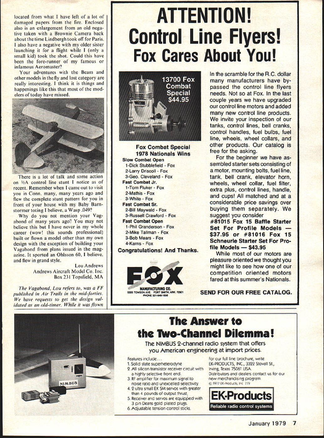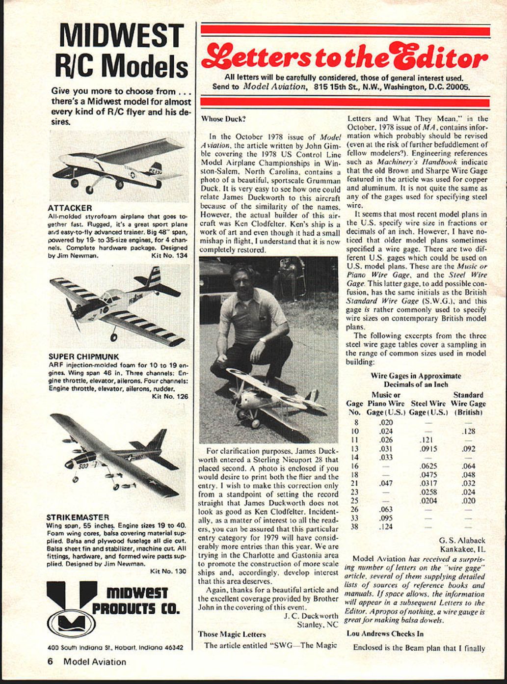 MIDWEST RIC Models Give choose . thems Midwest modelfor almost kind R/C flyer de sires ATTACKER All-molded styrofoam airplane goes gether fast Rugged its great sport plane ard easy-to-fly advanced trainer Big 48 span powered 19- 35-size engines 4 Chan nels Complete hardware package Designed Jim NewmanKit No 134 SUPER CHIPMUNK ARF injection-molded foam 10 19 en gines Wing span 46 Three channels En gine throttle elevator ailerons Four channels Engine throttle elevator ailerons rudder Kit No 126 STR 1K EMASTE R Wing span 55 inches Engine sizes 19 40 Foam wing cores balsa covering material sup plied Balsa plywood fuselage die cut Balsa sheet fin stabilizer machine cut fittings hardware formed wire parts sup plied Designed Jim Newman Kit No 130 P minwes PRODUCTS CO M 400 Soith Indiano St Hobort Indiana 46342 Xetters te th4diter letters will carefully considered general interest used Send Model Aviation 815 15th St NW Washington DC 20005 Duck October 1978 issue Model viat ion article written John Gim ble covering 1978 US Control Line Model Airplane Championships Win ston-Salem North Carolina contains photo beautiful sportscale Grumman Duck very easy see could relate James Duckworth aircraft because similarity names However actual builder air craft Ken Clodfelter Kens ship work art though small mishap flight understand now comnletelv restored clarification purposes James Duckworth entered Sterling Nieuport 28 placed second photo enclosed would desire print both flier entry wish make correction standpoint setting record straight James Duckworth does look good Ken Clodfelter Incident ally matter interest read ers can assured particular entry category 1979 will have consid erably entries year trying Charlotte Gastonia area promote construction scale ships accordingly develop interest area deserves Again thanks beautiful article excellent coverage provided Brother John covering event J C Duckworth Stanley NC Magic Letters Letters What Mean October 1978 issue MAcontains infor mation probably should revised risk further befuddlement fellow modelers Engineering references such Machinerys Handbook indicate old Brown Sharpe Wire Gage featured article used copper aluminum quite same gages used specifying steel wire seems recent model plans US specify wire size fractions decimals inch However have no ticed older model plans sometimes specified wire gage two dif ferent US gages could used US model plans Music Piano Wire Gage Steel Wire Gage latter gage add possible con fusion has same initials British Standard Wire Gage SWG gage rather commonly used specify wire sizes contemporary British model plans following excerpts three steel wire gage tables cover sampling range common sizes used model building Wire Gages Approximate Decimals Inch Gage No 8 10 II 13 14 16 18 21 23 25 26 33 38 Music orStandard Piano Wire Steel Wire Wire Gage Gage US Gage US British 020 024 026 031 033 047 063 095 124 121 0915 0625 0475 03 17 0258 0204 128 092 064 048 032 024 020 G S Alaback Kankakee IL Model Aviation has received surpris ing number letters wire gage article several supplying detailed lists sources reference books manuals space allows information will appear subsequent Letters Editor Apropos nothing wire gauge great making balsa dowels Lou Andrews Checks article entitled SWG Magic Enclosed Beam plan finally 6 Model Aviation located what have left lot damaged papers fire Enclosed also enlargement old nega tive taken Brownie Camera back about time Lindbergh took off Paris also have negative older sister launching flight small kid took shot Could have fore-runner famous infamous Aeromaster9 adventures Beam other models fly lost category really interesting think things happenings like mod tItr nCtndntv h2ve migsed IS d lIlt UtdIIU SUhhI aLlon control line stunt notice recent Remember came out visit Conn many years ago flew complete stunt pattern front house Baby Barn stormer toting believe Wasp 049 mention Vag abond years ago may believe have never whole career wow sounds professional built flown model other own design exception building Vagabond plans issued mag azine sported Ohlsson 60 1 believe flew grand style Lou Andrews Andrews Aircraft Model Co Inc Box 231 Topsfield MA Vagabond Lou refers FF published Air Trails mid-forties have requests get design val idated old-timer flown ATTENTION Control Line Flyers Fox Cares About Fox Combat Special 1978 Nationals Wins Slow Combat Open 1-Dick Stubblelleld Fox 2-Larry Driscoll Fox 3-Geo Cleveland Fox Fast Combat Jr 1-Tom Flu ker Fox 2-Math Fox 3-White Fox Fast Combat Sr 2-Bill Maywald Fox 3-Russell Crawford Fox Fast Combat Open 1-Phil Granderson Fox 2-Mike Tallman Fox 3-Bob Mears Fox 4-Karns Fox Congratulations Thanks MANUFACTURING CO 5205 TOWOON AVE POST IMITh AM 72101 PI4ONE 50146-tUE scramble RC dollar manufacturers have passed control line flyers needs Fox last couple years have upgraded control line motors added new control line products invite inspection tanks control lines bell cranks control handles fuel bulbs fuel line wheels wheel collars other products catalog free asking beginner have sembled starter sets consisting motor mounting bolts fuel line tank bell crank elevator horn wheels wheel collar fuel filter extra plus control lines handle cups matched considerable price savings over buying separately suggest consider #81015 Fox 15 Baffle Starter Set Profile Models $3795 #81016 Fox 15 Schneurle Starter Set Pro file Models 5 motors pleasure oriented thought might like see competition oriented motors fared summers Nationals SEND FOR OUR FREE CATALOG Answer iWo-Channel Dilemma NIMBUS 2-channel radio system offers American engineering import prices Features include. 1 Solid state superheterodyne 2 All silicon transistor receiver circuit highly selective front end 3 RF amplifier maximum signal noise ratio unexcelled selectivity 4 2 ultra small EK SM servos greater 4 pounds output thrust 5 Receiver servos equipped 3 pin Deans gold plated plugs 6 Adjustable tension control 