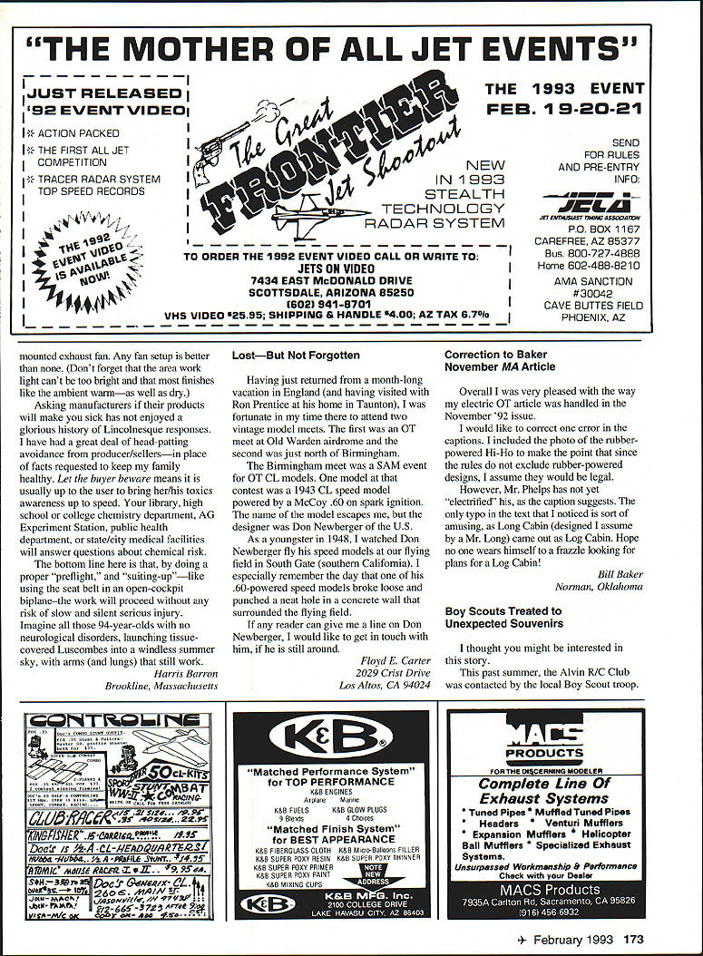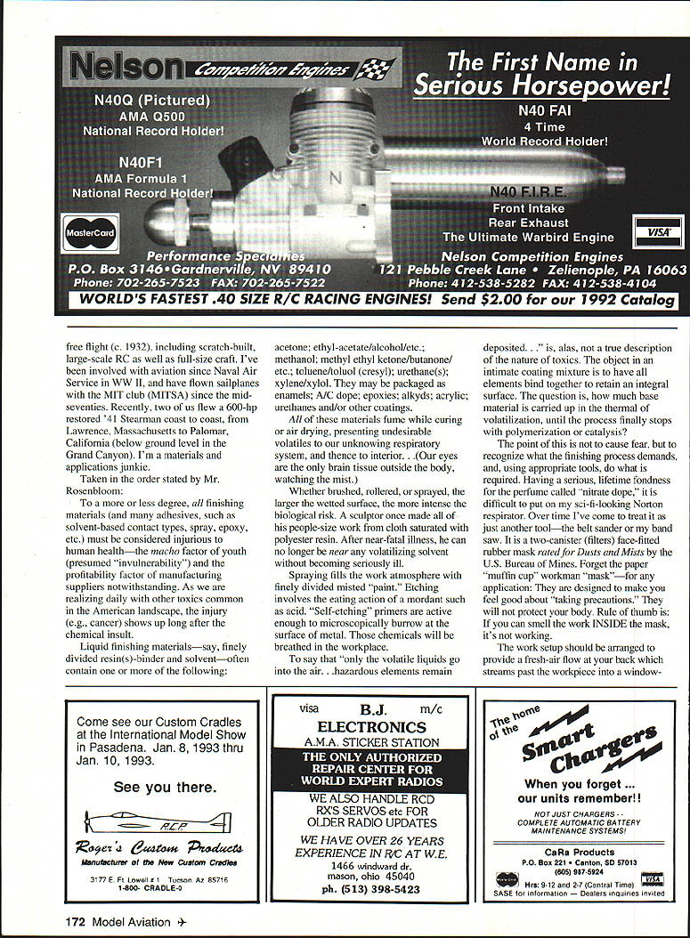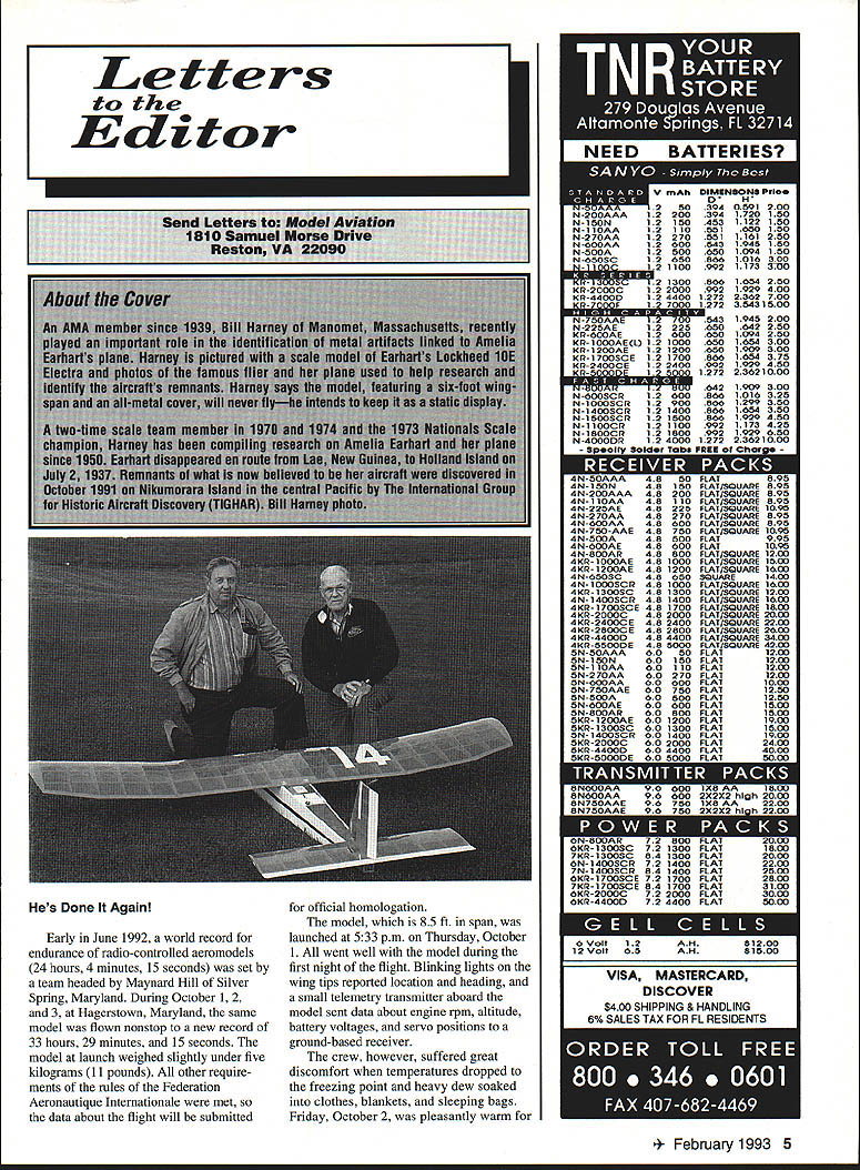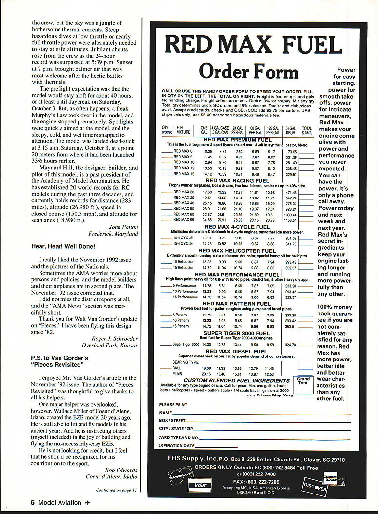 Letters Editor Hes Done Again Early June 1992 world record endurance radio-controlled aeromodels 24 hours 4 minutes 15 seconds set team headed Maynard Hill Silver Spring Maryland During October 1 2 3 Hagerstown Maryland same model flown nonstop new record 33 hours 29 minutes 15 seconds model launch weighed slightly under five kilograms 11 pounds other require ments rules Federation Aeronautique Intemationale met data about flight will submitted official homologation model 85 ft span launched 533 pm Thursday October 1 went well model during first night flight Blinking lights wing tips reported location heading small telemetry transmitter aboard model sent data about engine rpm altitude battery voltages servo positions ground-based receiver crew however suffered great discomfort temperatures dropped freezing point heavy dew soaked clothes blankets sleeping bags Friday October 2 pleasantly warm uary 1993 5 NFFfl RATTFRIF mU 6 Volt12AN$1200 12 Volt85AN$1500 VISA MASTERCARD DISCOVER $400 SHIPPING & HANDLING R% iAI PS TAX FOP Fl PFSIDFNTS crew sky jungle bothersome thermal currents Steep hazardous dives low throttle nearly full throttle power alternately needed stay safe altitudes Jubilant shouts rose crew 24-hour record surpassed 539 pm Sunset 7 pm brought calmer air welcome after hectic battles thermals preflight expectation model would stay aloft about 40 hours least until daybreak Saturday October 3 often happens freak Murphys Law took over model engine stopped prematurely Spotlights quickly aimed model sleepy cold wet timers snapped attention model landed dead-stick 315 am Saturday October 3 point 20 meters launched 332A hours earlier Maynard Hill designer builder pilot model past president Academy Model Aeronautics has established 20 world records RC models during past three decades currently holds records distance 283 miles altitude 26980 ft speed closed course 1503 mph altitude seaplanes 18980 ft John Patton Frederick Maryland Hear Hear Well Done really liked November 1992 issue pictures Nationals Sometimes AMA worries about persons policies model builders airplanes second place November 92 issue corrected did miss district reports AMA News section mer cifully short Thank Walt Van Gorders update Pieces have flying design since 82 RogerJ Schroeder Overland Park Kansas PS Van Gorders Pieces Revisited enjoyed Mr Van Gorder s article November 92 issue author Pieces Revisited thoughtful give thanks helpers major helper overlooked however Wallace Miller Coeur dAlene Idaho created EZB model 30 years ago still able lift fly models ancient years instructing others myself included joy building flying not-necessarily-easy EZB looking credit feel should recognized contribution sport Bob Edwards Coeur dAlene Idaho RED MAX PREMIUM FUEL fuel beginners & sport flyers should use Avail synlhetk castor lend RED MAX 0102877175068961717385 RED MAX 5114585983676768722125 _____ RED MAX 10 1294 970 944 867 776 28140 RED MAX 12 1353 1015 988 907 812 30545 RED MAX 15 1412 1059 1031 946 847 32951 RED MAX RACING FUEL Trophy winner planes boats & cars Iwo boat blends castor Ok up 40% nltro RED MAX 201763132212871181105847145 RED MAX 251951146314241307117154774 RED MAX 402515188618381685150977804 RED MAX 502891218821101937173492824 RED MAX 80326724523852189198108044 RED MAX 6534552591252223152073115854 RED MAX 4-CYCLE FUEL Eliminates detonation & kickback 4cycle engines smoother idle power 104 CYCLE129497194586777728159 154 CYCLE14431082105396788634173 RED MAX HELICOPTER FUEL Extremely smooth running extra defosmer drk color special heavy oil hellcptrs 10 Helicopter132399398688779429342 ........15 Helicopter14721104107498688335357 RED MAX PERFORMANCE FUEL High flash point heavy oil use tuned pipes ducted fan & other heavy dty app 5 Performance 10 Performance 15 Performance 1175881858787705 1323993966887794 147211041074988883 RED MAX PATTERN FUEL Proven best fuel pattern engines using pumps tuned pipes 5 Pattern117588185878770523328 -....10 Pattern132399398688779429342 15 Pattern1472110410749868833535 SUPER TIGER 3000 FUEL Best fuel Super Tiger 2000-4000 engines Super Tiger 3000 143010731044958858 RED MAX DIESEL FUEL Superior diesel back list populsr demand customers BEARING TYPE BALL PLAIN 19081432139312791145 20181540150113871253 CUSTOM BLENDED FUEL INGREDIENTS Available type engine use Call price Mm gallon boata Total cara helicoptera d ern scale scale kavan iginition 3000 - PrIces May Vary PLEASE PRINT Power easy starting power Smooth take offs power intricate maneuvers Red Max makes engine come alive power performance never expected can have power Its phone call away Power today next week 100% money back guaran ____ tee ____ com pletely sat isfied reason Red Max has power better idle better wear char acteristics other fuel 6 Model Aviation r Form CALL OR USE THIS HANDY ORDER FORM TO SPEED YOUR ORDER FILL IN OTY ON THE LEFT THE TOTAL ON RIGHT Freight free pta gals No handling charge Freight collect drums Deduct 3% prepay Mix qty Total qty determines price SC orders add 5% sales tax Dealer club prices avail Accept credit cards checks COD COD add $375 per carton UPS shipments add $500 per carton hazardous materials fee OlYFUELONE4GALCASE 24GAL tOGAL128GAL orderedMIXTUREGAL5GALCAN PERGAL rPERGALPERGAL 54 GAL TOTAL DRUM$AMT next year Red Maxs secret gredients keep engine last ing longer running power 23328fully 29342any other 35357 3a478 RED MAX FUEL Continued page 11 Box CITY CARD TYPE AND NO___ EXPIRAT OATS Letters Editor Continued page 6 Paint Thinner Fumes ARE Risky response letter Noah Rosenbloom November 1992 issue MA about danger inhaling paint thinner fumes can tell Noah personal experience breathing vapor given off mod em solvents such xylene toluol can highly damaging doesnt matter whether paint gets sprayed brushed either case vapor passes sur rounding atmosphere air breathe foolishly brush-painted some small model parts confined area few years ago As result inhaling evaporating thinner fumes suffered thr