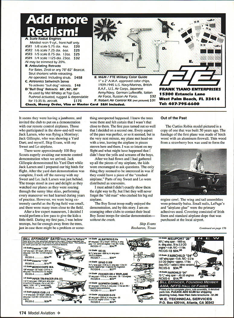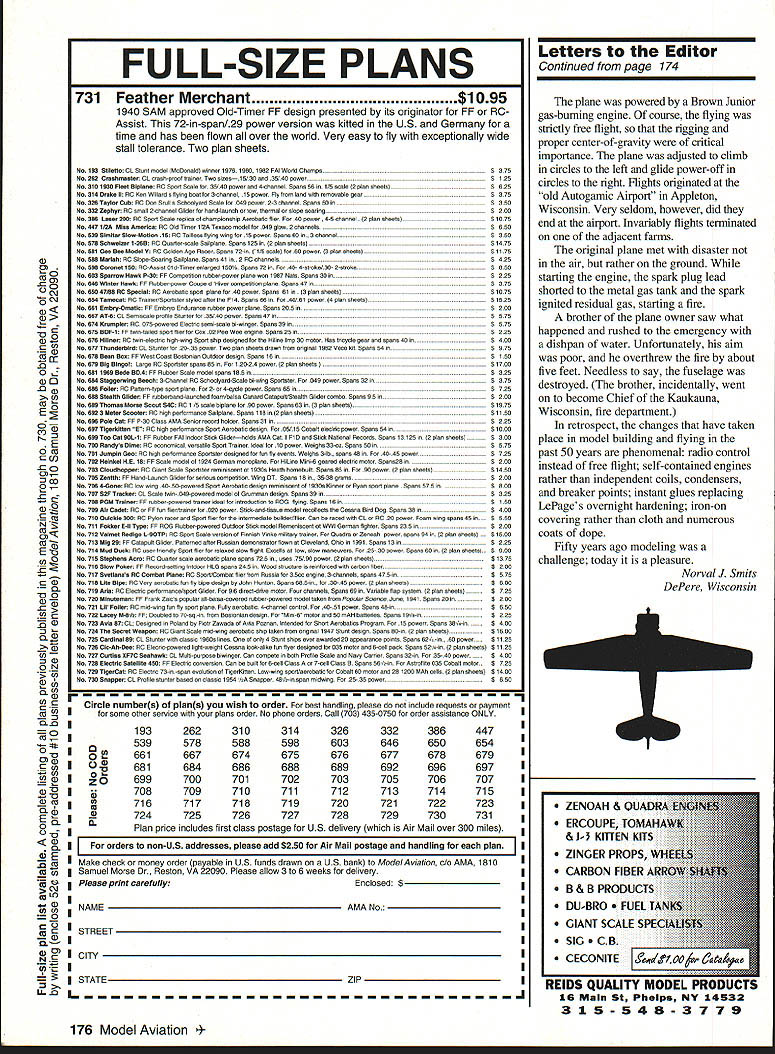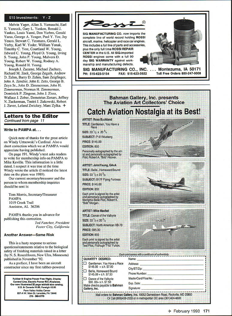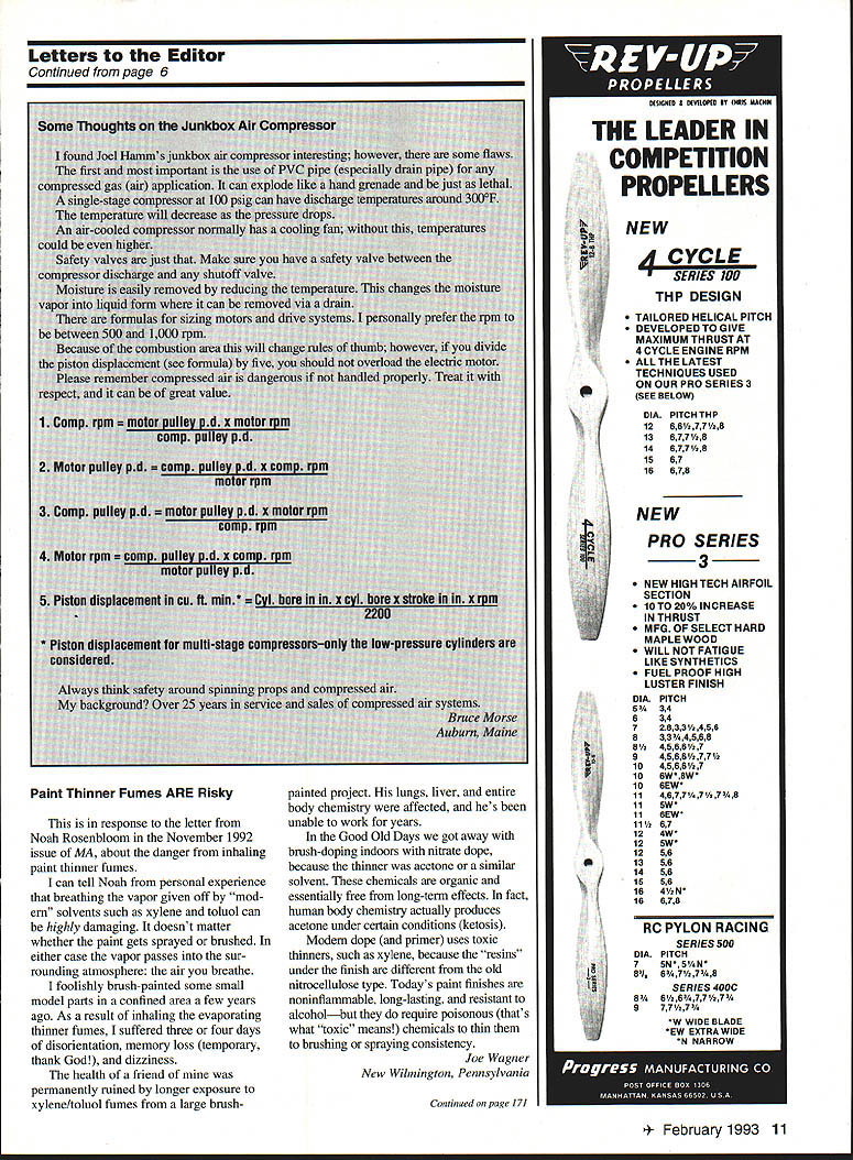 Letters Editor Hes Done Again Early June 1992 world record endurance radio-controlled aeromodels 24 hours 4 minutes 15 seconds set team headed Maynard Hill Silver Spring Maryland During October 1 2 3 Hagerstown Maryland same model flown nonstop new record 33 hours 29 minutes 15 seconds model launch weighed slightly under five kilograms 11 pounds other require ments rules Federation Aeronautique Intemationale met data about flight will submitted official homologation model 85 ft span launched 533 pm Thursday October 1 went well model during first night flight Blinking lights wing tips reported location heading small telemetry transmitter aboard model sent data about engine rpm altitude battery voltages servo positions ground-based receiver crew however suffered great discomfort temperatures dropped freezing point heavy dew soaked clothes blankets sleeping bags Friday October 2 pleasantly warm uary 1993 5 NFFfl RATTFRIF mU 6 Volt12AN$1200 12 Volt85AN$1500 VISA MASTERCARD DISCOVER $400 SHIPPING & HANDLING R% iAI PS TAX FOP Fl PFSIDFNTS crew sky jungle bothersome thermal currents Steep hazardous dives low throttle nearly full throttle power alternately needed stay safe altitudes Jubilant shouts rose crew 24-hour record surpassed 539 pm Sunset 7 pm brought calmer air welcome after hectic battles thermals preflight expectation model would stay aloft about 40 hours least until daybreak Saturday October 3 often happens freak Murphys Law took over model engine stopped prematurely Spotlights quickly aimed model sleepy cold wet timers snapped attention model landed dead-stick 315 am Saturday October 3 point 20 meters launched 332A hours earlier Maynard Hill designer builder pilot model past president Academy Model Aeronautics has established 20 world records RC models during past three decades currently holds records distance 283 miles altitude 26980 ft speed closed course 1503 mph altitude seaplanes 18980 ft John Patton Frederick Maryland Hear Hear Well Done really liked November 1992 issue pictures Nationals Sometimes AMA worries about persons policies model builders airplanes second place November 92 issue corrected did miss district reports AMA News section mer cifully short Thank Walt Van Gorders update Pieces have flying design since 82 RogerJ Schroeder Overland Park Kansas PS Van Gorders Pieces Revisited enjoyed Mr Van Gorder s article November 92 issue author Pieces Revisited thoughtful give thanks helpers major helper overlooked however Wallace Miller Coeur dAlene Idaho created EZB model 30 years ago still able lift fly models ancient years instructing others myself included joy building flying not-necessarily-easy EZB looking credit feel should recognized contribution sport Bob Edwards Coeur dAlene Idaho RED MAX PREMIUM FUEL fuel beginners & sport flyers should use Avail synlhetk castor lend RED MAX 0102877175068961717385 RED MAX 5114585983676768722125 _____ RED MAX 10 1294 970 944 867 776 28140 RED MAX 12 1353 1015 988 907 812 30545 RED MAX 15 1412 1059 1031 946 847 32951 RED MAX RACING FUEL Trophy winner planes boats & cars Iwo boat blends castor Ok up 40% nltro RED MAX 201763132212871181105847145 RED MAX 251951146314241307117154774 RED MAX 402515188618381685150977804 RED MAX 502891218821101937173492824 RED MAX 80326724523852189198108044 RED MAX 6534552591252223152073115854 RED MAX 4-CYCLE FUEL Eliminates detonation & kickback 4cycle engines smoother idle power 104 CYCLE129497194586777728159 154 CYCLE14431082105396788634173 RED MAX HELICOPTER FUEL Extremely smooth running extra defosmer drk color special heavy oil hellcptrs 10 Helicopter132399398688779429342 ........15 Helicopter14721104107498688335357 RED MAX PERFORMANCE FUEL High flash point heavy oil use tuned pipes ducted fan & other heavy dty app 5 Performance 10 Performance 15 Performance 1175881858787705 1323993966887794 147211041074988883 RED MAX PATTERN FUEL Proven best fuel pattern engines using pumps tuned pipes 5 Pattern117588185878770523328 -....10 Pattern132399398688779429342 15 Pattern1472110410749868833535 SUPER TIGER 3000 FUEL Best fuel Super Tiger 2000-4000 engines Super Tiger 3000 143010731044958858 RED MAX DIESEL FUEL Superior diesel back list populsr demand customers BEARING TYPE BALL PLAIN 19081432139312791145 20181540150113871253 CUSTOM BLENDED FUEL INGREDIENTS Available type engine use Call price Mm gallon boata Total cara helicoptera d ern scale scale kavan iginition 3000 - PrIces May Vary PLEASE PRINT Power easy starting power Smooth take offs power intricate maneuvers Red Max makes engine come alive power performance never expected can have power Its phone call away Power today next week 100% money back guaran ____ tee ____ com pletely sat isfied reason Red Max has power better idle better wear char acteristics other fuel 6 Model Aviation r Form CALL OR USE THIS HANDY ORDER FORM TO SPEED YOUR ORDER FILL IN OTY ON THE LEFT THE TOTAL ON RIGHT Freight free pta gals No handling charge Freight collect drums Deduct 3% prepay Mix qty Total qty determines price SC orders add 5% sales tax Dealer club prices avail Accept credit cards checks COD COD add $375 per carton UPS shipments add $500 per carton hazardous materials fee OlYFUELONE4GALCASE 24GAL tOGAL128GAL orderedMIXTUREGAL5GALCAN PERGAL rPERGALPERGAL 54 GAL TOTAL DRUM$AMT next year Red Maxs secret gredients keep engine last ing longer running power 23328fully 29342any other 35357 3a478 RED MAX FUEL Continued page 11 Box CITY CARD TYPE AND NO___ EXPIRAT OATS Letters Editor Continued page 6 Paint Thinner Fumes ARE Risky response letter Noah Rosenbloom November 1992 issue MA about danger inhaling paint thinner fumes can tell Noah personal experience breathing vapor given off mod em solvents such xylene toluol can highly damaging doesnt matter whether paint gets sprayed brushed either case vapor passes sur rounding atmosphere air breathe foolishly brush-painted some small model parts confined area few years ago As result inhaling evaporating thinner fumes suffered thr
