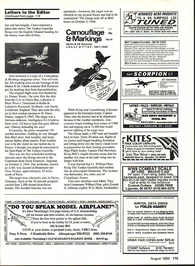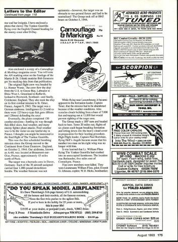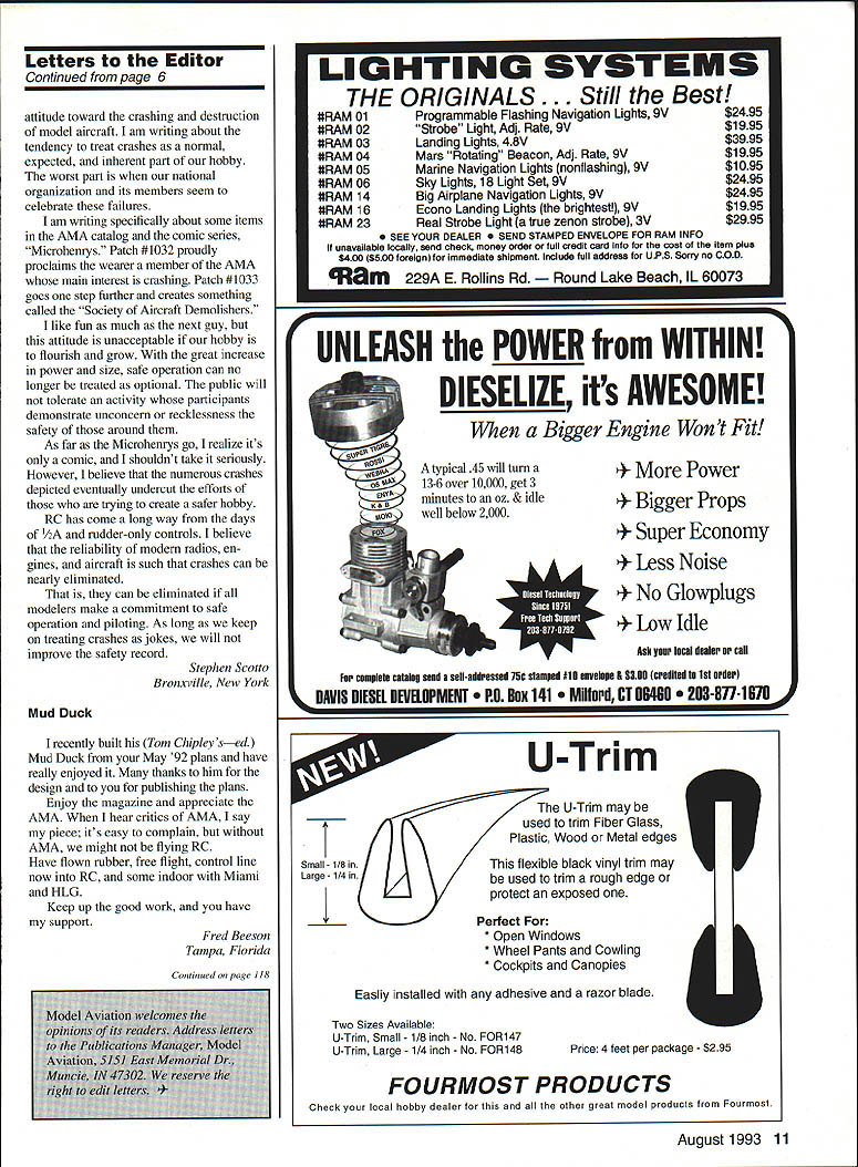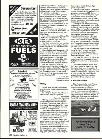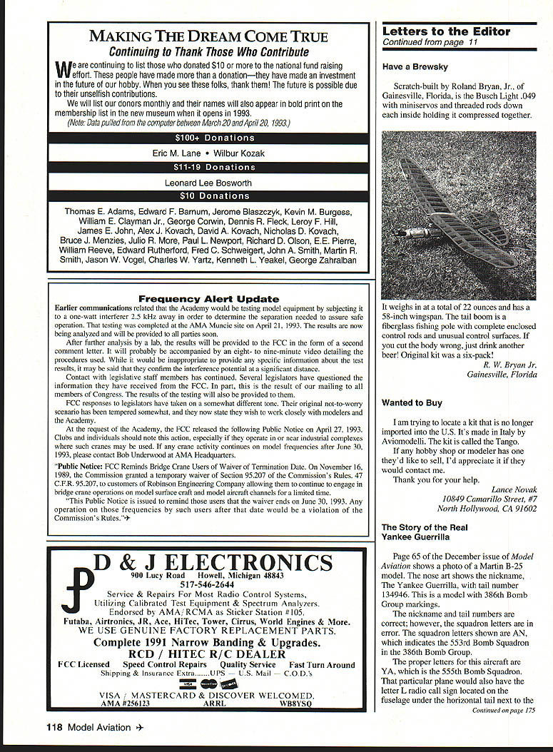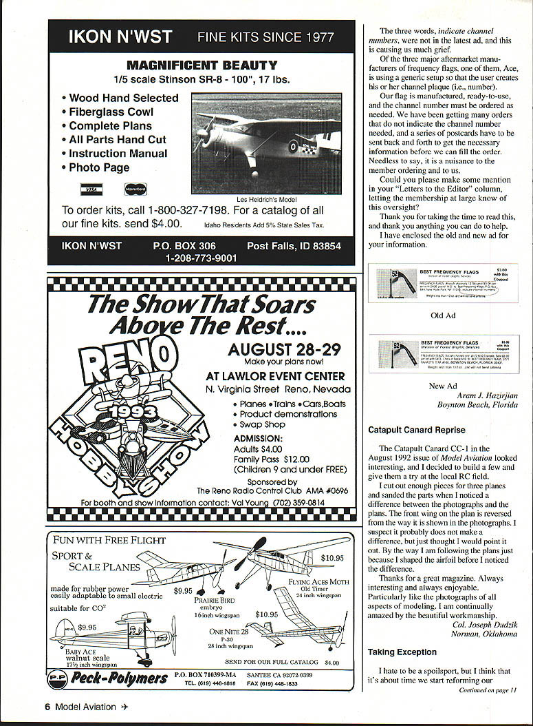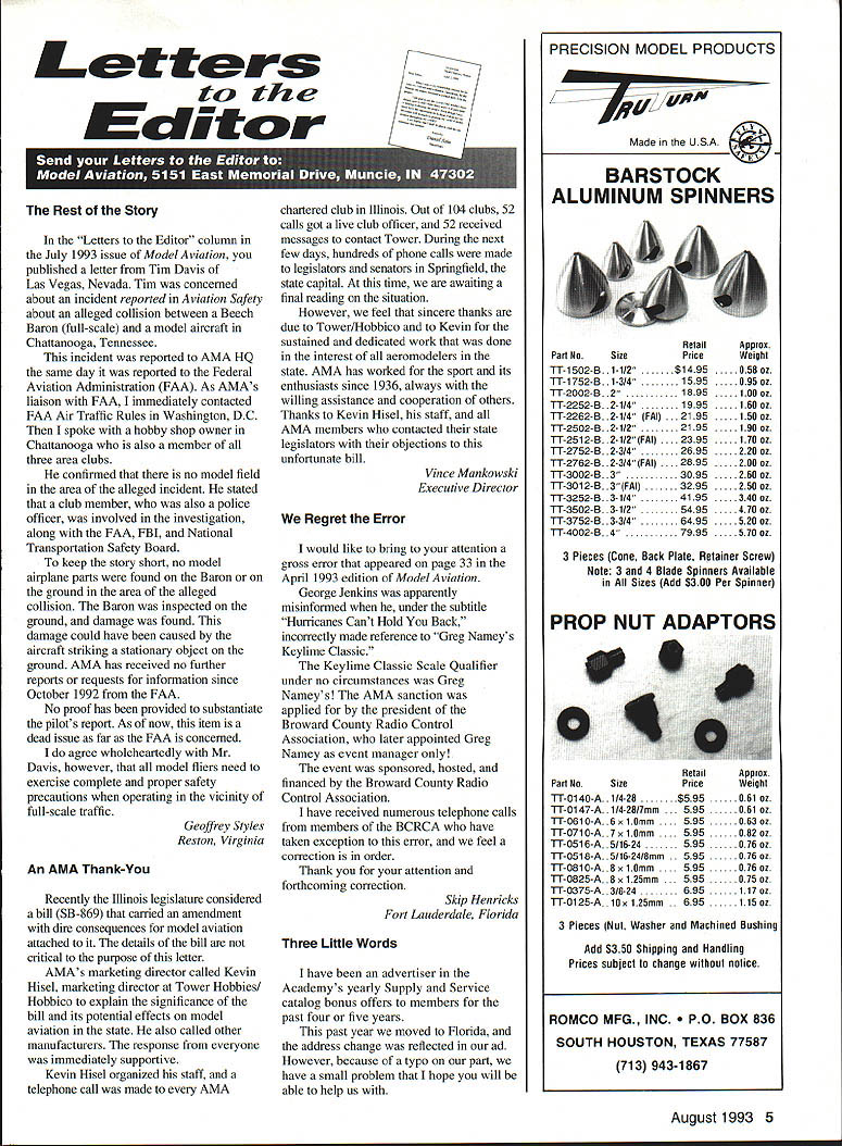 Letters tc Ecfitcr Letters Editor column July 1993 issue Model Aviation published letter Tim Davis Las Vegas Nevada Tim concerned about incident reported Aviation Safety about alleged collision between Beech Baron full-scale model aircraft Chattanooga Tennessee incident reported AMA HQ same day reported Federal Aviation Administration FAA As AMAs liaison FAA immediately contacted FAA Air Traffic Rules Washington DC spoke hobby shop owner Chattanooga also member three area clubs confirmed no model field area alleged incident stated club member also police officer involved investigation along FAA FBI National Transportation Safety Board keep story short no model airplane parts found Baron ground area alleged collision Baron inspected ground damage found damage could have caused aircraft striking stationary object ground AMA has received no further reports requests information since October 1992 FAA No proof has provided substantiate pilots report As now item dead issue far FAA concerned agree wholeheartedly Mr Davis however model fliers need exercise complete proper safety precautions operating vicinity full-scale traffic Geoffrey Styles Reston Virginia An AMA Thank-You Recently Illinois legislature considered bill SB-869 carried amendment dire consequences model aviation attached details bill critical purpose letter AMAs marketing director called Kevin Hisel marketing director Tower Hobbies Hobbico explain significance bill its potential effects model aviation state also called other manufacturers response everyone immediately supportive Kevin Hisel organized staff telephone call made AMA chartered club Illinois Out 104 clubs 52 calls got live club officer 52 received messages contact Tower During next few days hundreds phone calls made legislators senators Springfield state capital time awaiting final reading situation However feel sincere thanks due Tower/Hobbico Kevin sustained dedicated work done interest aeromodelers state AMA has worked sport its enthusiasts since 1936 always willing assistance cooperation others Thanks Kevin Hisel staff AMA members contacted state legislators objections unfortunate bill Vince Mankowski Executive Director Regret Error would like bring attention gross error appeared page 33 April 1993 edition Model Aviation George Jenkins apparently misinformed under subtitle Hurricanes Cant Hold Back incorrectly made reference Greg Nameys Keylime Classic Keylime Classic Scale Qualifier under no circumstances Greg Nameys AMA sanction applied president Broward County Radio Control Association later appointed Greg Namey event manager event sponsored hosted financed Broward County Radio Control Association have received numerous telephone calls members BCRCA have taken exception error feel correction order Thank attention forthcoming correction Skip Henricks Fort Lauderdale Florida Three Little Words have advertiser Academys yearly Supply Service catalog bonus offers members past four five years past year moved Florida address change reflected ad However because typo part have small problem hope will able help us PRECISION MODEL PRODUCTS ZZZj7asM Made ihe U S BARSTOCK ALUMINUM SPINNERS Retail Part No Size Price TT-1502-B 11/2 $1495 TT-1752-B 13/4 1595 TT-2002-B 2 1895 TT-2252-B 21/4 1995 TT-2262-B 21/4 FAI . 2195 TT-2502-B 21/2 2195 TT-251 2-B. 2-112FAI 2395 TT-2752-B 2-3/4 2695 TT-2762-B 2314 FAt 2895 TT-3002-B 3 3095 TT-301 2-B 3 FAt 3295 TT-3252-B 3114 4195 TT-3502-B 3112 5495 TT-3752-B 33/4 6495 TT-4002-B 4 7995 3 Pieces Cone Back Plate Retainer Screw Note 3 4 Blade Spinners Available Sizes Add $3 00 Per Spinner PROP NUT ADAPTORS V 0 RetailApprox Part No SizePriceWeight TT-01 40-A 1/428 . $595 07 TT-0147-A 1/428/7mm595. 061 07 TT-0610-A.6x1Omm595. 06307 TT-0710A 7x 10mm . 595 08207 TT-051 6-A 5/1624 595 oz TT-0518-A 5/1624/8mm595 076 oz TT-0810-A 8x 10mm595 076 oz TT-0825-A 8 x 125mm595075 07 TT-0375-A 3/824 . 695 117 oz TT-01 25-A. lOx 125mm . 695 115 07 3 Pieces Nut Washer arid Machined Bushing Add $350 Shipping Handling Prices subject change notice ROMCO MFG INC OX 836 SOUTH HOUSTON TEXAS 77587 713 943-1867 August1993 5 Rest Story Approi Weighi 058 07 095 07 100 07 160 oz 150 oz 190 oz 170 07 220 07 200 07 260 07 250 oz 340 oz 470 oz 520 oz 570 07 Wood Hand Selected Fiberglass Cowl Complete Plans Parts Hand Cut Instruction Manual Photo Page order kits call 1-800-327-7198 catalog fine kits send $400 Idaho Residents Add 5% State Sales Tax ShowThat Soars Abo eTheRest.. 90 booth show Information contact Vol Young 702 359-0814 AUGUST 28-29 Make plans now AT LAWLOR EVENT CENTER N Virginia Street Reno Nevada Planes eTrains CarsBoats Product demonstrations Swap Shop ADMISSION Adults $400 Family Pass $1200 Children 9 under FREE Sponsored Rena Radio Control club AMA #0696 ............ FUN WITH FREE FLIGHT SCALE PLANE SPORT $995~LC ACES MOTH made forpowerThmer small electric 24 inch wingspan easily adaptablePRAIRIE BIRD embryo l6inch wingspan$1095 AZI $995ONENITE 28L 28 inch wingspan suitable CO2 - ACE walnut scale 17 inch wingspan SEND FOR OUR FULL CATALOG $400 three words indicate channel numbers latest ad Causing us much grief three major aftermarket manu facturers frequency flags Ace using generic setup user creates channel plaque ie number flag manufactured ready-to-use channel number must ordered needed have getting orders indicate channel number needed series postcards have sent back forth get necessary information before can fill order Needless say nuisance member ordering us Could please make some mention Letters Editor column letting membership large know oversight Thank taking time read thank anything can help have enclosed old new ad information BEST FREQUENCY FLAGS 51055 Old Ad BEST FREQUENCY FLAGS Tha3aoFoest aepnc Sevtss u-NC Ni tNN aiN w, 5NN$i NXN9NVO Ni*Ni 50YtTOi WANt roacs Jitit WAN ASiA 3 aN iNN iiNs3ANi New Ad Aram J Hazirjian Boynton Beach Florida Catapult Canard Reprise Catapult Canard CC-I August 1992 issue Model Aviation looked interesting decided 