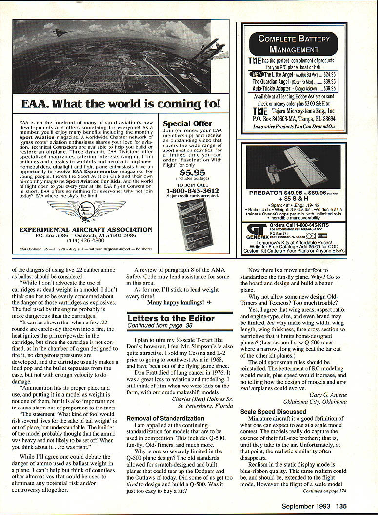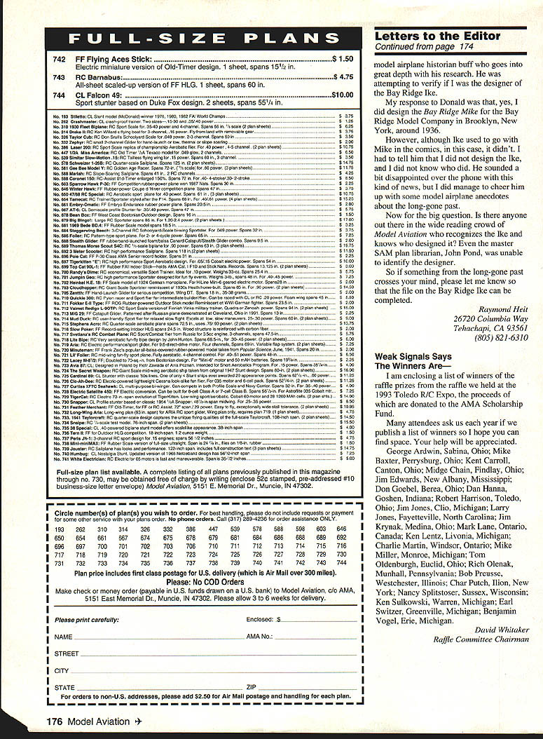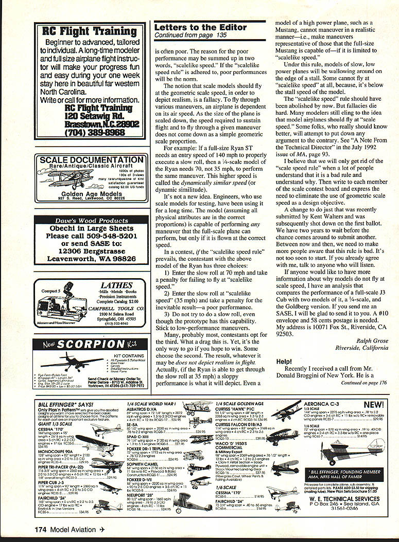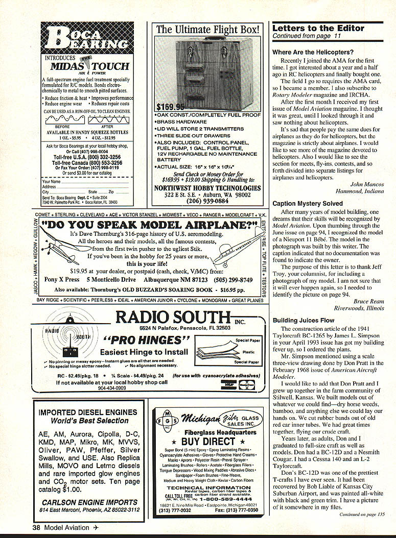 Letters tc th Editor About Catapult Canard After building two CC-is Catapult Canards everyone family picnic took turns flying results great large left-circle descents Referring article Model Aviation August 1992 next day determine descents left circle right text described noticed wings plan page 90 backwards pictures page 82 apparently flying backwards cares fun live below landing lanes OHare Field some day jumbo jets comes backwards Ill believe what see John M Brach Lombard Illinois Microhenrys Useless No Way would like reply letter Ed note Now Youre Talking tember 1992 issue Model Aviation Lawrence E Klingberg Jr referred Microhenrys useless course opinion believe minority opinion look forward issue MA unlike Mr Klingberg instead finding fault simply enjoy think statement both cruel thoughtless pleasure meeting Ed Henry several years ago found him very gracious gentleman well talented Please keep up good work have lot admiration both publication organization represents Jack Bryant Reeds Spring Missouri Hawks vs Model couple fun stories regarding noise model aircraft flying first dates back high school regularly flew 1/2A control line school field Once police would come around chase us off because someone complained about noise fine Saturday went field left engines off planes home sat around talking sure enough comes squad car After showing him planes went away too surprisingly police seemed have too much to respond noise complaints after second experience about month ago test-flying Cox EZ-Bee II local vacant lot about 10 am Saturday thermals popping happily gliding around well 20minute flight heard car drive up behind keep motor running brought plane closer could find again glanced around see Sure enough black-and-white though nice young lady cop time asked problem first said No asked anyone else flying Finally came out noise complaint Through course model happily gliding around engine off remarked just couldnt understand some people couldnt hear airplane what complaining about Needless say didnt mention power-on part flight Incidentally engine muffled meets AMA FAT specs Well thats about now Larry Renger Cerritos California Wednesday Morning Crew Enclosed picture midweek fliers gather Penis California Wednesday morning pleasure flying Pictured fliers left right Glenn Foulks Sal Taibi Jim Quinn Al Richardson trophies four fliers won 1992 Free Flight Champs Lost Hills California 6 7 8 September Weather Champs great generally 5-8 mph breeze good thermals bit over 200 entrants four fliers won seven trophies medal worn myself have flying Penis three years now Weather always calm 1-2 mph breeze have blown out winds three days three years flying Sal Taibi Lakewood California Continued page 11 THE LEADER IN COMPETITION NEW C_______ PRO SERIES 3 NEW HIGH TECH AIRFOIL SECTION lOTO 200/0 INCREASE IN THRUST MFG OF SELECT HARD MAPLE WOOD WILL NOT FATIGUE LIKE SYNTHETICS FUEL PROOF HIGH LUSTER FINISH DIAPITCH 534 634 72833456 8334568 845667 9456677 104566Vz7 106W*8W 106EW II4677778 115W 118EW 1187 124W 125W 1258 1356 1456 1556 164N 16678 September 1993 5 Tr PROPELLERS - SERIES lULl THP DESIGN TAILORED HELICAL PITCH DEVELOPED TO GIVE MAXIMUM THRUST AT 4 CYCLE ENGINE RPM ALL THE LATEST TECHNIQUES USED ON OUR PRO SERIES 3 SEE BELOW DIAPITCH THP 1266778 136778 146778 1567 16678 RC PYLON RACING SERIES 500 DIA PITCH 75N5N SERIES 400C 8I66777 977A7 BLADE EW EXTRA WIDE N NARROW NEW / 7 ti Letters Editor Continued page 5 Staggerwing Accompaniments Received April issue Model Aviation picture Staggerwing Beech model F-17D cover Beautiful cover picture have collection old aviation maga zines some dating back 20s 30s Am enclosing copy cover De cember 1936 issue PopularAviation picture Beechcraft C-17B price super magazine 1936 254 Beechcraft has cruising speed 177 mph 7200 feet using 210 Jacobs 285 hp ships cruising range 700 miles its landing speed 45 mph Standard equipment includes electrically operated landing gear spent entire life aircraft mechanic working everything J3 Cubs 747s Am 72 years old retired still interested Keep up good work Enjoy reading issue Model Aviation have always admirer Beech 17 pleased see cover months magazine information described book Staggerwing page 200 may add little information NC 18786 F17-Ds registration number SN 211 built April 1938 powered Jacobs L-6 330 hp owner Agnes Pyno McLean New York City 1939 No other information available Staggerwing coauthored Robert T Smith Thomas Lempicke published Cody Publications Incorporated Kissimmee FL 32741 copyright date 1979 Library Congress Catalog number 79-5 1536 John P Thompson Easley South Carolina Museum Donation past year has hectic stressful downright depressing times once ray light shines out buoys spirits once again years ray light came curator museum [Mike Fulmer ed] story model kit note soldier cut through hardness heart time burdens us [Cloud 9 AMA s newsletter Museum Patrons January 1993 issue ed] story actually brought tears eyes haifa century later Tonys world need remembered am enclosing extra contribution museum memory Tonys went before honor may follow James D Powers Santa Barbara California Continued page 35 Wood Hand Selected Fiberglass Cowl Complete Plans Parts Hand Cut Instruction Manual Photo Page IVUUI uy nriuy ur nuatiaitS order kits call 1-800-327-7198 catalog fine kits send $400 Idaho Residents Add 5% State SalesTax AFTER YOU DID ALL THE WORK WHY LET YOUR AIRPLANE DO ALL THE FLYING September1993 11 BIG AND BOLD DeH Beaver 9615 lbs INFO flO BUILD & FLY THE miniMAX YOURSELF 1 I3 Axis control \e ChamH, Ultralight Part 103 ultralight Easy construction 1989 Sun-N-Fun Fly-In Wood construction TEAM INC 10790-MA Ivy Bluff Rd Bradyville TN 37026 765-5397 MR full-spectrum engine fuel treatment specially formulated RIC models Bonds electro chemically metal smooth pitted surfaces Reduce friction & heat Improves performane Reduce engine wear ces repair costs CAN BE USED AS RUN-OFF OtL CLEAN ENGINES - ,, BEFOREAFTER AVAI