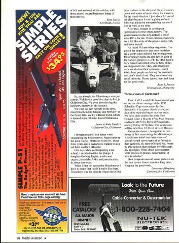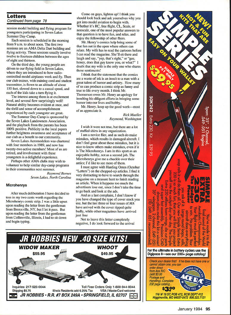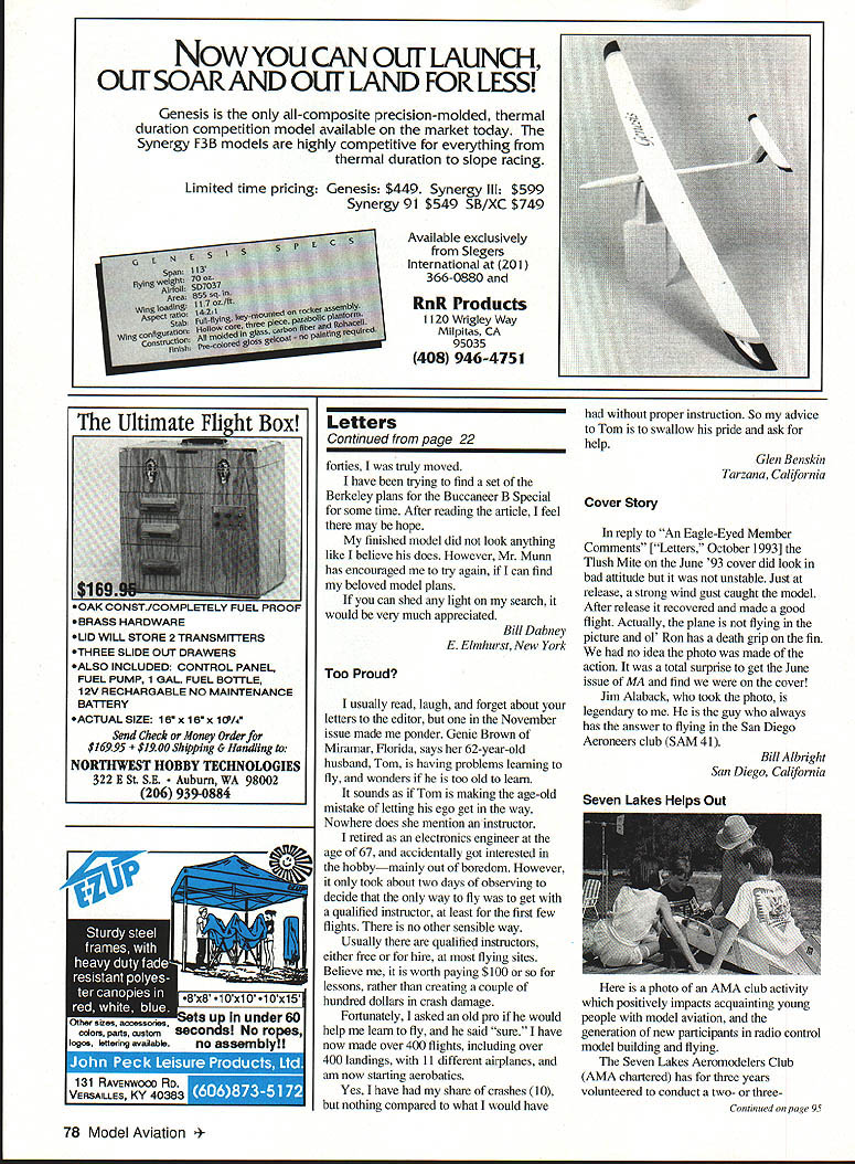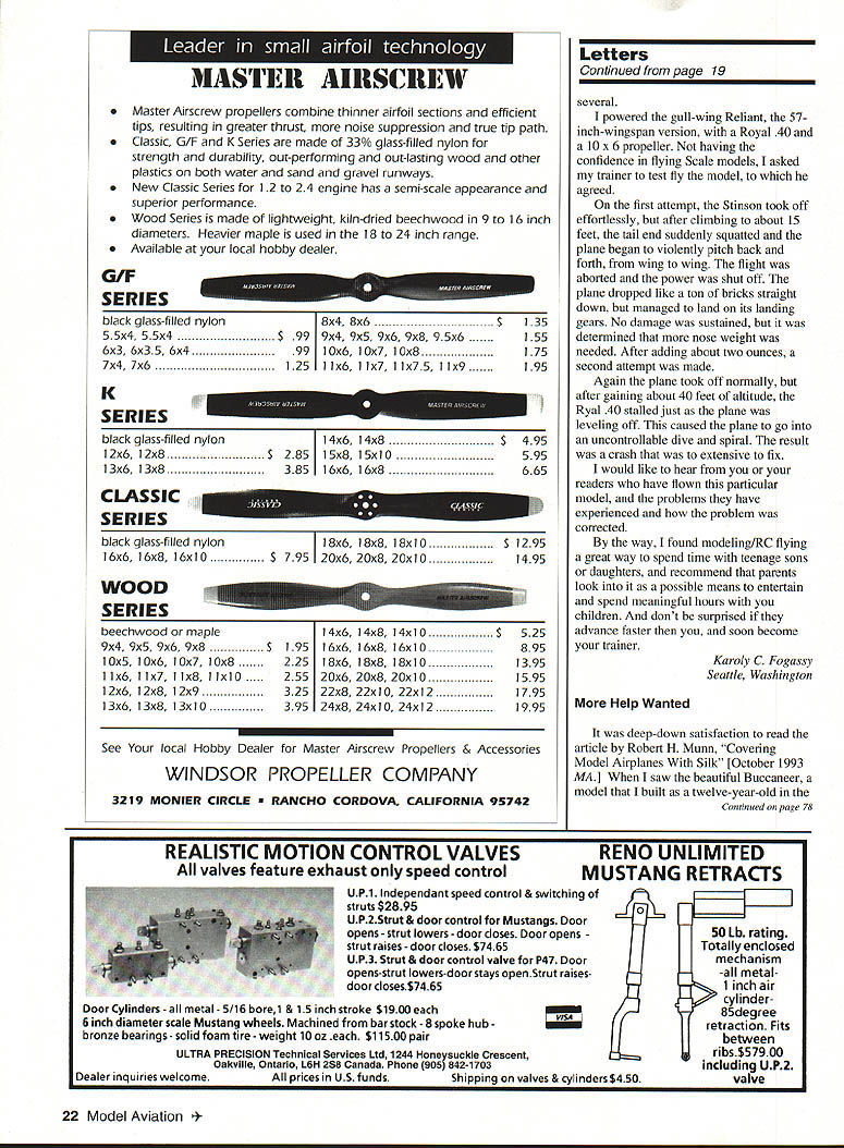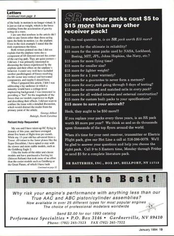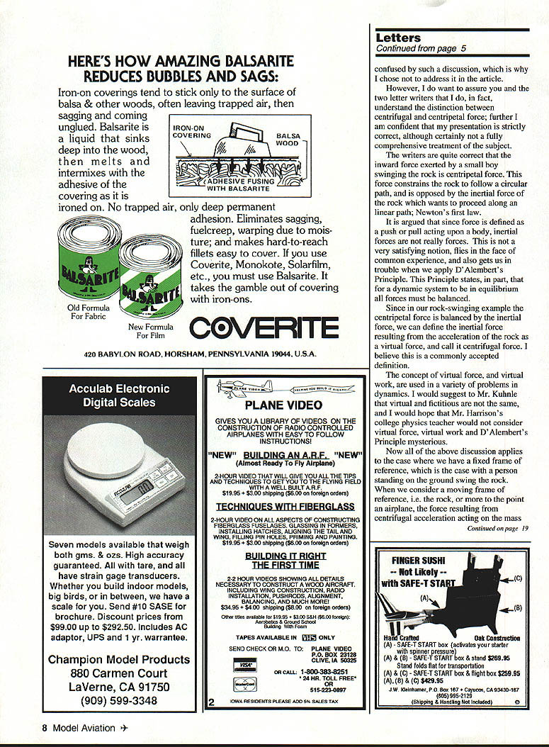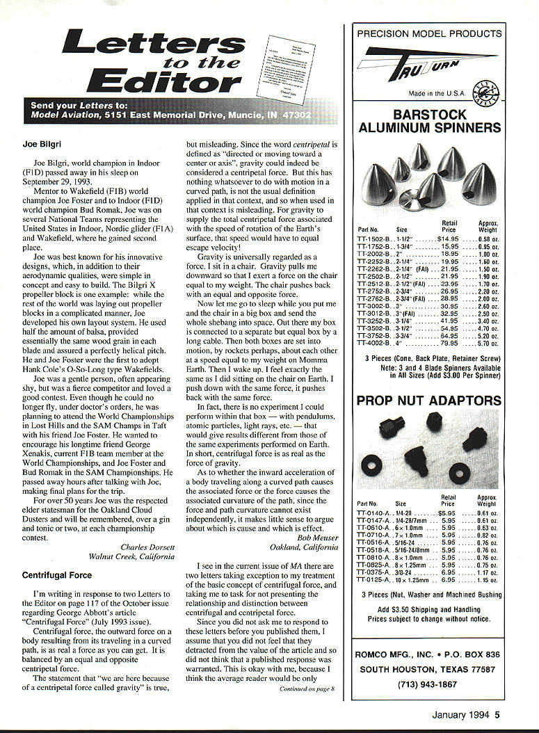 Let ters tc Editor S BiIgri Joe Bilgri world champion Indoor FiD passed away sleep September 29 1993 Mentor Wakefield FiB world champion Joe Foster Indoor FiD world champion Bud Romak Joe several National Teams representing United States Indoor Nordic glider Fl Wakefield gained second place Joe best known innovative designs addition aerodynamic qualities simple concept easy build Bilgri X propeller block example rest world laying out propeller blocks complicated manner Joe developed own layout system used half amount balsa provided essentially same wood grain blade assured perfectly helical pitch Joe Foster first adopt Hank Coles 0-So-Long type Wakefields Joe gentle person often appearing shy fierce competitor loved good contest though could no longer fly under doctors orders planning attend World Championships Lost Hills SAM Champs Taft friend Joe Foster wanted encourage longtime friend George Xenakis current FiB team member World Championships Joe Foster Bud Romak SAM Championships passed away hours after talking Joe making final plans trip over 50 years Joe respected elder statesman Oaldand Cloud Dusters will remembered over gin tonic two championship contest Charles Dorsett Walnut Creek California Centrifugal Force Im writing response two Letters Editor page 117 October issue regarding George Abbotts article Centrifugal Force July 1993 issue Centrifugal force outward force body resulting its traveling curved path real force can get balanced equal opposite centripetal force statement because centripetal force called gravity true misleading Since word centripetal defined directed moving toward center axis gravity could indeed considered centripetal force has nothing whatsoever motion curved path usual definition applied context used context misleading gravity supply total centripetal force associated speed rotation Earths surface speed would have equal escape velocity Gravity universally regarded force sit chair Gravity pulls downward exert force chair equal weight chair pushes back equal opposite force Now let go sleep put chair big box send whole shebang space Out box connected separate equal box long cable both boxes set motion rockets perhaps about other speed equal weight Momma Earth wake up feel exactly same did sitting chair Earth push down same force pushes back same force fact no experiment could perform within box pendulums atomic particles light rays etc d give results different same experiments performed Earth short centrifugal force real force gravity As whether inward acceleration body traveling along curved path causes associated force force causes associated curvature path since force path curvature cannot exist independently makes little sense argue about cause effect Bob Meuser Oakland California see current issue MA two letters taking exception treatment basic concept centrifugal force taking task presenting relationship distinction between centrifugal centripetal force Since did ask respond letters before published assume did feel detracted value article did think published response warranted okay because think average reader would Continued page 8 PRECISION MODEL PRODUCTS Made USA BARSTOCK ALUMINUM SPINNERS Retail Part No Size Price TT-1502-B 1112 $1495 TT-1752-B 13/4 1595 TT-2002-B .2 1895 TT-2252B 21/4 1995 TT-2262-B 2-114 FAt 5 TT-2502-B 21/2 2195 TT-251 2-B. 2-112 FAt 2395 TT-2752-B 23/4 2695 fl2762B 23/4 FAt 2895 Th3002-B 3 3095 TT301 283 FAt 3295 TT-3252-B 31/4 4195 TT-3502-B 31/2 5495 TT3752B 33/4 6495 TT4002B 4 7995 3 Pieces Cone Back Plate Retainer Screw Note 3 4 Btade Spinners Avaitable Sizes Add $300 Per Spinner FlelailApprox Part No SizePriceWeighl TT-0140A 1/428 $595 . 061 02 TT-0147-A 1/428/7mm595 . 061 02 TT-0610-A 6x 10mm 59506302 TT0710A 7x 10mm 08202 TT-051 6-A 5/1624595 076 oz TT0518A 5/1624/8mm 595 076 oz TT-081 0-A 8x 10mm595 07602 TT-0825A 8x 125mm595 075oz TT-0375-A 3/824 695 117 oz TT-01 25-A. lOx 125mm695. 11502 3 Pieces Nut Washer arid Machined Bushing Add $350 Shipping Handling Prices subject change notice ROMCO MFG INC OX 836 SOUTH HOUSTON TEXAS 77587 713 943-1867 January1994 5 Approx Weight 058 02 095 02 100 02 160 oz 150 02 190 02 170 02 220 02 200 02 260 02 250 02 340 02 470 oz 520 02 570 02 PROP NUT ADAPTORS V HERES HOW AMAZING BALSAPITE REDUCES BUBBLES AND SAGS Iron-on coverings tend stick surface balsa & other woods often leaving trapped air sagging coming unglued Balsarite IRON-ON liquid sinks COVERING deep wood 44 intermixes adhesive the~KADHESIVE FUSING WITH BALSARITE covering ironed No trapped air deep permanent adhesion Eliminates sagging fuelcreep warping due mois ture makes hard-to-reach fillets easy cover use Coverite Monokote Solarfilm etc must use Balsarite takes gamble out covering iron-ons New Formula VERITE Film CO 420 BABYLON ROAD HORSHAM PENNSYLVANIA 19044 USA Seven models available weigh both gins & ozs High accuracy guaranteed tare have strain gage transducers Whether build indoor models big birds between have scale Send #10 SASE brochure Discount prices $9900 up $29250 Includes AC adaptor UPS 1 yr warrantee Champion Model Products 880 Carmen Court LaVerne CA 91750 909 599-3348 PLAN e,oou800 PLANE VIDEO GIVES YOU UBRARY OF VIDEOS ON THE CONSTRUCTION OF RADIO CONTROLLED AIRPLANES WITH EASY TO FOLLOW INSTRUCTIONSI NEW BUILDING ARF NEW Almost Ready Fly Airplane 2-HOUR VIDEO THAT WILL GIVE YOU ALL THE TIPS AND TECHNIQUES TO GET YOU TO ThE FLYING FIELD WITH WELL BUILT ARF $1995 shipping $800 foreign orders TECHNIQUES WITH FIBERGLASS 2-HOUR VIDEO ON ALL ASPECTS OF CONSTRUCTING FIBERGLASS FUSELAGES GLASSING IN FaRMERS INSTALUNG HATCHES AUGNING THE TAIL AND WING FIWNG PIN HOLES PRIMING AND PAINTING $1995 shipping $600 foreign orders BUILDING IT RIGHT 2-2 HOUR VIDEOS SHOWING ALL DETAILS NECESSARY TO CONSTRUCT WOOD AIRCRAFT INCLUDING WING CONSTRUCTION RADIO INSTALLATION PUSHRODS AUGNUENT BALANCING AND MUCH MORE $3495 $400 shipping $800 foreign orders Ottler tines available lot $1995 $350 S&H $600 foreign Aerobatics & Grotaid