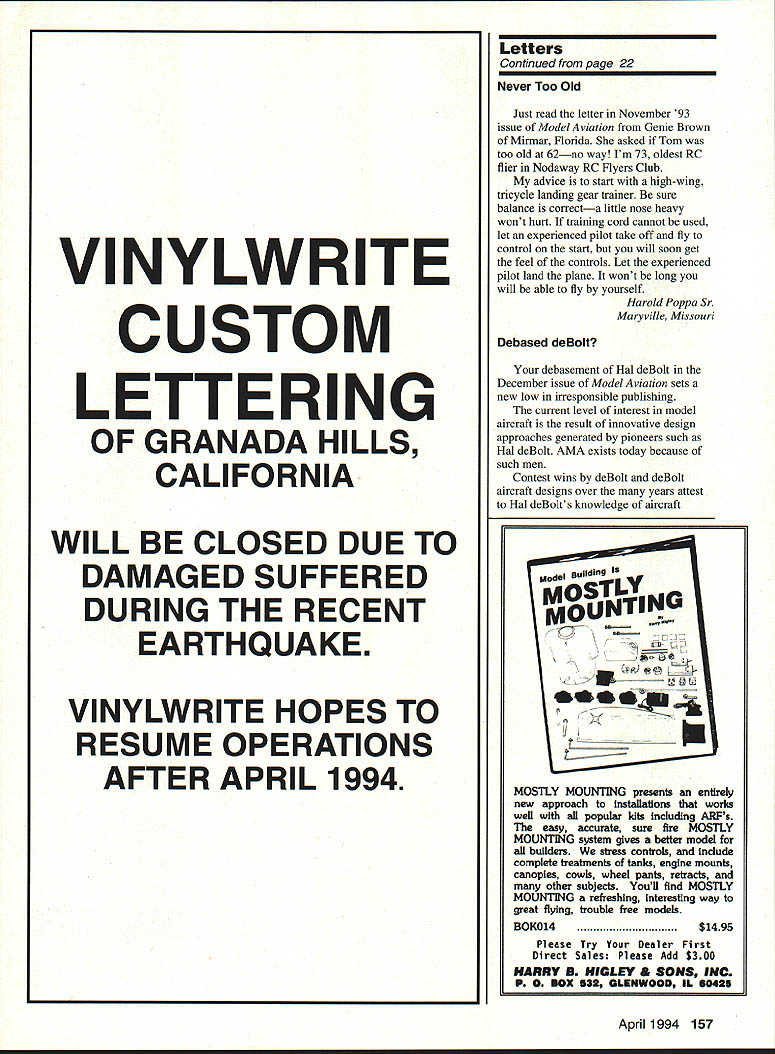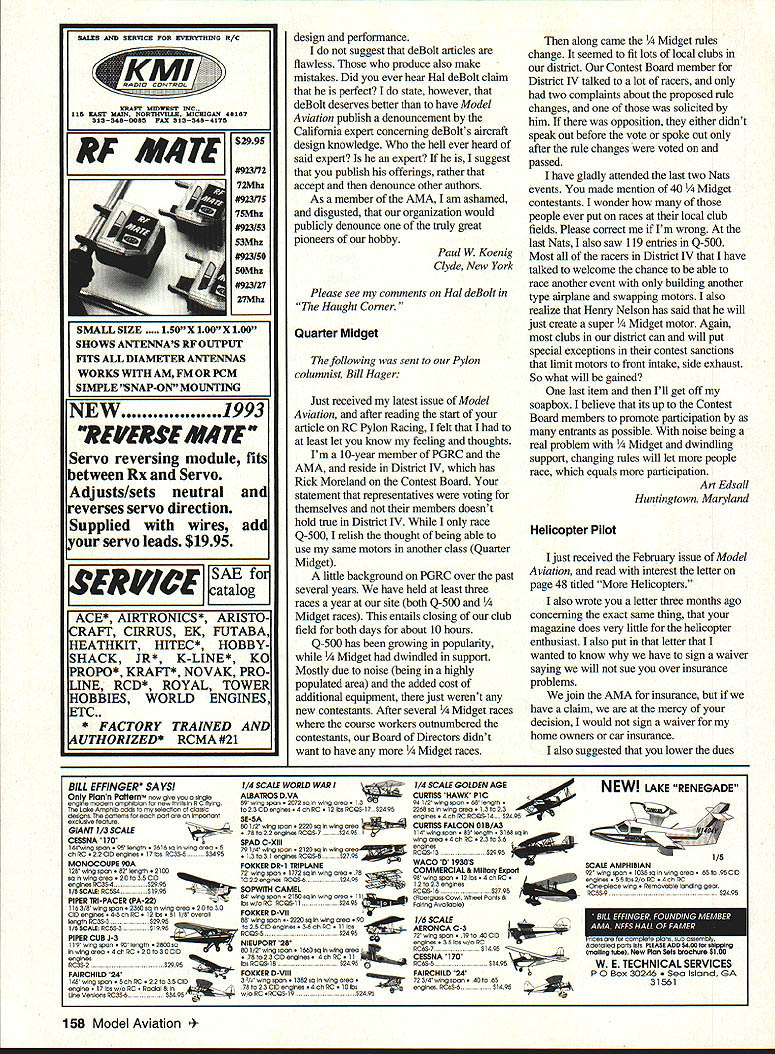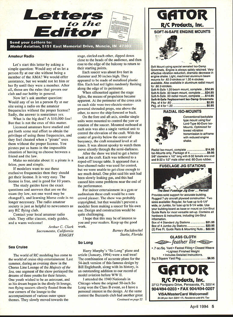 Letters tc Editor Amateur Radio Lets start letter asking simple question Would us let person fly site being member AMA would offer assistance would let him fly until member After rules govern club hobby general Now lets ask another question Would us let person fly site using radio amateur frequencies proper license Sadly answer sometimes yes What big deal $10000 fine crux matter Licensed amateurs have studied put forth some real effort obtain privilege using frequencies feel cheated pirate uses proper license pirates put us hams impossible situation having choose between friend law Make no mistake about pirate felon pure simple modelers want use exclusive frequencies should get license very easy license free good 10 years study guides have exact questions answers exam law word may changed learning Morse code no longer necessary radio amateur society just helpful newcomers RC flying club Contact local amateur radio club offer classes study guides warm welcome Arthur C Clark Sacramento California KD6GBY Sea Cruise world RC modeling has come world cruise ship entertainment Last summer during evening show Chorus Line Lounge Majesty Sea segment show portrayed dreams three youths futures youth wished astronaut dream began dimly lit lounge two flying saucers silently floated rear corners lounge accompaniment various outer space themes slowly moved towards stage circled other dipped down close heads audience rose edge balcony return starting points saucer about five feet diameter 30 inches high appeared made metalized plastic film red lights randomly flashing along edge its perimeter silhouetted against stage lights means propulsion became apparent perimeter cross axis side two electric-motorpowered shrouded props above other move ship forward back fore aft axis similar single units mounted control yaw rotation saucer Mounted outboard axis also single vertical unit control elevation craft center gravity below center buoyancy craft remained level times almost spooky watch move silently through semi-darkness After show tried get better look craft tethered roped-off lounge table appeared four-channel radio used control unable get close enough see much detail pilot said unit slowly leaking gas caused him some problems near end performance indoor entertainment gym auditorium craft would sure crowd pleaser show probably copyrighted wouldnt prevent modeler making saucer own use Design construction would quite challenging hope may interest readers Keep up good work Barney Ruckdeschel Starke Florida So Long Harry Murphys So Long plane article January 1994 real treat combination accurate plans 54-inch version famous design Bill Englehardt along its history outstanding addition record model aviation before WW II attended 1940 Nationals Chicago original 50-inch So Long won Class B event have personal interest design same contest Buzzards club another great Continued page 22 GEITO1I RIC Products Inc SOFT-N-SAFE ENGINE MOUNTS Soft Mount using special serrated Iso-Damp Grommets Engine always safely retained Very eftective vibration reduction dramatic decrease engine shake Light machined aluminum beam mounts 60 2-strokes 120 4-strokes available Also available aluminum radial mount 60 2-strokes Soft-N-Safe 120 beam mount complete . $3495 Soft-N-Sate 60 beam mount complete 5 SoftN-Sate 60 radial mount complete 95 Soft-N-Safe Replacement Iso-Damp Grommets Pkg ot 4 60$295 Pkg ot 4 120$595 RADIAL ISO-MOUNTS 4 Conventional backplate type mount using four Lord-Type 60-Duro IsoMounts Optimized lowest vibration transmission airframe reduced engine shake Radial Iso-mount complete $1495 Iso-Mounts Package ot 4 $995 5/8 diameter x 1/2 long 8-32 female end 8-32 x 1/2 male other end 60-Duro rubber 4 aest Fuselage Provides solid support accurate building Rugged 7-ply aircraft plywood construction Two sizes available Regular tor fuse up 6-1/4 wide Jumbo fuse up 9-1/4 wide Use building board base mount Uni-Strut Guide Rails versatile set-up Contains hardware & instructions including Uni-Strut information Box 4 Standard Jig Stations $2195 Box 4 Jumbo Jig Stations 2395 2 Five Ft Guide Rails & Mounting Nuts . $2295 GLASS CLOTH 7 oziSq Yard est Filling est Weave Lightest Finished Weight Includes Detailed Instructions Big 3 Square Yard Pkg $895 G6TOR RIC Products Inc 3713 Pompano Drive Pensacola FL 32514 904/494-0203 904/494-0207 VISA/MasterCard Welcomed $400 per item S5H esidents add 6% Tax April 1994 5 now starting trainer sequence next years shows During year Mike has progressed Sig Clipped-Wing Cub powered Q35 Nosen P-51 Brian flying Koinmander Gilson QDB biplane pulled G-62 next year planning flying Sig King Kobras loose formation Follow example youths doing what challenge part something promoting model aviation growing up sense accomplishment wish kids best hope find big kids work ers Continued page 5 original design Joe Konefes Buzzard Bombshell Class C winner Both planes went published kitted About 10 15 years ago saw Bill Englehar dts original So Long Chicago-area OldTimer contest didnt know time actually same seen flying Nationals some 40 years earlier Harry Murphys story shed whole new light Thank publishing such fineflying model design interesting history accompanies Jim Alaback San Diego Cal jfornia Hooked Two years ago 15-year-old grandson Nels Powell visited grandpa Nels Jensen Iowa hooked him model airplanes Since senior Nels has spent happy hour building repairing planes Hes also met whole new circle interesting friends Both grandfather grandson like tinkering regularly come up innovations such useful storage device grandpa Nels fashioned out -inch steel shop bent prong easily slips over under wings plane can hoisted up ceiling out harms way Vickie Jensen Vancouver BC Canada Continued page 157 RED MAX FUEL Order Form CALL OR USE THIS HANDY ORDER FORM TO SPEED YOUR ORDER FILL IN OTY ON THE LEFT THE TOTAL ON RIGHT Freight free qts gals No handling charge Freight collect drums Deduct 3% prepay Mis qty Total qty determi