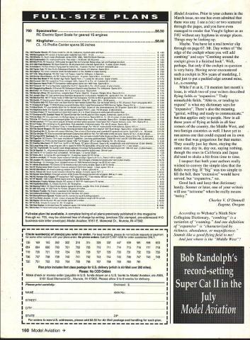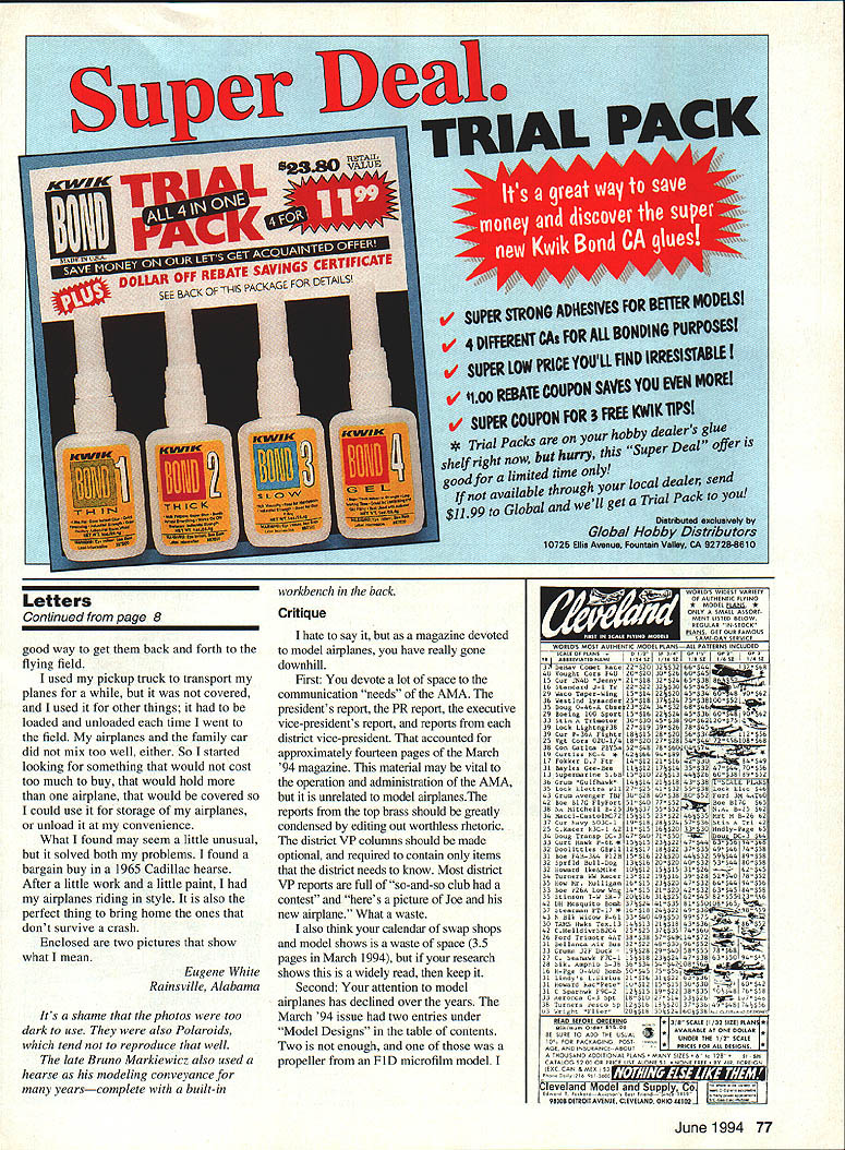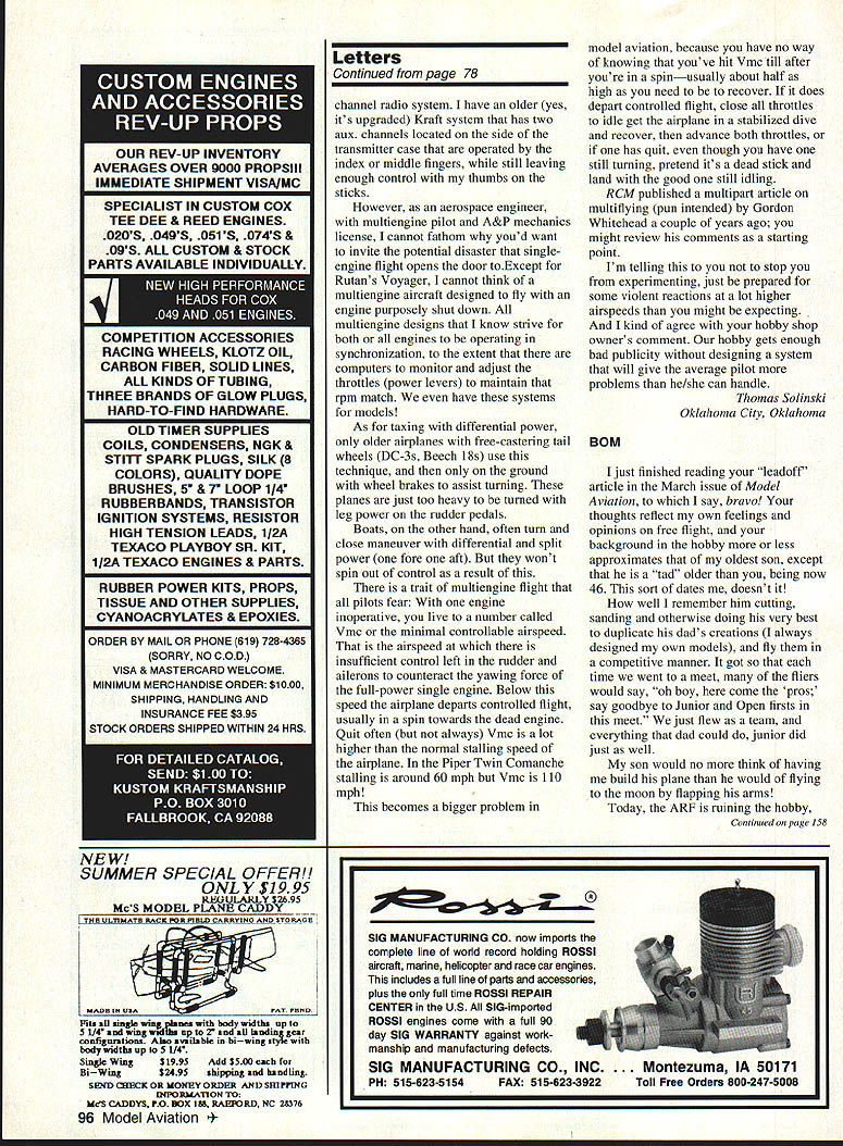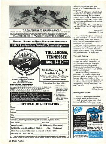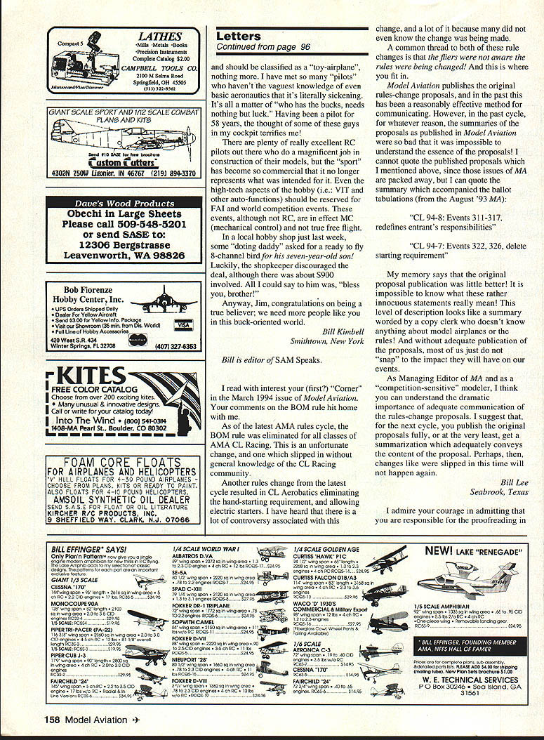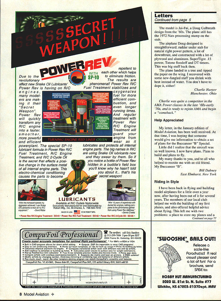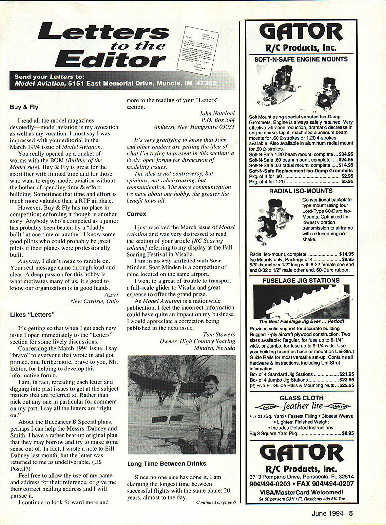 Letters tc EcU tcw Buy & Fly read model magazines devotedlymodel aviation avocation well vocation must say impressed editorial March 1994 issue Model Aviation really opened up bucket worms BOM Builder Model rule Buy & Fly great sport flier limited time want enjoy model aviation bother spending time & effort building Sometimes time effort much valuable RTF airplane However Buy & Fly has no place competition enforcing though another story Anybody whos competed junior has probably beaten daddy built time another know some good pilots could probably great pilots planes professionally built Anyway didnt mean ramble real message came through loud clear deep passion hobby what motivates us Its good know organization good hands Azarr New Carlisle Ohio Likes Letters Its getting get new issue open immediately Letters section some lively discussions Concerning March 1994 issue say bravo everyone wrote got printed furthermore bravo Mr Editor helping develop informative forum am fact rereading letter digging past issues get subject matters referred Rather pick Out particular comment part say letters right About Buccaneer B Special plans perhaps can help Messrs Dabney Smith have rather beat-up original plan may borrow try make some sense out fact wrote note Bill Dabney last month letter returned undeliverable US Postal Feel free allow use name address reference give correct mailing address will pursue continue look forward 1 reading Letters section John Nataloni PO Box 544 Amherst New Hampshire 03031 Its very gratifying know John other readers getting idea what im trying present section lively open forum discussion modeling issues idea controversy opinions rebel-rousing communication communication have about hobby greater benefit us Correx Ijust received March issue Model Aviation very distressed read section article [RC Soaring column referring display Fall Soaring Festival Visalia am no way affiliated Soar Minden Soar Minden competitor located same airport went great trouble transport full-scale glider Visalia great expense offer grand prize As Model Aviation nationwide publication feel incorrect information could have quite impact business would appreciate correction being published next issue Since no else has done am claiming longest time between successful flights same plane 20 years almost day Continued poge 8 GEITOR RIC Products Inc SOFT-N-SAFE ENGINE MOUNTS Soft Mount using special serrated Iso-Damp Grommets Engine always safely retained Very effective vibration reduction dramatic decrease engine shake Light machined aluminum beam mounts 60 2-strokes 120 4-strokes available Also available aluminum radial mount 60 2-strokes Soft-N-Sate 120 beam mount complete . $3495 Soft-N-Sate 60 beam mount complete 5 SoftN-Safe 60 radial mount complete 95 Soft-N-Safe Replacement Iso-Damp Grommets Pkg 4 60 $295 Pkg 4 120 $595 RADIAL ISO-MOUNTS Conventional backplate type mount using four Lord-Type 60-Duro IsoMounts Optimized lowest vibration transmission airframe reduced engine shake Radial Iso-mount complete $1495 Iso-Mounts Package 4 $995 5/8 diameter x 1/2 long 8-32 female end 8-32 x 1/2 male other end 60-Duro rubber Provides solid support accurate building Rugged 7-ply aircraft plywood construction Two sizes available Regular fuse up 6-1/4 wide Jumbo fuse up 9-1/4 wide Use building board base mount Uni-Strut Guide Rails versatile set-up Contains hardware & instructions including Uni-Strut information Box 4 Standard Jig Stations $2195 Box 4 Jumbo Jig Stations 2395 2 Five Ft Guide Rails & Mounting Nuts . $2295 GLASS CLOTH 7 oz/Sq Yard est Filling est Weave Lightest Finished Weight Includes Detailed Instructions Big 3 Square Yard Pkg $895 IEITOR RIC Products Inc 3713 Pompano Drive Pensacola FL 32514 904/494-0203 904/494-0207 VISA/MasterCard Welcomed $400 per item S&H esidents add 6% Tax June 1994 5 FUSELAGE JIG STATIONS w Tom Stowers Owner High Country Soaring Minden Nevada Long Time Between Drinks Due revolutionary affect new Snake Oil Lubricants Power Rev havina RIG engines model ers mak ing Secret Weapon r Rev will quickly transform RIG engine faster smoother powerful efficient powerplant special SP-1O lubricant formula Power Rev RIG Fuel Treatment RIG Engine Treatment RIG 2-Cycle Oil secret effects posi tive change surface metal internal engine parts electro-chemical conditioning causes parts become repellent WITH other helps sr-io eliminate friction results phenomenal Power Rev RIG Fuel Treatment stabilizes oxygenates fuel efficient com bustion yen longer running times 4nd regular treatment Power Rev RIG Engine Treatment will guard engine wear lubricates protects internal engine parts big names RIG using Snake Oil lubricants now swear So notice bottle Power Rev hidden buddies field box youll know hasnt told about it. thats secret weapon LIICANTS After increased speeds my Available RIC Outlets Nationwide Aher tO years experience Aggressor achieved use Snake Exclusively Manufactured Distributed dscted fan engines nothing cornOil Lubricants treat alt RIC Robert Mfg Inc StOharles IL 708-584-7616 pares pedonnence gained equipment--David Ribbe ____from using Power Rev Additives MADE IN 55A _____ t593fOO5fTfSF5--0 ennis Crooks Power Rev RIC Engine Treatment SO-Ol r Rev R/G Fuel Treatment- 50-02 r Rev RIG 2-Cycle Oil SO-06 Letters Continued page 5 model Jai-Fai Doug Gaibreath design 60s plane still has 1972 Nats processing stamp stab airplane Doug designed straightforward rudder under stab natural right power pattern lot downthrust constructed lot plywood aluminum SuperTigre 15 power Tatone floodoff DT timers big stuff back plane landed tree ripped paper wing recovered some new-fangled stuff shrink heat instead water dont have dope either Charlie Harper Blanchester Ohio Charlie quite competitor AMA Power classes late 60s-early 70s ready rejoin AMA begin comeback Help Appreciated letter January edition Model Aviation has well received time hoping someone would give information obtain set plans Buccaneer B Speci