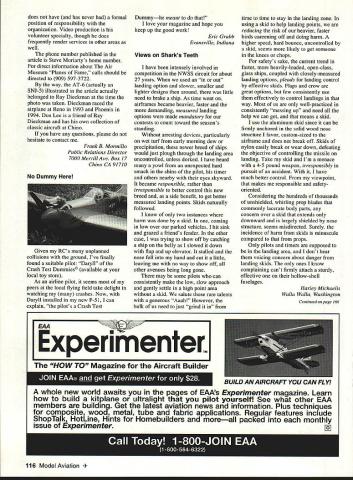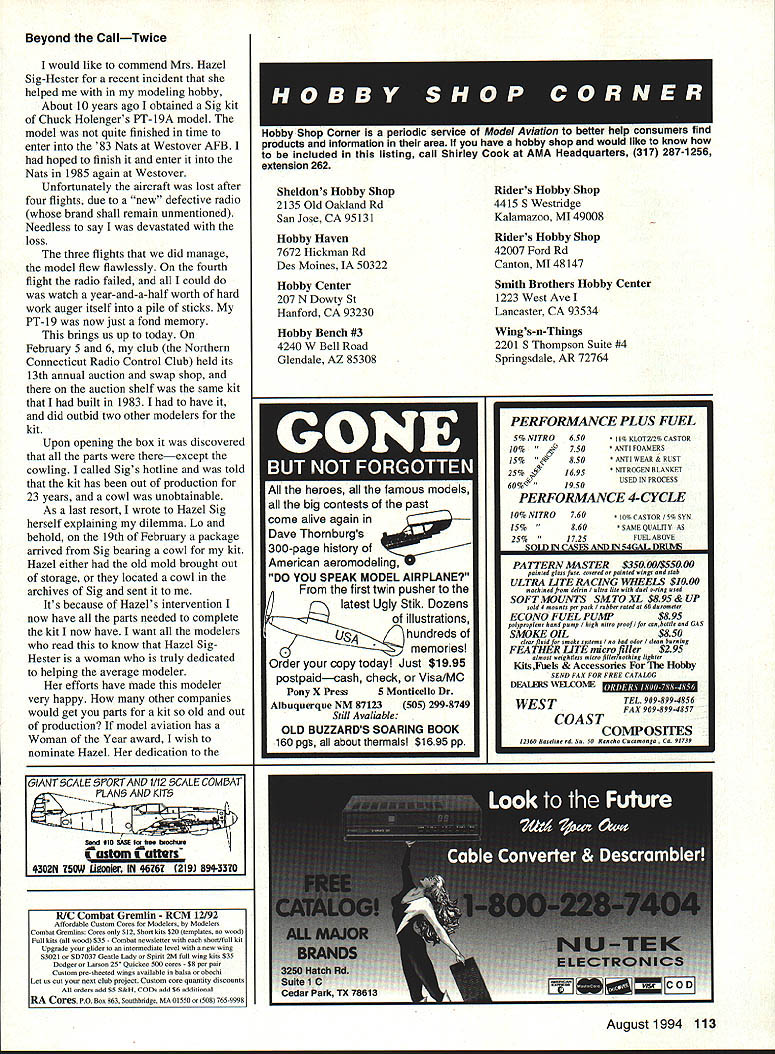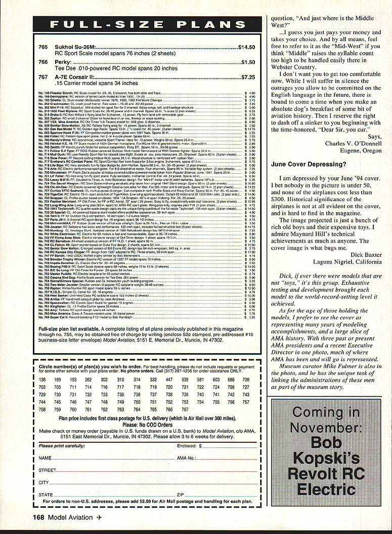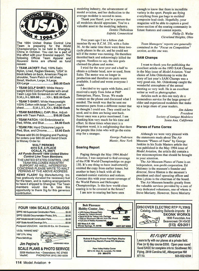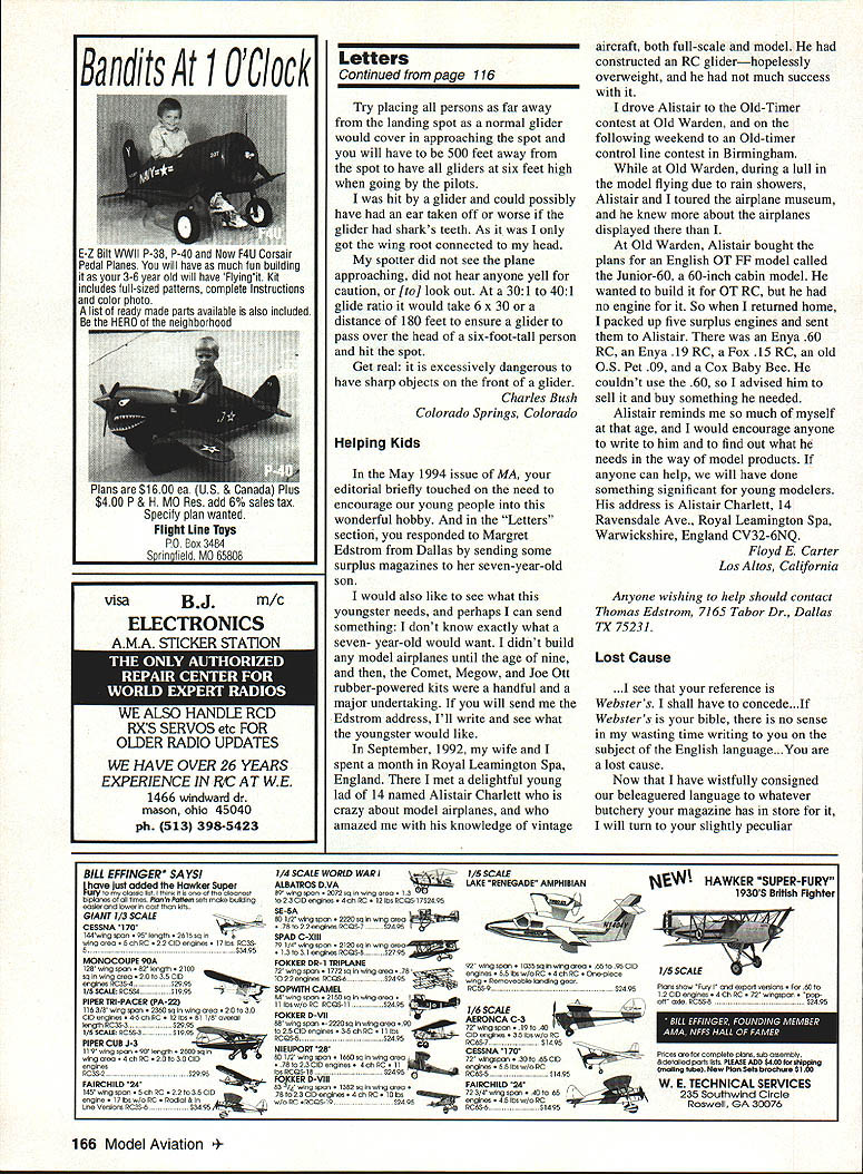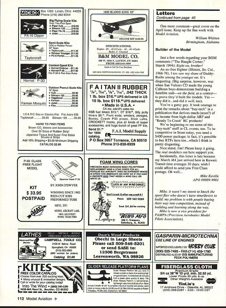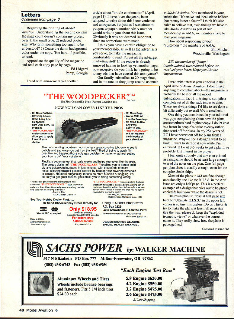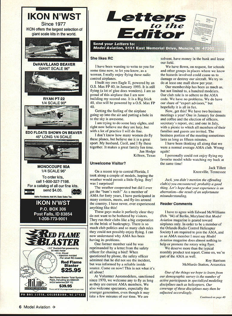 IKON NWST Since 1977 IKON offers largest selection giant scale kits world Letters tc Eclitcr likes RC have wanting write some time now let know woman really enjoy flying radio control airplanes built own Eagle II powered OS Max FP 40 January 1993 still flying lot glue does wonders am proud airplane am now building second Big Stick 40 also will powered 05 Max FP 40 Getting feeling airplane going up air putting hole sky awesome am trying some lazy eights right now believe lazy lot practice will fine dont know women fly planes believe great sport husband Cecil fly together makes great family fun time Jan Hodge Killeen Texas Unwelcome Visitor recent trip central Florida took along couple models hoping weather would permit little flying Boy surprised weather cooperated did ever get hums rush As member AMA forty years have participated contests meets fly-ins around country have never ever experienced anything like guys make perfectly clear want bothered visitors run clubs like big corporation brink bankruptcy much club politics club rules could possibly enjoy flying can now understand AMA has having its problems former member said reprimanded letter safety officer chasing bird questioned phone safety officer admitted did see incident informed reliable inside source Come now what its about Volunteer Aeromodelers sanctioned since 1970 welcome fly long current AMA members also welcome spectators especially younger generation though may take few minutes time solvent have money bank lease field have flown request schools other groups places know hazards involved could cause us damage destroy aircraft try least mall show per year membership has much limited hundred modelers club rule adhere AMA code have no problems have share expert advisors hopefully fun Now get have two business meetings year January donuts coffee election officers secretary s report etc July picnic members families guests invited business portion meeting sometimes lasts long fifteen minutes have thinking along normal average AMA club Wrong agailt personally could enjoy flying favorite model watching back same time Jack Tillett Knoxville Tennessee Jack didn t mention offending clubs encountered probably good thing Lets hope experience aberrationthe result unfortunate misunderstanding Reader Comments have agree Edward Mc Williams Feb 94 Berlin Maryland Model Aviation magazine geared toward airplanes order member Orlando Radio Control Helicopter Society am required join AMA AMA member must say Model Aviation magazine does almost nothing help promote rotary wing flyer deserve typical monthly product test report Come part AMA well Roy Harrison McMurdo Station Antarctica things hope learn demographic survey number active participants specialized modeling disciplines such helicopters coverage disciplines may adjusted accordingly Continued page 40 6 Model Aviation VILLA GIANT SCALE 96 RYAN PT-2 1/4 SCALE EDO FLOATS SHOWN ON BEAVER 46 LONG 1/4 SCALE MONOCOUPE 90A 1/4 SCALE 96 order kits call 1-800-327-7198 catalog fine kits $400 25 Ducted-Fan powered 50 watt motor 6 oz thrust ectIon molded small RC models Red Flame Blaster seaO $1 $2595 Red Flame Blaster Total System Pack including six 600mAh jfl NiCd betterles DF 12 Please a0432 50 posrageIflandrng yotr total gI Letters Continued page 6 Regarding printing Model Aviation Understanding need contain page count doesnt contain protest over 1 small type 2 reduced photo size print something too small understood 3 Cease damn background color under copy Too hard possible read Appreciate quality magazine read copy page page Ed Lidgard Perry Georgia read amazement yet another No Bubbles Covering Looks Great Long After Its Applied Film Over Film Nc Problem tIll WlSltPtO3KH5 easily converts allow apply trims choice Made USA Steel Constroction toy Only $1895 add $260 shipping CA tesindents add $7 75% soles tao orders only1-800-336-5602 Sorry No COOs article about article continuation April page 11 have over years tempted write about inconvenience annoyance just about put pen paper another AMA member would write about issue Obviously deemed important since no corrections made think have certain obligation membership well advertisers serve make magazine comfortable read Forget ad-target marketing stuff reader already annoyed having look up yet another page receptive think hes going to ads have caused annoyance family subscribes 20 magazines jump around much No Sags Works Iron-On Coverings No Need Use Any Prep Easy Use lilly WOODPbKIKER will weaken integrity structure Tired spending countless hours doing great covering job see bubble sag once get field Tired trying appiy film over film trapping ugly gas bubbles no matter what heat setting iron alone Finaily covering fool fhat really works helps cover like pros unique design TIdE WOODPECKSI{ enables fo aerate solid ply balsawood surfaces just minutes thousands microholes allowing trapped gasses created heating covering materials escape No oulgassing means no bubbles sagging Its easy get great results youll think youre doing something wrong last can get professional looking esults monolsote THE WOODPECKER" does oil soy would wholeheartedly recommend modeler oses iron-on conering try -Oavid L Slier IMAA Direttor District IV THE WOODPECKER replaces pricking balsa sheet thoasands pinholes before opplying ironon esoerings eteates dean bobble-free surface ion-on film tabrios Its qoicls once ysu try poall neser pin routise againi -Jelt Tiny AC Stale Editor Model Asiabon Magazine June 1994 DEALER INGUIRIES WELCOME SPECIAL DEALER PACKAGE. Model Aviation mentioned article its naive idealistic believe money factor think its also naive believe though have take Model Aviation part membership AMA members have read magazine about responding customers members AIVIA Bill Mitchell Woodinville Washington Bill number jumps continuations reduced before received letter Hope like improvement read interest editorial April issue ModelAviation dont have anything complain aboutthe