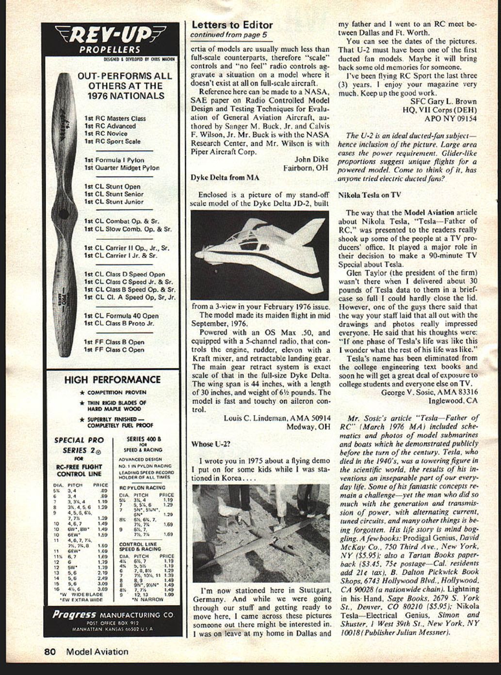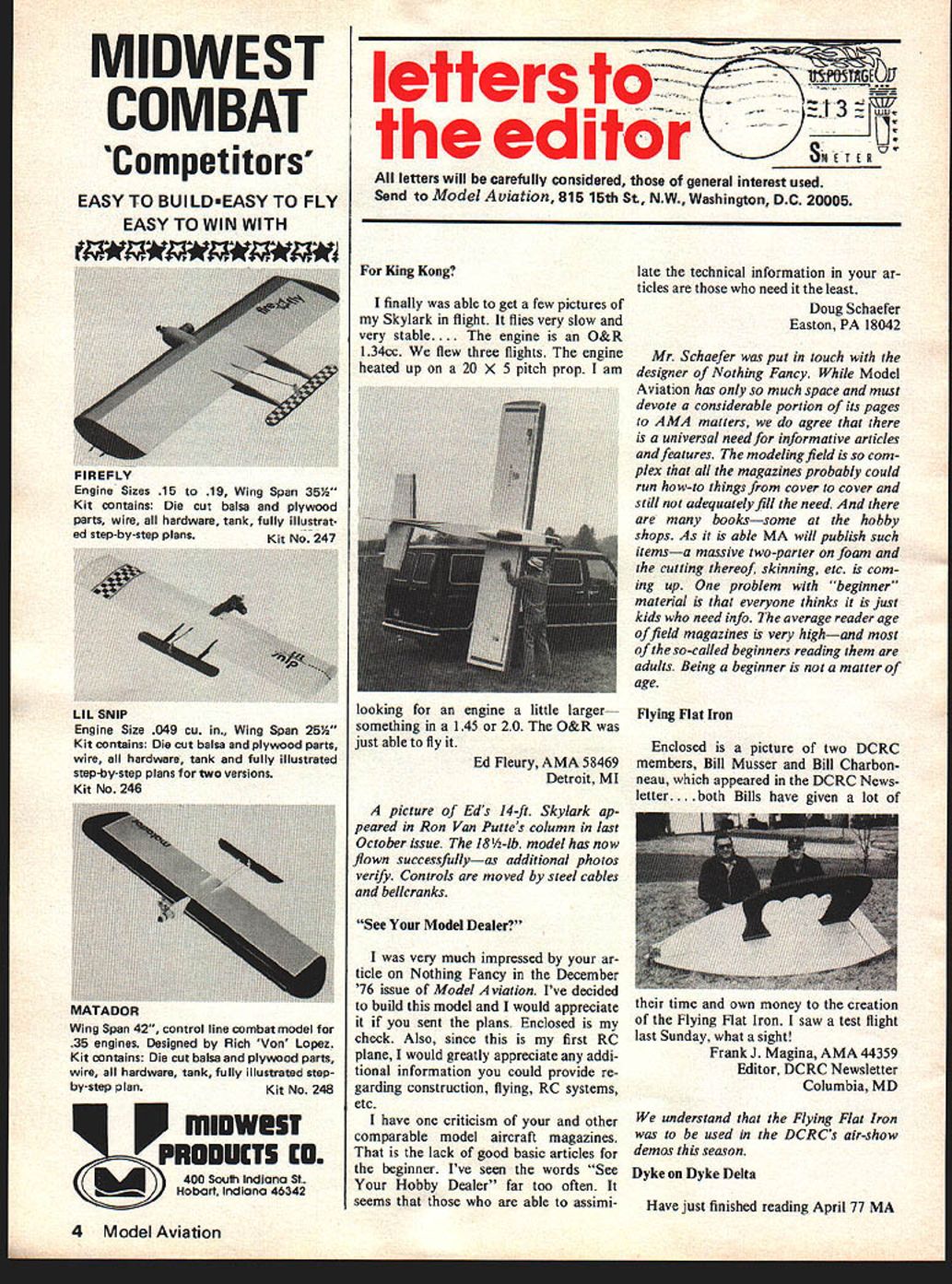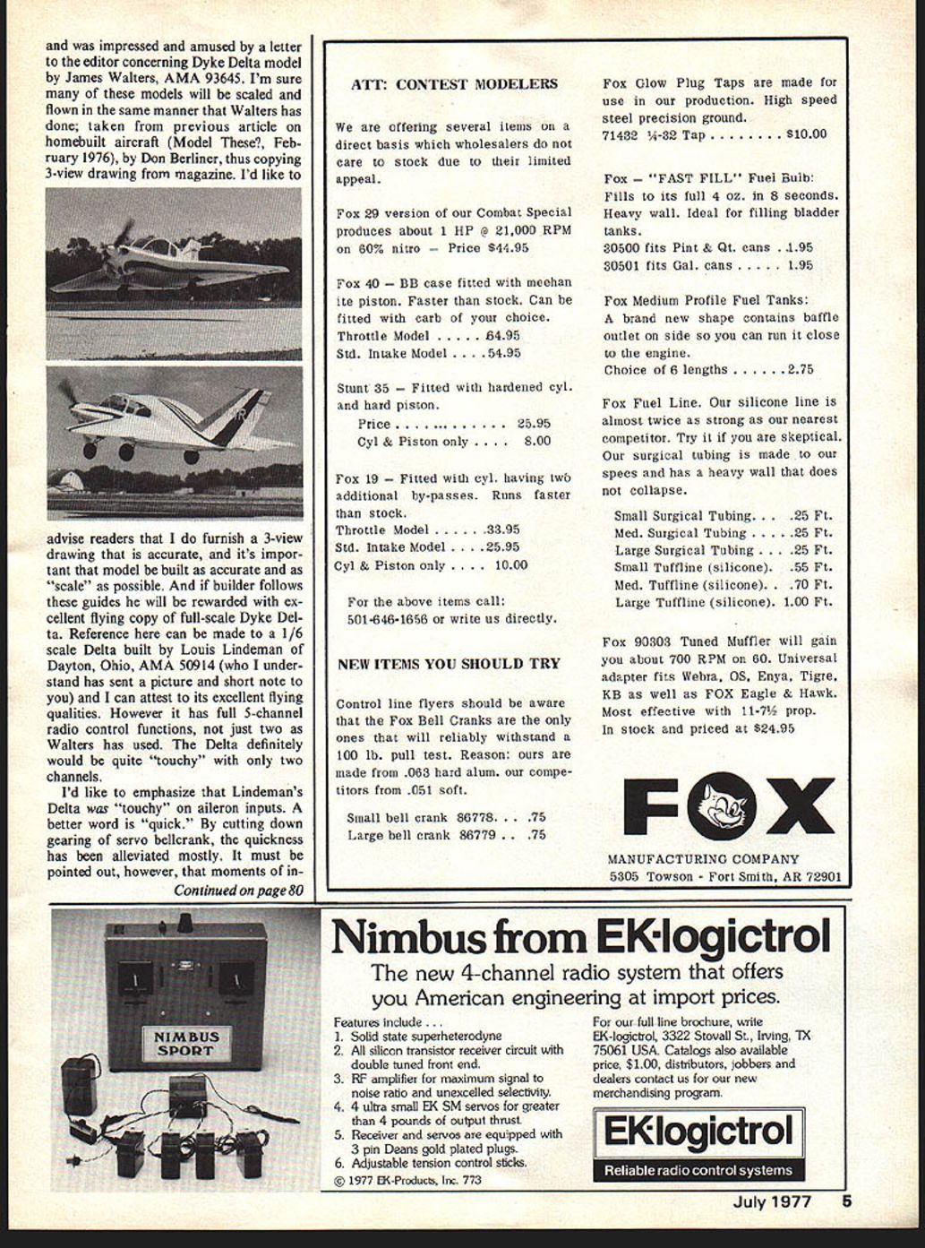 MIDWEST COMBAT Competitors EASY TO BUILDEASY TO FLY EASY TO WIN WITH LIL SNIP Engine Size 049 cu Wing Span 25% Kit contains Die cut balsa plywood parts wire hardware tank fully illustrated step-by-step plans two versions Kit No 246 MATADOR Wing Span 42 control line combat model 35 engines Designed Rich Von Lopez Kit contains Die cut balsa plywood parts wire hardware tank fully illustrated stepby-step planKit No 248 P minwes ~PRODUCT5 CO (4 400 South Indiana St. Hobart IndIana 46342 letters GE editor___ SM tters will carefully considered general interest used Send Model Aviation 815 15th St NW Washington DC 20005 King Kong finally able get few pictures Skylark flight flies very slow very stable.. engine O& R 134cc flew three flights engine heated up 20 X 5 pitch prop am looking engine little larger something 145 20 O&R just able fly Ed Fleury AMA 58469 Detroit MI picture Eds 14-ft Skylark ap peared Ron Van Puttes column last October issue 18-lb model has now flown successfullyas additional photos verify Con trols moved steel cables belicranks See Model Dealer very much impressed ar ticle Nothing Fancy December 76 issue Model Aviation Ive decided build model would appreciate sent plans Enclosed check Also since first RC plane would greatly appreciate addi tional information could provide re garding construction flying RC systems etc have criticism other comparable model aircraft magazines lack good basic articles beginner Ive seen words See Hobby Dealer far too often seems able assimi late technical information ar ticles need least Doug Schaefer Easton PA 18042 Mr Schaefer put touch designer Nothing Fancy Model Aviation has much space must devote considerable portion its pages AMA matters agree universal need informative articles features modeling field com plex magazines probably could run how-to things cover cover still adequately fill need bookssome hobby shops As able MA will publish such itemsa massive two -parter foam cutting thereof skinning etc com ing up problem beginner material everyone thinks just kids need info average reader age field magazines very highand so-called beginners reading adults Being beginner matter age Flying Flat Iron Enclosed picture two DCRC members Bill Musser Bill Charbon neau appeared DCRC News letter. h Bills have given lot time own money creation Flying Flat Iron saw test flight last Sunday what sight Frank J Magma AMA 44359 Editor DCRC Newsletter Columbia MD understand Flying Flat Iron used DCRCs air-show demos season Dyke Dyke Delta Have just finished reading April 77 MA 4 Model Aviation FIREFL Engine Sizes 15 19 Wing Span 35% Kit contains Die cut balsa plywood parts wire hardware tank fully illustrat ed step-by-step plans Kit No 247 impressed amused letter editor concerning Dyke Delta model James Walters AMA 93645 Im sure models will scaled flown same manner Walters has done taken previous article homebuilt aircraft Model Feb ruary 1976 Don Berliner thus copying 3-view drawing magazine Id like advise readers furnish 3-view drawing accurate its impor tant model built accurate scale possible builder follows guides will rewarded ex cellent flying copy full-scale Dyke Del ta Reference can made 1/6 scale Delta built Louis Lindeman Dayton Ohio AMA 50914 under stand has sent picture short note can attest its excellent flying qualities However has full 5-channel radio control functions just two Walters has used Delta definitely would quite touchy two channels Id like emphasize Lindemans Delta touchy aileron inputs better word quick cutting down gearing servo bellcrank quickness has alleviated mostly must pointed out however moments inContinued page 80 ATT CONTEST MODELERS offering several items direct basis wholesalers care stock due limited appeal Fox 29 version Combat Special produces about 1 HP @ 21000 RPM 60% nitro e $4495 Fox 40 ase fitted meehan ite piston Faster stock Can fitted carb choice Throttle Model495 Std Intake Model 495 Stunt 35 ed hardened cyl hard piston Price2595 Cyl & Piston 00 Fox 19 ed cyl having twb additional by-passes Runs faster stock Throttle Model3395 Std Intake Model 95 Cyl & Piston . above items call 501-646-1656 or write us directly NEW ITEMS YOU SHOULD TRY Control line flyers should aware Fox Bell Cranks ones will reliably withstand 100 lb pull test Reason made 063 hard alum compe titors 051 soft Small bell crank 86778 Large bell crank 86779 Features inude. 1 Solid state superheterodyne 2 All silicon transistor receiver circuit double tuned front end 3 RF amplifier maximum signal noise ralio unexcelled selectivity 4 4 ultra smafl EK SM servos greater 4 pounds output thrust 5 Receiver servos equipped 3 pin Deans gold plated plugs 6 Adjustable tension control sticks 1977 EK-Products Inc 773 Fox Glow Plug Taps made use production High speed steel precision ground 71432 V4-32 Tap $1000 Fox FILL Fuel Bulb Fills its full 4 oz 8 seconds Heavy wall Ideal filling bladder tanks 30500 fits Pint & Qt cans 30501 fits Gal cans 195 Fox Medium Profile Fuel Tanks brand new shape contains baffle outlet side can run close engine Choice 6 lengths 275 Fox Fuel Line silicone line almost twice strong nearest competitor Try skeptical surgical tubing made specs has heavy wall does collapse Small Surgical Tubing t Med Surgical Tubing25 Ft Large Surgical Tubing Ft Small Tuffline silicone 55 Ft Med Tuffline silicone t Large Tuffline silicone 100 Ft Fox 90303 Tuned Muffler will gain about 700 RPM 60 Universal adapter fits Webra OS Enya Tigre KB well FOX Eagle & Hawk Most effective 11-7 prop stock priced $2495 FX our-full-line brochure write EK-logictrol 3322 Stovall St Irving TX 75061 USA Catalogs also available price $100 distributors jobbers dealers contact us new merchandising program EI log ictrol - .- . S S July19775 MANUFACTURING COMPANY 5305 Towson Fort Smith AR 72901 Nimbus EKiogictrol new 4-channel radio system offers American engineering import prices 1st RC Masters Class 1st RC Advanced 1st RC Novice 1st RC Sport Scale 1st Formula Pylon 1st Qua