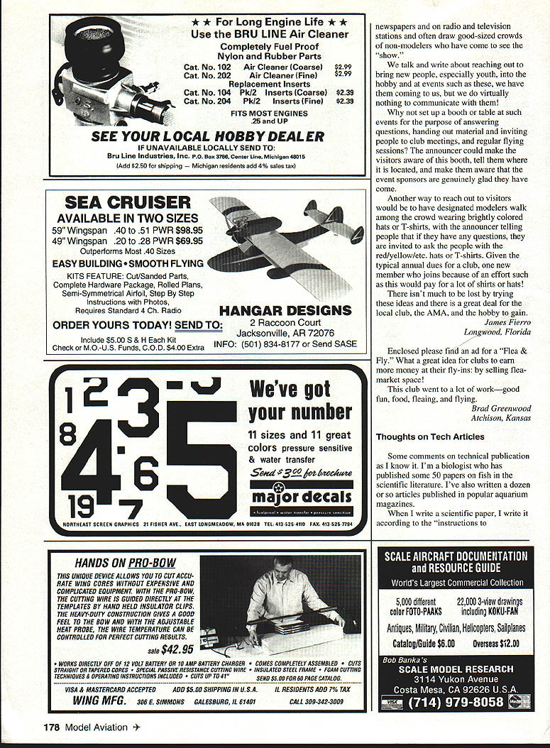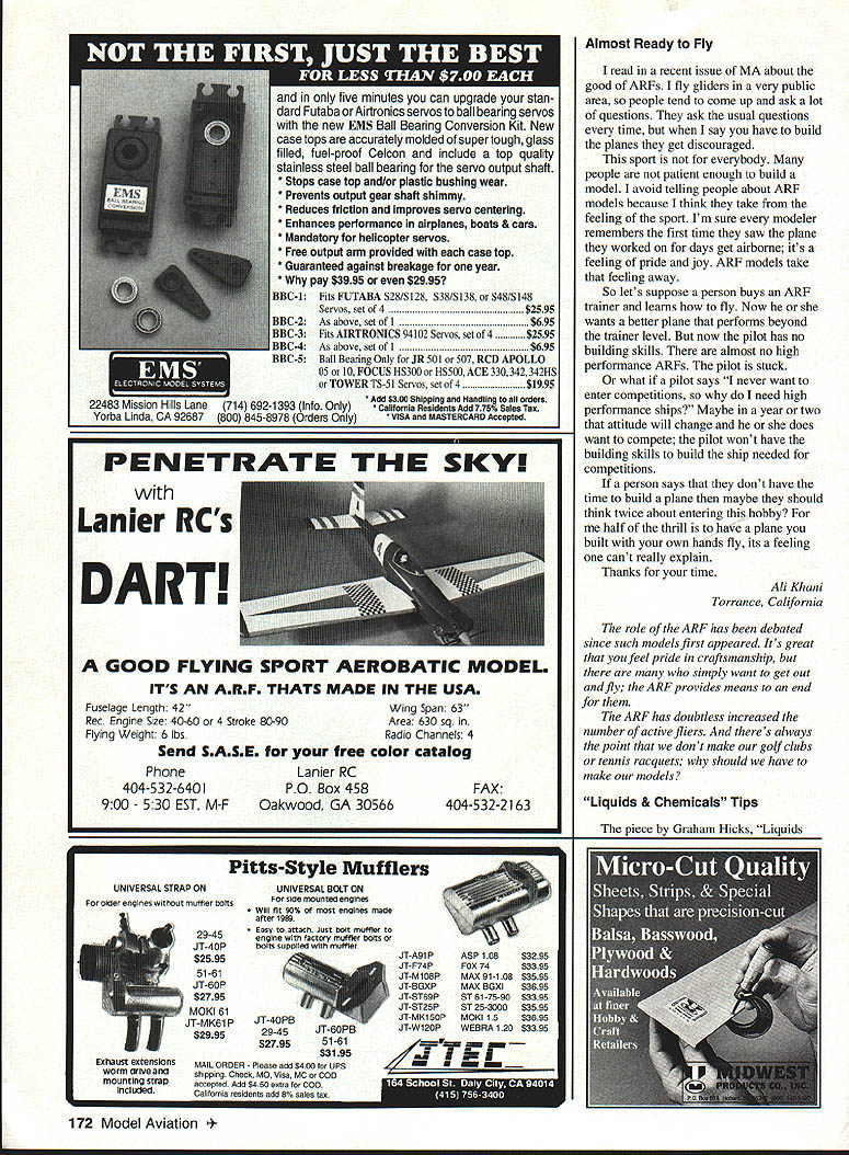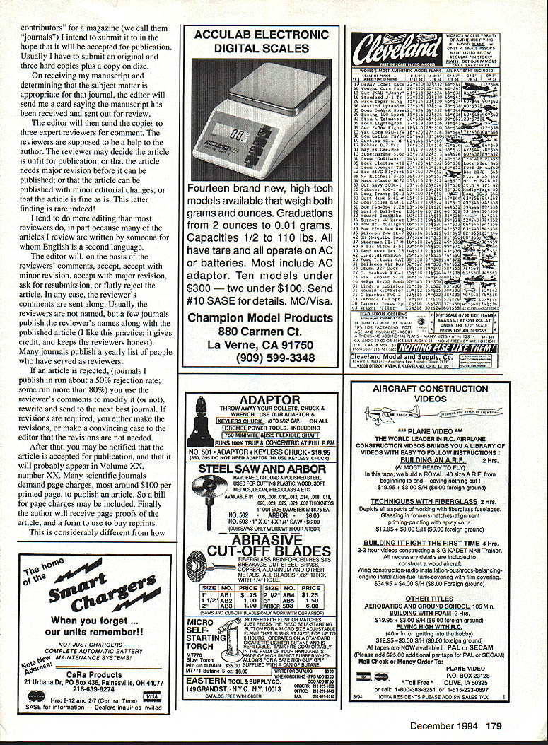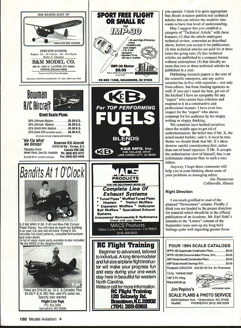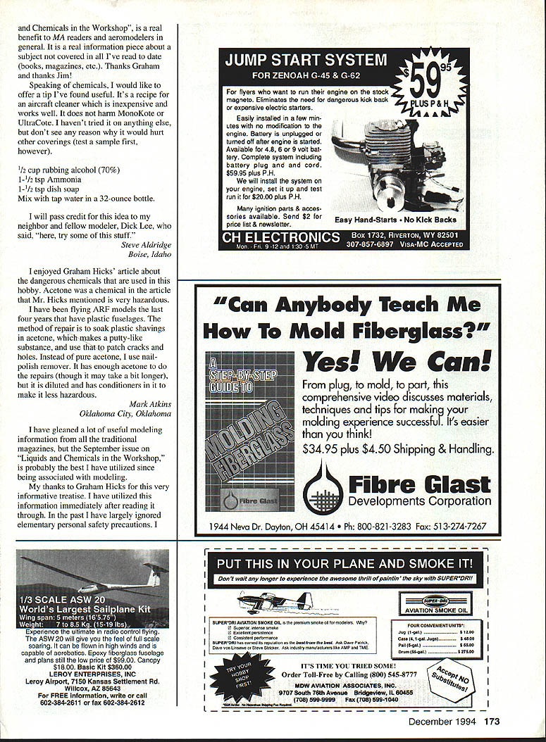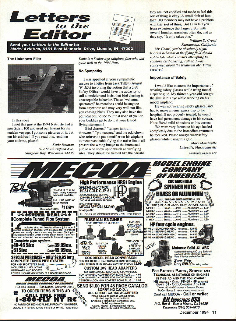 Letters tc EcIitcr met guy 1994 Nats new Spirit 100 used hi-start its maiden voyage got some pictures address read send address please Katie Bosman 512 South Oxford Ave Sturgeon Bay Wisconsin 54235 --4--Katie Senior-age sailplane flier did quite well 1994 Nats No Sympathy appalled sympathetic answer letter Jack Tillett August 94 MA involving notion club Safety Officer would have audacity call modeler insist bird chasing unacceptable behavior welcome spectators mentions could anyone anywhere may very well like chasing birds may also have political pull see buddies get leased flying site again Bird chasers temper tantrum throwers pit buzzers odd clown refuses put muffler airplane meet reasonable flying site noise limits present wrong image interested public show up watch flying sites should treated like pariahs coddled made feel sort thing okay small club less 100 members may have problem sort thing can tell experience larger clubs several hundred members often say takes William D Crowl Sacramento California Mr Crowl youre absolutely right boorish behavior rheflyingfleld should tolerated wasnt attempting condone bird-chasing rather concerned about treatment Mr Tillett received Importance Safety would like stress importance wearing safety glasses using model airplane glue thirteen-year-old son got glue eye working model airplane wearing safety glasses make emergency trip hospital properly treated could have permanent damage cornea suffered mild abrasions cornea very fortunate eye healed completely due inunediate treatment received Please always wear safety glasses using glue Mary Mandeville Lakeville Massachusetts Continued page 170 aim Psrlsnuamci SPECIAL PURCHASE RJL K61 HPR1 GflLD CUP AI best totally American Made 61 available IL K61 w/std ish muffler eS18995 wig muffler r insUPER SEA L+ ii_ALL OTHER HP MODELS IN STO iPLL CES J IComplete Tuned P1 S stem i RUSSIAN ENGINES NO THROTTLE OR MUFFLERAME 049 SCHNUERLE Includes strap header silicone Joint tube &.tPORT ABN m ad expansion chamber pressure tap IncreasesPISTON/CYL power easily meets sound requirements Tuning in-USIDE EXHAUS atructiona included Great looking Black finish Tight nor 9 Emal extended headers available tor nes Com~tepipe system.IMAP3 15MK 17 TAIPHOON 15 146-euSiZIGLOWDIESEL ABC SIDE Sio3333DIESEL OR REARREAR EXHAU ST INTAKEINTAKESCHNUERLE L~4aS9Sa 9$3999PORT sesg SPECIAL PURChASE 62395COX DIESEL HEAD CONVERSION COMPLETE TUNED PIPE SYSTEM DIESEL HEAD CONVERSION FOR COX 049 FOR K&B SPORTSTER 2028USES TRUE 0-RING SEALED CONTRA PISTON 1299 INCLUDES ALL MOUNTING OM 049 HEAD ADAPTERS HARDWARE AND BOOSTS YOU CAN USE STANDARD GLOW PLUGS POWER 1500 RPMS WITHOUT NOISE INCREASECOX 049 HEAD ADAPTER FOR LONG PLUG 490 COX 049 HEAD ADAPTER FOR SHORT PLUG 490 TESTOR McCOY 049 ADAPTER LONG PLUG590 M*UEV9AVESDMPAFYDFAUWIM P0 Box 80830 San Manno California 91118 SEND $100 FOR 48 PAGE CATALOG TO ORDER ITEMS IN THIS AD SORRY NO CODs CALL TOLL FREEALL CREDIT CARDS ACCEPTED 04 Pnces subject change notice -800-FLY NY R@1o Limited supply some items Shipping Handling continental US NO PARTS OR TECHNICAL HELP FROM THIS NUMBER % Alaska $400 size order Hawaii & international higher LOCAL & INTERNATIONAL 1-818-FLY MY RC 399-6972 California Residents add 825% Sales Tax AWDEL IWIIIWE OMPA/IT 1FAUYfRC4 AMA MAAEIM 0 UK MUMINUM READ SIZES METRIC & US 6x1 -7x1 -8x1 -8x125-lOxl25 IS 6x32 8x32- 114x28 5/16x24 3/8x24 O ii r-ixBrass299Aluminum199 5/8 HEXBrass399Aluminum299 3/4 HEXBrass449Aluminum299 7/8 HEXBrass599Aluminum399 1 HEXBrass699Aluminum499 HP leEr cycle engines HPVT21 STANDARD HEAD eraziges 12999. HP dT21 BEARING HEAD .. ecazags 13999 HPVT49STANDARDHEAD senzwge 14999m HP VT 49 BEARING HEAD .. esGuwas Mutunuc Seiki 61 ABC Double Ball BearingABC Long Strake 81 prodoced 11w blest CNC madrinery Parts & Service available tram RJL sJ $9999 eduding matter PARTS ICE AND ECHNICAL ASSISTANCE ON ENGINES IN THIS AD AND THE FOLLOWING HB ENGINES KAVAN EK-SO HP ENGINES KRATT 61 COX CONOUEST 15 -RJL TAiPAN 40 HOK 5NGiNE5 Fovarse Ernssss McCoy Ssass 21 talAci HEAO SiNNED CAsE Dont Call MECQA Call write III ligusyw USA PO Box 5-SIERRA MADRE CA 91025 TEL EPHONE 818 359-0016 December1994 11 Unknown Flier tI IA i I(I i 111113 SAVE TINE & MONEY! 710 SOX PEA WRES s offyour knees seat capacity 300lbs udes storage wi/i hold up four transmitters udes Expanded Scale Voltmeter test RX & TX udes full featured MPI Super Power Panel udes alighted 12V master power switch udes 12 Vnicad battery charger udes built 12V glow fuel pump udes fuel storage plafform Room 2 12 V-lamp gell cells Automatic gell cell charge tester 5 compartment Uft out storage tray Vlea & Mastercard Accepted ORDER TOLL FIEE 800 468-2692 TIn Ha WeaL Mt8 U 011 Co. bn kdepoodenL nnrnoox Lhe iloL Bon Th814 &nppo.t ohm 9oL 9on 1oodnoL. -4/ S S S 0 S 0 S S 0 S S ZENOAH G23 G36 G45 062 Engines CUSTOMIZED MOUNTS MUFFLERS ACCESSORIES * SPRING STARTER 038045062 & QUADRA S SONBrodore SASE PECIALTIES2995 Enlalen Ave SIB 758-9179P0 Box 663 Pinde CA 94564 VISAIMCCKCOOCA Rn add Salen Tao JOHN ULLIVAN FOAM FLOATS 40 44 48 LIES Float Flying Video CUB 1/4 SCALE LANDING GEAR 2 SIZES Balsa USA etc w/Bungee Covers OOOSOO S/H 1/3 Balsa USA Covers $1300 S/H HOLIDAY SEASON SPECIAL ONLY $13995 Regular pr/ce $16995 PLUS SASS 5MPP1V6 S aMWW CALIFORNIA RESDFNrSAOD SALES AX Mar West Mfg Co Inc 3339 Fitzgerald Rd #1 Rancho Cordova CA 95742 TEL 916 961-4703 FAX 916 983-1923 BALSA 1/320 2 1/161 3 1/16X 3 1/165 4 3/322 2 3/32X 3 3/325 4 1/62 3 1/91 3 1/B 5 4 3/16X 2 3/16X 3 3/16X 4 1/42 2 1/4X 3 1/45 4 5/162 2 5/161 3 1/165 4 3/95 2 3/91 3 3/ 4 1/25 2 1/2 3 1/25 4 SHEETS 39 3040 3345 4560 7195 40SS 5269 7499 4359 6293 99119 5371 7499 105140 6567 96115 130-173 6597 102136 144190 75100 114152 170235 134179 173230 265353 hITIOMkL CBSTO3 COrDInG BALSA 1/090 0/09 0/390 0/9 0/990/3 9/9903/0 9/9293/32 9/3239/9 3/3290/3 3/fl05/9 "/9 9/B09/9 B' 92/ /30/I 5/92/0/2 3/B03/4 /9 9/22/942 0/233/3 9/905/9 STICKS 0 1L2 i0 iiS 09195 ~0 0 i~i0 i 21 2i 56 495 21 ~