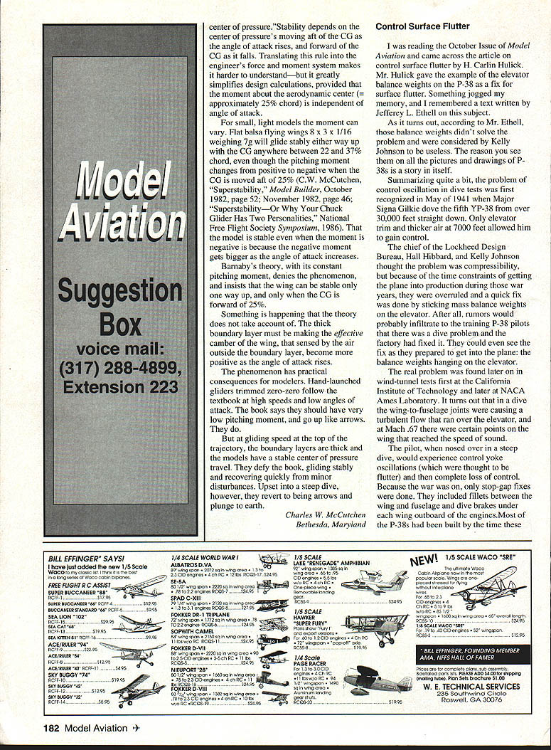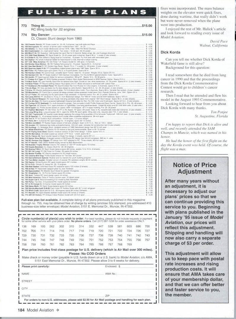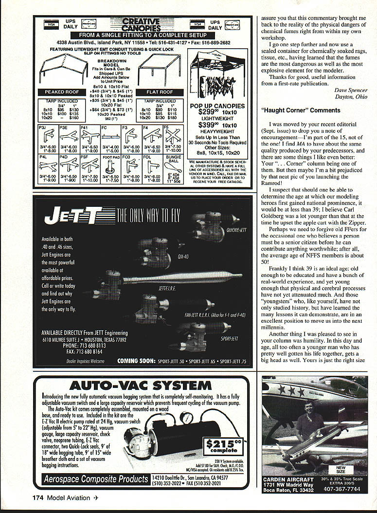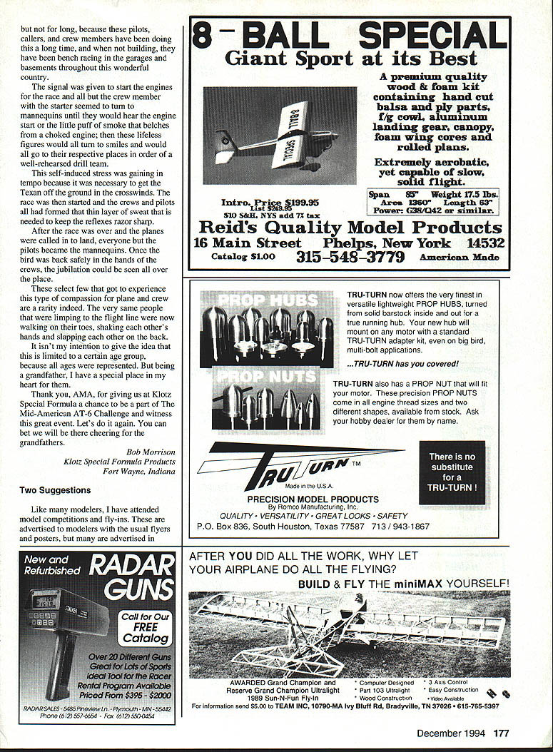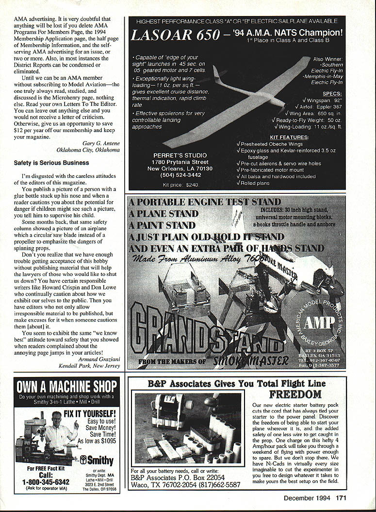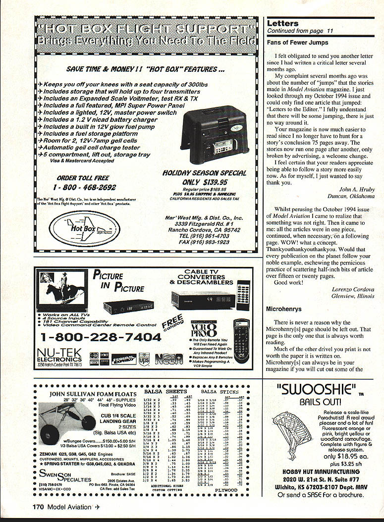 Letters tc EcIitcr met guy 1994 Nats new Spirit 100 used hi-start its maiden voyage got some pictures address read send address please Katie Bosman 512 South Oxford Ave Sturgeon Bay Wisconsin 54235 --4--Katie Senior-age sailplane flier did quite well 1994 Nats No Sympathy appalled sympathetic answer letter Jack Tillett August 94 MA involving notion club Safety Officer would have audacity call modeler insist bird chasing unacceptable behavior welcome spectators mentions could anyone anywhere may very well like chasing birds may also have political pull see buddies get leased flying site again Bird chasers temper tantrum throwers pit buzzers odd clown refuses put muffler airplane meet reasonable flying site noise limits present wrong image interested public show up watch flying sites should treated like pariahs coddled made feel sort thing okay small club less 100 members may have problem sort thing can tell experience larger clubs several hundred members often say takes William D Crowl Sacramento California Mr Crowl youre absolutely right boorish behavior rheflyingfleld should tolerated wasnt attempting condone bird-chasing rather concerned about treatment Mr Tillett received Importance Safety would like stress importance wearing safety glasses using model airplane glue thirteen-year-old son got glue eye working model airplane wearing safety glasses make emergency trip hospital properly treated could have permanent damage cornea suffered mild abrasions cornea very fortunate eye healed completely due inunediate treatment received Please always wear safety glasses using glue Mary Mandeville Lakeville Massachusetts Continued page 170 aim Psrlsnuamci SPECIAL PURCHASE RJL K61 HPR1 GflLD CUP AI best totally American Made 61 available IL K61 w/std ish muffler eS18995 wig muffler r insUPER SEA L+ ii_ALL OTHER HP MODELS IN STO iPLL CES J IComplete Tuned P1 S stem i RUSSIAN ENGINES NO THROTTLE OR MUFFLERAME 049 SCHNUERLE Includes strap header silicone Joint tube &.tPORT ABN m ad expansion chamber pressure tap IncreasesPISTON/CYL power easily meets sound requirements Tuning in-USIDE EXHAUS atructiona included Great looking Black finish Tight nor 9 Emal extended headers available tor nes Com~tepipe system.IMAP3 15MK 17 TAIPHOON 15 146-euSiZIGLOWDIESEL ABC SIDE Sio3333DIESEL OR REARREAR EXHAU ST INTAKEINTAKESCHNUERLE L~4aS9Sa 9$3999PORT sesg SPECIAL PURChASE 62395COX DIESEL HEAD CONVERSION COMPLETE TUNED PIPE SYSTEM DIESEL HEAD CONVERSION FOR COX 049 FOR K&B SPORTSTER 2028USES TRUE 0-RING SEALED CONTRA PISTON 1299 INCLUDES ALL MOUNTING OM 049 HEAD ADAPTERS HARDWARE AND BOOSTS YOU CAN USE STANDARD GLOW PLUGS POWER 1500 RPMS WITHOUT NOISE INCREASECOX 049 HEAD ADAPTER FOR LONG PLUG 490 COX 049 HEAD ADAPTER FOR SHORT PLUG 490 TESTOR McCOY 049 ADAPTER LONG PLUG590 M*UEV9AVESDMPAFYDFAUWIM P0 Box 80830 San Manno California 91118 SEND $100 FOR 48 PAGE CATALOG TO ORDER ITEMS IN THIS AD SORRY NO CODs CALL TOLL FREEALL CREDIT CARDS ACCEPTED 04 Pnces subject change notice -800-FLY NY R@1o Limited supply some items Shipping Handling continental US NO PARTS OR TECHNICAL HELP FROM THIS NUMBER % Alaska $400 size order Hawaii & international higher LOCAL & INTERNATIONAL 1-818-FLY MY RC 399-6972 California Residents add 825% Sales Tax AWDEL IWIIIWE OMPA/IT 1FAUYfRC4 AMA MAAEIM 0 UK MUMINUM READ SIZES METRIC & US 6x1 -7x1 -8x1 -8x125-lOxl25 IS 6x32 8x32- 114x28 5/16x24 3/8x24 O ii r-ixBrass299Aluminum199 5/8 HEXBrass399Aluminum299 3/4 HEXBrass449Aluminum299 7/8 HEXBrass599Aluminum399 1 HEXBrass699Aluminum499 HP leEr cycle engines HPVT21 STANDARD HEAD eraziges 12999. HP dT21 BEARING HEAD .. ecazags 13999 HPVT49STANDARDHEAD senzwge 14999m HP VT 49 BEARING HEAD .. esGuwas Mutunuc Seiki 61 ABC Double Ball BearingABC Long Strake 81 prodoced 11w blest CNC madrinery Parts & Service available tram RJL sJ $9999 eduding matter PARTS ICE AND ECHNICAL ASSISTANCE ON ENGINES IN THIS AD AND THE FOLLOWING HB ENGINES KAVAN EK-SO HP ENGINES KRATT 61 COX CONOUEST 15 -RJL TAiPAN 40 HOK 5NGiNE5 Fovarse Ernssss McCoy Ssass 21 talAci HEAO SiNNED CAsE Dont Call MECQA Call write III ligusyw USA PO Box 5-SIERRA MADRE CA 91025 TEL EPHONE 818 359-0016 December1994 11 Unknown Flier tI IA i I(I i 111113 SAVE TINE & MONEY! 710 SOX PEA WRES s offyour knees seat capacity 300lbs udes storage wi/i hold up four transmitters udes Expanded Scale Voltmeter test RX & TX udes full featured MPI Super Power Panel udes alighted 12V master power switch udes 12 Vnicad battery charger udes built 12V glow fuel pump udes fuel storage plafform Room 2 12 V-lamp gell cells Automatic gell cell charge tester 5 compartment Uft out storage tray Vlea & Mastercard Accepted ORDER TOLL FIEE 800 468-2692 TIn Ha WeaL Mt8 U 011 Co. bn kdepoodenL nnrnoox Lhe iloL Bon Th814 &nppo.t ohm 9oL 9on 1oodnoL. -4/ S S S 0 S 0 S S 0 S S ZENOAH G23 G36 G45 062 Engines CUSTOMIZED MOUNTS MUFFLERS ACCESSORIES * SPRING STARTER 038045062 & QUADRA S SONBrodore SASE PECIALTIES2995 Enlalen Ave SIB 758-9179P0 Box 663 Pinde CA 94564 VISAIMCCKCOOCA Rn add Salen Tao JOHN ULLIVAN FOAM FLOATS 40 44 48 LIES Float Flying Video CUB 1/4 SCALE LANDING GEAR 2 SIZES Balsa USA etc w/Bungee Covers OOOSOO S/H 1/3 Balsa USA Covers $1300 S/H HOLIDAY SEASON SPECIAL ONLY $13995 Regular pr/ce $16995 PLUS SASS 5MPP1V6 S aMWW CALIFORNIA RESDFNrSAOD SALES AX Mar West Mfg Co Inc 3339 Fitzgerald Rd #1 Rancho Cordova CA 95742 TEL 916 961-4703 FAX 916 983-1923 BALSA 1/320 2 1/161 3 1/16X 3 1/165 4 3/322 2 3/32X 3 3/325 4 1/62 3 1/91 3 1/B 5 4 3/16X 2 3/16X 3 3/16X 4 1/42 2 1/4X 3 1/45 4 5/162 2 5/161 3 1/165 4 3/95 2 3/91 3 3/ 4 1/25 2 1/2 3 1/25 4 SHEETS 39 3040 3345 4560 7195 40SS 5269 7499 4359 6293 99119 5371 7499 105140 6567 96115 130-173 6597 102136 144190 75100 114152 170235 134179 173230 265353 hITIOMkL CBSTO3 COrDInG BALSA 1/090 0/09 0/390 0/9 0/990/3 9/9903/0 9/9293/32 9/3239/9 3/3290/3 3/fl05/9 "/9 9/B09/9 B' 92/ /30/I 5/92/0/2 3/B03/4 /9 9/22/942 0/233/3 9/905/9 STICKS 0 1L2 i0 iiS 09195 ~0 0 i~i0 i 21 2i 56 495 21 ~