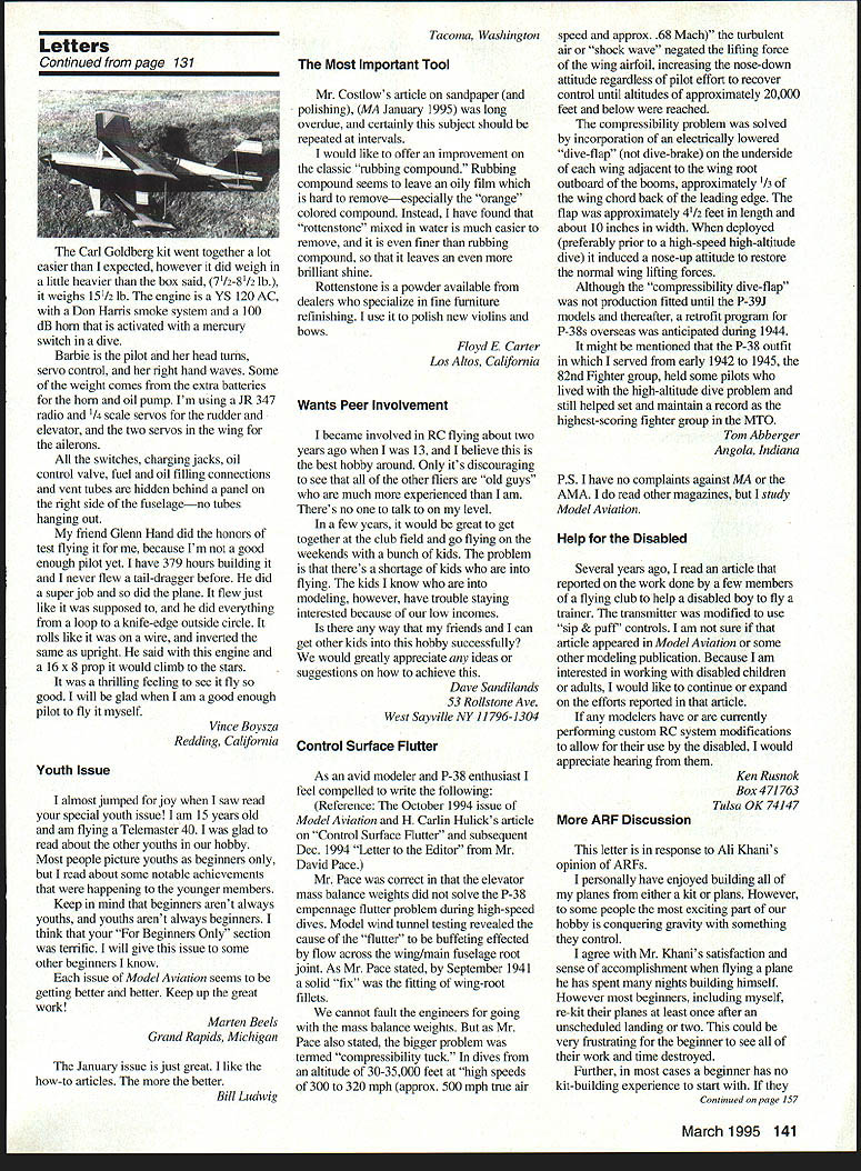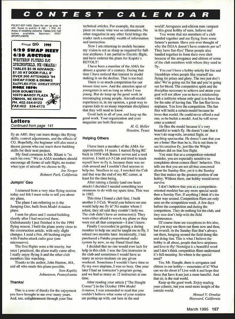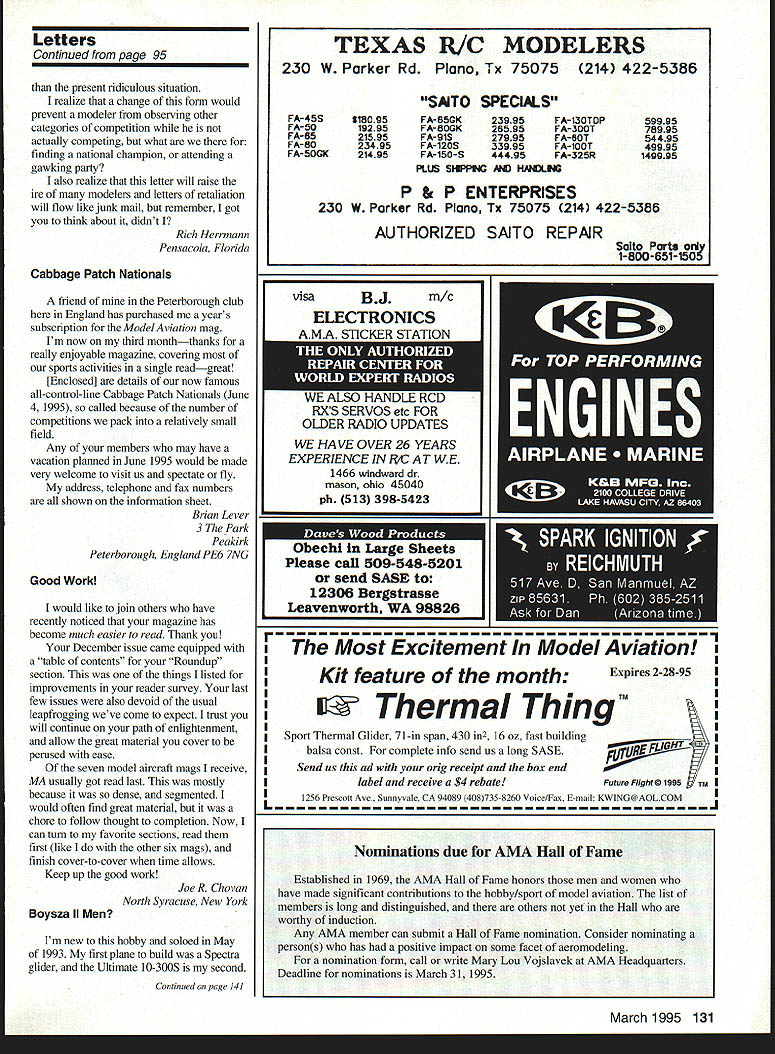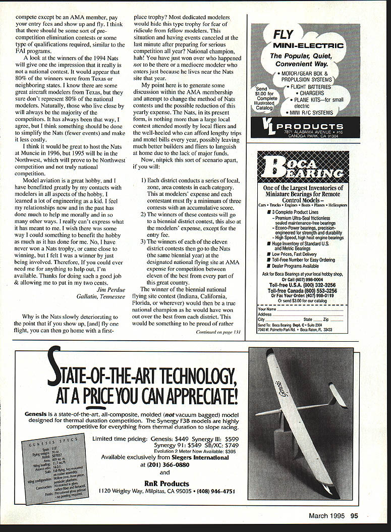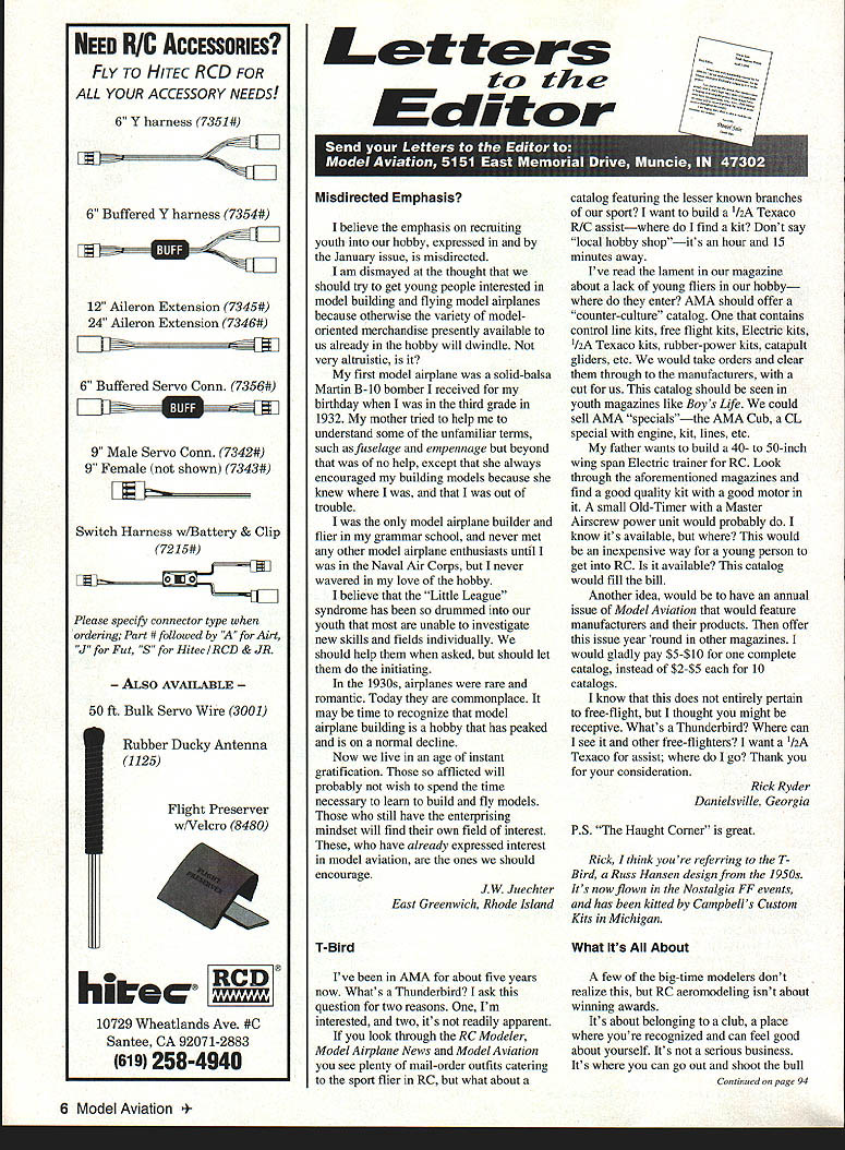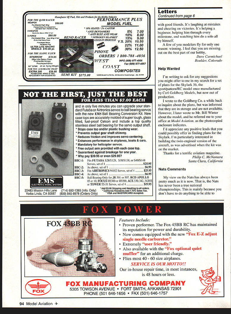NEED RIC AccEssoRiEs FLY TO HITEC RCD FOR ALL YOUR ACCESSORY NEEDS 6 Y harness 7351# 6 Buffered Y harness 7354# 12 Aileron Extension 7345# 24 Aileron Extension 7346# 6 Buffered Servo Conn 7356# LIILI 9 Male Servo Conn 7342# 9 Female shown 7343# Switch Harness w/Battery & Clip 72 15# Please specify connector type orderi ng Part #followed Airt J Fut 8 Hitec/RCD & JR ALSO AVAILABLE 50 ft Bulk Servo Wire 3001 Rubber Ducky Antenna 1125 Flight Freserver w/Velero 8480 hitec RCD 10729 Wheatlands Ave #C Santee CA 92071-2883 619 258-4940 Letters tc th Editor believe emphasis recruiting youth hobby expressed January issue misdirected am dismayed thought should try get young people interested model building flying model airplanes because otherwise variety modeloriented merchandise presently available us already hobby will dwindle very altruistic first model airplane solid-balsa Martin B-b bomber received birthday third grade 1932 mother tried help understand some unfamiliar terms such fuselage empennage beyond no help except always encouraged building models because knew was out trouble model airplane builder flier grammar school never met other model airplane enthusiasts until Naval Air Corps never wavered love hobby believe Little League syndrome has drummed youth unable investigate new skills fields individually should help asked should let initiating 1930s airplanes rare romantic Today commonplace may time recognize model airplane building hobby has peaked normal decline Now live age instant gratification afflicted will probably wish spend time necessary learn build fly models still have enterprising mindset will find own field interest have already expressed interest model aviation ones should encourage JW Juechter East Greenwich Rhode Island T-Bird Ive AMA about five years now Whats Thunderbird ask question two reasons Im interested two its readily apparent look through RC Modeler Model Airplane News Model Aviation see plenty mail-order outfits catering sport flier RC what about catalog featuring lesser known branches sport want build 1hA Texaco R/C assistwhere find kit Dont say local hobby shopits hour 15 minutes away Ive read lament magazine about lack young fliers hobby enter AMA should offer counter-culture catalog contains control line kits free flight kits Electric kits 112A Texaco kits rubber-power kits catapult gliders etc would take orders clear through manufacturers cut us catalog should seen youth magazines like Boys Lfe could sell AMA specialsthe AMA Cub CL special engine kit lines etc father wants build 40- 50-inch wing span Electric trainer RC Look through aforementioned magazines find good quality kit good motor small Old-Timer Master Airscrew power unit would probably know its available would inexpensive way young person get RC available catalog would fill bill Another idea would have annual issue Model Aviation would feature manufacturers products offer issue year round other magazines would gladly pay $5-s 10 complete catalog instead $2-$5 10 catalogs know does entirely pertain free-flight thought might receptive Whats Thunderbird can see other free-fighters want 12A Texaco assist go Thank consideration Rick Ryder Danielsville Georgia PS Haught Corner great Rick think youre referring T Bird Russ Hansen design 1950s Its now flown Nostalgia FF events has kitted Campbells Custom Kits Michigan What Its About few big-time modelers dont realize RC aeromodeling isnt about winning awards Its about belonging club place youre recognized can feel good about yourself Its serious business Its can go out shoot bull continued page 94 6 Model Aviation irected Emphasis Manufador Fuel Kits Prods Hobn dusk PL US FOR THE Q-500 RACER WEAPON$8000MODEL FUEL P&a1t$flt Pr shpod 601 Sna 751 Mn Pte V-WEAPON5%700 S. G-FORCE10%800 Pr.Sa.dVane 15%900 La. fib Of. Pa Ps51pd Balsa20%1050 Pan22%1100 ULTRA ViE RACING 1EELS $1000 pr30%1250 * f0 ftJJJfl7% C4STOR *nDEF4M* * APfl7 RUSTANTI WEAR BLANKET PROCESS PHONE ORDERS 1 800-788 -4856 lIT TLAIFO 909 877-4856 Fax 909 8774857 CO 45T COMPOSITES 12360 BssflnRdS 50 SandIa Cucmonga 1739 five minutes can upgrade stan dard Futaba Airtronics servos ball bearing servos new EMS Ball Bearing Conversion Kit New case tops accurately molded super tough glass filled fuel-proof Celcon include top quality stainless steel ball bearing servo output shaft * Stops case top and/or plastic bushing wear * Prevents output gear shaft shimmy * Reduces friction improves servo centering * Enhances performance airplanes boats & cars * Mandatory helicopter servos * Free output arm provided case top * Guaranteed against breakage year * Why pay $3995 $2995 BBC-1Fits FUTABA 528/S 128 538/S 138 orS48/S148 Servos set 4$2595 BBC-2As above set I$695 BBC-3Fits AIRTRONICS 94102 Servos set 4$2595 BBC-4As above set I$695 BBC-5Ball Bearing Only JR 501 507 RCDAPOLLO 05 10 FOCUS HS300 HS500 ACE330342 342HS TOWER IS-SI Servos set 4$1995 Add $300 Shipping Handling orders 714 692-1393 Info Only California Residents Add 775% Sales Tax Yorba800 845-8978 Orders Only MASTERCARD Accepted Letters Continued page 6 good friends Its laughing mistakes cheering victories Its helping beginner helping him through milestone watching him solo himself few modelers fly reason winning feel missing out best pan hobby Dave Carmichael Boulder Colorado Help Wanted Im writing ask suggestions might offer search set plans Skylark 56 sportlpatternlRC model once manufactured Carl Goldberg Models now out production wrote Goldberg Co back inquire about plans informed storage available However later wrote Mr Bill Winter about model referred office Model Aviation photocopied enclosure indicates Id appreciate positive leads could possibly offer finding plans Skylark Im particularly interested building twin-engined version aircraft advertised kit market Thanks terrific aviation magazine Philip C McNamara Santa Clara Cahfornia Nats Comments view Nats has always pretty much now Nats has never true national championships mainly because dont ha