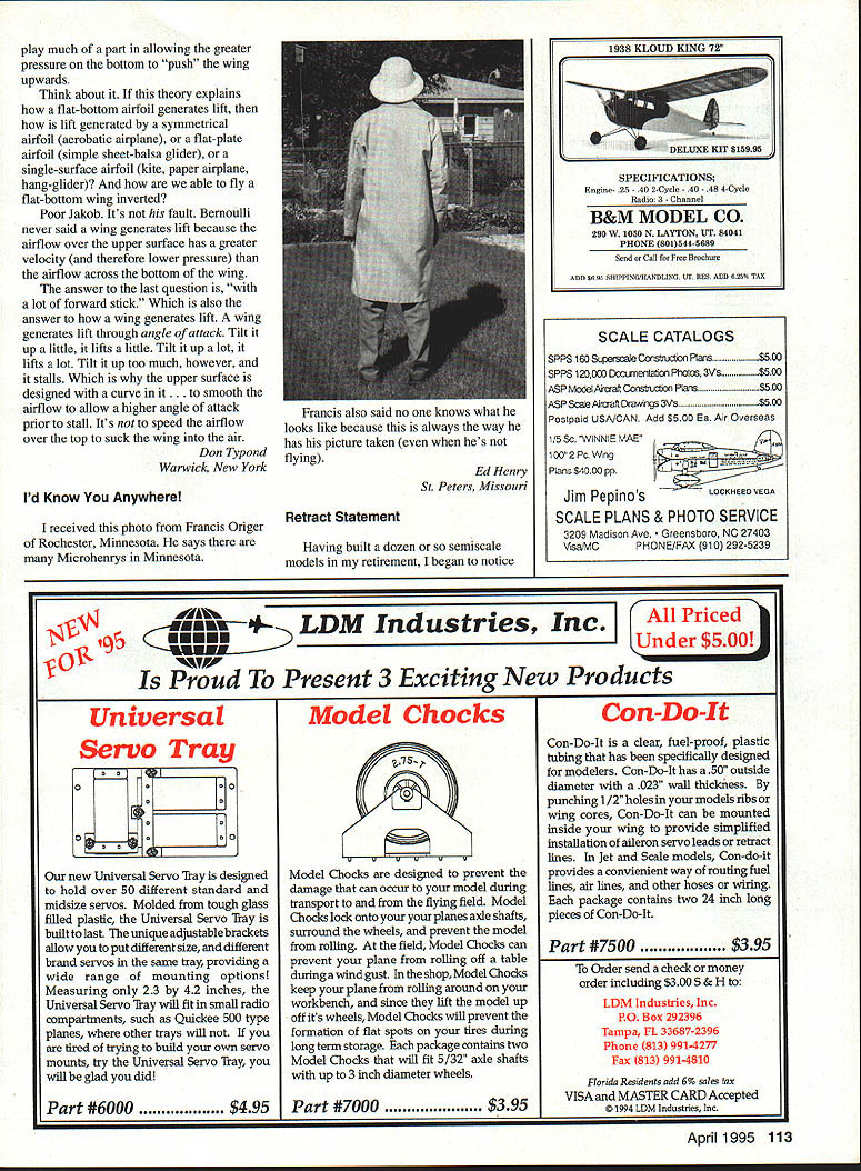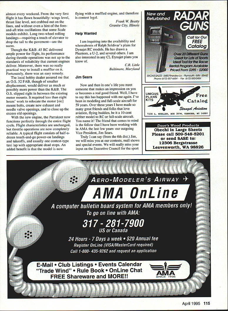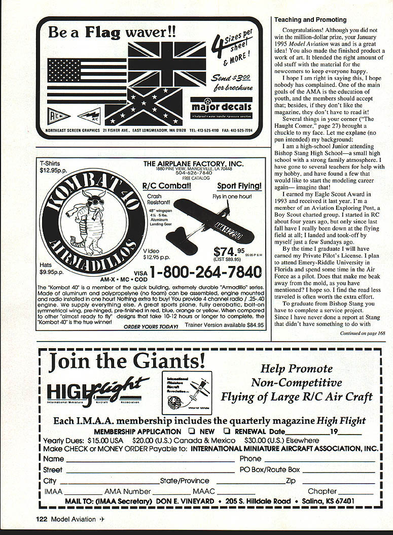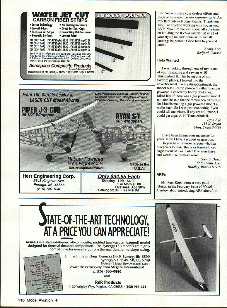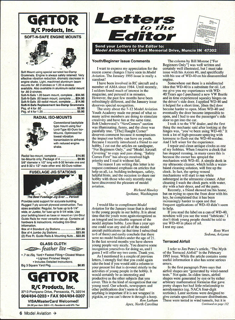 ifITOR RIC Products Inc SOFT-N-SAFE ENGINE MOUNTS -I Soft Mount using special serrated Iso-Damp Grommets Engine always safely retained Very effective vibration reduction dramatic decrease engine shake Light machined aluminum beam mounts 60 2-strokes 1 20 4-strokes available Also available aluminum radial mount tor 60 2-strokes Soft-N-Safe 120 beam mount complete . $3495 Soft-N-Sate 60 beam mount complete 5 SoftN-Safe 60 radial mount complete 95 Soft-N-Safe Replacement Iso-Damp Grommets Pkg 4 60$295 Pkg 4 120$595 RADIAL ISO-MOUNTS * Conventional backplate type mount using four Lord-Type 60-Duro IsoMounts Optimized lowest vibration transmission airframe reduced engine shake Radial Iso-mount complete $1495 Iso-Mounts Package 4 $995 5/8 diameter x 1/2 long 8-32 female end 8-32 x 1/2 male other end 60-Duro rubber -4 uCBf Fuselage Provides solid support accurate building Rugged 7-ply aircraft plywood construction Two sizes available Regular fuse up 6-1/4 wide Jumbo fuse up 9-1/4 wide Use building board base mount Uni-Strut Guide Rails versatile set-up Contains hardware & instructions including Uni-Strut information Box 4 Standard Jig Stations $2195 Box 4 Jumbo Jig Stations 2395 2 Five Ft Guide Rails & Mounting Nuts . $2295 GLASS CLOTH 7 oz/Sq Yard est Filling est Weave Lightest Finished Weight Includes Detailed Instructions Big 3 Square Yard Pkg $895 EITO1I 3713 R/C Products Inc Pompano Drive Pensacola FL 32514 904/494-0203 904/494-0207 VISA/MasterCard Welcomed $400 per item S&H esidents add 6% Tax Letters tc EcJitcr want express appreciation recent course changes have seen Model Aviation January 1995 issue really standout have involved RC aircraft member AMA since 1984 Until recently seldom found much interest magazine perused minutes However past few months have refreshingly different January issue deserves special recognition story about 7-12 Model Aviation Youth Academy made proud what active members doing stimulate creativity have fun same time Bob Underwoods NewComers section illuminating funny close painfully true [The] Haught Corner deserves comment because reemphasizes impact hobby can have youth Because recently introduced friend hobby cut out articles sandpaper Beginners Only Model Aircraft Covering copy pass along Safety Comes First has always received high priority read fail reason am writing letter request continued emphasis artictes help us ie building techniques safety helpful hints occasion share hobby recently may have discovered pleasure model aviation Richard Hawley Spokane Washington would like compliment Model Aviation January issue devoted young people hobby about time youth again recognized integral invaluable segment model airplane hobby Less year ago could scan ail model aircraft publications time subscribed 6 easily conclude no model builders under age 21 last several months have shown young people very nicely deserve some recognition yourselves doing guess will offer two cents Thank As mentioned couple previous letters strongly feel could again take lead would add column present list devoted strictly activities young people hobby would certainly interesting productive other subjects cover kind recognition young need schools newspapers other publications dont seem feel anything important wrapped pigskin cant throw through hoop Ron Latham Apex North Carolina column Bill Munroe [For Beginners Only] well written certainly well illustrated must take issue Axiom #8 specifically use WD-40 disassembled engine Somewhere out misdirected idea WD-40 substitute oil Let give experiences WD 40Years ago purchased new VW Beetle time experienced squeaky hinges drivers side door applied WD-40 helped short time [then the] door became harder open WD-40 eventually door became impossible open use passengers side door get car took VW dealer first thing mechanic said after looking hinges youve using WD-40 took lot high-pressure spraying kerosene flush out WD-40 residue left wiser experience repair clean antique clocks hobbies receive clock has stopped running cases because owner has sprayed mechanism WD-40 simple dunk ultrasonic cleaner holds waterbased cleaning solution will free up clock fact spring-wound mechanisms will start run submerged ultrasonic cleaner After cleaning wash clock parts water dry hair dryer oil parts Recently friend showed home trying open front door key complained has increasingly harder open frequent applications WD-40 didnt seem help read label can WD-40 nowhere will see word lubricate dont think young people should told use WD-40 place oil rest case Ross Wert Sedona Arizona Terraced Airfoil refer Jim Petros article Myth Terraced Airfoil February 1995 issue article contains some useful information also has some serious errors first paragraph Petro says airfoil shapes generated wind-tunnel tests quite olden times airfoil shapes generated eye rather arbitrary mathematical formulas gave pretty shapes little relationship aerodynamics eg NACA four-digit sections Later sections designed give certain specified pressure distributions tested wind tunnels Continued page 112 6 Model Aviation h/Beginner Issue Comments Bandits 1 OClock E-Z bill WWII I-3b I--4U ow 4U Uorsair Pedal Planes will have much fun building 3-6 year old will have Flyingit Kit includes full-sized patterns complete Instructions nrI rnlnr nhntn 112 Model Aviation ers Continued page 6 stretching say generated wind-tunnel tests Nowadays can generated computer making extensive wind- tunnel tests unnecessary Now last paragraph What intriguing government airfoil test report mentions would certainly find intriguing probably different reasons Bernoulli never said flow over upper surface must catch up lower airflow equation does imply myth gets perpetuated time after time simply true fact upper-surface flow gets trailing edge ahead lower-surface flow Petro going have tough time de-myth Bernoullis equation should have much easier time de mything government report indeed exists says government report declares separat