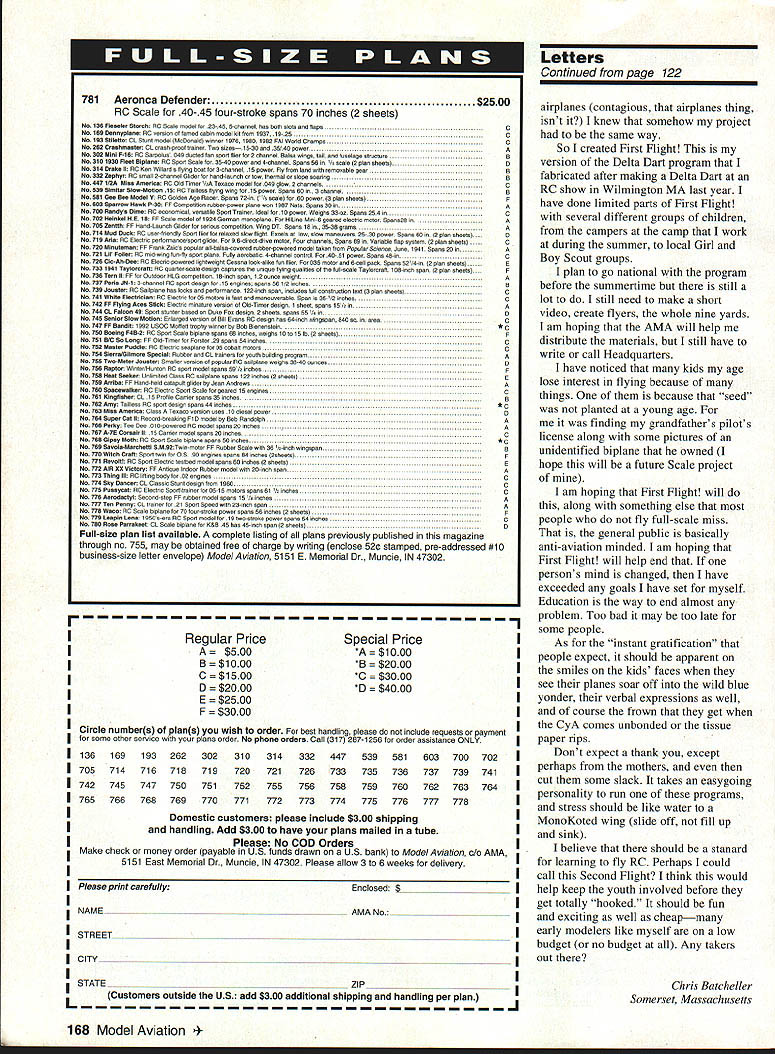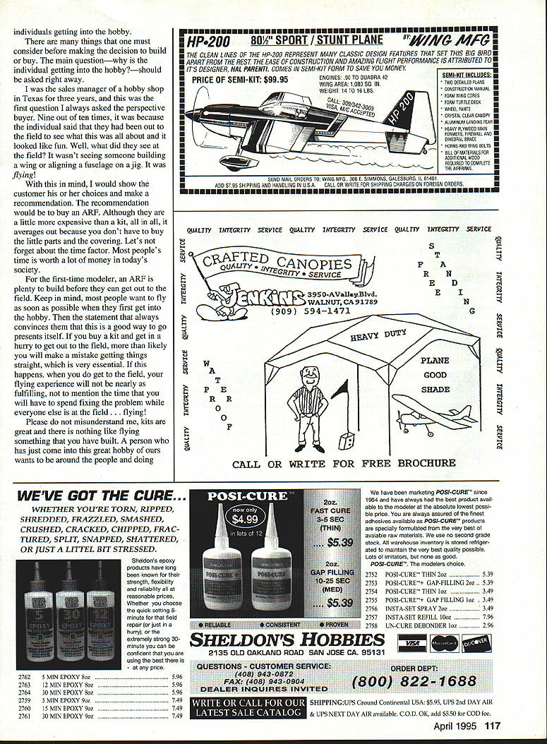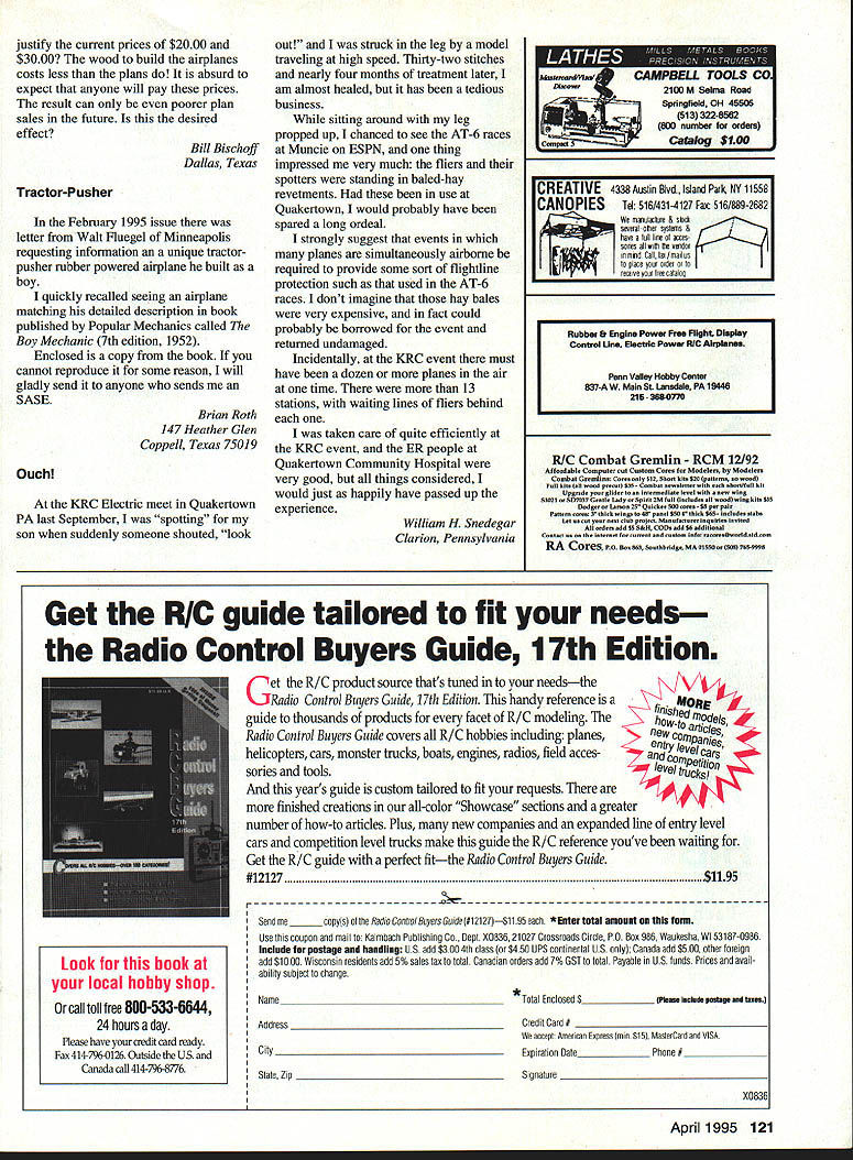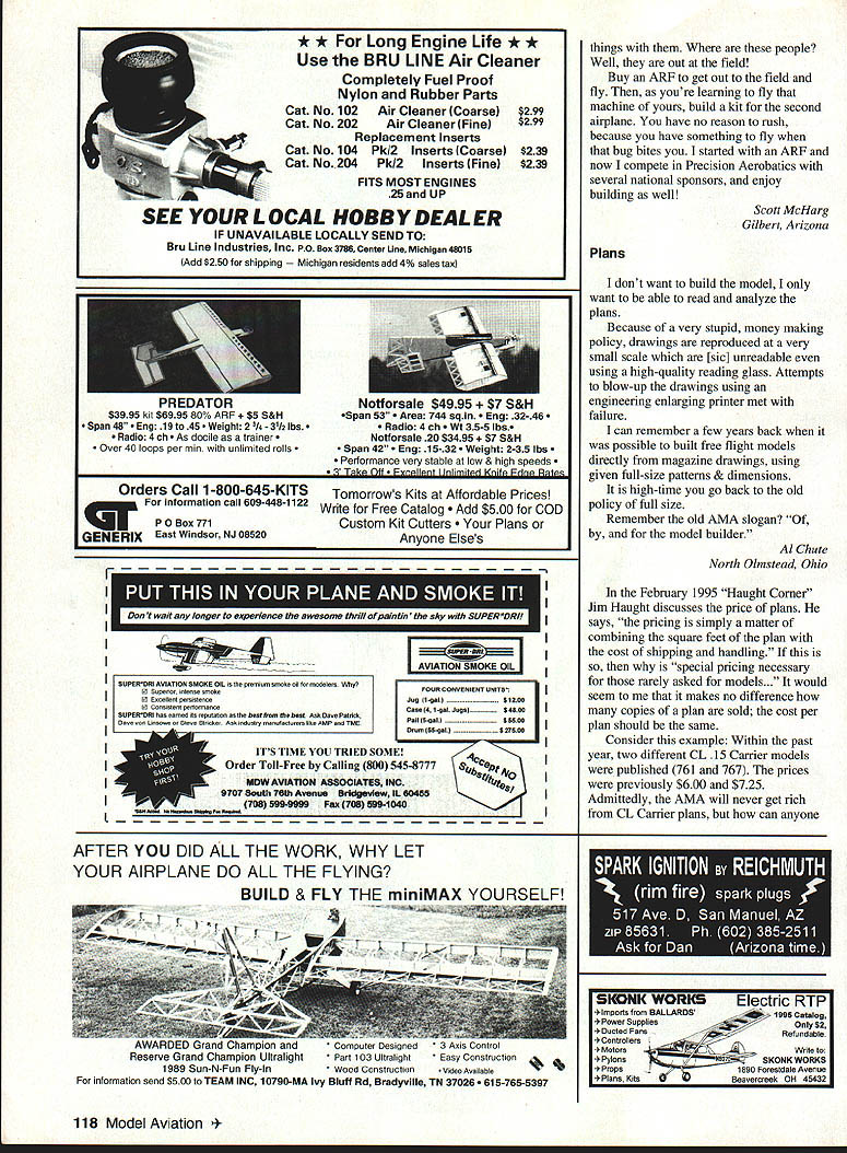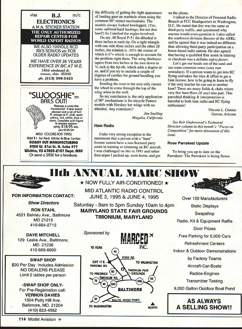 ifITOR RIC Products Inc SOFT-N-SAFE ENGINE MOUNTS -I Soft Mount using special serrated Iso-Damp Grommets Engine always safely retained Very effective vibration reduction dramatic decrease engine shake Light machined aluminum beam mounts 60 2-strokes 1 20 4-strokes available Also available aluminum radial mount tor 60 2-strokes Soft-N-Safe 120 beam mount complete . $3495 Soft-N-Sate 60 beam mount complete 5 SoftN-Safe 60 radial mount complete 95 Soft-N-Safe Replacement Iso-Damp Grommets Pkg 4 60$295 Pkg 4 120$595 RADIAL ISO-MOUNTS * Conventional backplate type mount using four Lord-Type 60-Duro IsoMounts Optimized lowest vibration transmission airframe reduced engine shake Radial Iso-mount complete $1495 Iso-Mounts Package 4 $995 5/8 diameter x 1/2 long 8-32 female end 8-32 x 1/2 male other end 60-Duro rubber -4 uCBf Fuselage Provides solid support accurate building Rugged 7-ply aircraft plywood construction Two sizes available Regular fuse up 6-1/4 wide Jumbo fuse up 9-1/4 wide Use building board base mount Uni-Strut Guide Rails versatile set-up Contains hardware & instructions including Uni-Strut information Box 4 Standard Jig Stations $2195 Box 4 Jumbo Jig Stations 2395 2 Five Ft Guide Rails & Mounting Nuts . $2295 GLASS CLOTH 7 oz/Sq Yard est Filling est Weave Lightest Finished Weight Includes Detailed Instructions Big 3 Square Yard Pkg $895 EITO1I 3713 R/C Products Inc Pompano Drive Pensacola FL 32514 904/494-0203 904/494-0207 VISA/MasterCard Welcomed $400 per item S&H esidents add 6% Tax Letters tc EcJitcr want express appreciation recent course changes have seen Model Aviation January 1995 issue really standout have involved RC aircraft member AMA since 1984 Until recently seldom found much interest magazine perused minutes However past few months have refreshingly different January issue deserves special recognition story about 7-12 Model Aviation Youth Academy made proud what active members doing stimulate creativity have fun same time Bob Underwoods NewComers section illuminating funny close painfully true [The] Haught Corner deserves comment because reemphasizes impact hobby can have youth Because recently introduced friend hobby cut out articles sandpaper Beginners Only Model Aircraft Covering copy pass along Safety Comes First has always received high priority read fail reason am writing letter request continued emphasis artictes help us ie building techniques safety helpful hints occasion share hobby recently may have discovered pleasure model aviation Richard Hawley Spokane Washington would like compliment Model Aviation January issue devoted young people hobby about time youth again recognized integral invaluable segment model airplane hobby Less year ago could scan ail model aircraft publications time subscribed 6 easily conclude no model builders under age 21 last several months have shown young people very nicely deserve some recognition yourselves doing guess will offer two cents Thank As mentioned couple previous letters strongly feel could again take lead would add column present list devoted strictly activities young people hobby would certainly interesting productive other subjects cover kind recognition young need schools newspapers other publications dont seem feel anything important wrapped pigskin cant throw through hoop Ron Latham Apex North Carolina column Bill Munroe [For Beginners Only] well written certainly well illustrated must take issue Axiom #8 specifically use WD-40 disassembled engine Somewhere out misdirected idea WD-40 substitute oil Let give experiences WD 40Years ago purchased new VW Beetle time experienced squeaky hinges drivers side door applied WD-40 helped short time [then the] door became harder open WD-40 eventually door became impossible open use passengers side door get car took VW dealer first thing mechanic said after looking hinges youve using WD-40 took lot high-pressure spraying kerosene flush out WD-40 residue left wiser experience repair clean antique clocks hobbies receive clock has stopped running cases because owner has sprayed mechanism WD-40 simple dunk ultrasonic cleaner holds waterbased cleaning solution will free up clock fact spring-wound mechanisms will start run submerged ultrasonic cleaner After cleaning wash clock parts water dry hair dryer oil parts Recently friend showed home trying open front door key complained has increasingly harder open frequent applications WD-40 didnt seem help read label can WD-40 nowhere will see word lubricate dont think young people should told use WD-40 place oil rest case Ross Wert Sedona Arizona Terraced Airfoil refer Jim Petros article Myth Terraced Airfoil February 1995 issue article contains some useful information also has some serious errors first paragraph Petro says airfoil shapes generated wind-tunnel tests quite olden times airfoil shapes generated eye rather arbitrary mathematical formulas gave pretty shapes little relationship aerodynamics eg NACA four-digit sections Later sections designed give certain specified pressure distributions tested wind tunnels Continued page 112 6 Model Aviation h/Beginner Issue Comments Bandits 1 OClock E-Z bill WWII I-3b I--4U ow 4U Uorsair Pedal Planes will have much fun building 3-6 year old will have Flyingit Kit includes full-sized patterns complete Instructions nrI rnlnr nhntn 112 Model Aviation ers Continued page 6 stretching say generated wind-tunnel tests Nowadays can generated computer making extensive wind- tunnel tests unnecessary Now last paragraph What intriguing government airfoil test report mentions would certainly find intriguing probably different reasons Bernoulli never said flow over upper surface must catch up lower airflow equation does imply myth gets perpetuated time after time simply true fact upper-surface flow gets trailing edge ahead lower-surface flow Petro going have tough time de-myth Bernoullis equation should have much easier time de mything government report indeed exists says government report declares separat