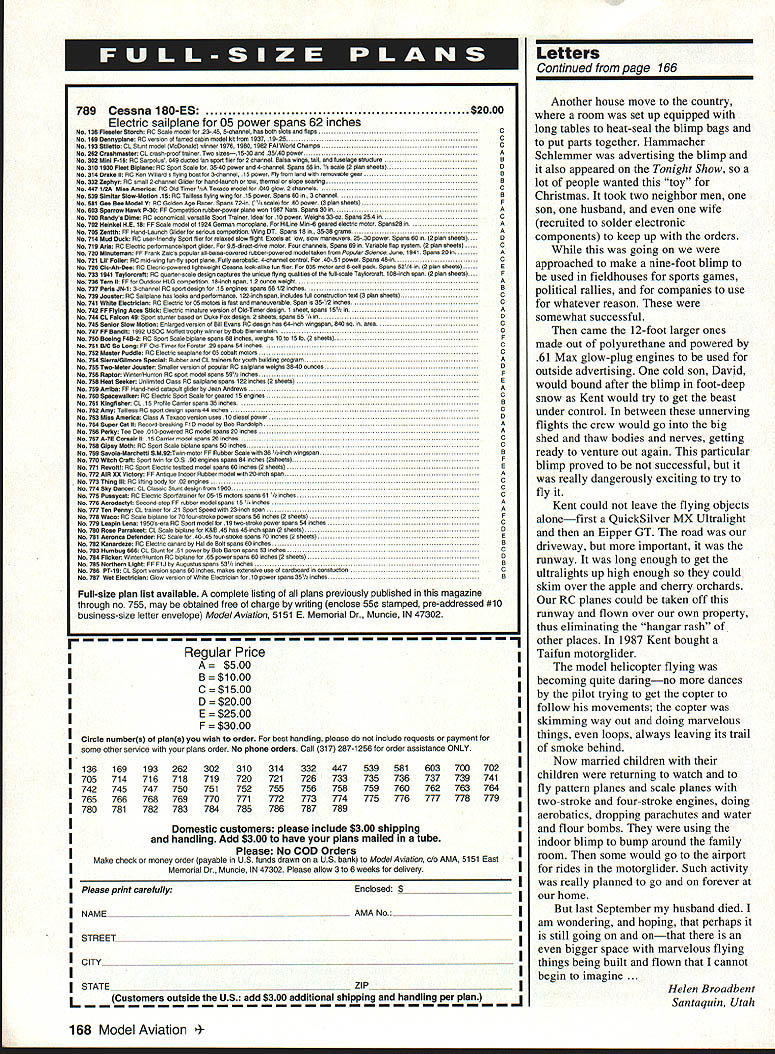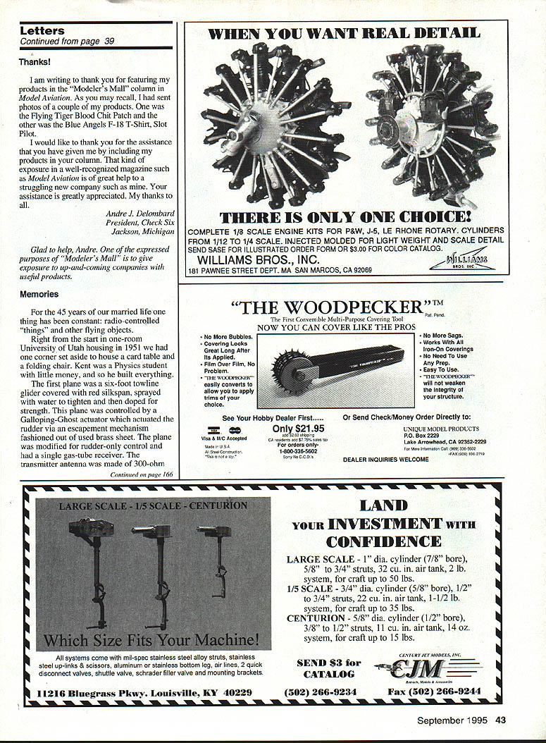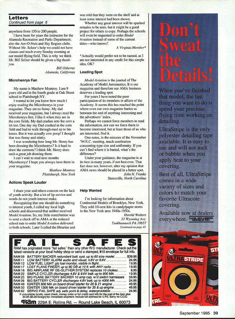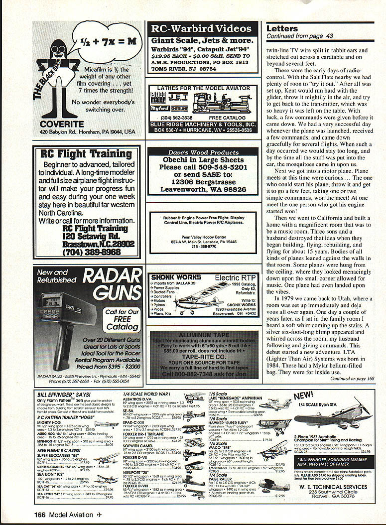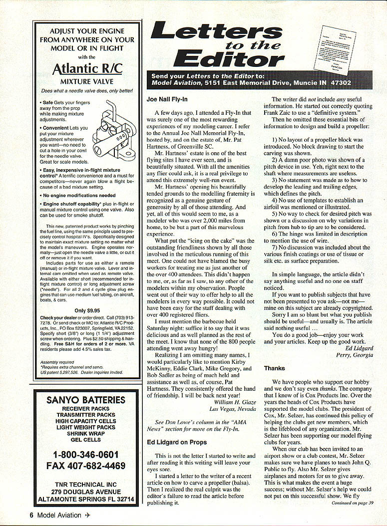 ADJUST YOUR ENGINE FROM ANYWHERE ON YOUR MODEL OR IN FLIGHT Atlantic RIC MIXTURE VALVE Does what needle valve does Only betlerl Sate Gets fingers away prop making mixture adjustments Convenient Lets put mixture adjustment wherever wantno need cut hole cowl needle valve Great scale models & Easy inexpensive in-flight mixture control terrific convenience must competitorsnever again blow flight cause bad mixture setting No engine modifications needed Engine shutoft capability plus in-flight manual mixture control using valve Also can used smoke shutoff new patented product works pinching fuel line using same principle used pre cisely control hospital Vs Specifically designed maintain exact mixture setting no matter what models maneuvers Engine operates nor mallyjust open needle valve little cut off remove want Includes parts tor use either remote manual in-flight mixture valve Lever ternal cam omitted used remote valve Available either short recommended inflight mixture control long adjustment screw needle 2 4 cycle glow plug en gines can use medium fuel tubing aircraft boats & cars Only $995 Check dealer order direct Call 7039137278 send check MO Atlantic RIC Prod ucts Inc P0 Box 523007 Springfield VA22152 Specify short 3/8 long 1 1/4 adjustment screw ordering Plus $250 shipping & han dling Free S&H orders 2 VA residents please add 45% sales tax Assembly required Requires extra channel servo US patent 5297526 Dealer inquiries invited Letters tc Editor Joe Nail Fly-In few days ago attended Fly-In surely rewarding experiences modeling career refer Annual Joe Nail Memorial fly-In hosted estate Mr Pat Hartness Greenville SC Mr Hartness estate best flying sites have ever seen beautifully situated amenities flier could ask real privilege attend extremely well-mn event Mr Hartness opening beautifully tended grounds modelling fraternity recognized genuine gesture generosity attending yet would seem modeler over 2000 miles home part marvelous experience What put icing cake outstanding friendliness shown involved meticulous running meet could have blamed busy workers treating just another over 400 attendees didnt happen far saw other modelers within observation People went out way offer help modelers way possible could have easy staff dealing over 400 registered fliers must mention barbecue held Saturday night suffice say delicious well planned rest meet know 800 people attending went away hungry Realizing am omitting names would particularly like mention Kirby McKinny Eddie Clark Mike Gregory Bob Sadler being much held assistance well course Pat Hartness consistently offered hand friendship will back next year William H Glaze Las Vegas Nevada See Don Lowes column AMA News section Fly-In Ed Lidgard Props letter started write after reading writing will leave eyes sore started letter writer recent article carve propeller balsa realized real culprit editors failure read article before publishing writer did include useful information started out correctly quoting Frank Zaic use definitive system omitted essential bits information design build propeller 1 No layout propeller block introduced No block drawing start carving shown 2 damn poor photo shown pitch device use Yeh right next shaft measurements useless 3 No statement made to develop leading trailing edges defines pitch 4 No use templates establish airfoil mentioned illustrated 5 No way check desired pitch shown discussion variations pitch hub tip considered 6 hinge limited description mention use wire 7 No discussion included about various finish coatings use tissue silk etc surface preparation simple language article didnt say anything useful no staff noticed want publish subjects have presented asknot subject already copyrighted Sorry am blunt what publish should usefuland usually article said nothing useful good jobenjoy work articles Keep up good work Ed Lidgard Perry Georgia Thanks have people support hobby dont say thanks company know Cox Products Inc Over years heads Cox Products have supported model clubs president Cox Mr SeIzer has continued policy helping clubs get new members lifeblood organization Mr Seizer has supporting model flying clubs years club has invited airport show club contest Mr Seizer makes sure have planes teach John Q Public fly Also Mr Seizer gives airplanes motors us give away what makes event huge success Mr Selzers help could put successful show fly Continued poge 39 6 Model Aviation O BAlTERIES RECEIVER PACKS TRANSMITTER PACKS HIGH CAPACITY CELLS LIGHT WEIGHT PACKS SHRINK WRAP GEL CELLS 1-800-346-0601 FAX 407-682-4469 TNR TECHNICAL INC 279 DOUGLAS AVENUE ALTAMONTE SPRINGS FL 32714 Letters Continued page 6 anywhere 150 200 people have years instructor Alameda Recreation Parks Department also Aer-O-Nuts Sky Rogues clubs Without Mr Seizers help could have classes teach Sunday morning model flying field think Mr Bill Selzer should given big thank Bill Osborne Alameda California Microhenrys Fan name Matthew Montroy am 9 years old fourth grade Oak Street school Plattsburgh NY wanted let know much enjoy reading Microhenrys magazine funny dad received magazine always read Microhenrys first like corn fields dad crashes corn lot too day Dad crashed corn field walk through mud up knees actually cow poop thought funny stinky wondering long Mr Henry has drawing Microhenrys hard draw cartoons think Mr Henry does such great job drawing cant wait read next months Microhenrys hope always have magazine Matthew Mont roy Plattsburgh New York Actions Speak Louder share others concern lack youth activity lot lip service words youth interest make Recognizing should something interest youth called local high schools discovered neither received Model Aviation So little contribution send check off AMA reduced school rate order Model Aviation delivered both schools Later called librarian told shelf least some interest shown Whether great interest will sparked remains seen might good project others copy Perhaps schools will requested order Mo