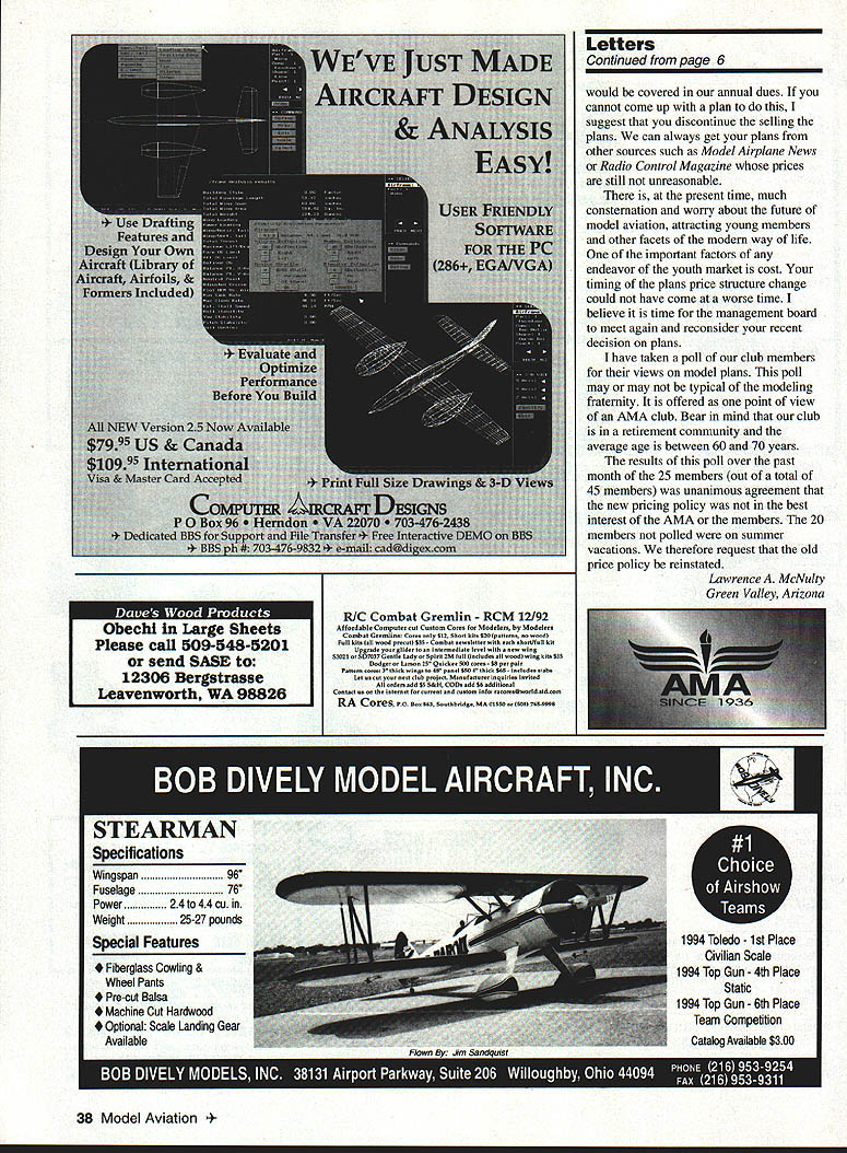 Letters tc th Editor second annual informal Phoenix Model Autogyro Research Trials will held March 6-8 1996 Sun Valley Flyers beautiful field off Cave Creek road north side Phoenix Arizona first get-together March 1995 15 autogyros flown attempted during three-day event pilots applied skills variety aircraft mono-rotors dual rotors either coaxial side-by-side Aerobatic loops achieved some observers claimed have witnessed barrel rolls hoped years event will attract gyronauts far away Europe several modelers have constructing flying autogyros number years highlight meeting will informal dinner/technical discussion exploring what makes things fly Sun Valley Flyers have reserved field exclusively autogyro flying three dayswhat hospitality Motels/hotels available north Phoenix area within few minutes drive Sun Valley Flyers field get mailing list information about event accommodations contact Jim Baxter E 13003 Guthrie Dr Spokane WA 99216 Tel 509 928-3114 E-mail jimb@unixiewaycom CompuServe 752773535 Bill Friedlander E-mail CServe 731341411 Hudson Wisconsin world hear loud complaints seldom compliments let relay story service Coverite went Pacific Northwest Model Expo last February got excited demonstration Jeff Troy rushed around find Coverite 21st Century Iron everything Mr Troy Coverites advertising said easy handle wellshaped work both large areas tight corners its built-in thermometer holding precisely right temperature heat variety covering materials covered three planes mysteriously stopped working wrote Mr Troy called back next day said serious about claim iron should last youll ever buy should return IM repair replacement proof purchase warranty registration replacement arrived yesterday Im back building feel owe routine thanks hope can spare space let tell fellow modelers about Thank consideration Scott H Kruize Tukwila Washington Its always nice see company thats truly concerned about customer satisfaction after sale Fokker DVII am member AMA times certain questions come up cant answer September 1995 issue page 84 article photo Fokker DVII made modeler Ed Musziuski am making same model would like know can eliminate external muffler conceal muffler under cowl plane Would like keep model authentic possible would appreciate info can give Engine being used Magnum XL 46A ABC Pete Renato Sr 2302 Honeycutt Simpson Rd. Monroe North Carolina 28110 Plans January 1995 started new pricing practice model plans reason make plans department profitable Well can notify bean counters certainly unsuccessful look prices However look little farther factor decrease sales picture takes different aspect am course merely guessing basis guess premise new prices way too high cite example price plan 759 Arriba solid balsa catapult launched glider having wingspan 16 inches $500 price outrageous Since model plans very important part model building views premier advocate hobby attitude should support area fact support would entail plans department run nonprofit basis loss times deficit Continued page 38 Autogyros Customer Service Miniature Wings Exclusive look National Air & Space Museums collection model aircraft lavishly illustrated allcolor book 150 full color photos 180 pages 11 x 11 Text museums curatorial assistant tardcover $3495 softcover $1995 add $350 postage Ill resI dents 775% sales tax Heimburger House Publishing 7236W Msdisss Forest Park IL 60305 708-366-1973 Z 6 Model Aviation ers Continued page 6 would covered annual dues cannot come up plan suggest discontinue selling plans can always get plans other sources such Model Airplane News Radio Control Magazine prices still unreasonable present time much consternation worry about future model aviation attracting young members other facets modern way life important factors endeavor youth market cost timing plans price structure change could have come worse time believe time management board meet again reconsider recent decision plans have taken poll club members views model plans poll may may typical modeling fraternity offered point view AMA club Bear mind club retirement community average age between 60 70 years results poll over past month 25 members out total 45 members unanimous agreement new pricing policy best interest AMA members 20 members polled summer vacations therefore request old price policy reinstated Lawrence McNulty Green Valley Arizona 38 Model Aviation hi Large Sheets Please call 509-548-5201 send SASE 12306 Bergstrasse Leavenworth WA 98826 RJC Combat Gremlin RCM 12/92 Affordable Computer cut Cuetoot Coors Modoleso Modrirte Combat Gerotliss Cacos 512 Shod kits 520 ipaosmo wrodi Fall kite wood pcnccti 535- Cambet rewniotter shostlftcll bit Upgrade year glidarto intnnrcndiatr local cow wiog S3021 orSD7rS7Gsttle bdy Spirit 3M foil iloclados woodi nciog kite 535 Dcdgororbtsoo2sQuickne500coms-S5pocpaic Pattow coros 3 thick wings 40 passi 550 4 thick 565 ircledon stabs Let us ccti year coot club pmintt tctaosfoctotet loqairios incited ordem add 55 S&H CODs add 56 additiocal Costactus onthoiosnrcntfoscutnostacdcastrwiofwcacoros@worldstdcoot RA Cores PO Boa sgs othhridgnS4AOl5lOoci500i 765-9598