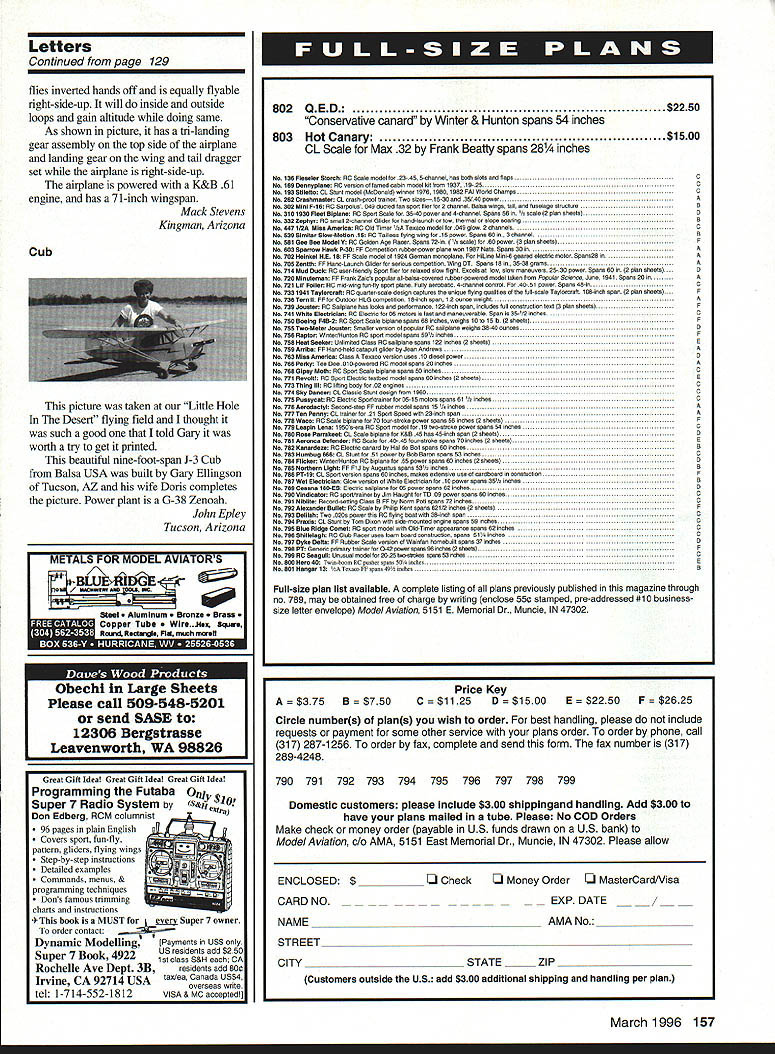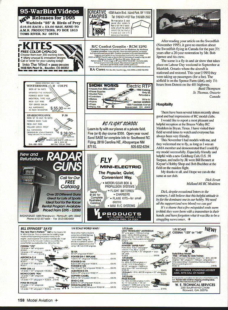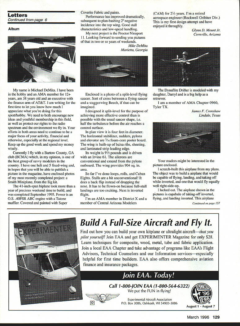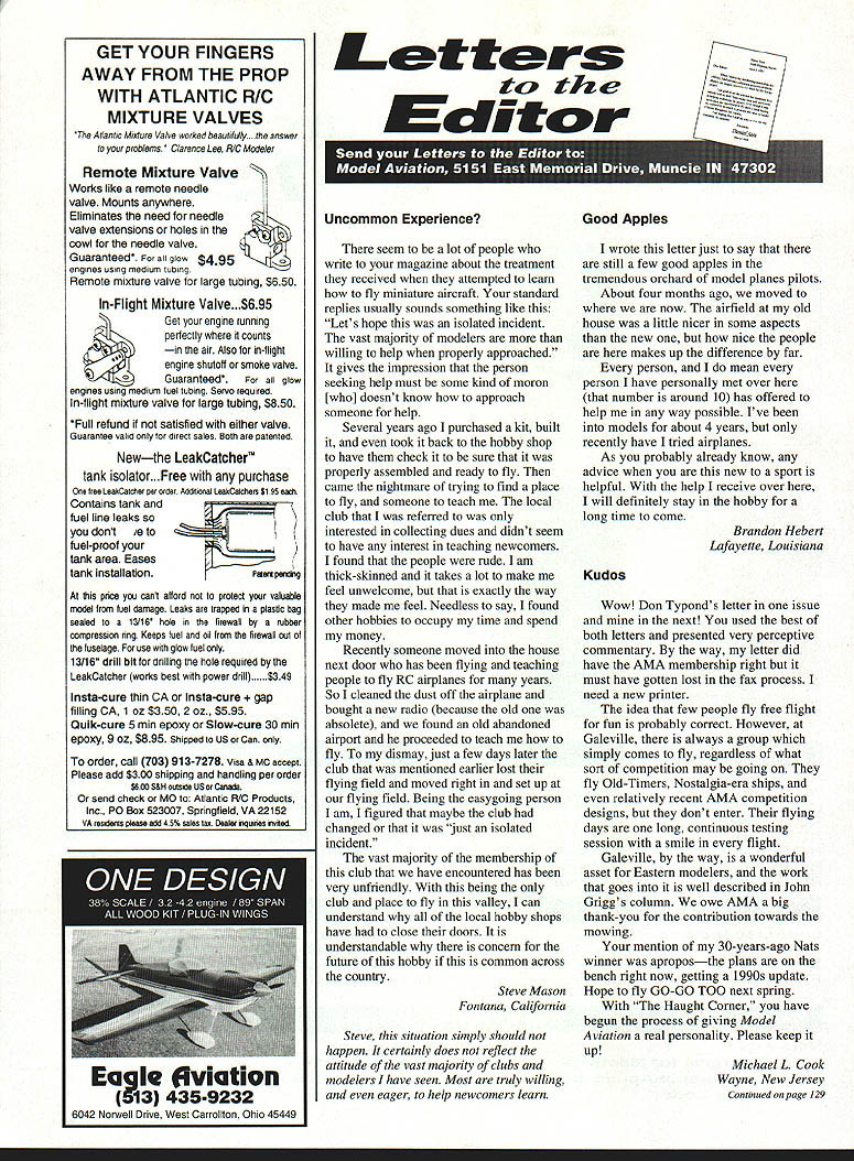 GET YOUR FINGERS AWAY FROM THE PROP WITH ATLANTIC R/C MIXTURE VALVES Atlantic Mixture Valve worked beautifully answer problems Clarence Lee RC Modeler Remote Mixture Valve Works like remote needle valve Mounts anywhere Eliminates need needle valve extensions holes cowl needle valve Guaranteed glow $495 engines using medium laDing Remote mixture valve large tubing $650 In-Flight Mixture Valve.$695 Get engine running perfectly t counts air Also in-tlight engine shutoff smoke valve GuaranteedFor ail glow engines using medium fuel tubing Servo required In-flight mixture valve large tubing $850 Full refund satisfied either valve Guarantee vaiid direct sales 8ottr patented Newthe LeakCatcher tank isolator. Free purchase free LeakCatcher tier ureer Additional LeakCatchers Si 95 Contains tank fuel line leaks dont e zg fuel-proof tank area Eases tank Installation price can attord protect valuable model fuel damage Leaks trapped plasfic bag sealed 13/16 hole firewall tubber compression ring Keeps fuel oil firewall out tuselage use glow fuel 13116 drill bIt drilling hole required LeakCatcher works best wh power drill Insta-cure thin CA Insta-cure filling CA 1 oz $350 2 oz $595 Quik-cure 5 mm epoxy Slow-cure 30 mm epoxy 9 oz $895 Shipped US Can order call 703 913-7278 visa & c accept Please add $300 shipping handling per order sese 5&H osfade user Cerada send check MO Atlantic R/C Products Inc P0 Box 523007 Springfield VA 22152 VA readenla please add 45% sales tax Oealer riqalnes ureie Letters tc th Editor seem lot people write magazine about treatment received attempted learn fly miniature aircraft standard replies usually sounds something like Lets hope isolated incident vast majority modelers willing help properly approached gives impression person seeking help must some kind moron [who] doesnt know approach someone help Several years ago purchased kit built took back hobby shop have check sure properly assembled ready fly came nightmare trying find place fly someone teach local club referred interested collecting dues didnt seem have interest teaching newcomers found people rude am thick-skinned takes lot make feel unwelcome exactly way made feel Needless say found other hobbies occupy time spend money Recently someone moved house next door has flying teaching people fly RC airplanes years So cleaned dust off airplane bought new radio because old absolete found old abandoned airport proceeded teach fly dismay just few days later club mentioned earlier lost flying field moved right set up flying field Being easygoing person am figured maybe club changed just isolated incident vast majority membership club have encountered has very unfriendly being club place fly valley can understand local hobby shops have close doors understandable concern future hobby common across country Steve Mason Fontana California Steve situation simply should happen certainly does reflect attitude vast majority clubs modelers have seen Most truly willing eager help newcomers learn S 5 wrote letter just say still few good apples tremendous orchard model planes pilots About four months ago moved now airfield old house little nicer some aspects new nice people makes up difference far person mean person have personally met over number around 10 has offered help way possible Ive models about 4 years recently have tried airplanes As probably already know advice new sport helpful help receive over will definitely stay hobby long time come Brandon Hebert Lafayette Louisiana Kudos Wow Don Typond s letter issue next used best both letters presented very perceptive commentary way letter did have AMA membership right must have gotten lost fax process need new printer idea few people fly free flight fun probably correct However Galeville always group simply comes fly regardless what sort competition may going fly Old-Timers Nostalgia-era ships relatively recent AMA competition designs dont enter flying days long continuous testing session smile flight Galeville way wonderful asset Eastern modelers work goes well described John Griggs column owe AMA big thank-you contribution towards mowing mention 30-years-ago Nats winner aproposthe plans bench right now getting 1990s update Hope fly GO-GO TOO next spring Haught Corner have begun process giving Model Aviation real personality Please keep up Michael L Cook Wayne New Jersey Conrinued page 129 Uncommon ExperienceGood Apples fiviation EaIe 435-9232 6042 Norwell Drive West Carrollton Ohio 45449 Letters Continued page 6 Album name Michael DeMita have hobby AMA member 12 years am 38 years old executive finance arm AT&T am writing first time let know much appreciate what youre doing sport/hobby need both encourage new ideas youthful membership field well protect rights radio spectrum environment fly efforts both areas need continue major focus activity financial otherwise especially regional level Keep up good work spend money wisely Currently fly Bartow County GA club BCMA opinion best group savvy modelers country have heli 5 fixed-wing hopes will able publish picture magazine have enclosed photos recently completed project Smith Miniplane Sig kit 41-inch-span biplane took year precious weekend time build completed September 1995 Power OS 4OFSR ABC engine Tatone muffler Covered painted Super Coverite Fabric paints Performance has improved dramatically subsequent plan-bashing 20 negative incidence top wing Good stall characteristics low-speed handling next project Proctor Nicuport 11 Looking forward sending pictures two years weekends Mike DeMita Marietta Georgia Enclosed photo split-level flying saucer Sort cross between flying saucer staggerwing Beech can imagined designed split-level purpose achieving effective control possible usual saucer shape ie half turbulence before air reaches control surface plan view four feet diameter horizontal stabilizer rudders pylons elevator /ts foam-core poster board wing built-up balsa ribs sheeting laminated strip leading edge Its weight 91/2 pounds driv