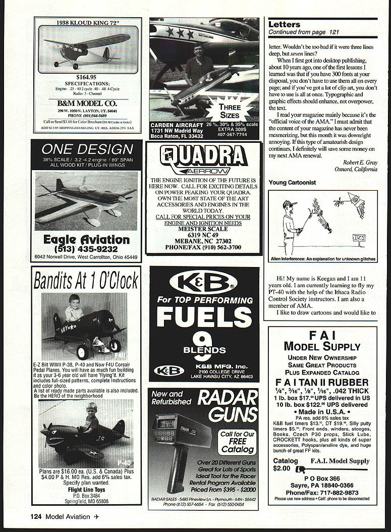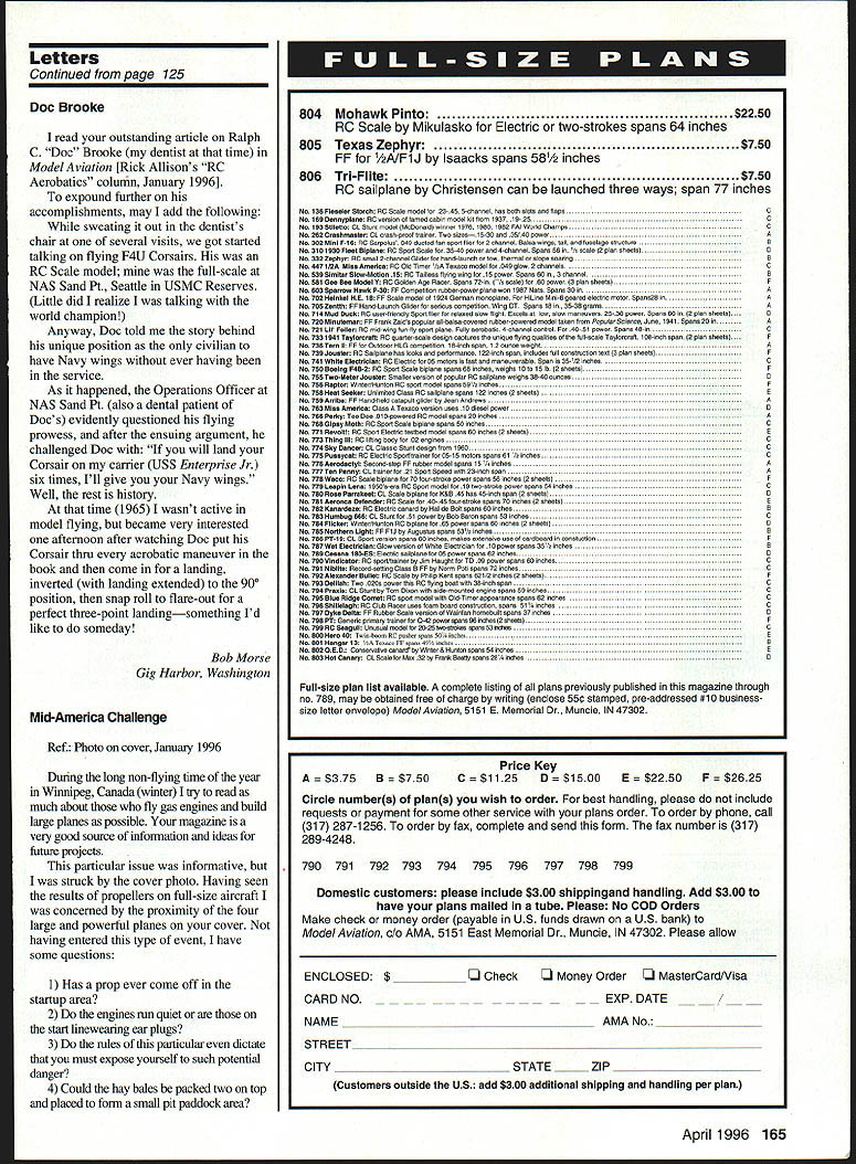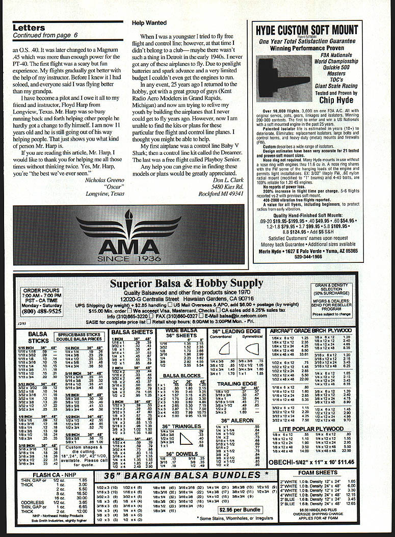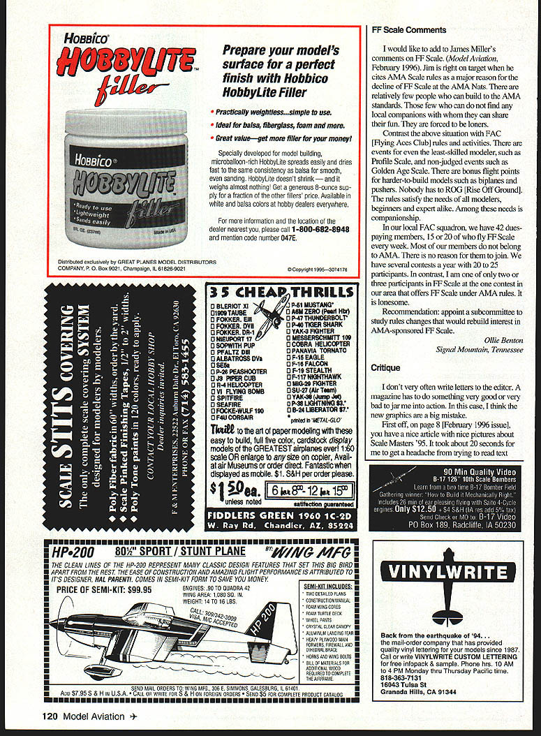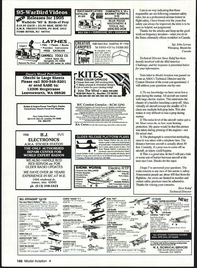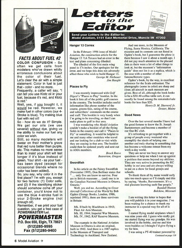 FACTS ABOUT FUEL #2 COLOR CONFUSION So often get calls modelers whove drawn wildly erroneous conclusions about color fuel Lets clear air simple statement Color fuel just color no Frequently caller will say can tell use Klotz oil fuel because its red Klotz red Well yes bought it would red However make fuel other colors 4Stroke blue Try making blue fuel red oil So Simple get oils use several dye giving us ability make fuel color wish Still modelers will swear mothers grave red runs better purple etc makes no sense insist shirt will last longer its blue instead green shirt fuel has dyed except occasional blends no color has added So say color first place Im except two factors 1 Color sells 2 identifying sticker should somehow come off container youd know use blue 4-stroke fuel 2-Stroke engine enough oil Remember print fuel question get free case POWERMASTER fuel POWERMASTER PO Box 650 Elgin TX 78621 512285-9595 Fax 512285-9400 Letters tci th Ecfitcr February 1996 issue Model Aviation construction article Hangar 13 1/2A Texaco error text plans concerning dihedral dihedral first main wing panel 1/s inches apologies error hope does adversely affect wish build Hangar 13 George M Niebauer Jim Haught Places Fly recently impressed Golf Digests Places Play booklet book lists public golf courses country booklet includes useful information like phone number course greens fees rating course subscribers comments course staff booklet very handy Im going traveling can make plans golf area wondering Model Aviation couldnt make booklet flying fields country call Places Fly something would helpful other modelers travel looking club visit staying area booklet could updated yearly sent out AMA members Brock Reeve Beaverton Oregon Swordfish article Fairey Swordfish November 1995 Don Berliner states .only five know survive Four British museums . Canadian National Museum Ottawa Ontario Well yes no According Great Aircraft Collections World Bob Ogden Grange Books London 1986 reprinted 1991 three survivors Britain Mk II built Blackburn 1943 Fleet Air Arm Museum Mk III 1944 Imperial War Museum Mk IV 1942 RAF Reserve Museum example National Aviation Museum Ottawa also original built 1942 198 replica Museum Transport Technology Auckland New Zealand Museum Flying Santa Monica California museum its contents listed Ogdens book guarantee plane because saw about month ago did pay much attention placard data lot other things look museums information guide does list replica case number other famous/historic types Ogdens book way excellent reference Scale enthusiast photographs some color sharp clear aircraft museum given Best although book looks $30-40 coffee-table sort can usually found among remainder/sale books less $20 Henry D M rrerd Jr Dexter Maine Good News Over last several months have good fortune know St Joseph Barnstormers become member fine RC club Its refreshing get together group people weekend exemplify ideals helping another truly sharing something has become welcome retreat work-a-day world never too busy answer questions help run up against problem seems beyond abilities very active promoting RC hobby area always willing put show local groups schools thank name would surly take too much space Ill simply end saying thanks Barnstormers Its real pleasure knowing such fine people Randall Huston Boickow Missouri am writing letter hopes will publish magazine Ive walting chance thank instructor special way help started flying model airplanes nine years old guess really got started flying grandpa involved hobby him buddies thought Id give flying try him using PT-40 trainer powered Continued page 119 6 Model Aviation ngar 13 Correx 0 -D -u 8tSSSSS MOM CA CA CA S S CCI CC S3 8 C o SI iL o C 11 Z C z -u Oh C w w 0 C, o -Wi -DXCCCOOOO0 0 -Z -M-m SCASCASMm jjCjI 0 CA CA tO CA CCC- CCC CCC CC 0 XXCCCCXCC MMM cC1CCC CA _CA MCA 0500CM CAM CCCCSM CCC 0 0. CC C3 CCCCXW CCCCCCCCI CZ SCOjZ cd3o15 CC CCS cSCAJE SOC MmMv CCC .CC0 C CCCSCA 5CCCI OCCCCCC C CACC C ICC CCXXCC CC CC CC C MCOOOCCC CAM.C C C 55555 CGCC CCXXX n COC sC-iz CAMM CACAMM0 CACCCCCCC C C-CCAC C C C C MCMRC C MCOCAC fi XXXXXXCCXX XXXCCXXXX XXXXXXXPI F F CACACACACACACACA MMMMMMM------r 0 CA CCCCC CCAOC CSCCC SSCA C 0CC CD JCACAC C C CCCM CCJC 44 CCC 00 CACCA CCCCCCCCCC-JXCM C 0 C ~-C-4CC-C4CCCCMO C0CCC C~0CSCA 0 .JCCCCCCCC 00000000 CA C 00 CCCCCCCAt C CCCC4M400 CA CAMM XXXXXCCXXXX CXS FJCS CtFJCS-CCA C .XXXX SSCA SCAMSCAMC MC .reCeC SMCS4CSMM--C C4CCCCCJ0MCg 3 B8COC-COOn F7 UZn C400CAMCAM r CAM M' m S CMOMO vO~- -.aCCCC~aCCCCAorn CAOC 4SCASCAM CAM0SCAMMMM Urn CCCM a-~CCC 0 soos CCXXX 000Cd XXX0X0CC XXXXXXXXXCCXX @5 M-MMMM I -XC F0CC2 0 Z I5 0 EXXX 0 w m C z 5 gJ 5 C ft -S 0m CC0 CCCM 000 MMMM 0000 MMMMM 55555 CCXXX CCXXX XXXXX XXXXX MMM CMMMC CMMMC CCXXX CCXXX XCCXXX XXXXX SM SM- 55 CA SSCA C MCCCMCACSM CMM 0000 00CC 5555--- COCO CCXXX XXXX XXXX 0000 CCXXX MMMC MMMC MMMC --- MMMC XCCXX CCXXX XXXX MMM0 XXXX OSCAM MM MC SM-- SCAM i& I C 0 IIFEHI 0 ziIII uIe rr CC Z1 CC C 5-~ OC0 5 ~ 0--1 0I go Qq 0 -o 0 Co 0 o 0- 0tf 0 2 a-~ 5 ~~C oo ~ CC07-X0 02Ca C b 1 CD w CCa0CC CCCDCCCCCCD~-C- a0a --0CC -OCX 0 OCX C CCETI 0CC0~ CCO- CC000CXC CCOCAOCCC a~aO -J 0C~XC0~XCC50 CV CCCCc cgQ CC CMOC-00a Mm DCCX0CCjC~0OCCC0 -C CC CC C -0-.0 ci rnoo CC OCC CC CO 0 CCCCCC X- So0CCO ~CC CC --CCC CCC ~CC X CC o o-o o 0 CCCCCCCX @5CCCOOOW~ -00 CC CCCOQCCCCC~ ~0C-0 O0 CC 0CC 0 a-.COCC 000 a0OCCCC 0 -CX~CCCOC CO ---= -UCb 0CCCCocoO 00CCCCCCCa m CCXXCCXCXCC @50--o__D CCX-CCDco 0CDCC-00 0 a0aCC CCX~Cb4 HoBaico Prepare models ff@3uuw. surface perfect Ifinish Hobbico HobbyLite Filler Distributed exclusively GREAT PLANES MODEL DISTRIBUTORS COMPANY PO Box 9021 Champaign IL 91826-9021 PI3CtiCally weightless.simple use Ideal balsa fiberglass foam Great valueget filler money Specially developed model building microballoon-rich HobbyLite spreads easily dries fast same consistency balsa smooth sanding HobbyLife doesnt shrink hs almost nothingl Get generous 8-ounce sup ply traction other fillers price