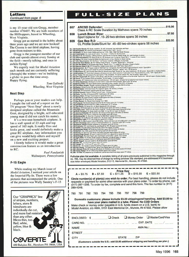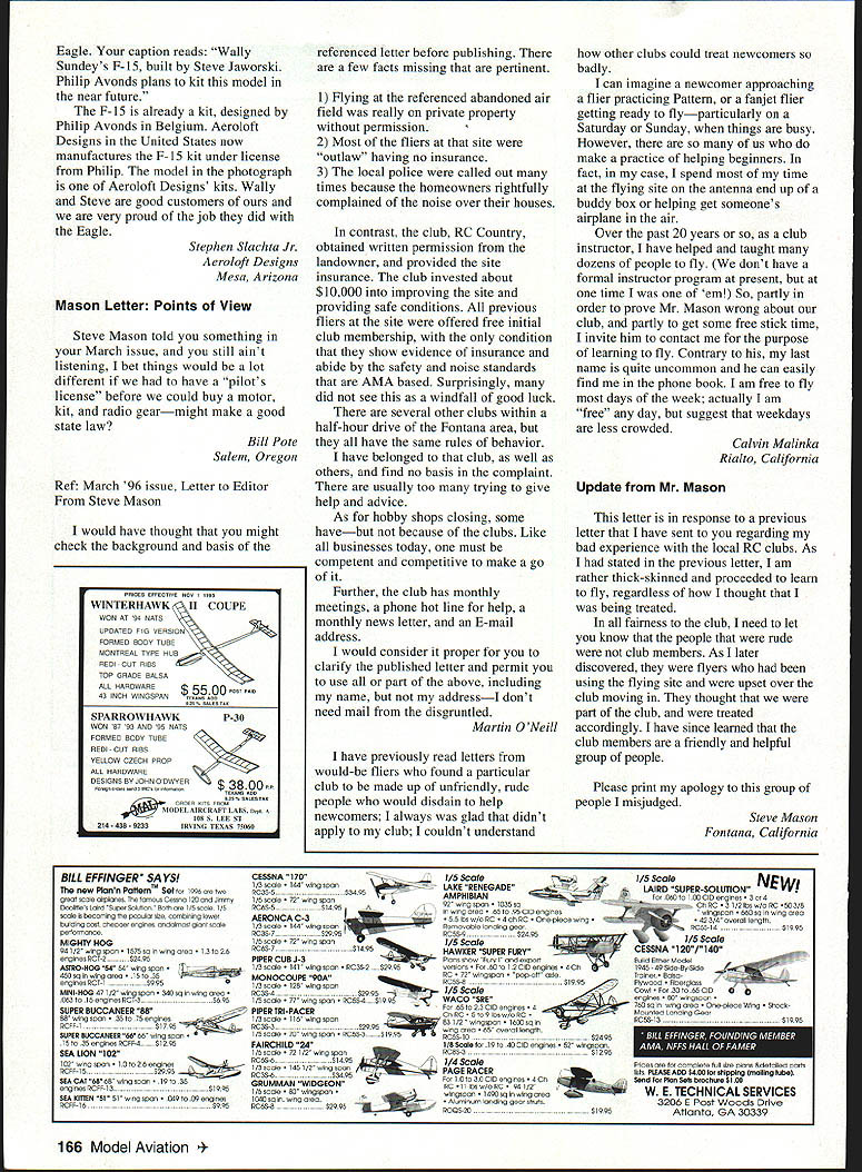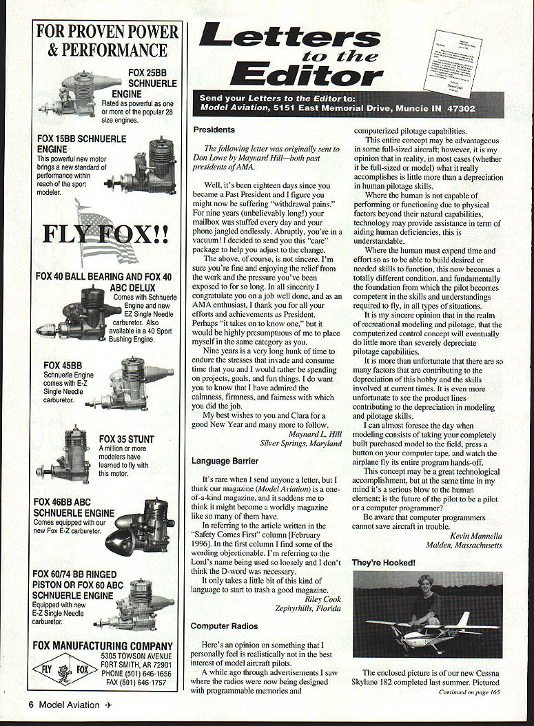 FOR PROVEN POWER & PERFORMANCE FOX 25BB SCHNUERLE ENGINE Rated powerful popular 28 size engines FOX 15BB SCHNUERLE ENGINE powerful new motor brings new standard performance within reach sport modeler* FOX 40 BALL BEARING AND FOX 40 ABC DELUX Comes Schnuerle Engine new EZ Single Needle carburetor Also available 40 Sport Bushing Engine FOX 45BB Schnuerle Engine comes E-Z Single Needle carburetor FOX 46BB ABC SCHNUERLE Comes equipped wiin new Fox E-Z cajiburetor FOX 35 STUNT million modelers have learned fly motor FOX 60/74 BB RINGED PISTON OR FOX 60 ABC SCHNUERLE ENGINE Equipped new E-Z Single Needle carburetor FOX MANUFACTURING COMPANY 5305 TOWSON AVENUE KIIIIII7~7IIIuIII PHONE 501 646-1656 FLYFOXFORT SMITH AR 72901 FAX 501 646-1757 Letters tc EcIitcir Presidents following letter originally sent Don Lowe Maynard Hillboth past presidents AMA Well its eighteen days since became Past President figure might now suffering withdrawal pains nine years unbelievably long mailbox stuffed day phone jangled endlessly Abruptly youre vacuum decided send care package help adjust change above course sincere Im sure youre fine enjoying relief work pressure youve exposed long sincerity congratulate ajob well done AMA enthusiast thank efforts achievements President Perhaps takes know would highly presumptuous place myself same category Nine years very long hunk time endure stresses invade consume time would rather spending projects goals fun things want know have admired calmness firmness fairness did job best wishes Clara good New Year follow Maynard L Hill Silver Springs Maryland Language Barrier Its rare send anyone letter think magazine Model Aviation oneof-a-kind magazine saddens think might become worldly magazine like have referring article written Safety Comes First column [February 1996] first column find some wording objectionable Im referring Lords name being used loosely dont think D-word necessary takes little bit kind language start trash good magazine Riley Cook Zephyrhills Florida Computer Radios Heres opinion something personally feel realistically best interest model aircraft pilots ago through advdrtisements saw radios now being designed programmable memories computerized pilotage capabilities entire concept may advantageous some full-sized aircraft however opinion reality cases whether full-sized model what really accomplishes little depreciation human pilotage skills human capable performing functioning due physical factors beyond natural capabilities technology may provide assistance term aiding human deficiencies understandable human must expend time effort able build desired needed skills function now becomes totally different condition fundamentally foundation pilot becomes competent skills understandings required fly types situations sincere opinion realm recreational modeling pilotage computerized control concept will eventually little severely depreciate pilotage capabilities unfortunate factors contributing depreciation hobby skills involved current times unfortunate see product lines contributing depreciation modeling pilotage skills can almost foresee day modeling consists taking completely built purchased model field press button computer tape watch airplane fly its entire program hands-off concept may great technological accomplishment same time mind its serious blow human element future pilot pilot computer programmer aware computer programmers cannot save aircraft trouble Kevin Mannella Malden Massachusetts enclosed picture new Cessna Skylane 182 completed last summer Pictured Continued page 165 6 Model Aviation -- Theyre Hooked Letters Continued page 6 15-year-old son Gregg member number 478407 both members Hilihoppers based Wheeling West Virginia Gregg got us started hobby about three years ago now hooked Cessna third airplane having gone trainers Gregg youngest member club spends almost Sunday fieldmostly talking once awhile flying eagerly wait Model Aviation month currently suffering [through] winterwere building glider pass time away Happy flying Tom Galinski Wheeling West Virginia Next Step Perhaps readers can help caught tail end report TV program Next Step about newly designed airplane called Mountain Goat designed bright self-educated young man did catch name Its two-seat homebuilt airplane has stall speed 23 mph top speed 165 mph really flies looks great would definitely make great RC airplane Any information can give would help others myself new exciting project firmly believe would make great construction feature introduction RC Paul Fundanish Walnutport Pennsylvania F-15 Eagle reading March issue Model Aviation noticed article Imperial Fly-In few pictures accompanied article pictures Wally Sundeys F-15 FPrice Key B $750C 50 0E 0I Circle numbers plans wish order best handling please include requests payment some other service plans order order phone call I 317 287-1256 order fax complete send form fax number 317I 4248I II 790 791 792 793 794 795 796 797 798 799 Domestic customers please include $300 shippingand handling Add $300 toI have plans mailed tube Please No COD OrdersI Make check money order payable US funds drawn US bank toI ModelAviation AMA 5151 East Memorial Dr Muncie IN 47302 Please allow II ENCLOSED $ __________ k0 Money Order 0 MasterCardNisaI II CARDNOEXP DATE __ _ __ NAME_______________________ AMA No___________ STREET _____ _____ ____ ____ _____ II CITY --outside US add STATE____ ZIP ________________-Customers$300 additional shipping handling per planI L ay19961 Eagle caption reads Wally Sundeys F-15 built Steve Jaworski Philip Avonds plans kit model near future F-l5 already kit designed Philip Avonds Belgium Aeroloft Designs United States now manufactures F-15 kit under license Philip model photograph Aeroloft Designs kits Wally Steve good customers very proud job did Eagle Stephen Slachta Jr Aeroloft Designs Mesa Arizona Mason Letter Points View Steve Mason told something March issue still aint listening bet things would lot different have p